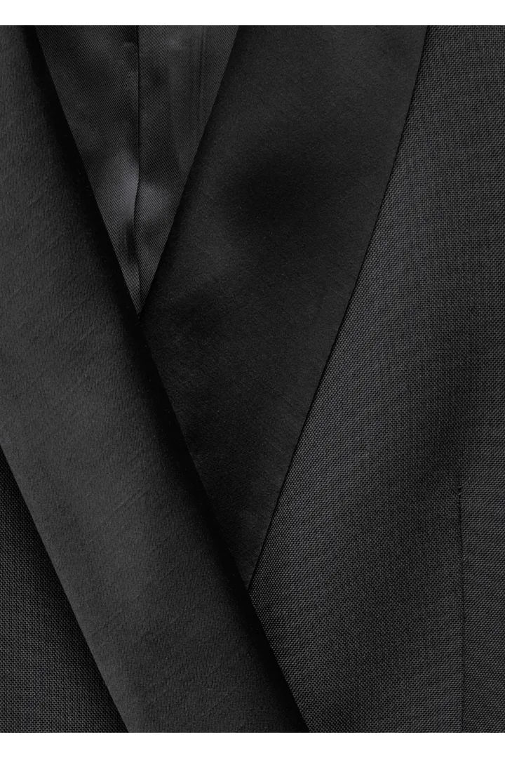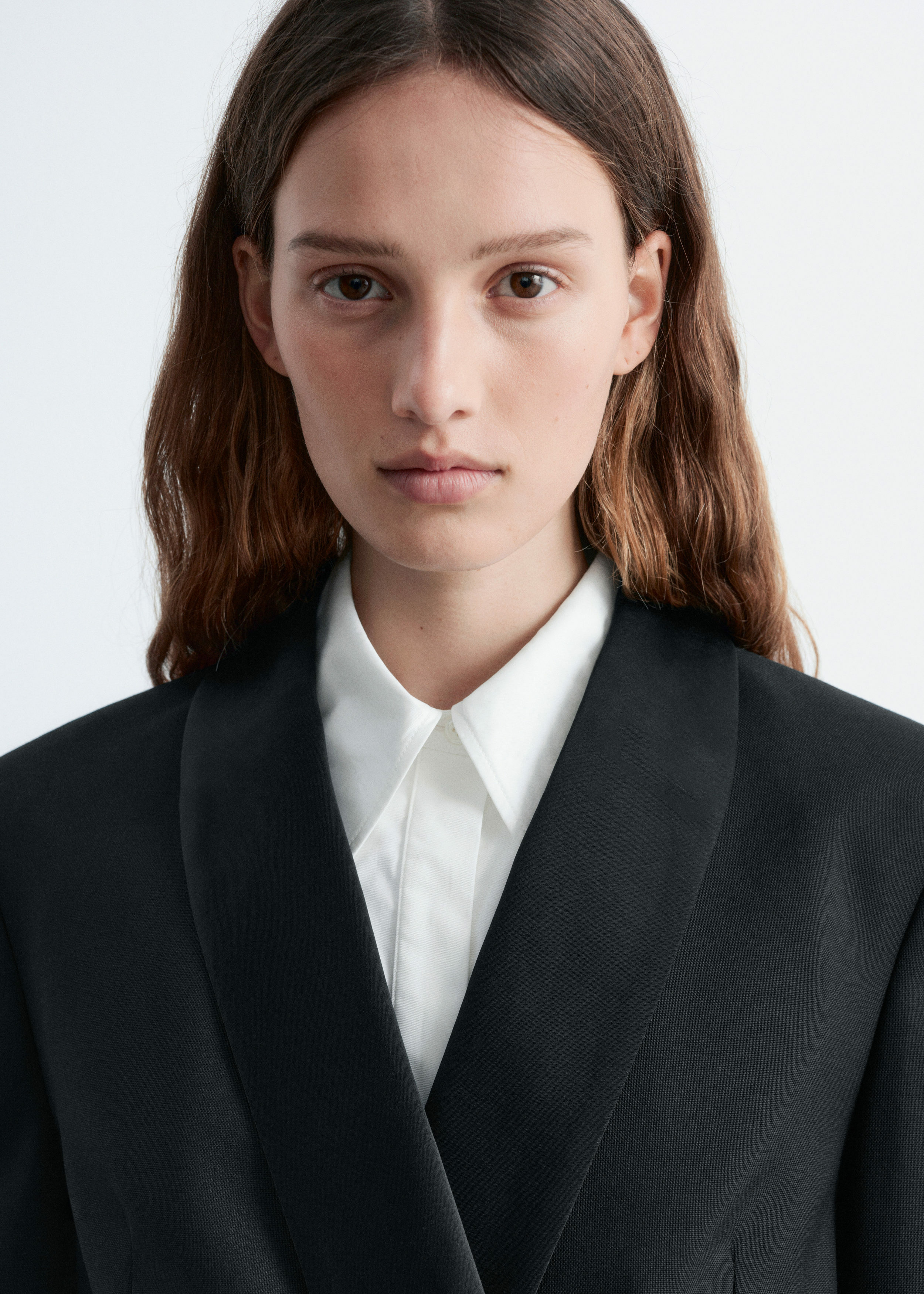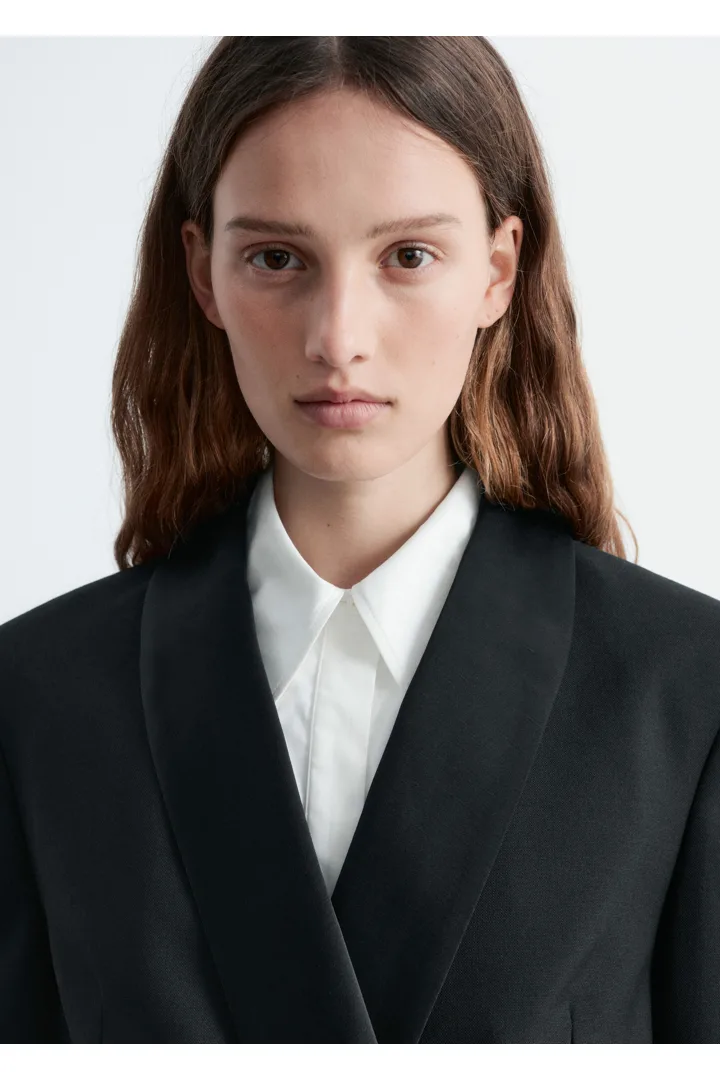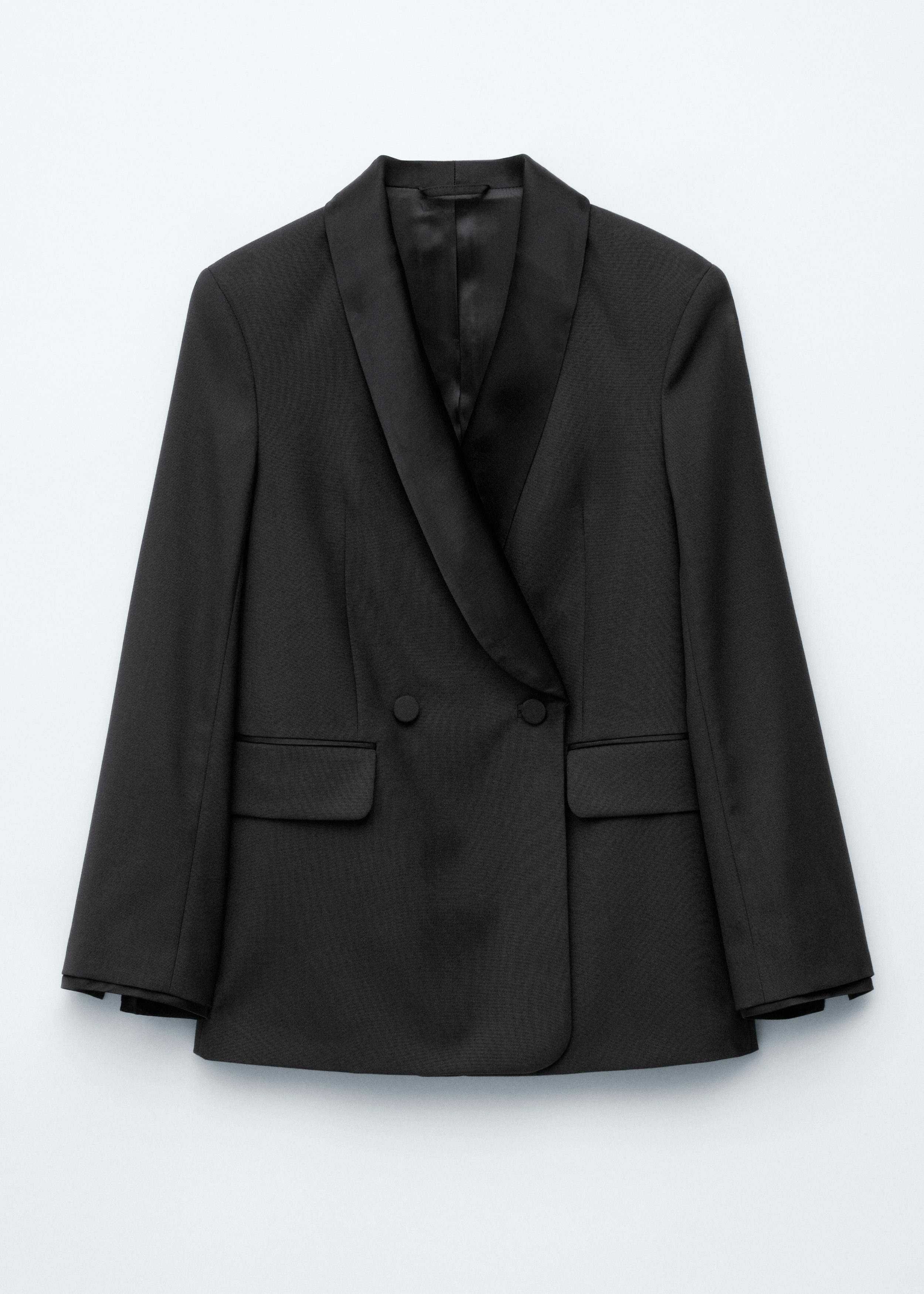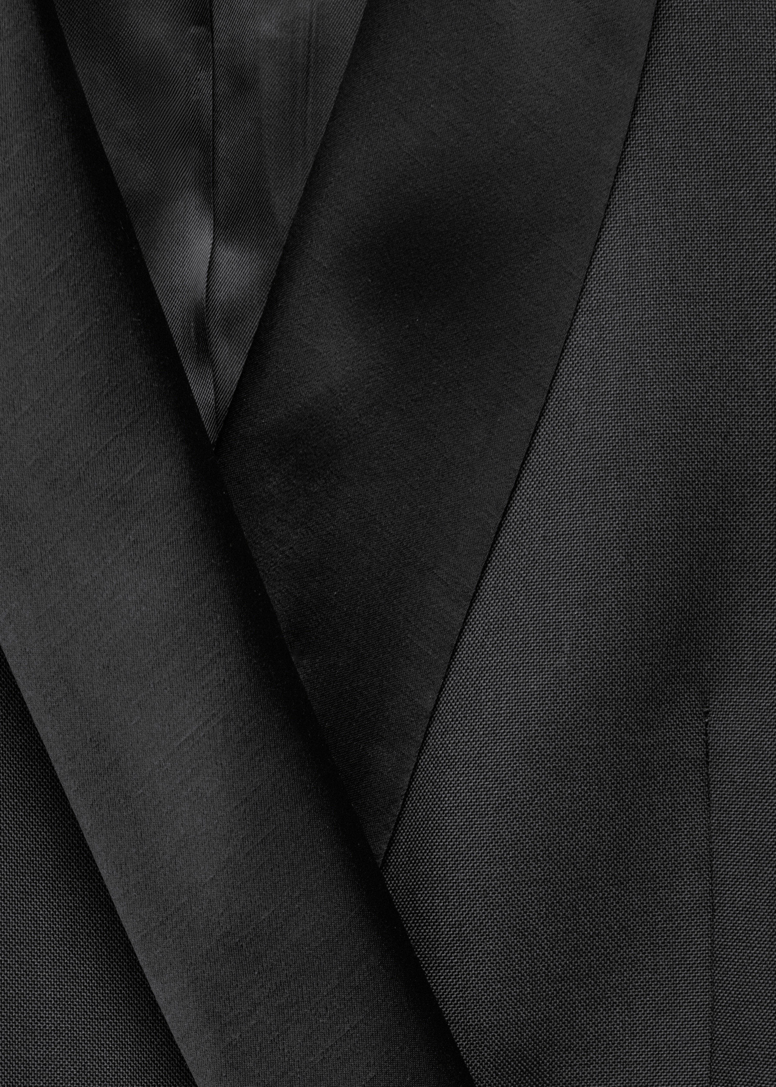 울 소재의 더블 브레스티드 블레이저예요. 새틴 라펠 카라, 그리고 새틴 레이어가 슬리브 아래로 살짝 흐르는 디자인의 더블 레이어 커프스가 돋보인답니다. 스트레이트 실루엣, 숄더 패드, 뒷면의 더블 트임, 플랩 포켓, 2개의 단추가 특징이에요.