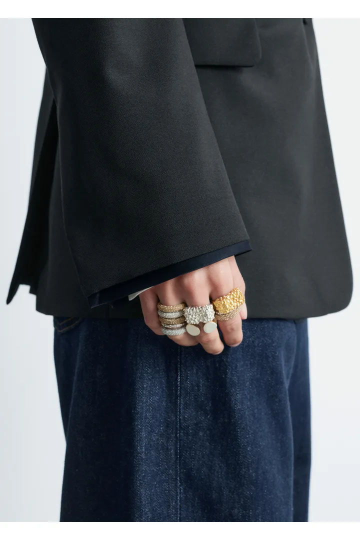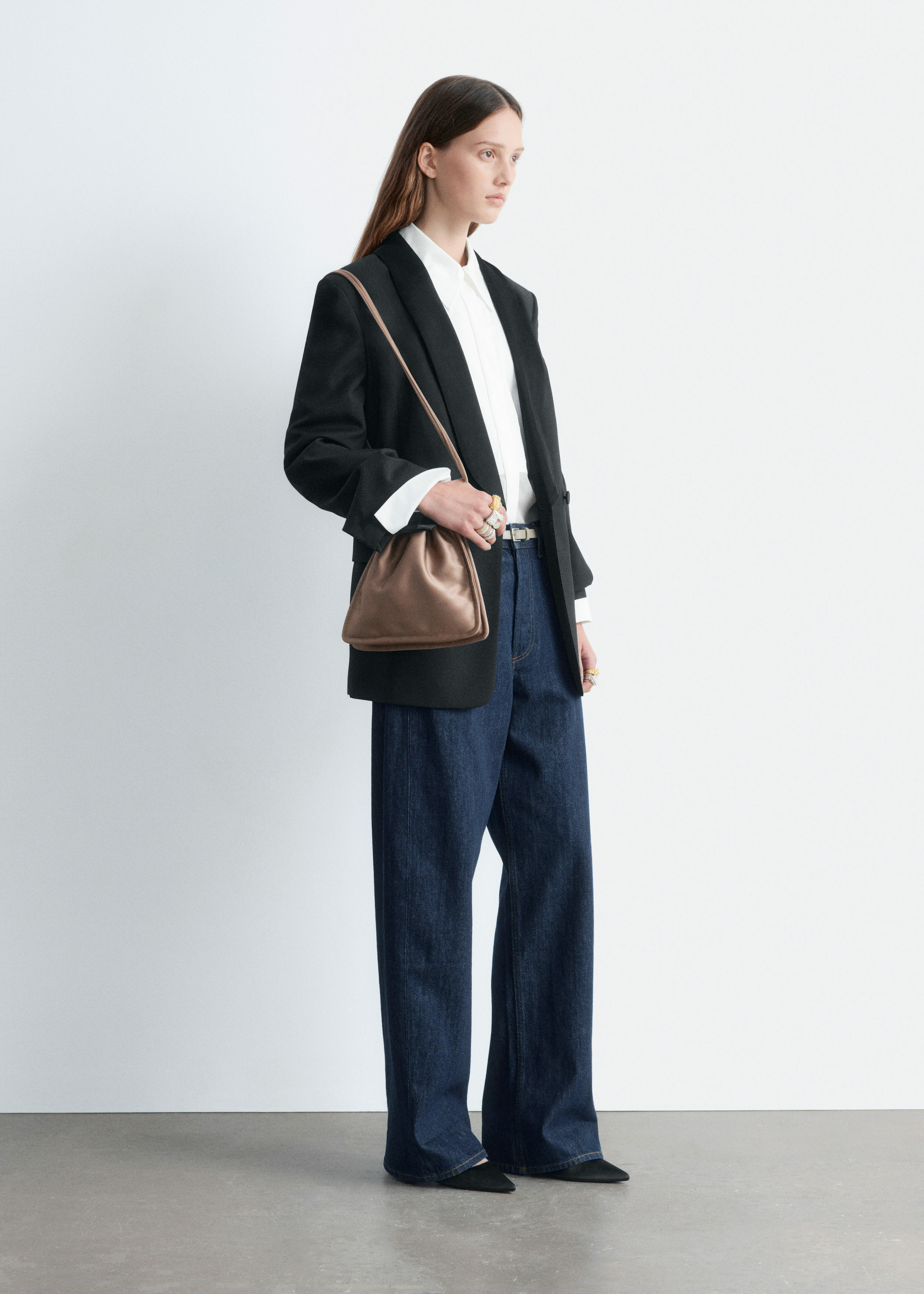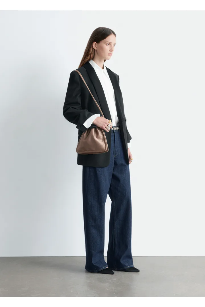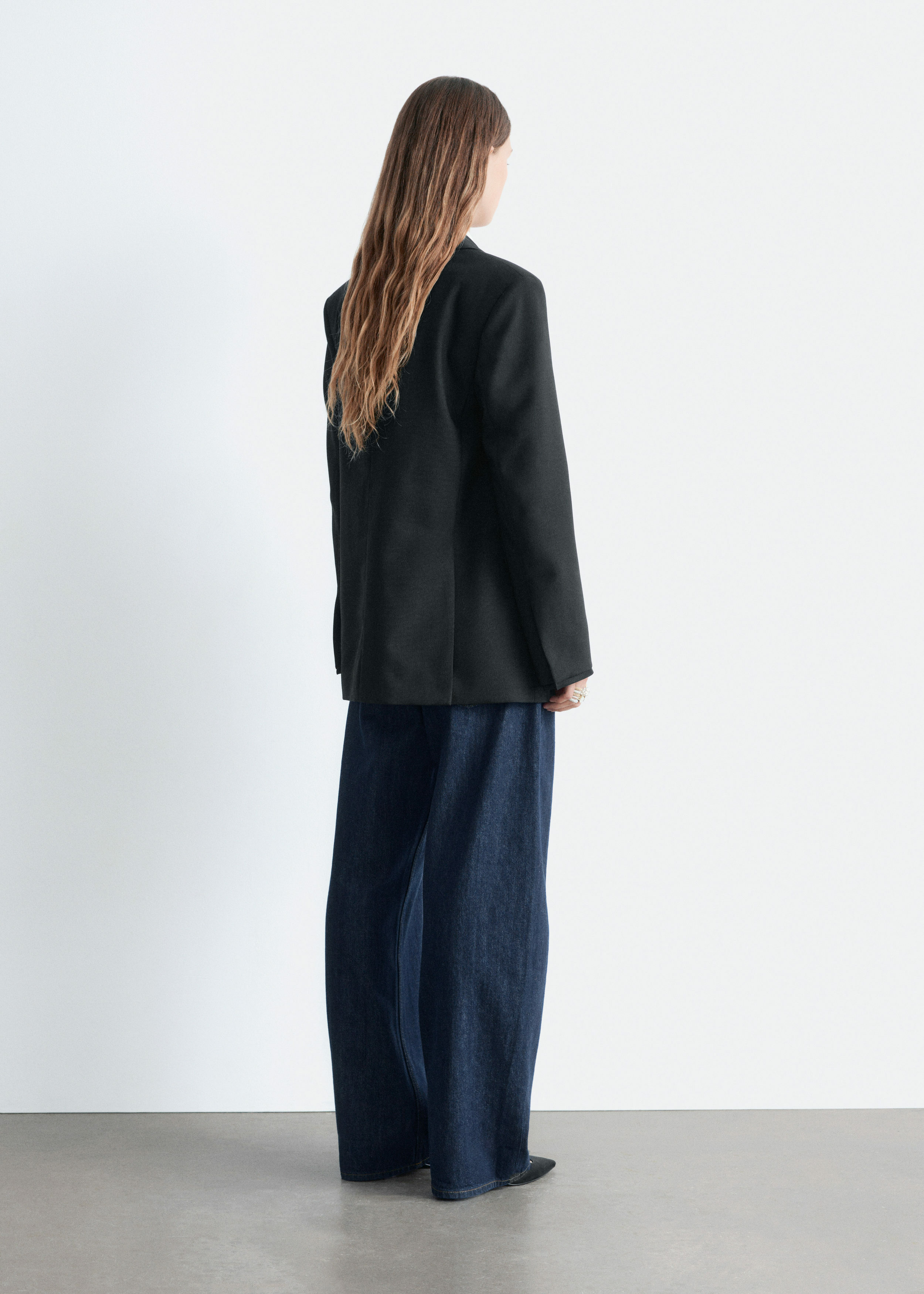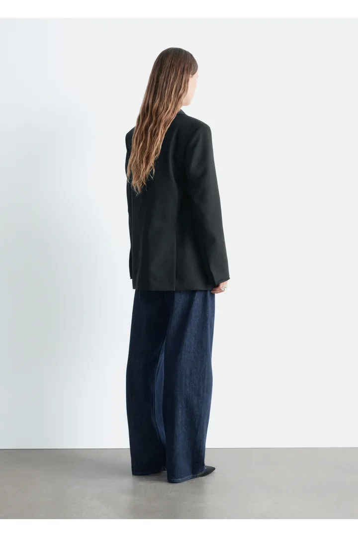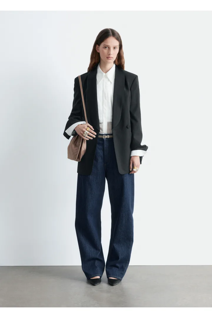 울 소재의 더블 브레스티드 블레이저예요. 새틴 라펠 카라, 그리고 새틴 레이어가 슬리브 아래로 살짝 흐르는 디자인의 더블 레이어 커프스가 돋보인답니다. 스트레이트 실루엣, 숄더 패드, 뒷면의 더블 트임, 플랩 포켓, 2개의 단추가 특징이에요.