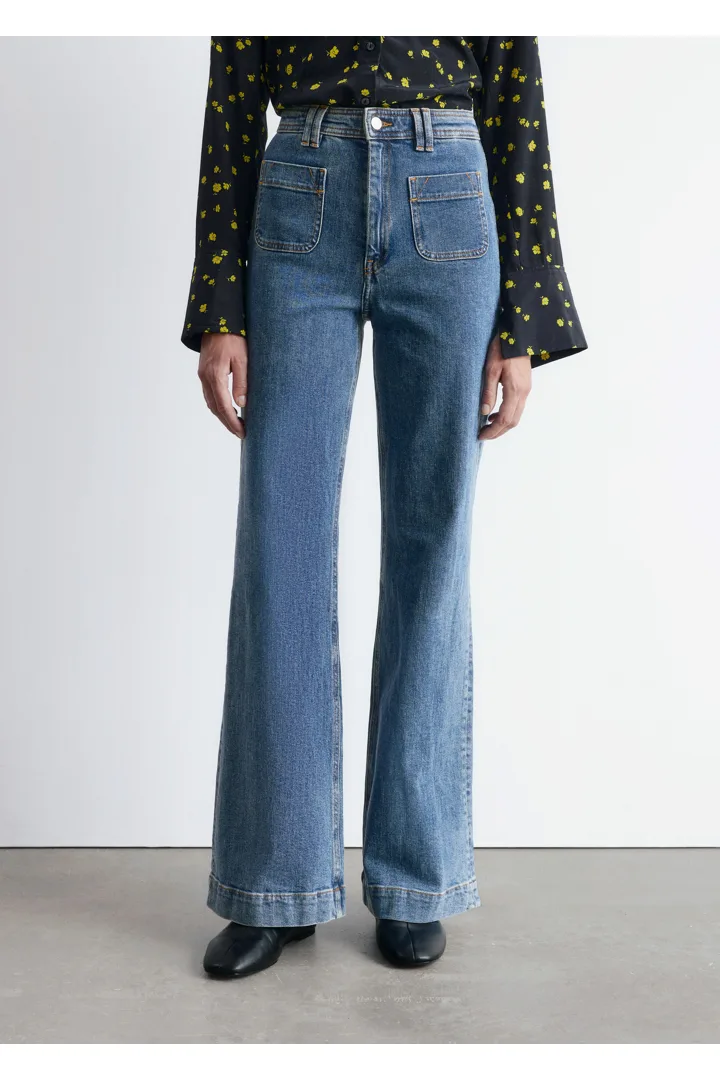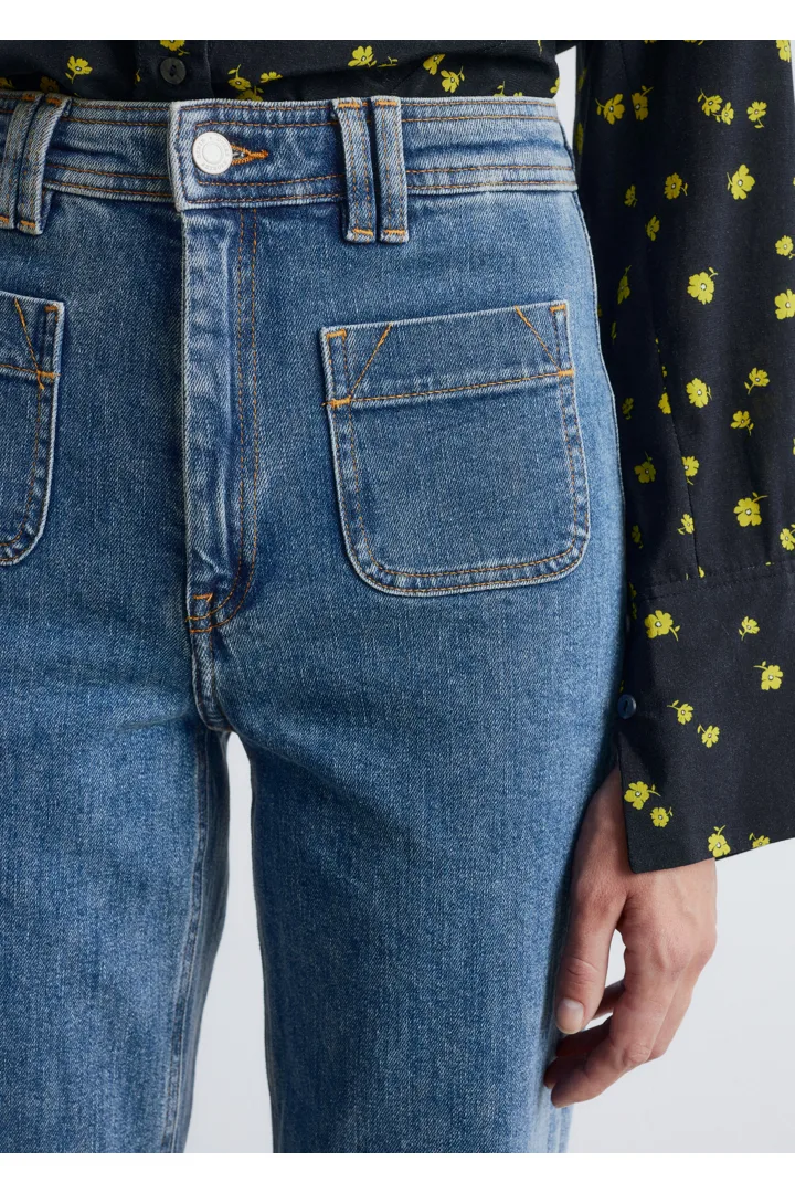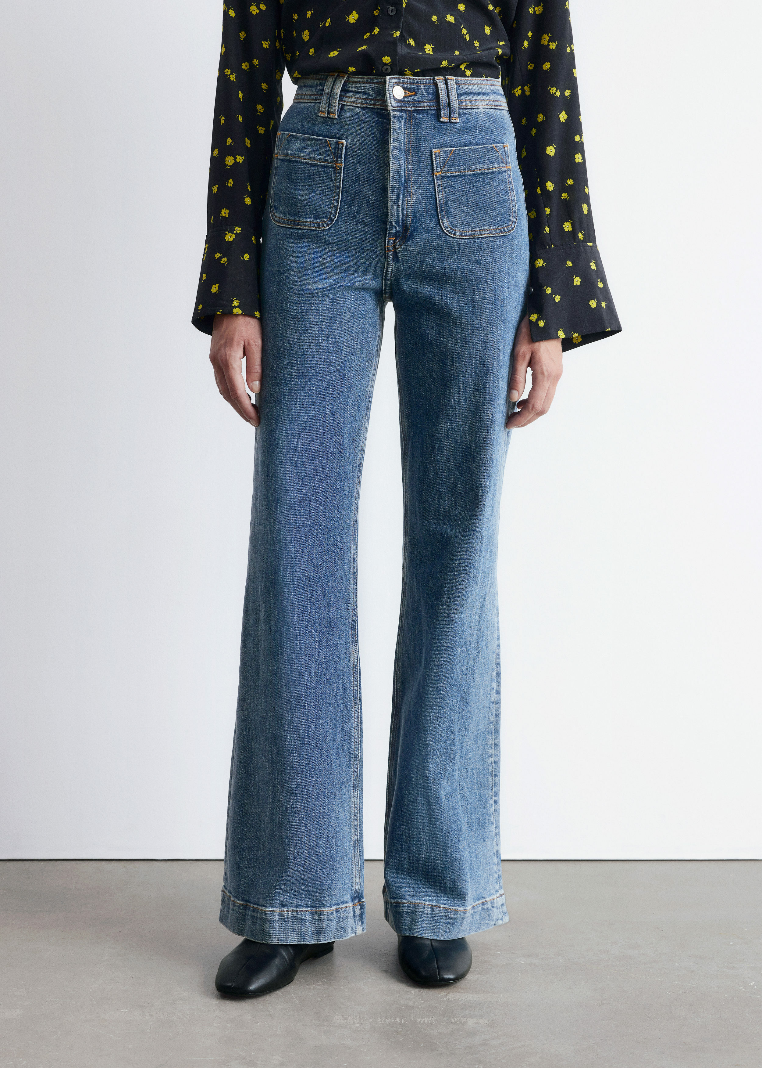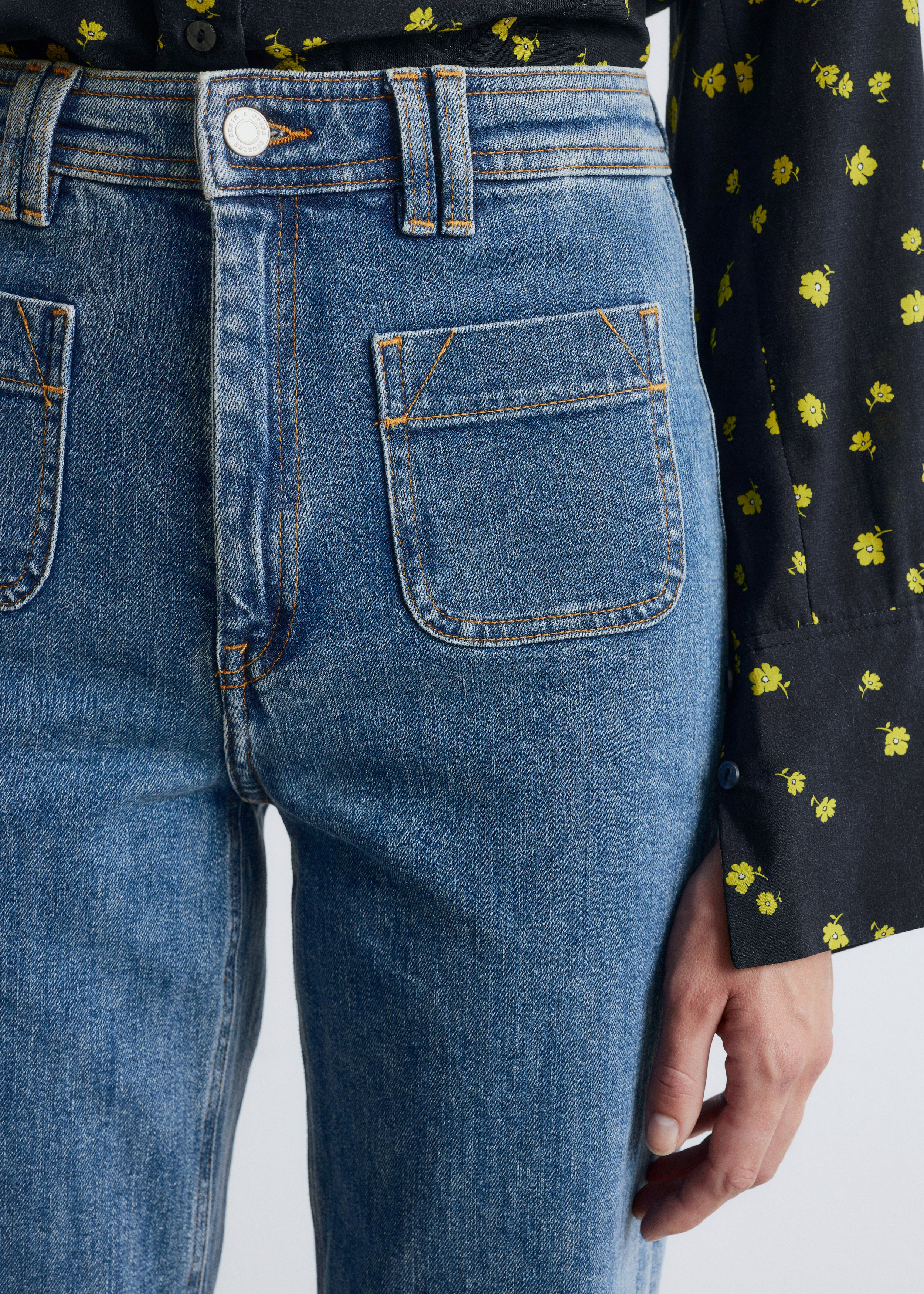 하이 웨이스트의 부츠컷 진이에요. 앞면과 뒷면에 2개의 패치 포켓과 탑스티치 디테일이 특징이랍니다.