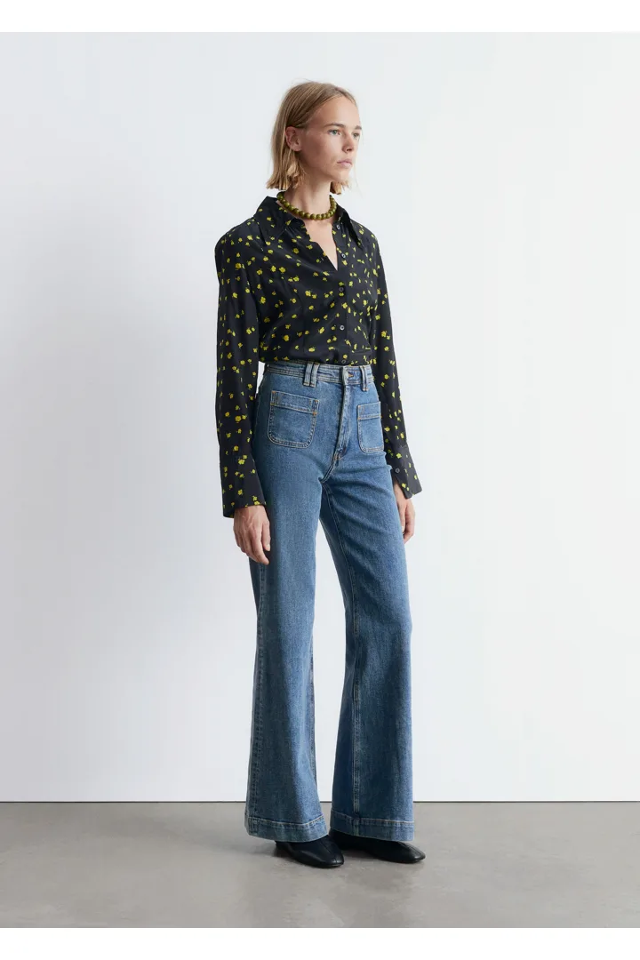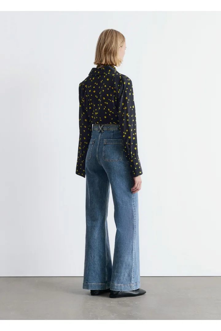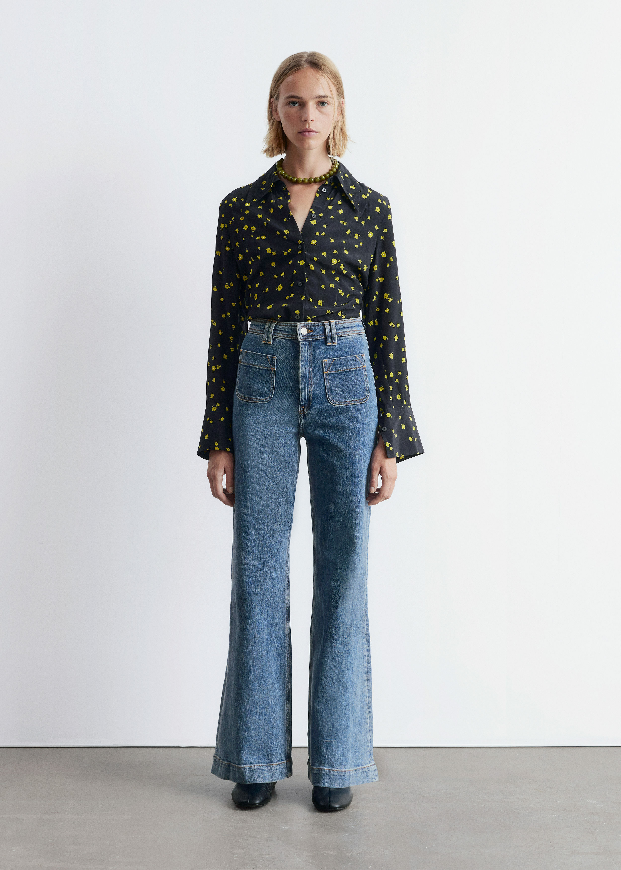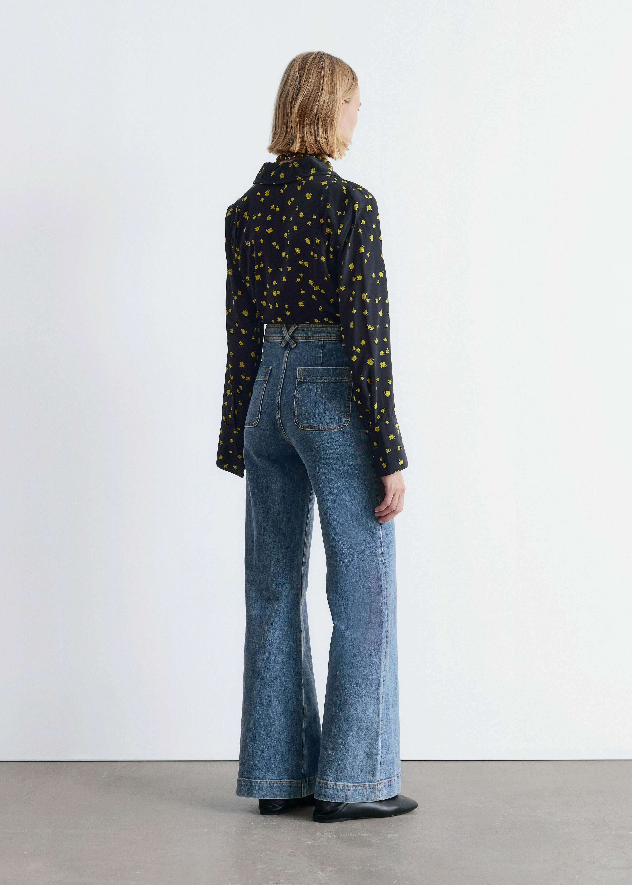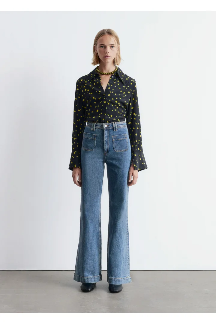하이 웨이스트의 부츠컷 진이에요. 앞면과 뒷면에 2개의 패치 포켓과 탑스티치 디테일이 특징이랍니다.
