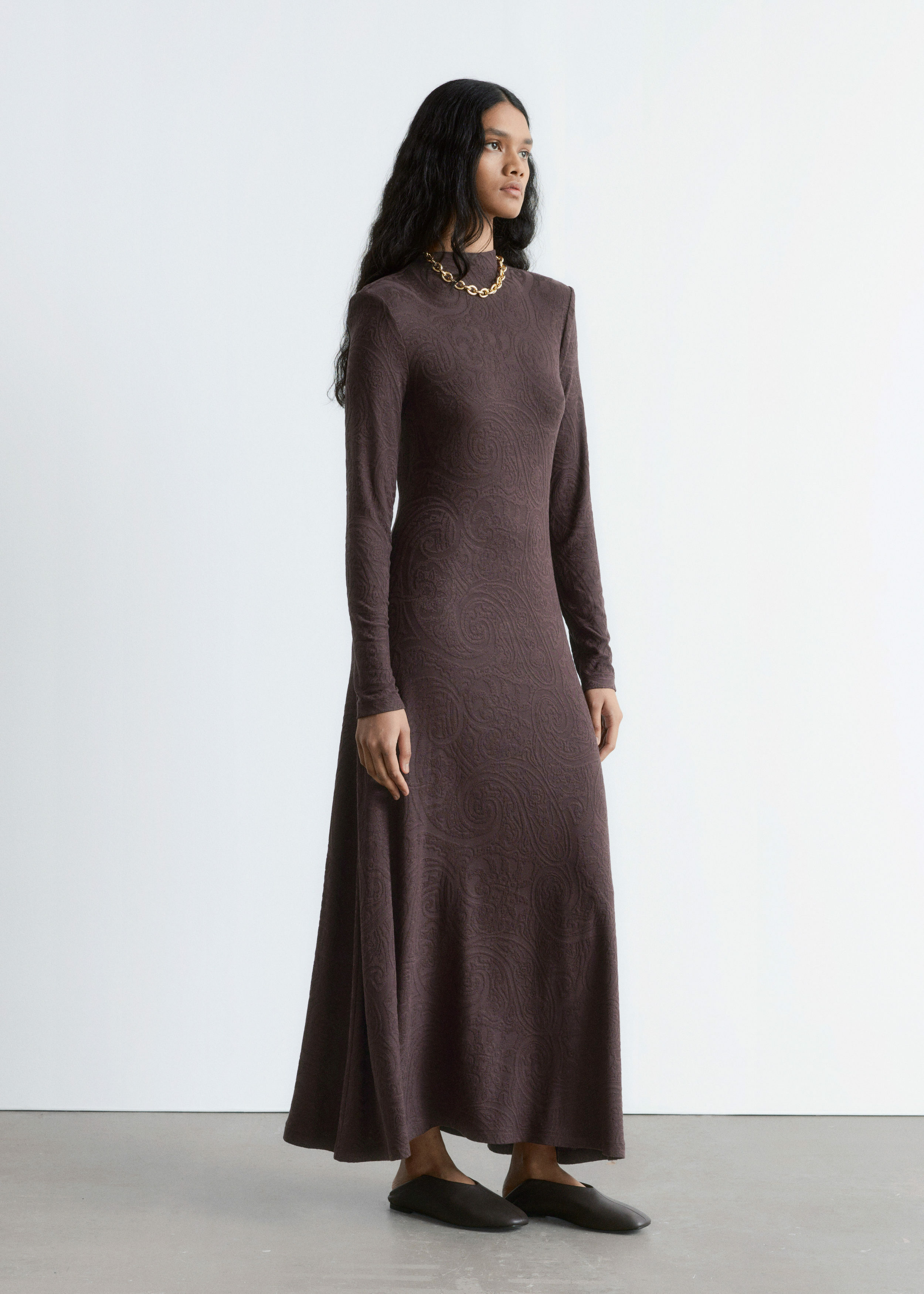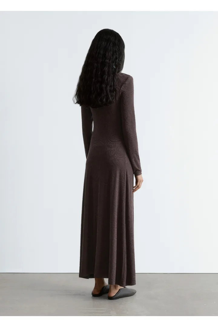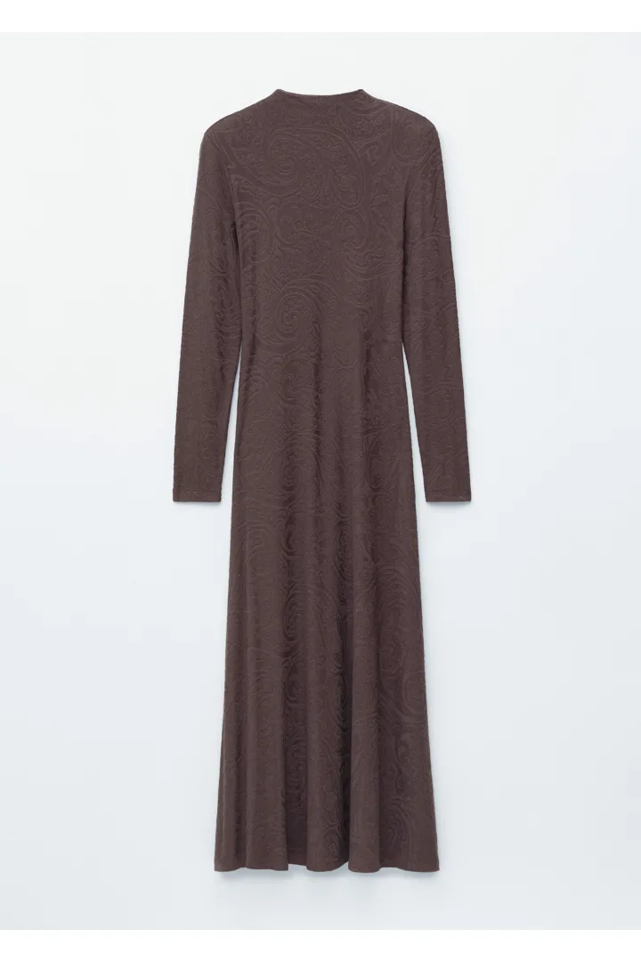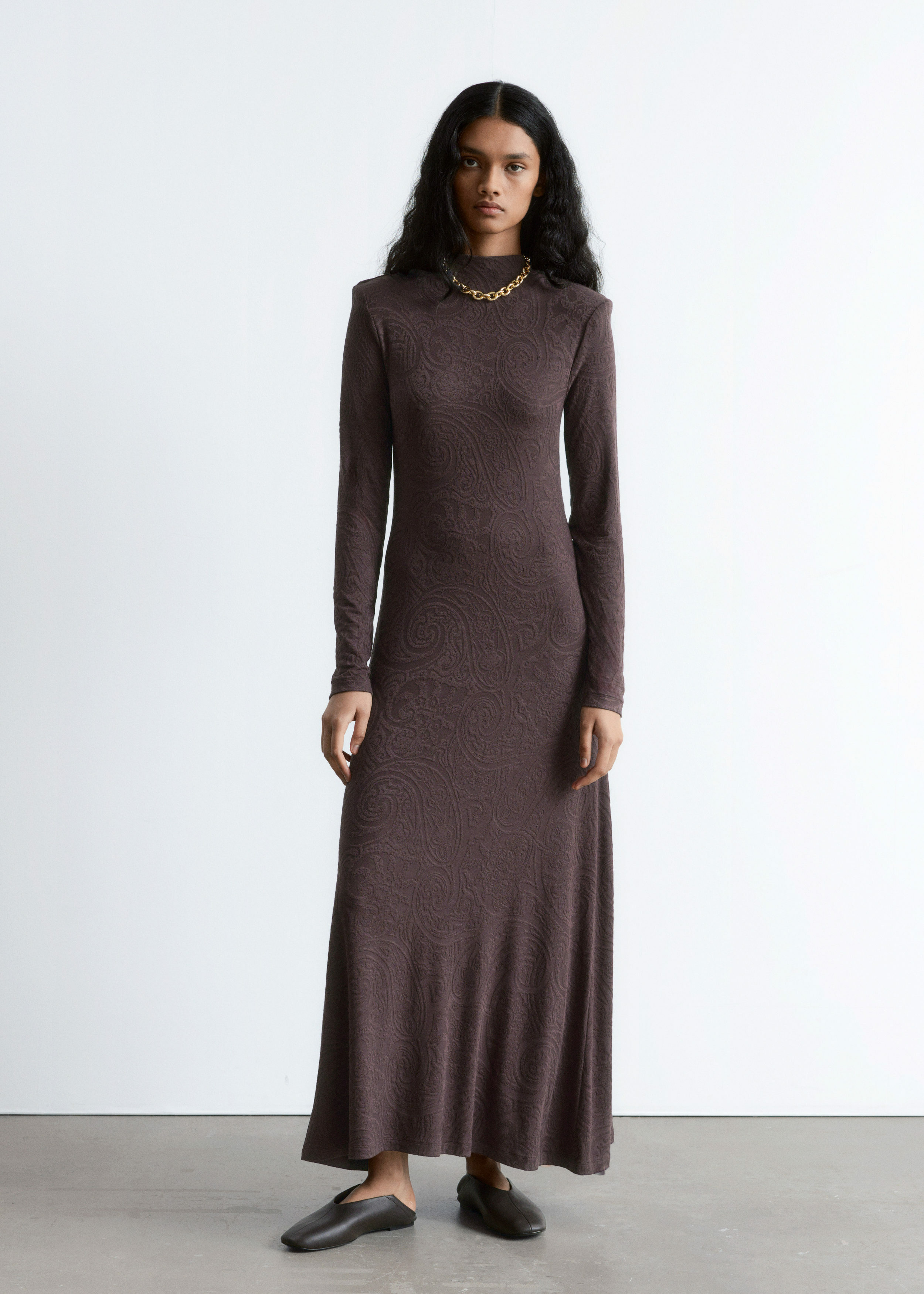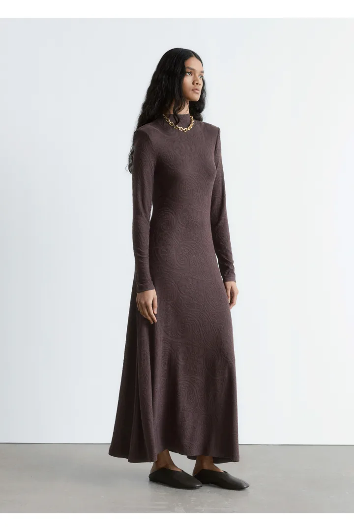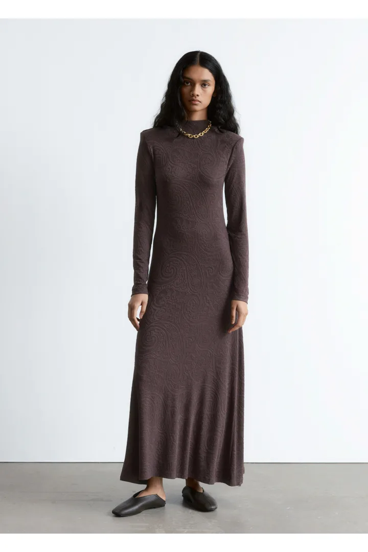 부드러운 자카드 저지 소재의 맥시 드레스예요. 페이즐리 패턴이 멋스럽답니다. 실루엣을 강조하는 패디드 숄더, 모크 넥, 롱 슬리브, 은은한 A 라인의 스커트가 특징이에요.