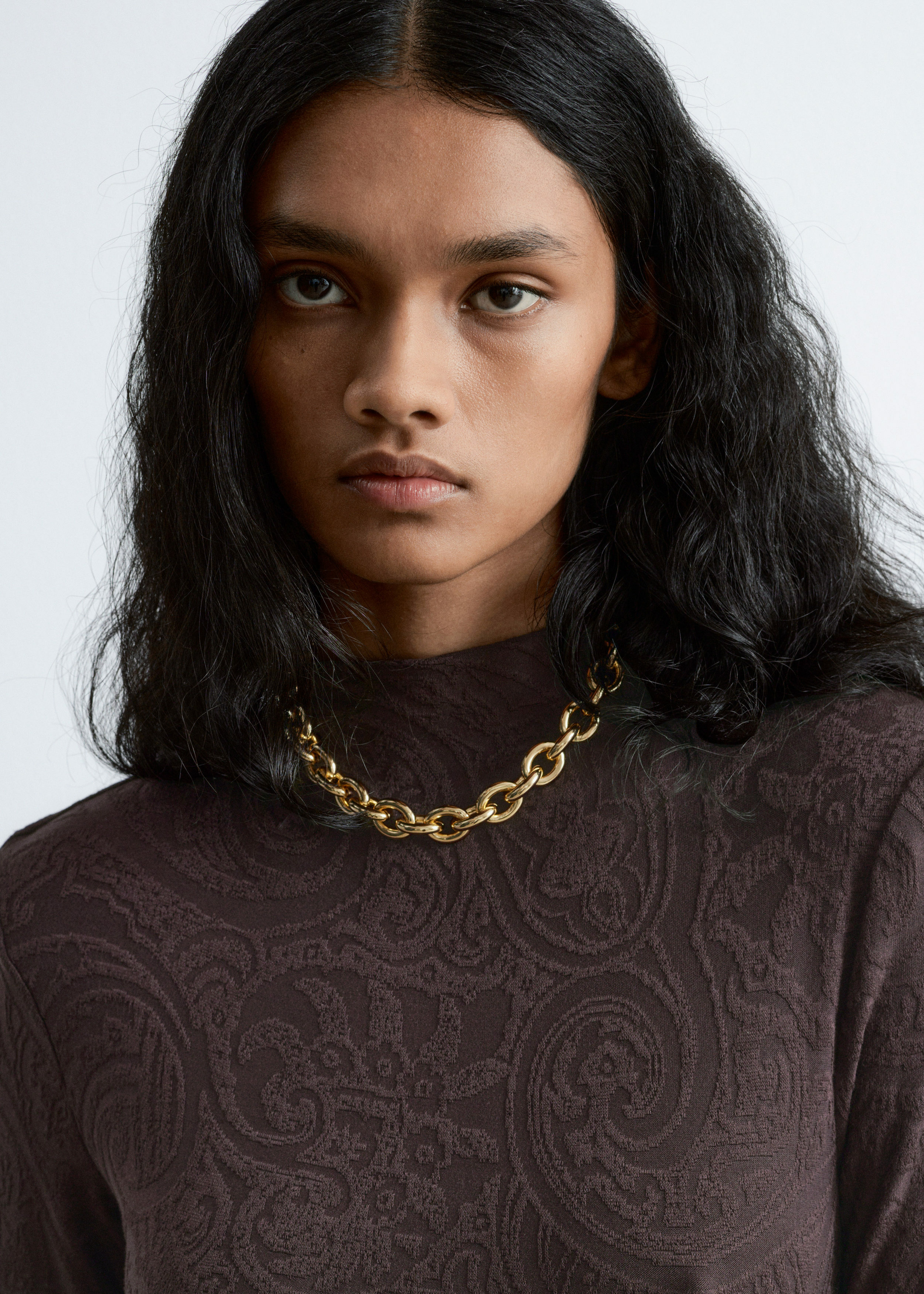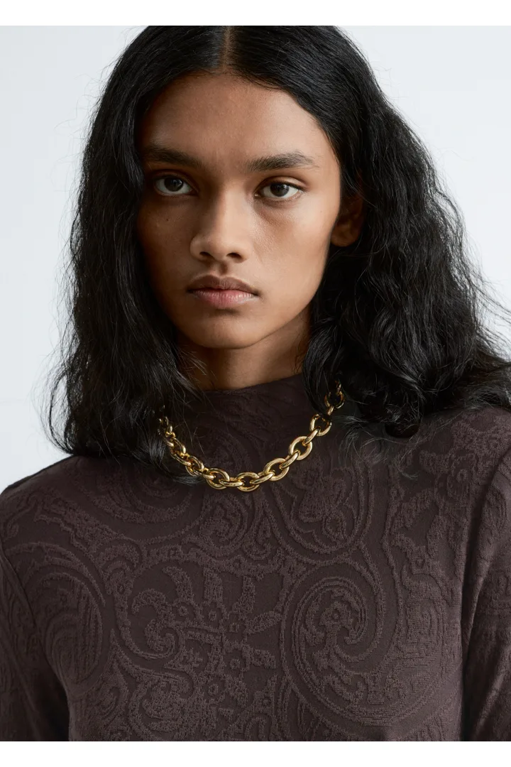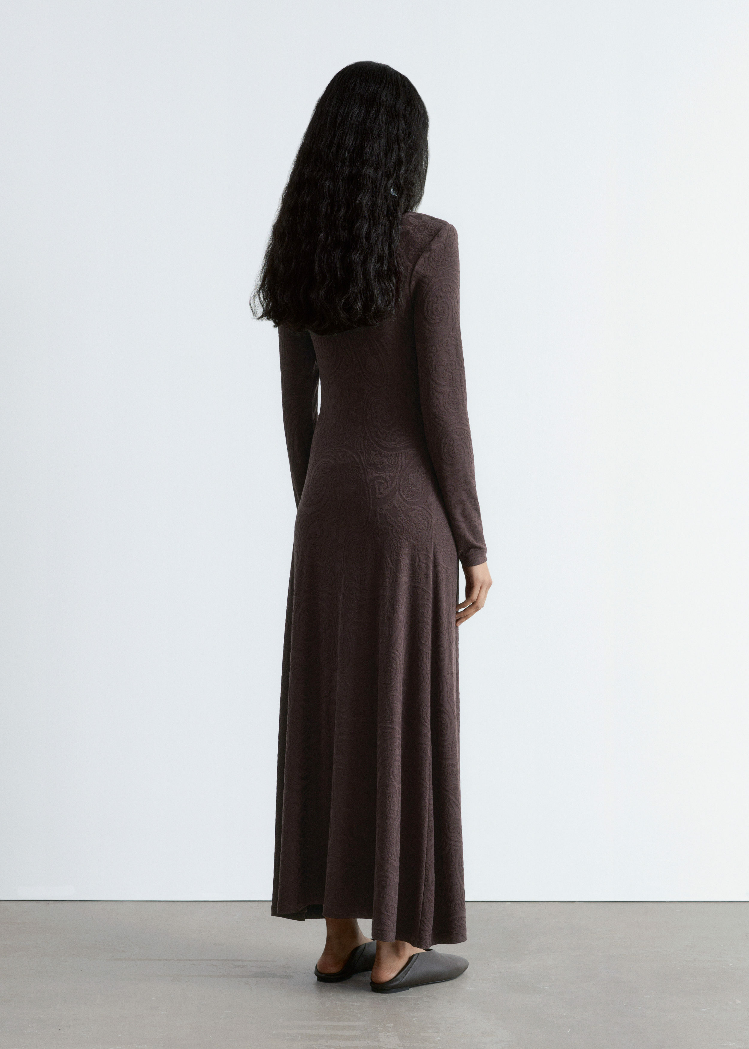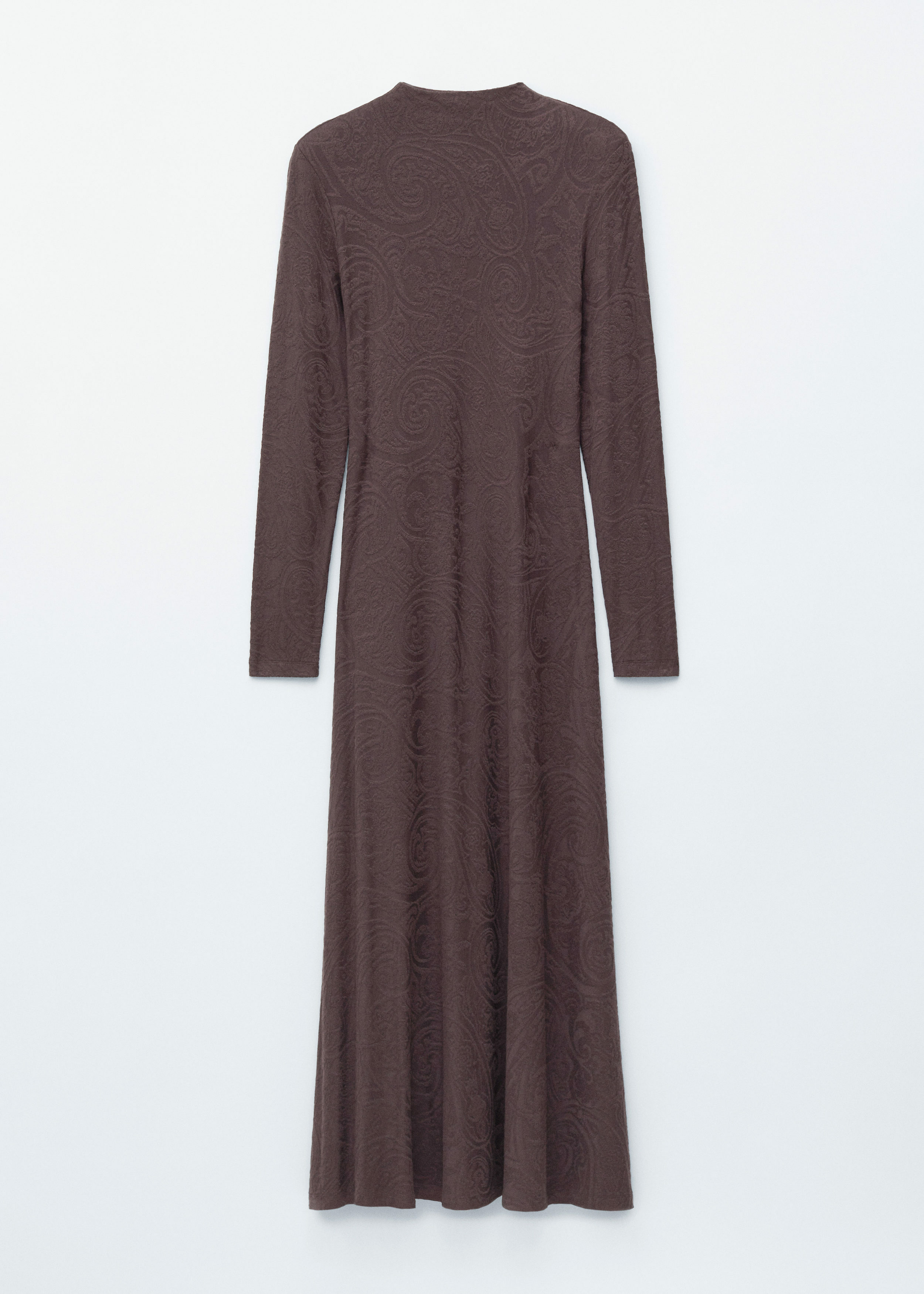 부드러운 자카드 저지 소재의 맥시 드레스예요. 페이즐리 패턴이 멋스럽답니다. 실루엣을 강조하는 패디드 숄더, 모크 넥, 롱 슬리브, 은은한 A 라인의 스커트가 특징이에요.