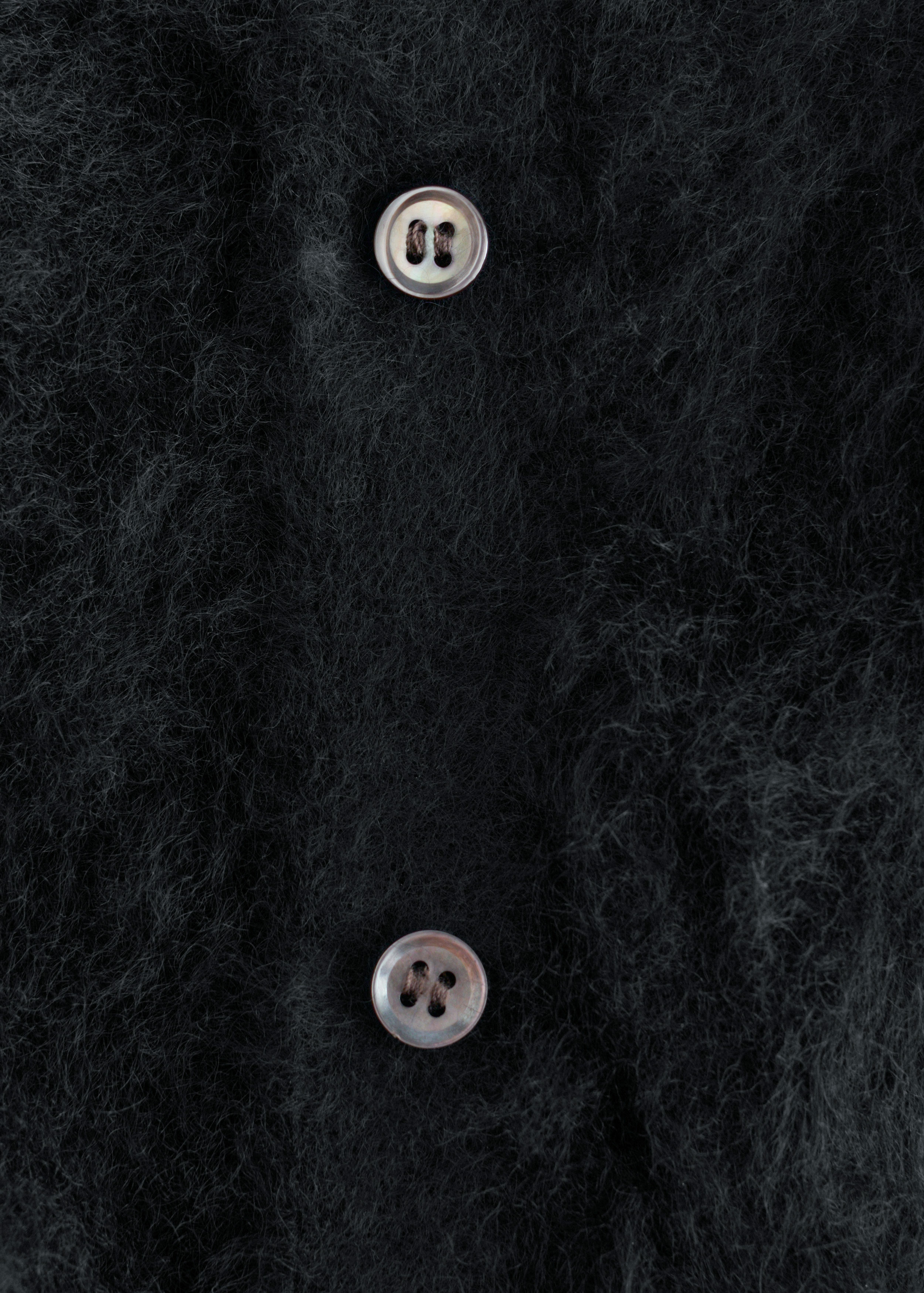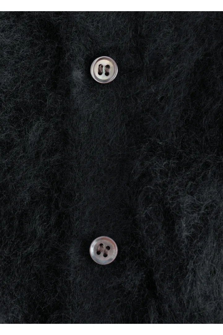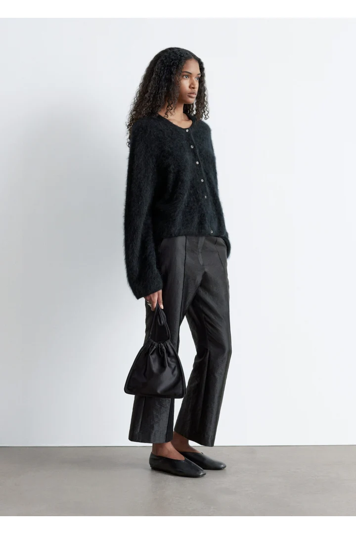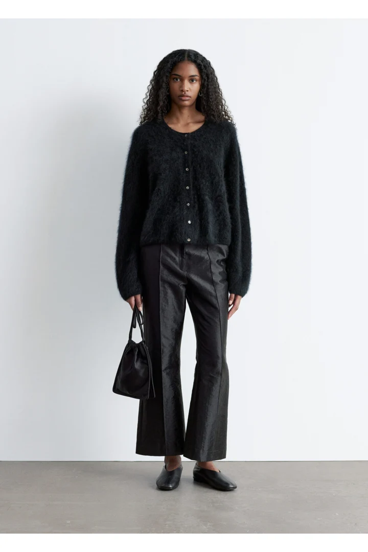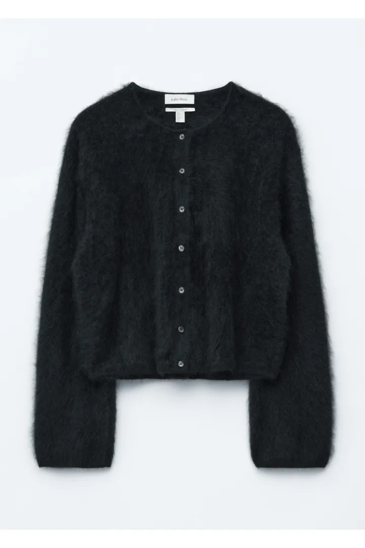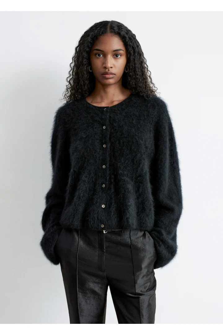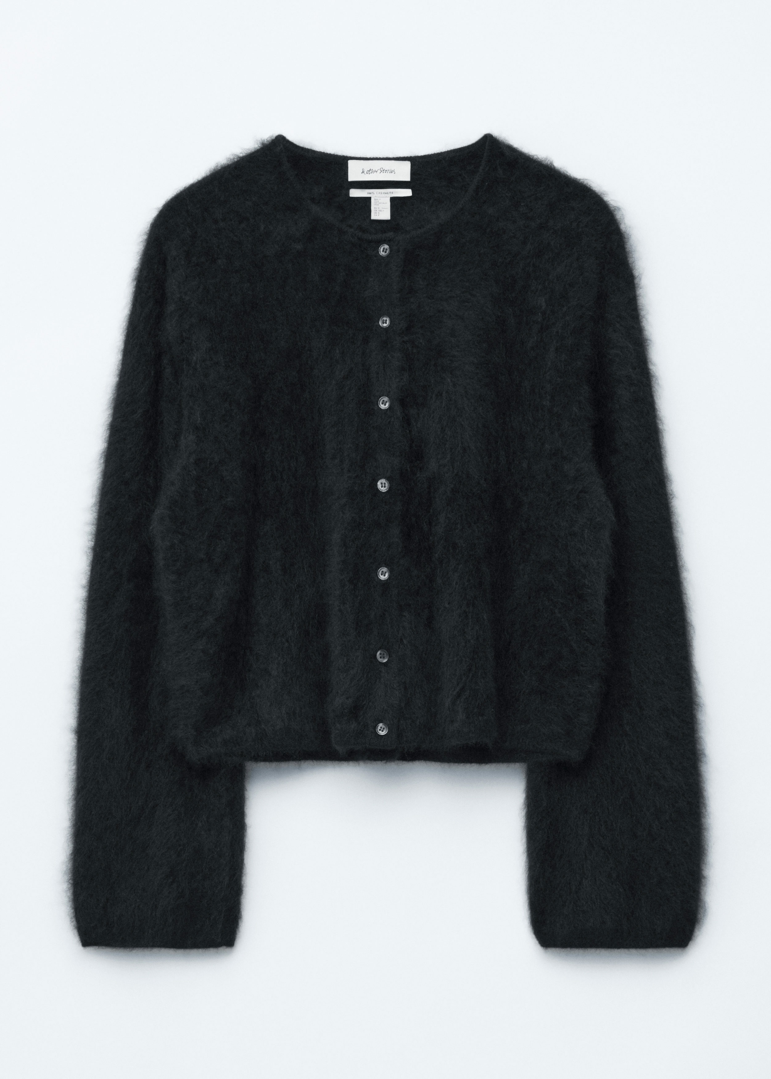 100% 캐시미어 소재의 니트 가디건이에요. 브러시드 텍스처와 쇼트 & 루즈 실루엣이 돋보이는 제품이랍니다. 라운드 넥, 드롭 숄더, 헴라인과 커프스의 립 디테일, 앞면의 단추가 자리해 있어요.