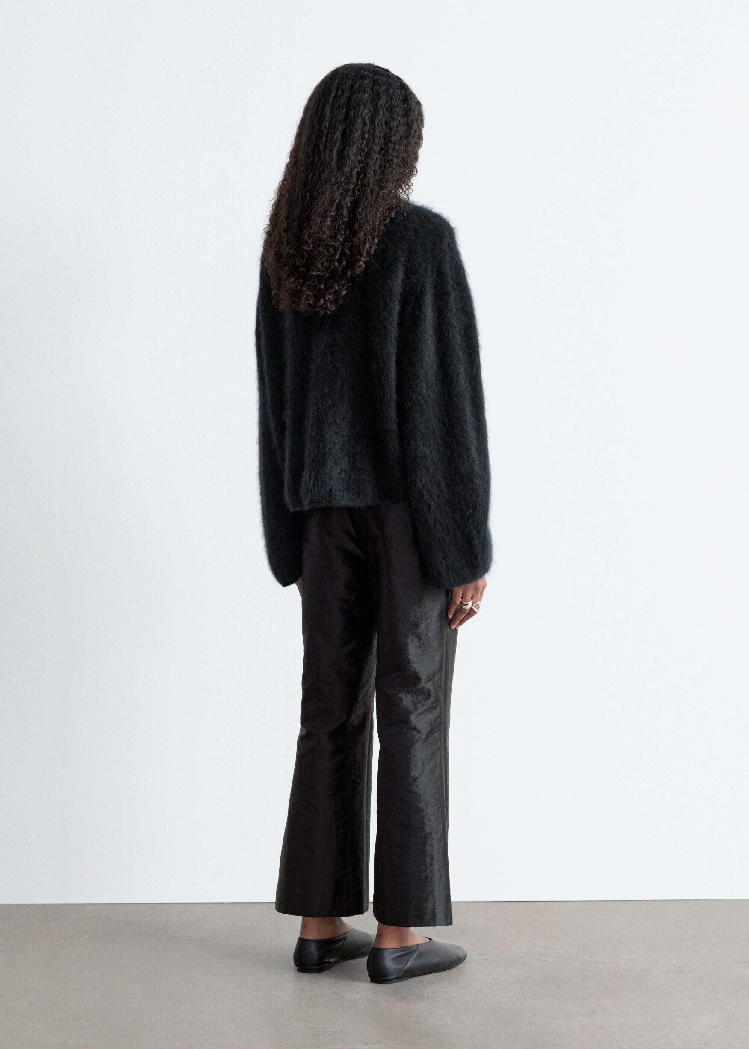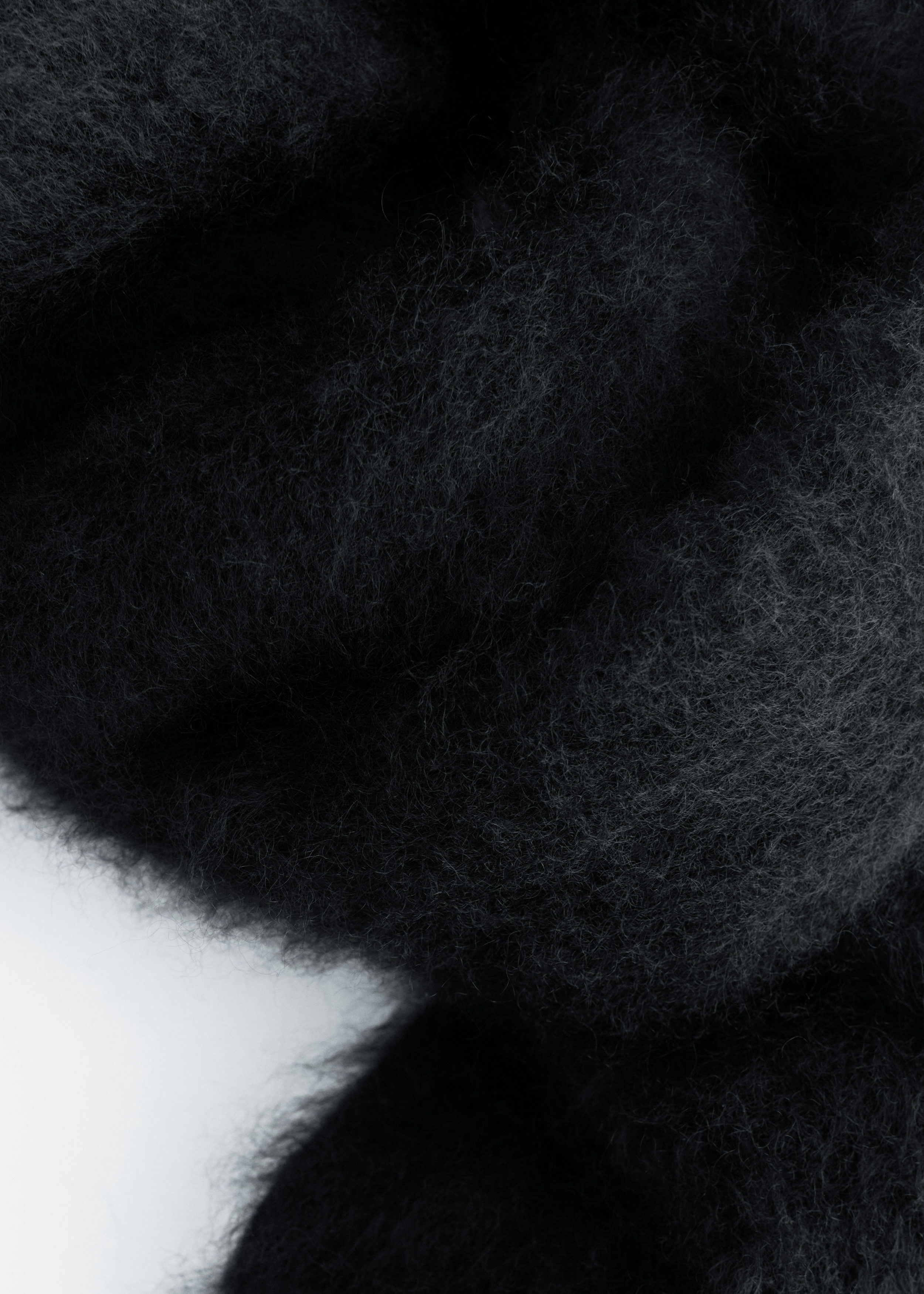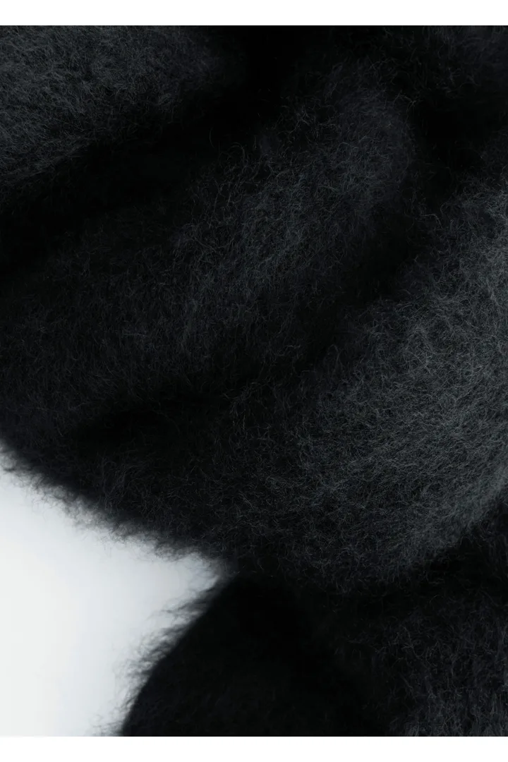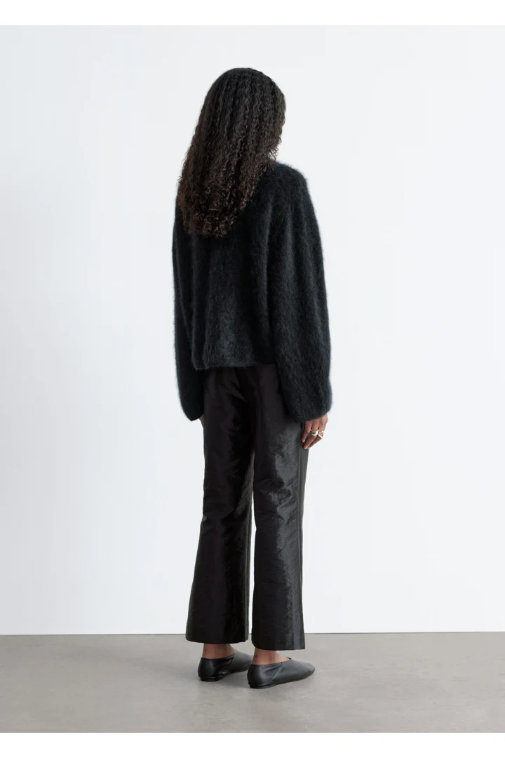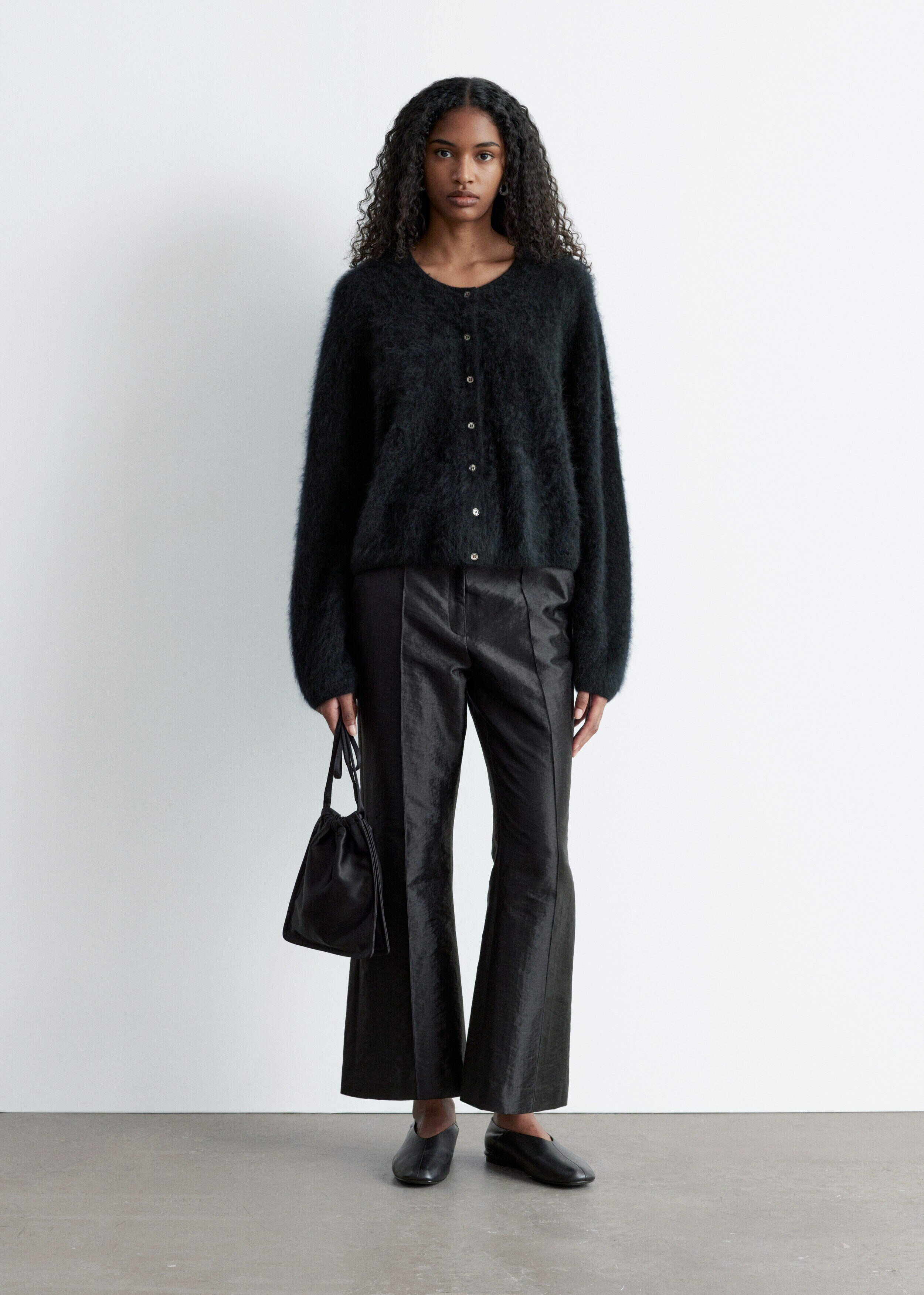 100% 캐시미어 소재의 니트 가디건이에요. 브러시드 텍스처와 쇼트 & 루즈 실루엣이 돋보이는 제품이랍니다. 라운드 넥, 드롭 숄더, 헴라인과 커프스의 립 디테일, 앞면의 단추가 자리해 있어요.