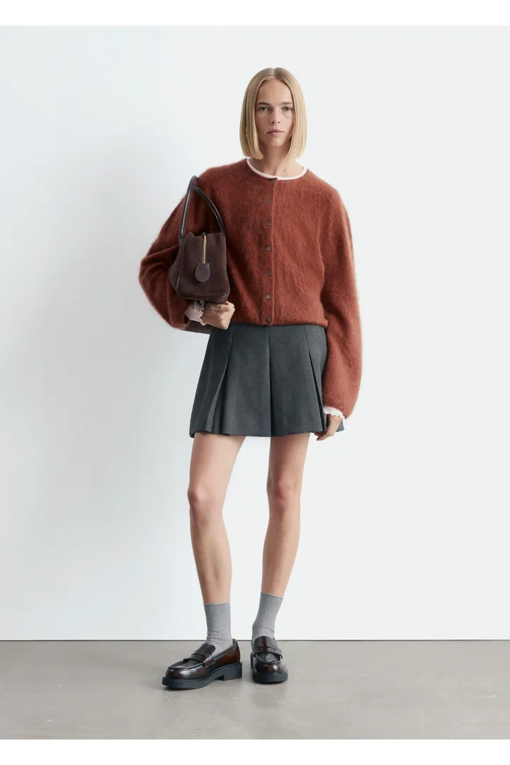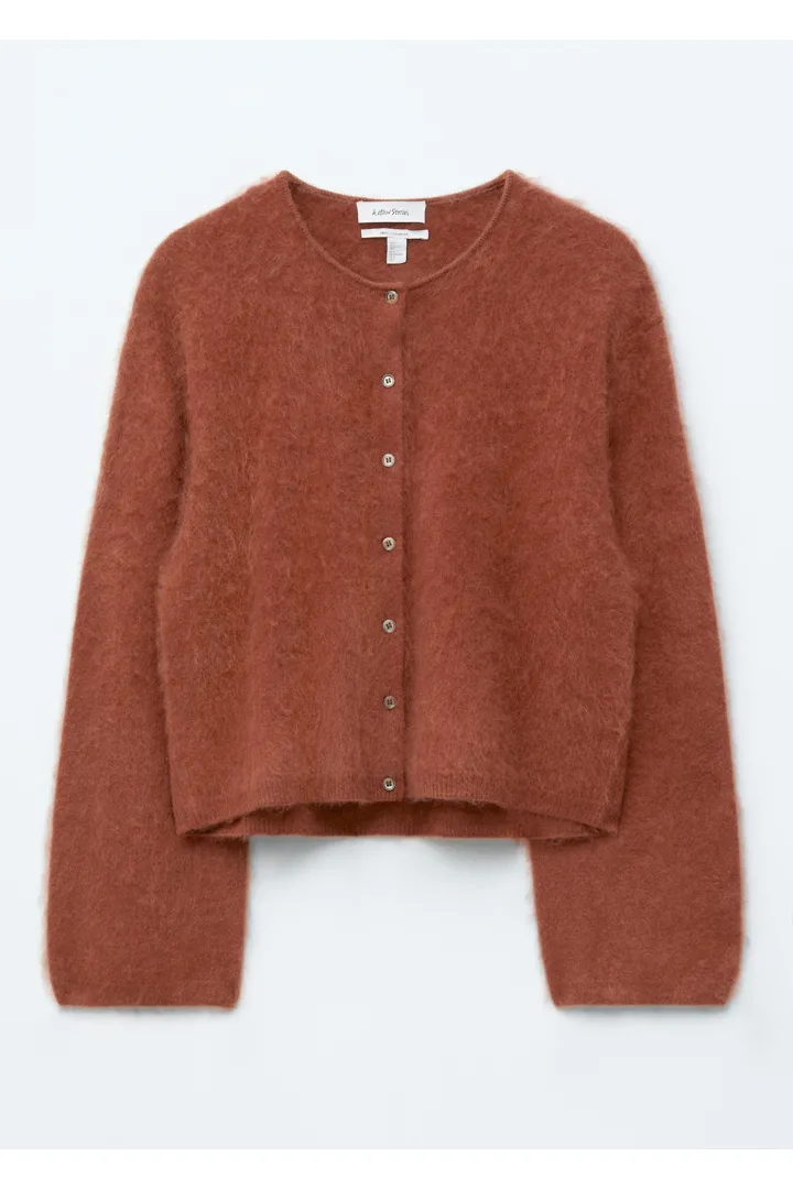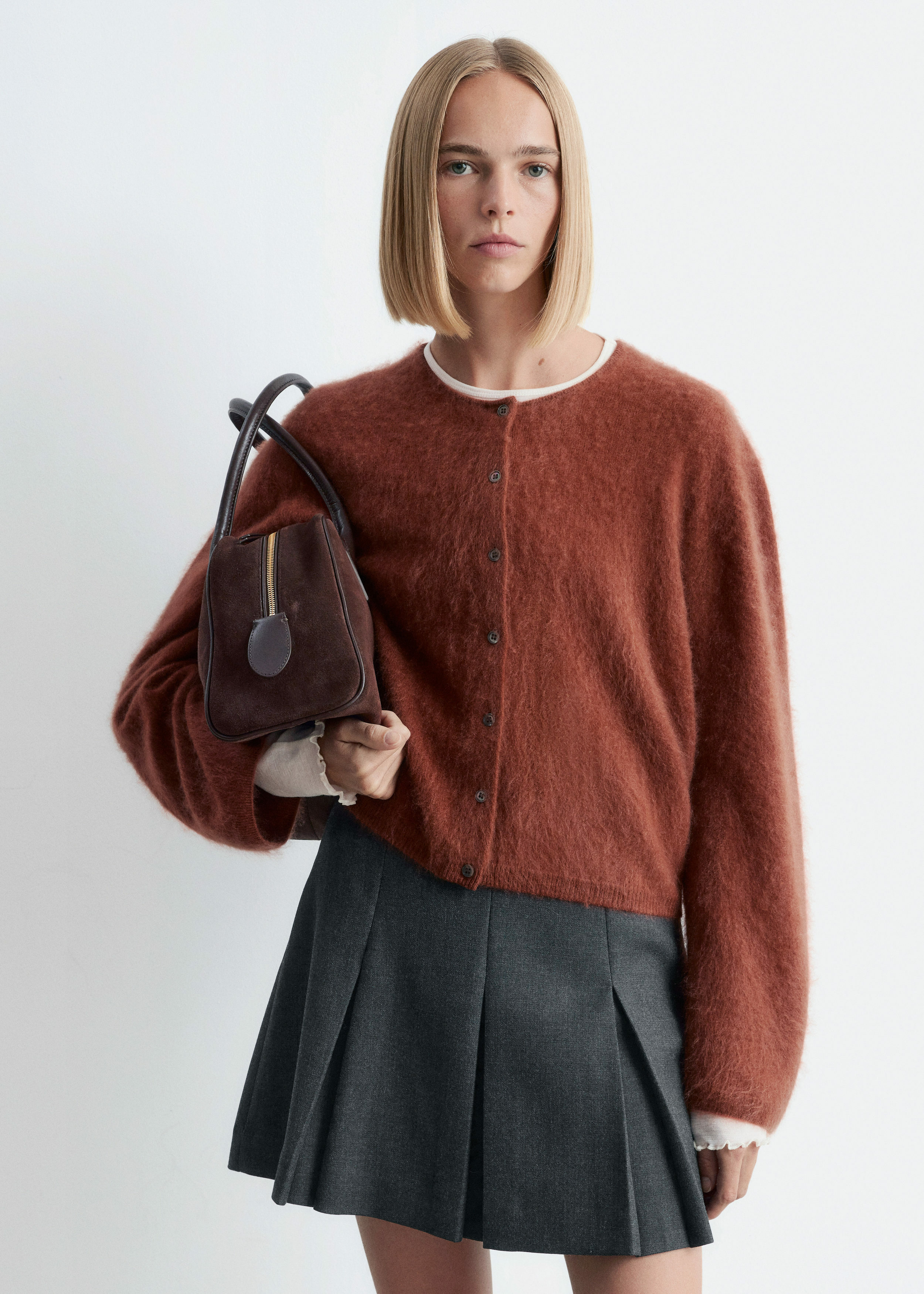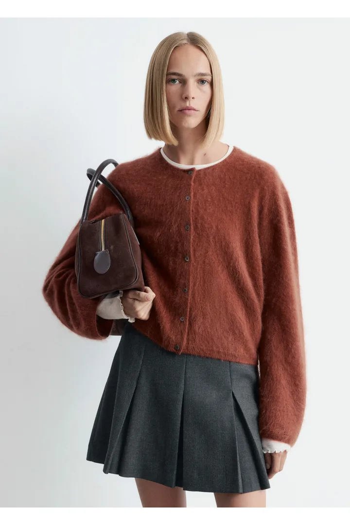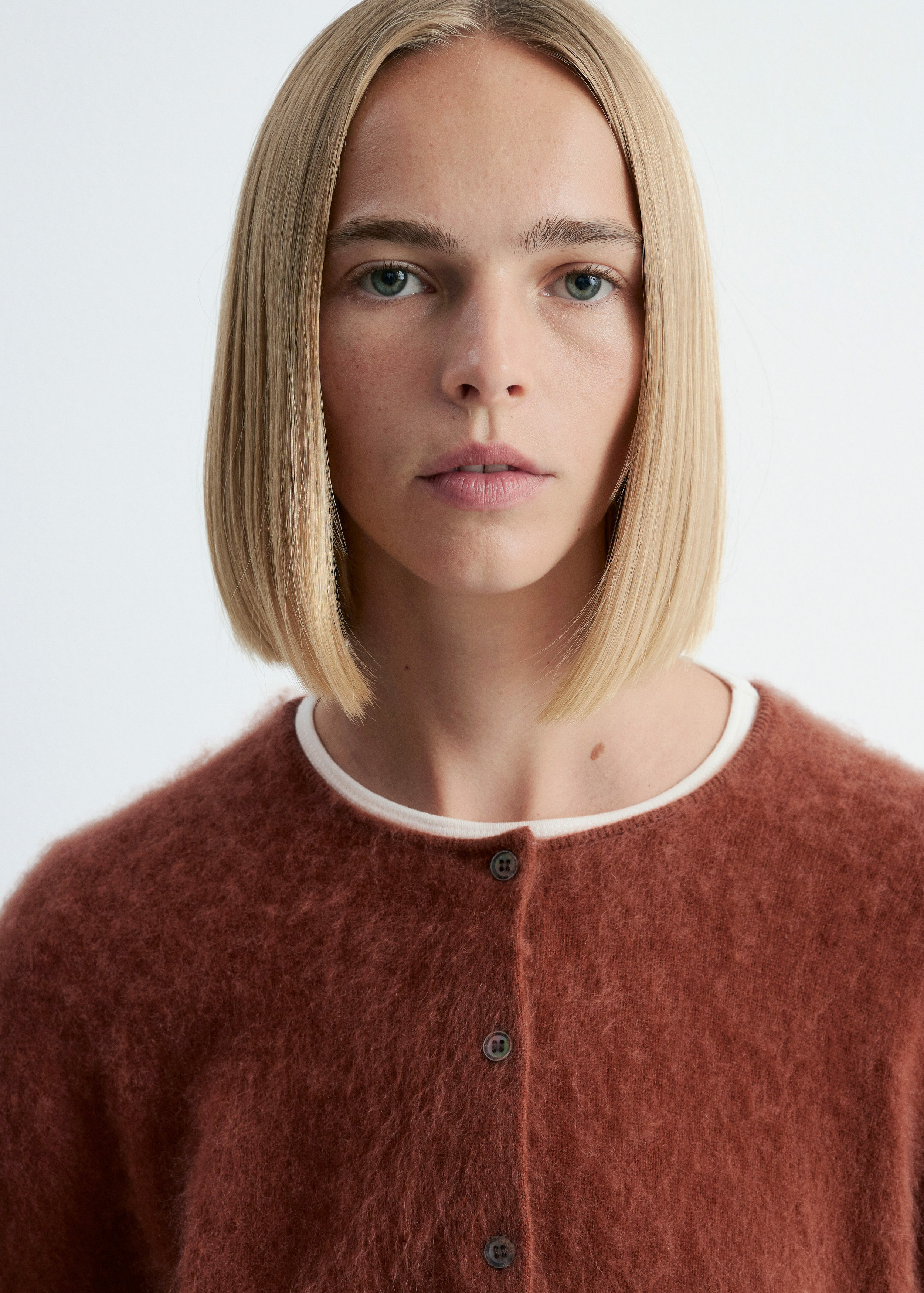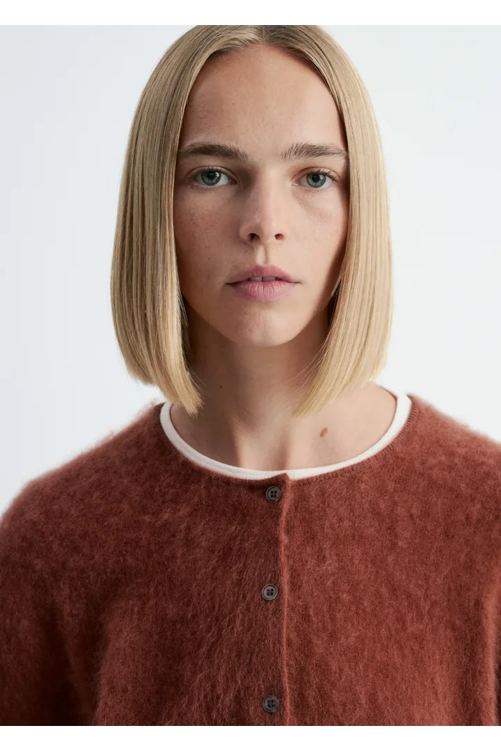 100% 캐시미어 소재의 니트 가디건이에요. 브러시드 텍스처와 쇼트 & 루즈 실루엣이 돋보이는 제품이랍니다. 라운드 넥, 드롭 숄더, 헴라인과 커프스의 립 디테일, 앞면의 단추가 자리해 있어요.