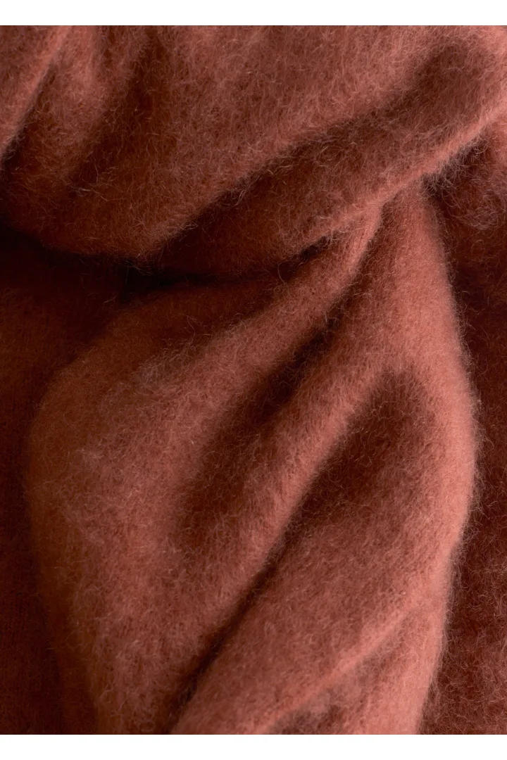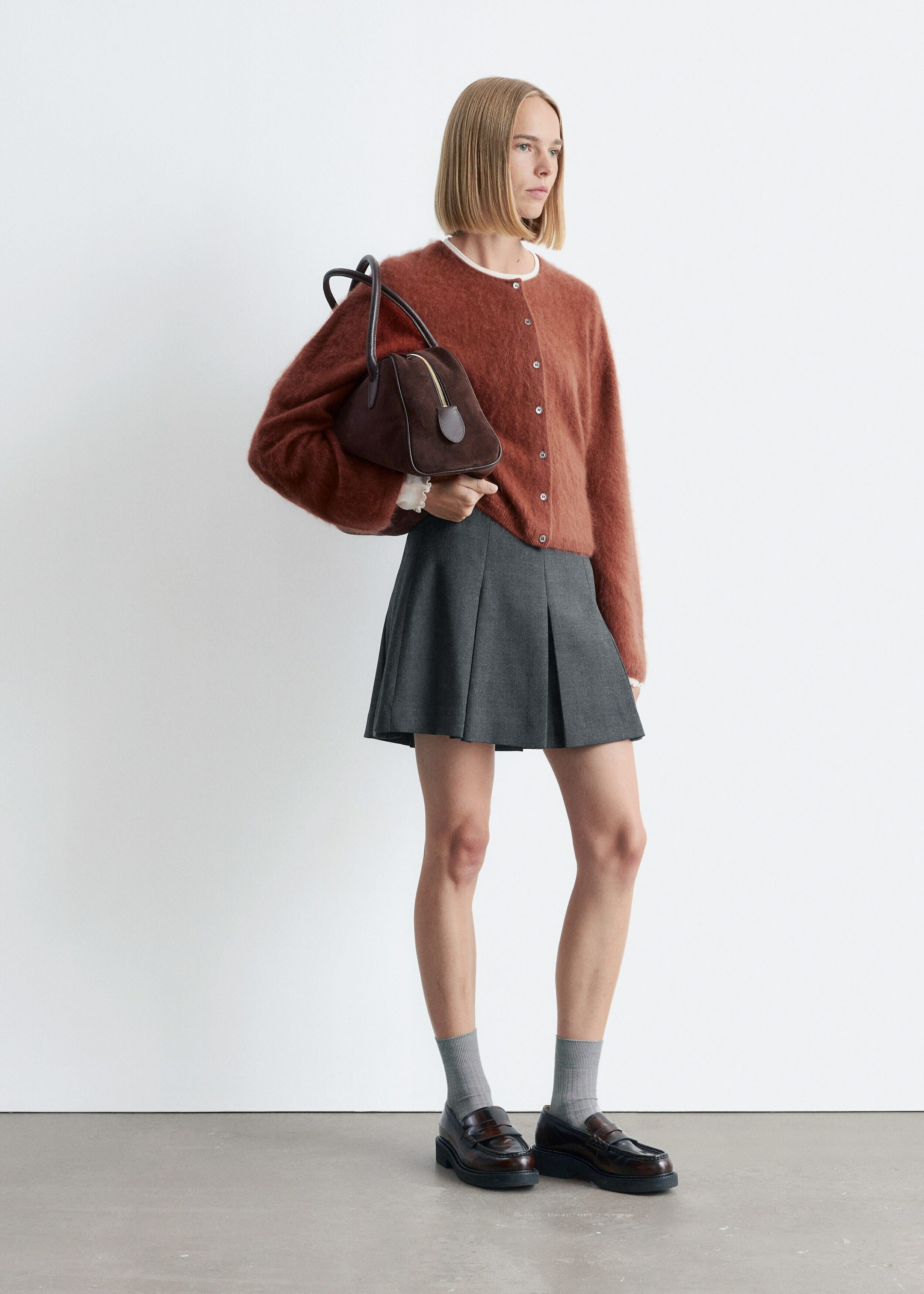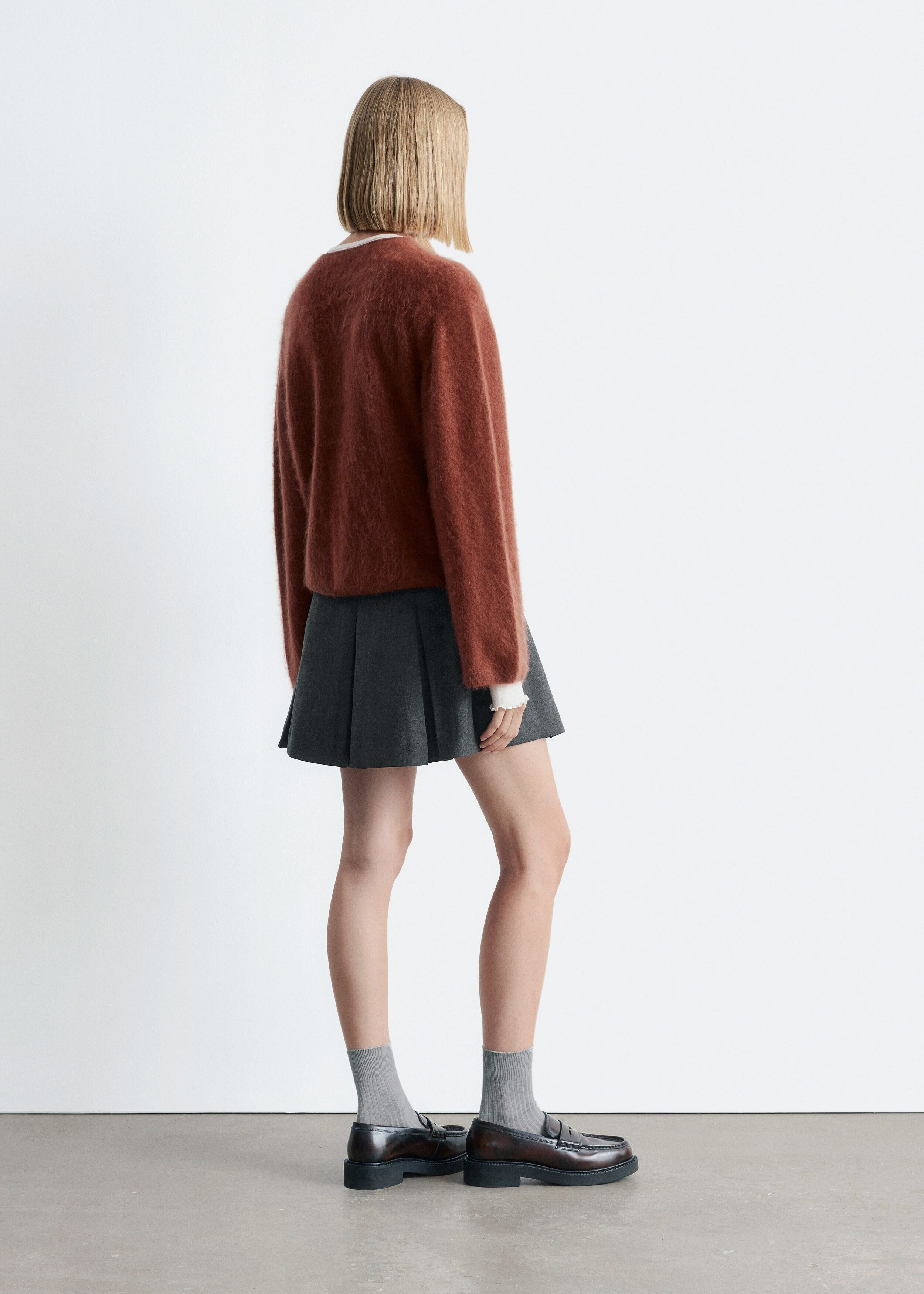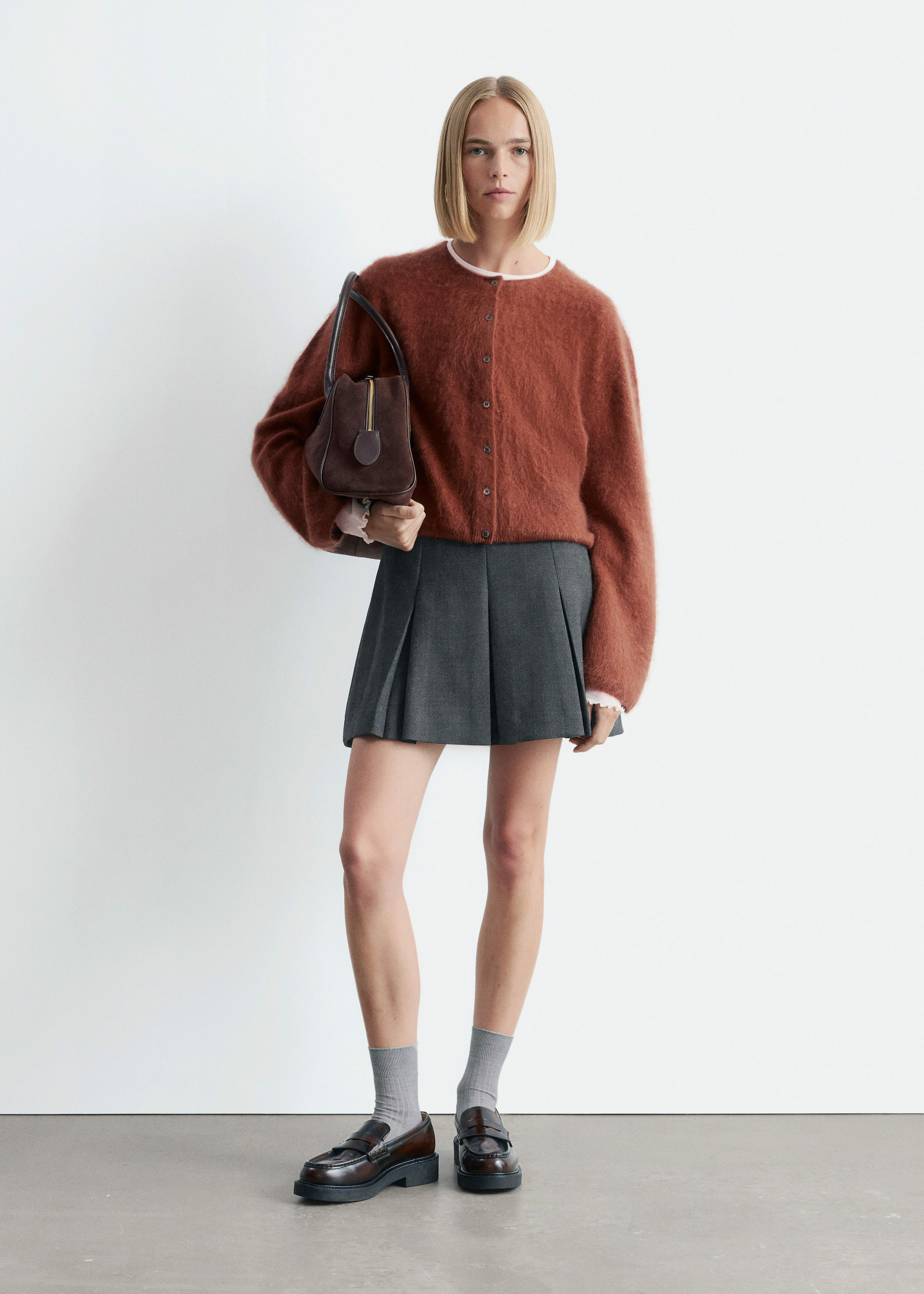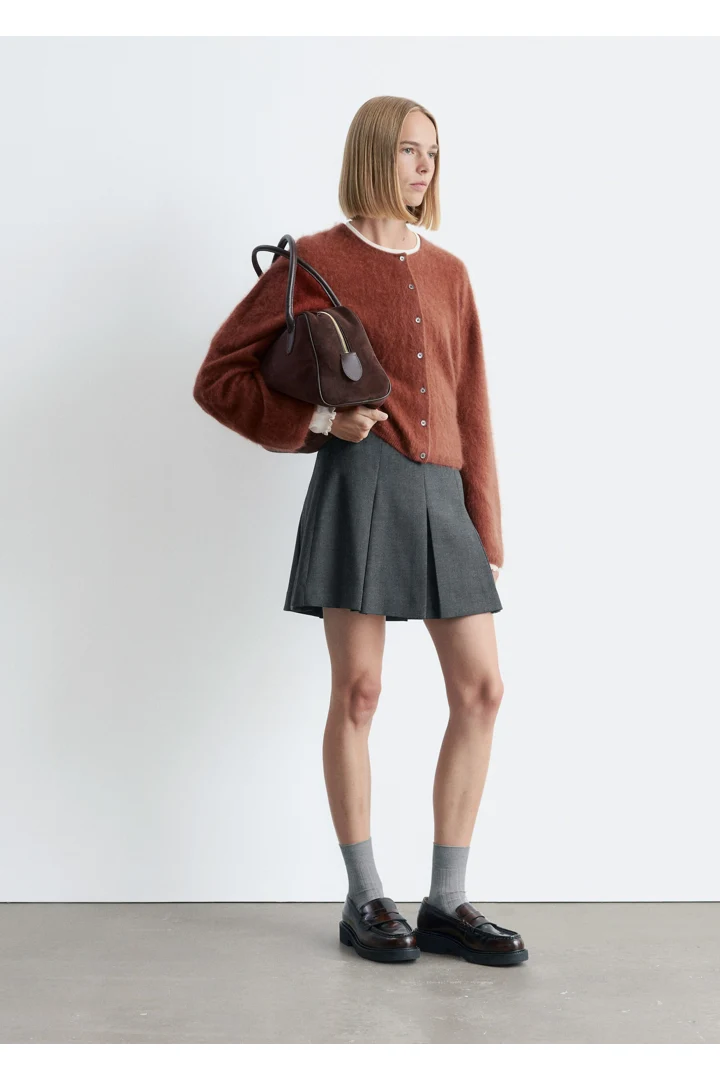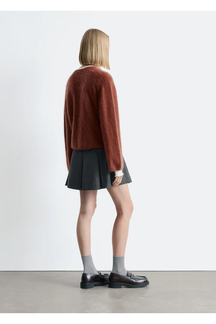 100% 캐시미어 소재의 니트 가디건이에요. 브러시드 텍스처와 쇼트 & 루즈 실루엣이 돋보이는 제품이랍니다. 라운드 넥, 드롭 숄더, 헴라인과 커프스의 립 디테일, 앞면의 단추가 자리해 있어요.