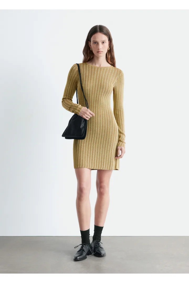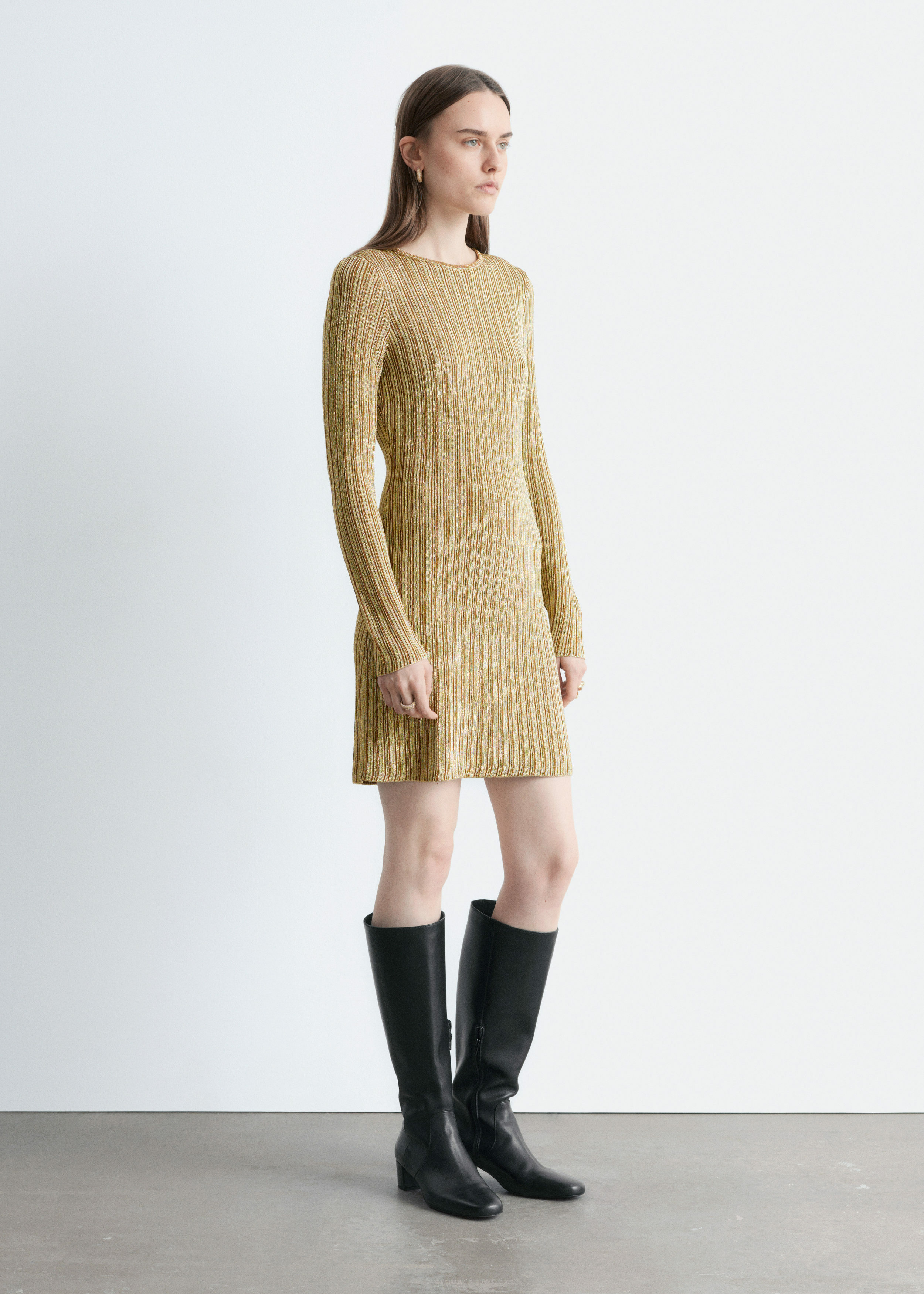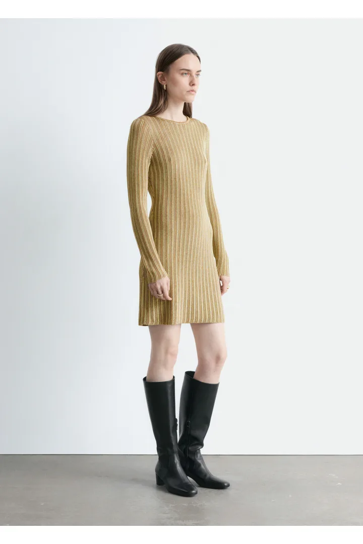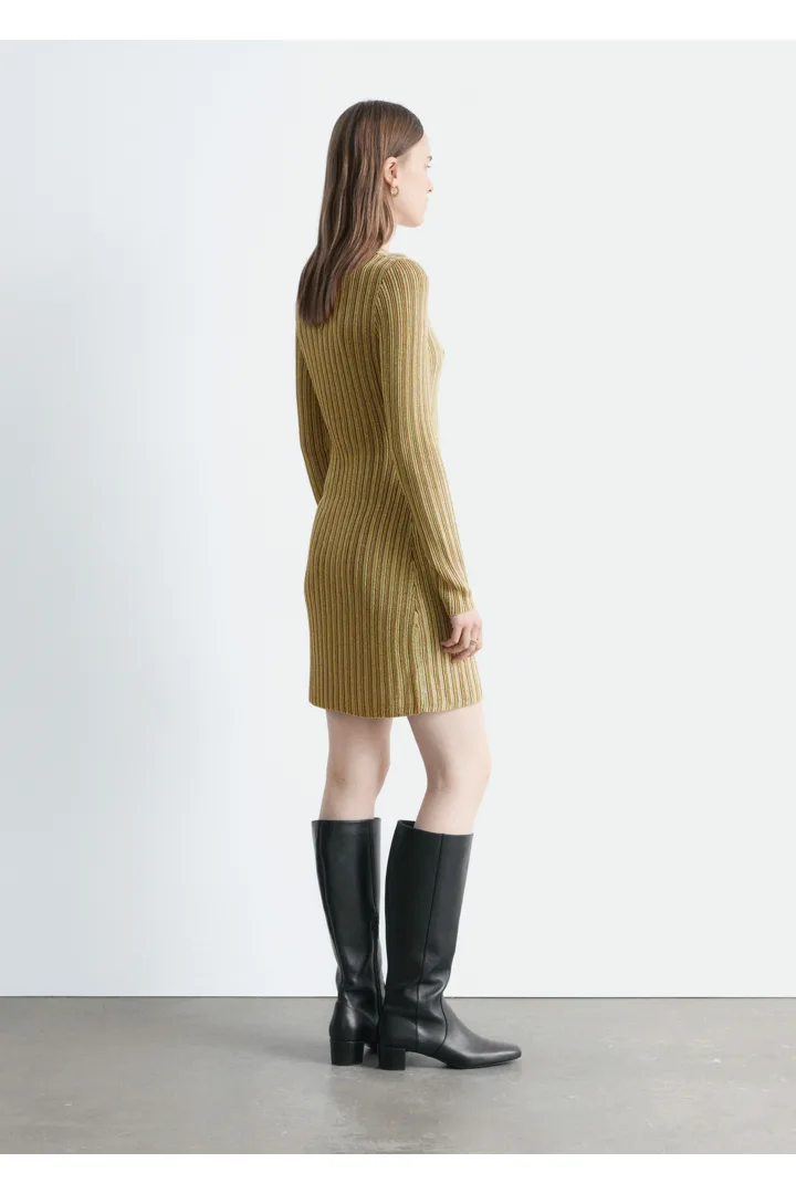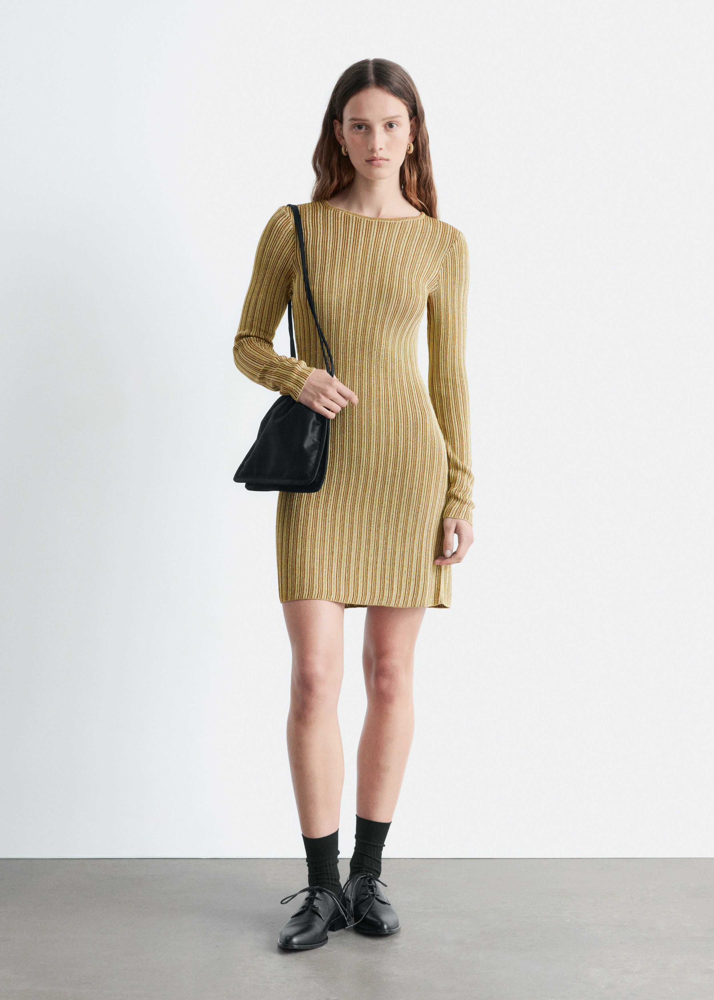 메탈릭 원사가 더해진 립 니트 소재로 탄생한 미니 드레스예요. 핏 되는 실루엣, 라운드 네크라인, 롱 슬리브가 특징이며, 네크라인에는 키홀 단추가 자리해 있어요.