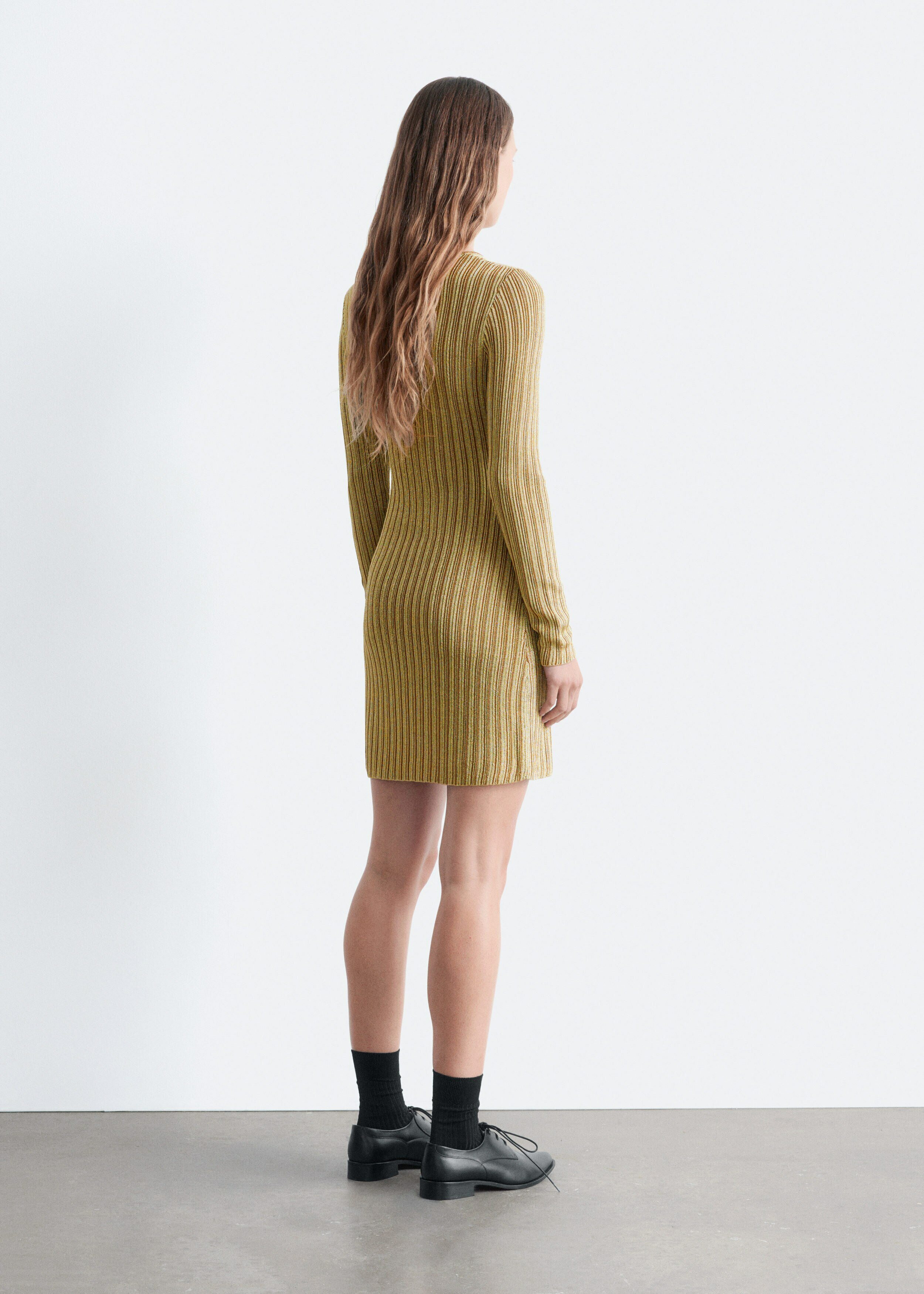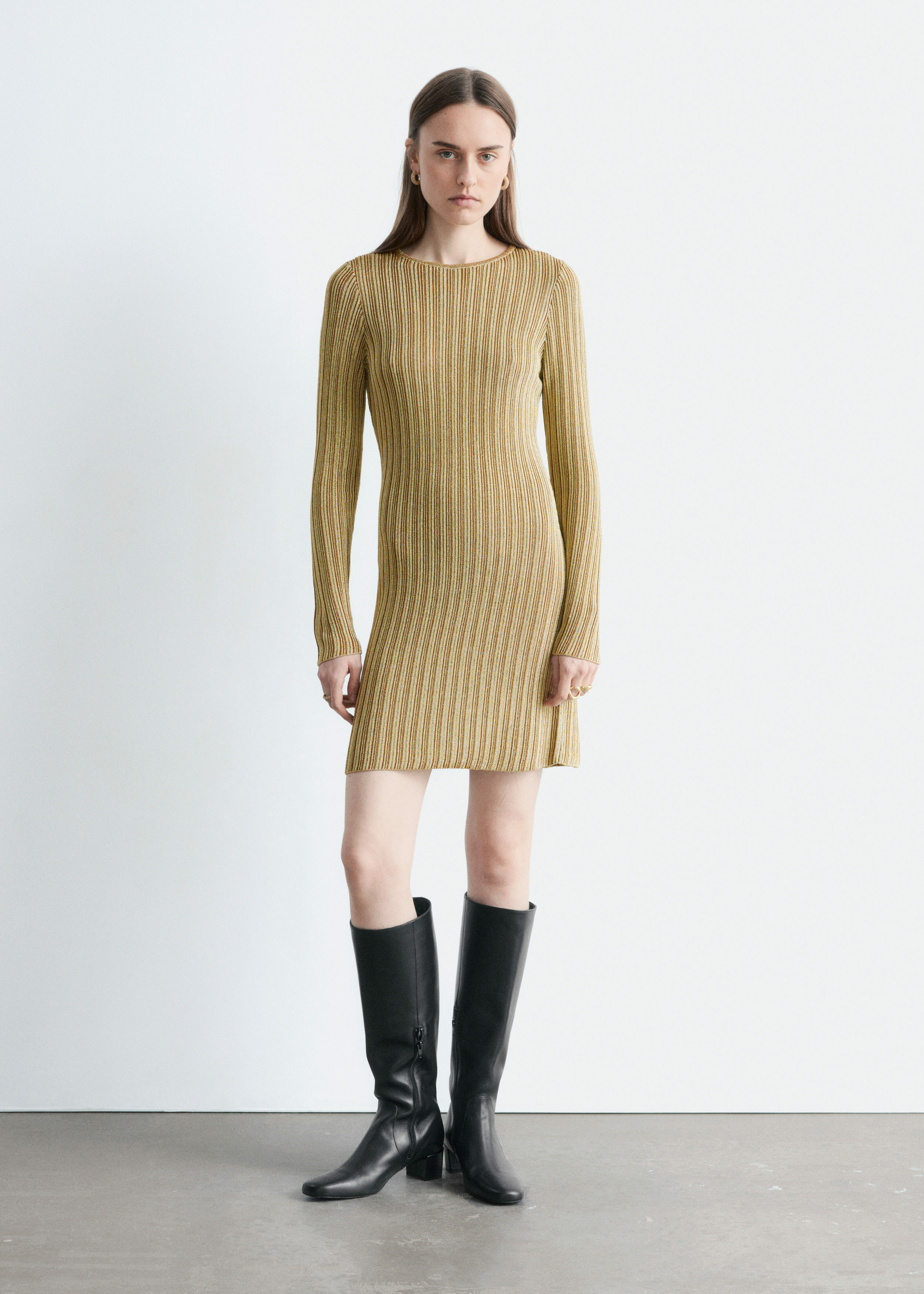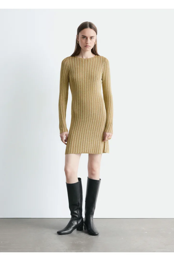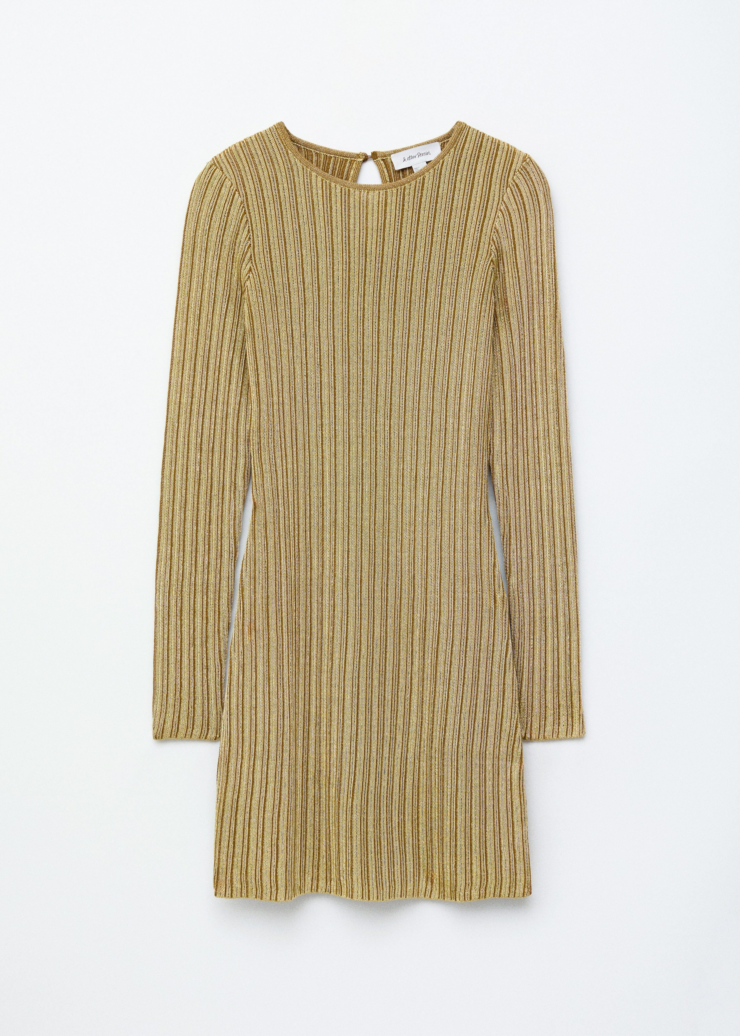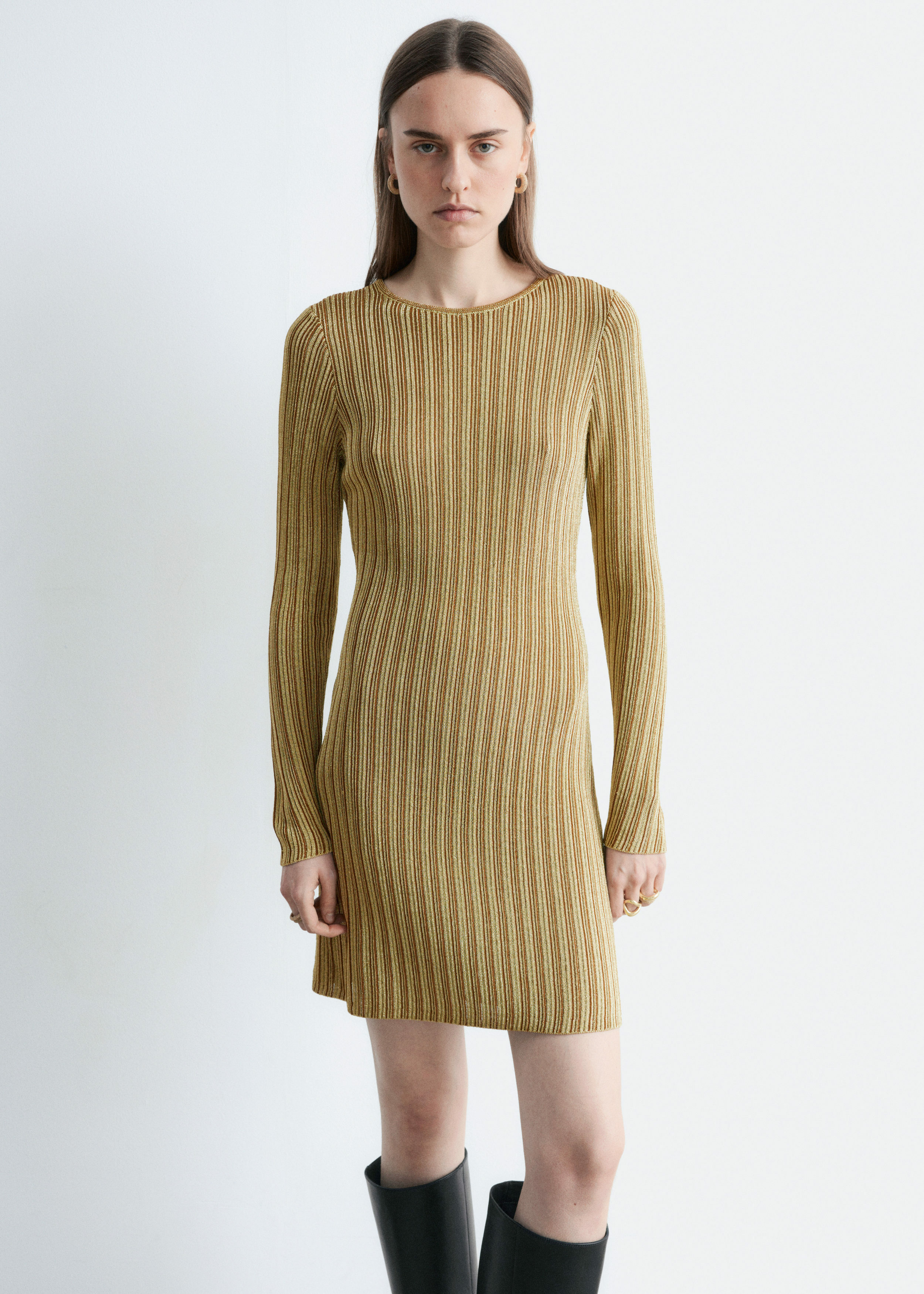메탈릭 원사가 더해진 립 니트 소재로 탄생한 미니 드레스예요. 핏 되는 실루엣, 라운드 네크라인, 롱 슬리브가 특징이며, 네크라인에는 키홀 단추가 자리해 있어요.