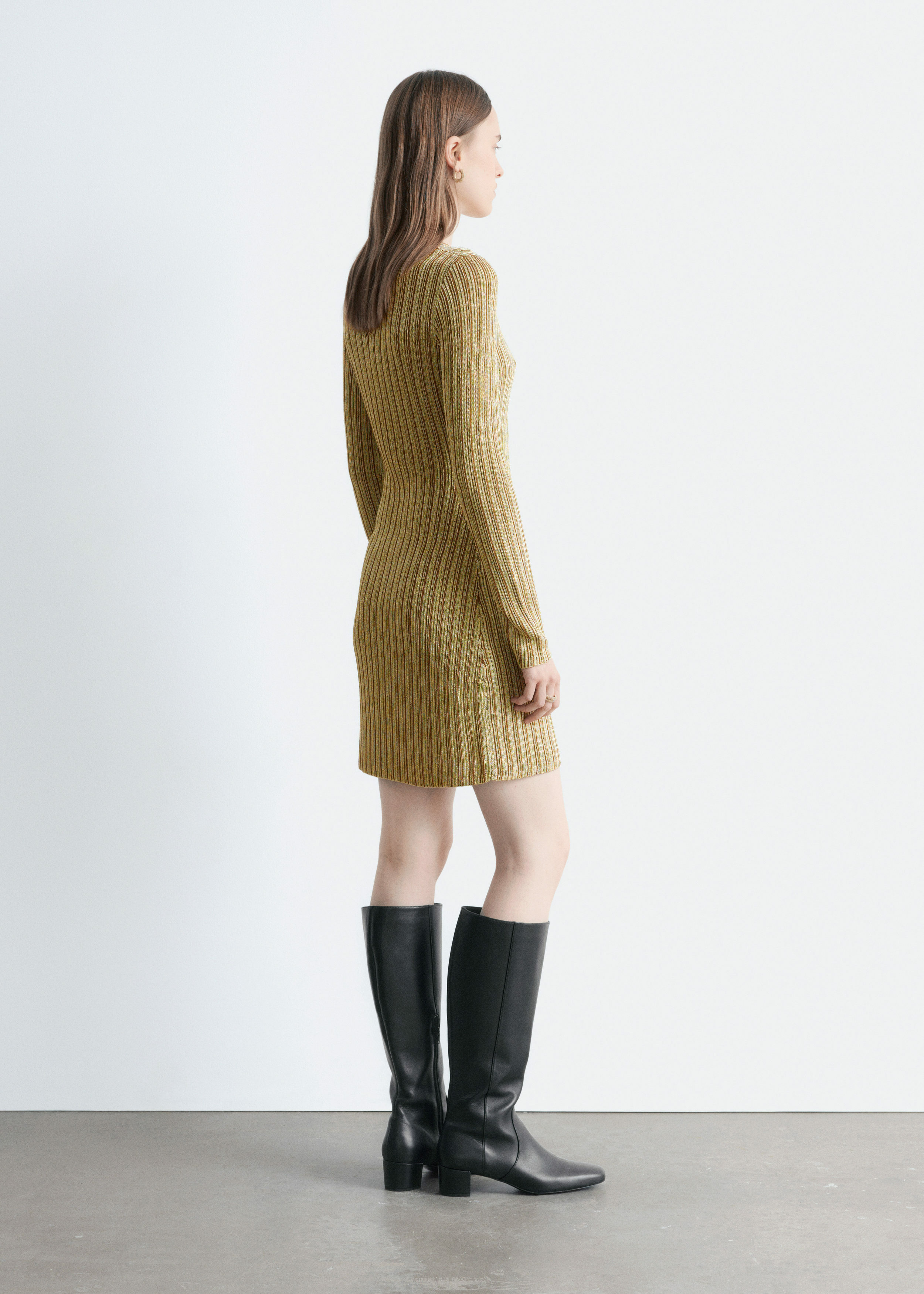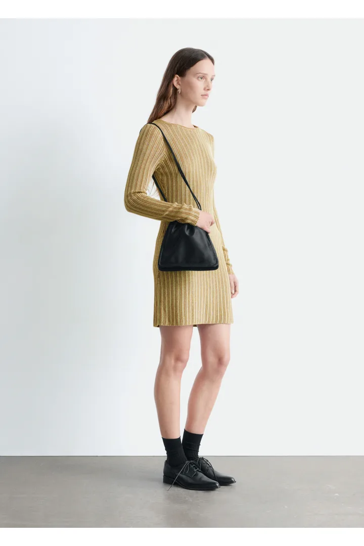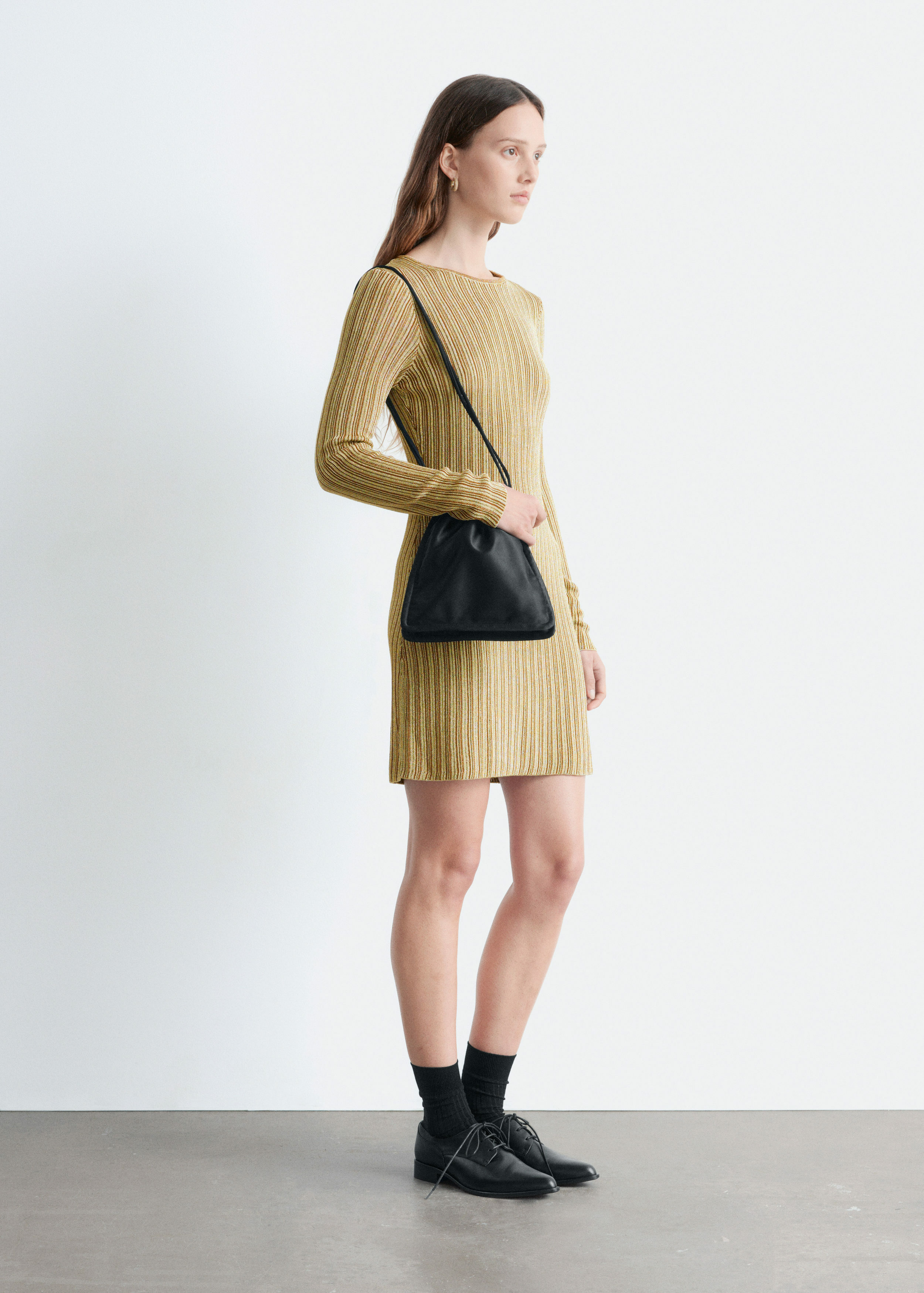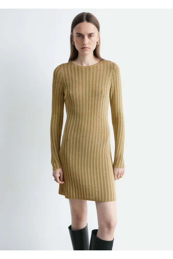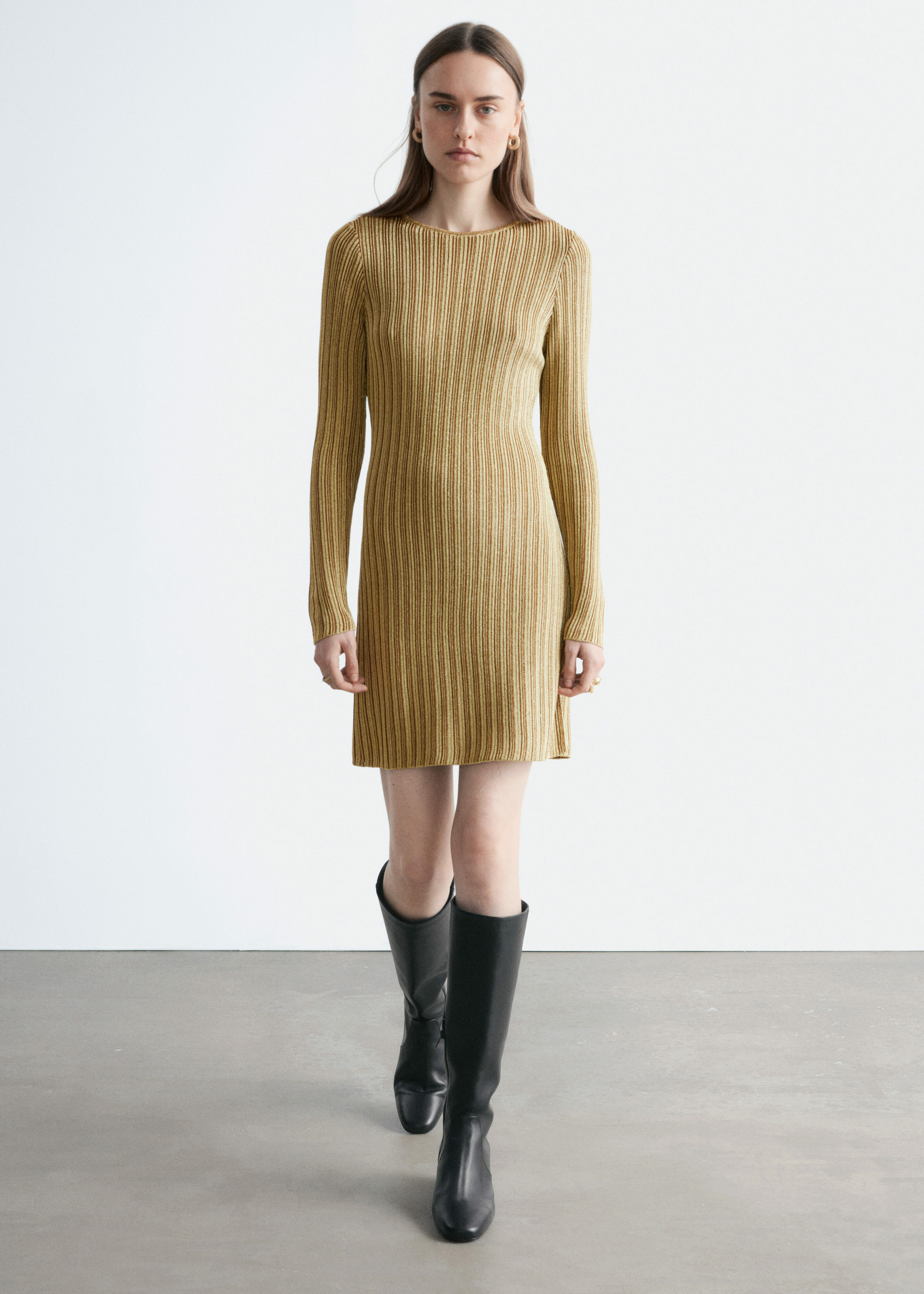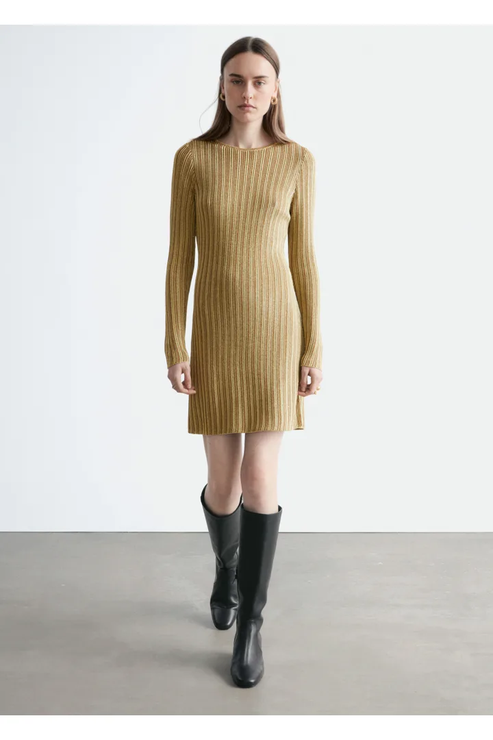 메탈릭 원사가 더해진 립 니트 소재로 탄생한 미니 드레스예요. 핏 되는 실루엣, 라운드 네크라인, 롱 슬리브가 특징이며, 네크라인에는 키홀 단추가 자리해 있어요.