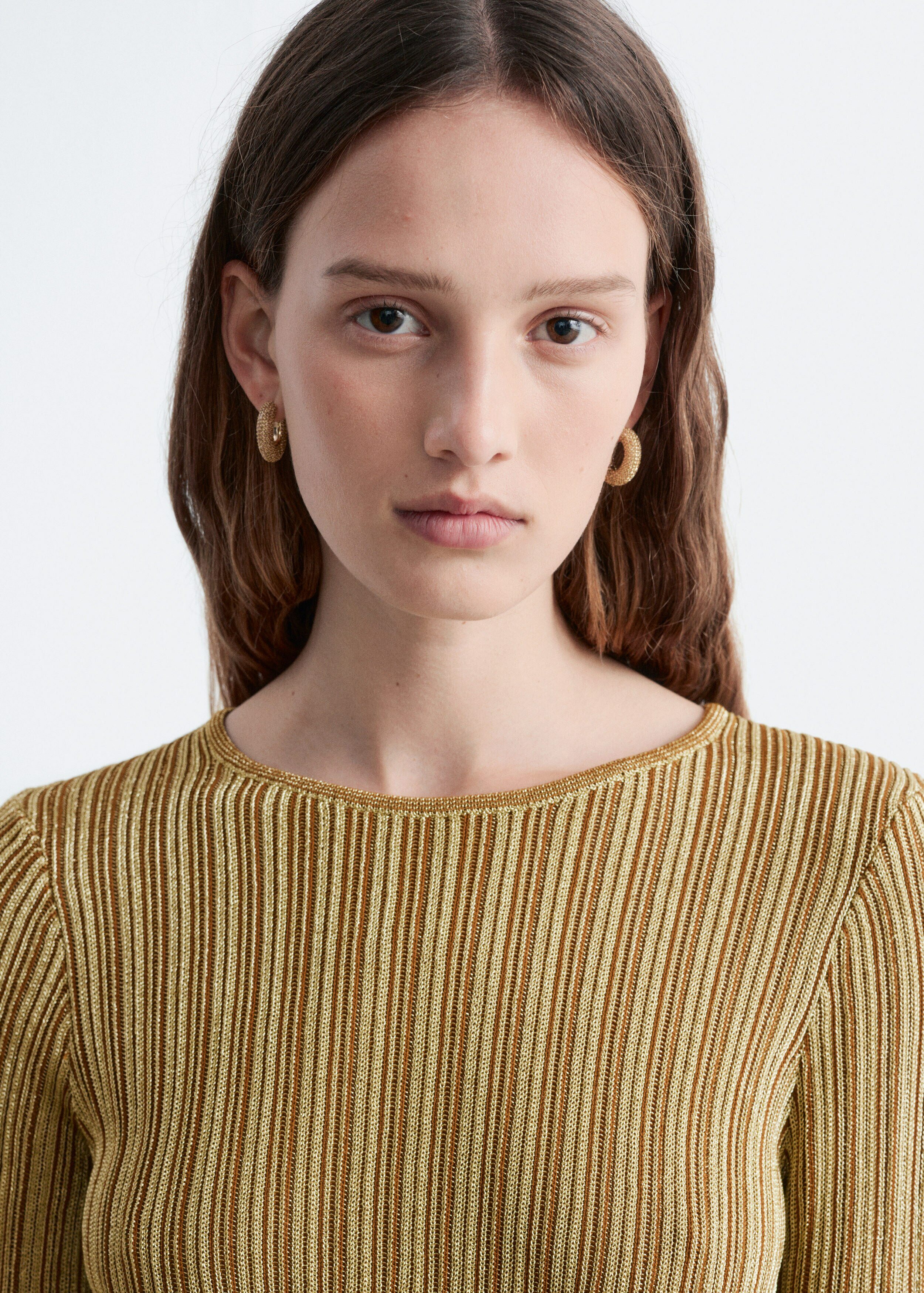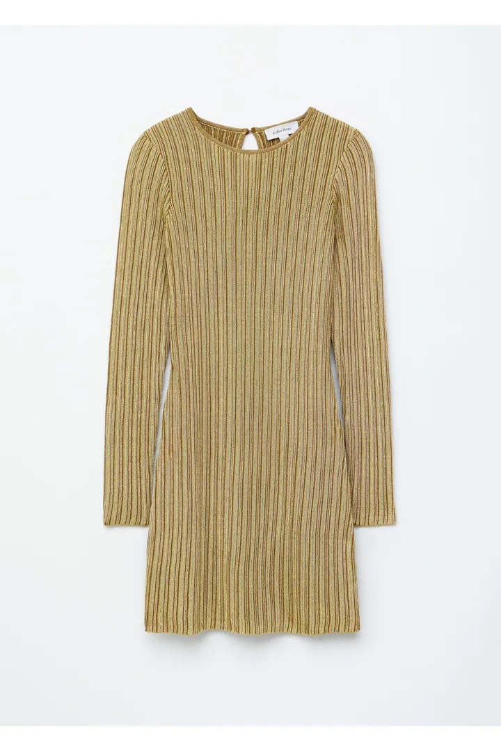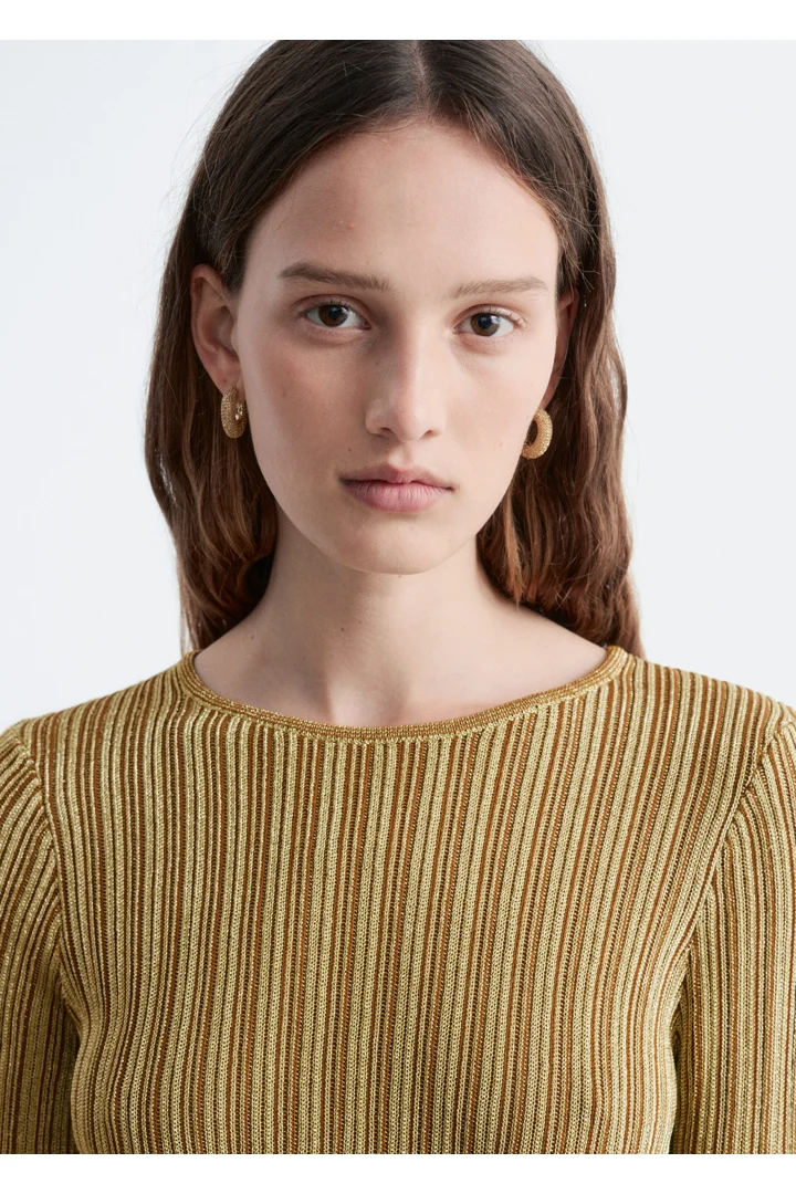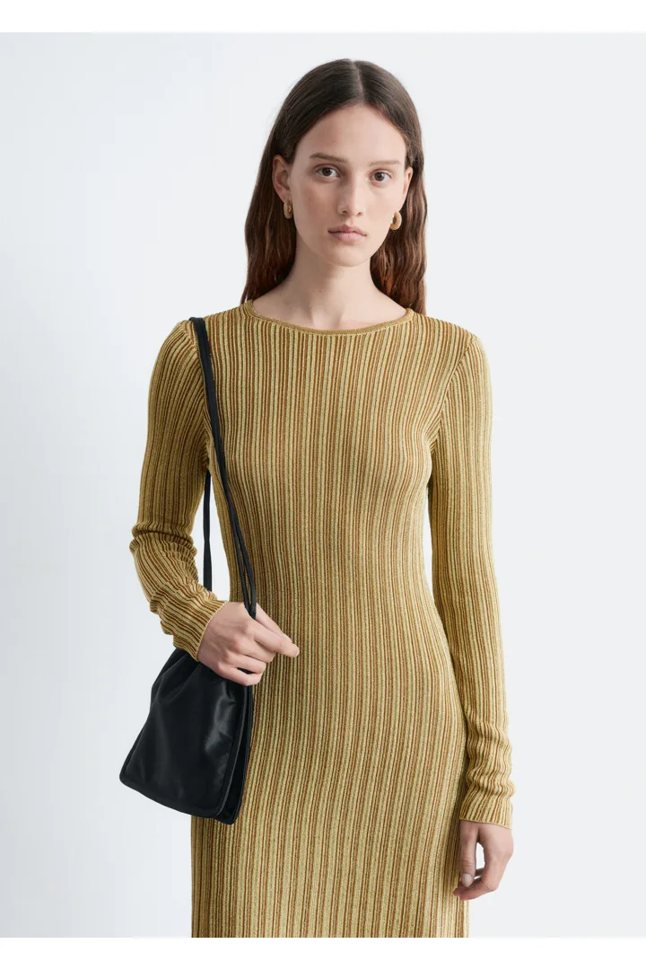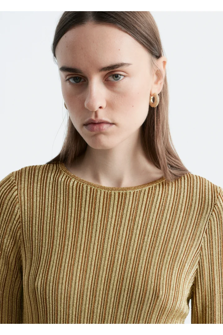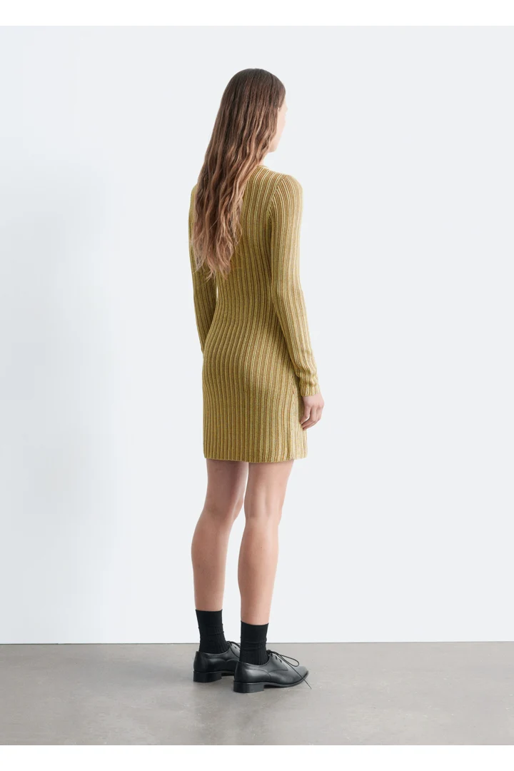 메탈릭 원사가 더해진 립 니트 소재로 탄생한 미니 드레스예요. 핏 되는 실루엣, 라운드 네크라인, 롱 슬리브가 특징이며, 네크라인에는 키홀 단추가 자리해 있어요.