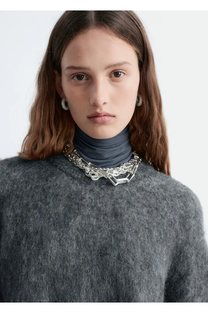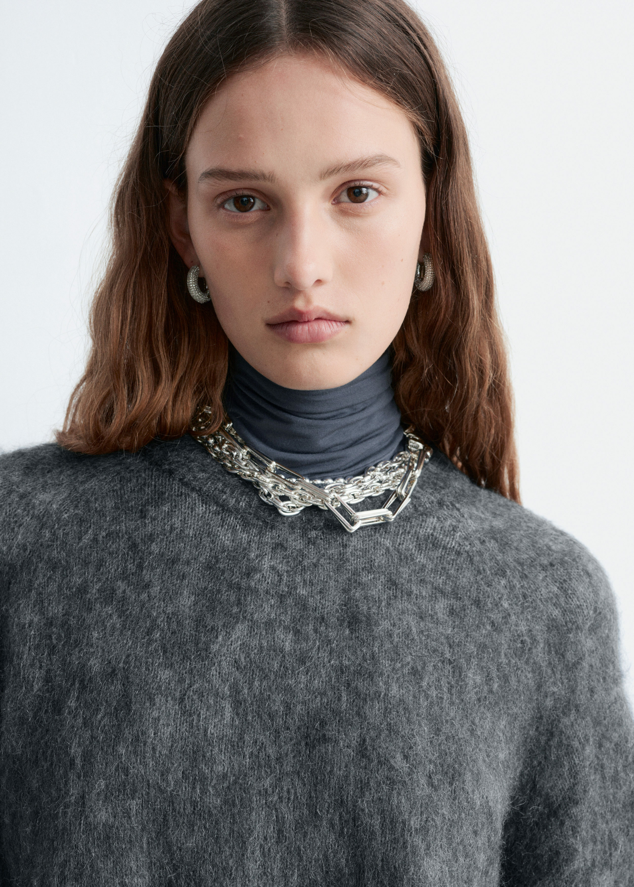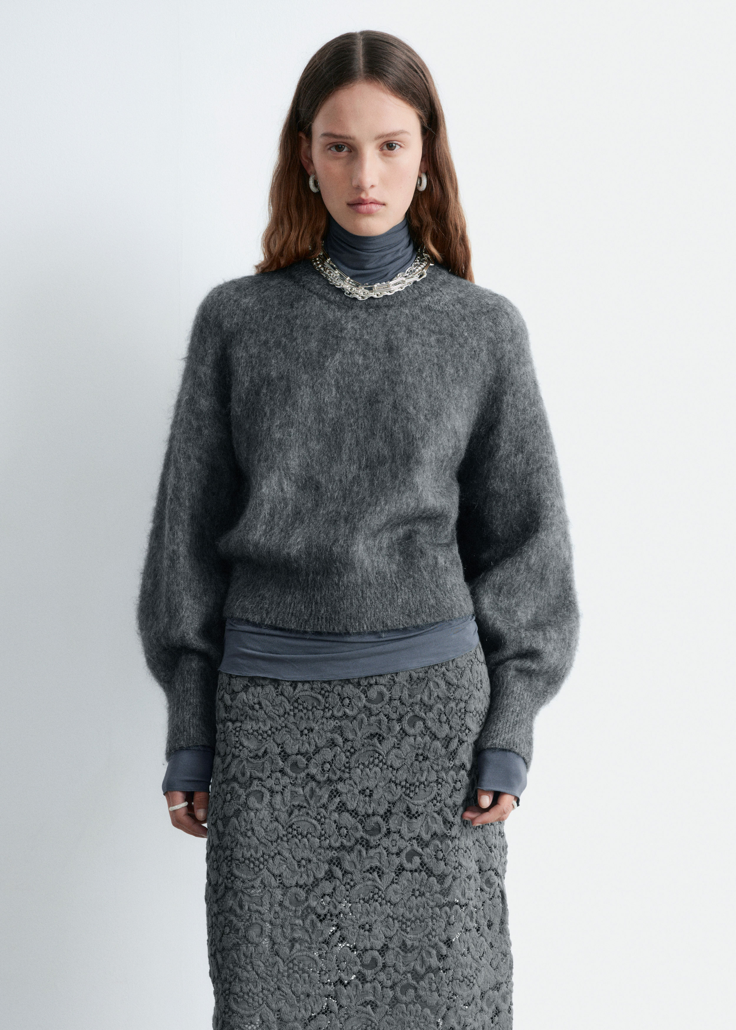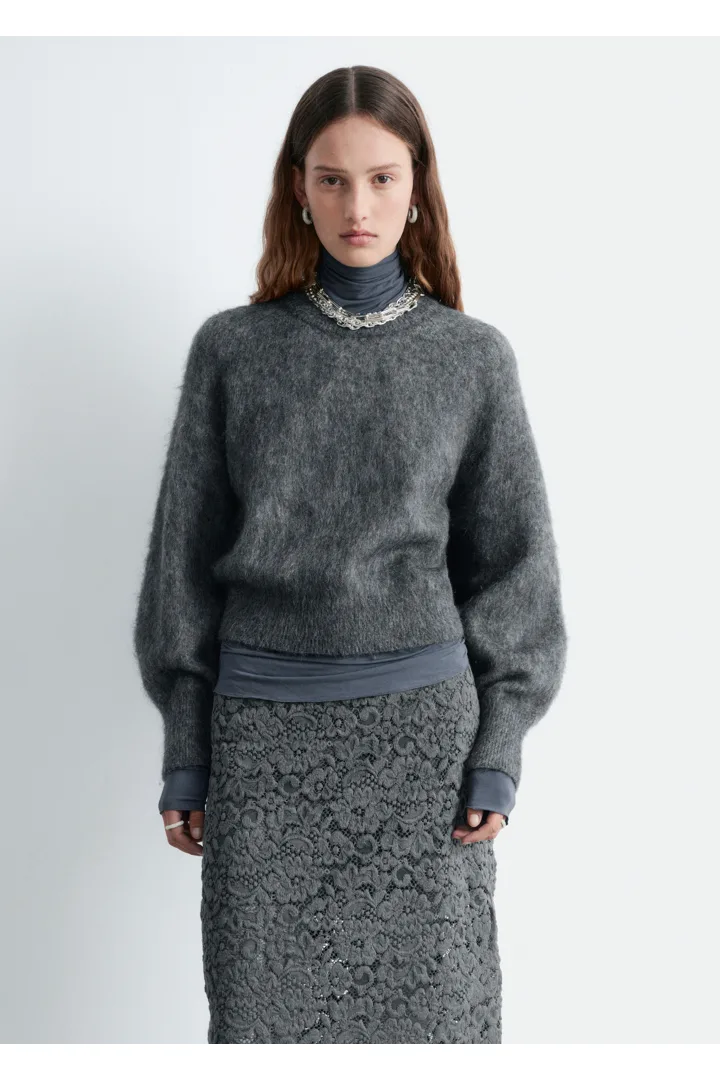 모헤어 & 울 혼방 니트 소재의 스웨터예요. 립 트리밍이 자리한 라운드 네크라인과 레글란 롱 벌룬 슬리브가 돋보여요. 커프스와 헴라인에는 너비감 있는 립 트리밍이 자리해 있어 박시한 실루엣을 연출한답니다.