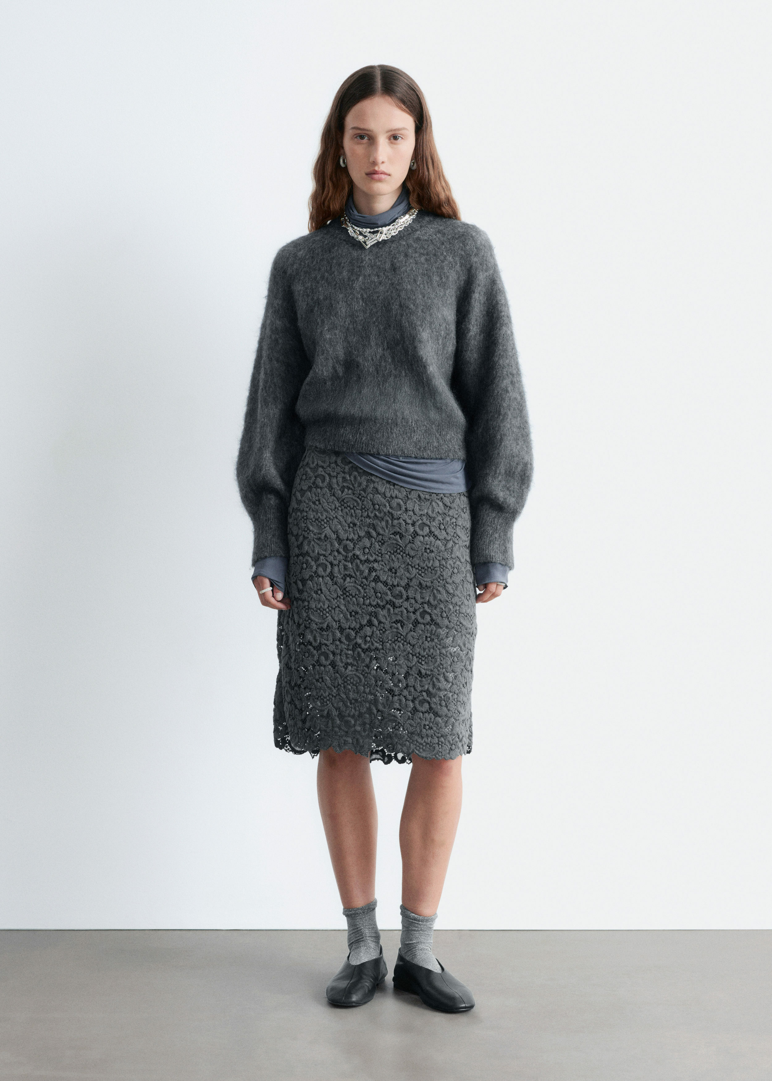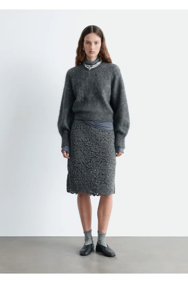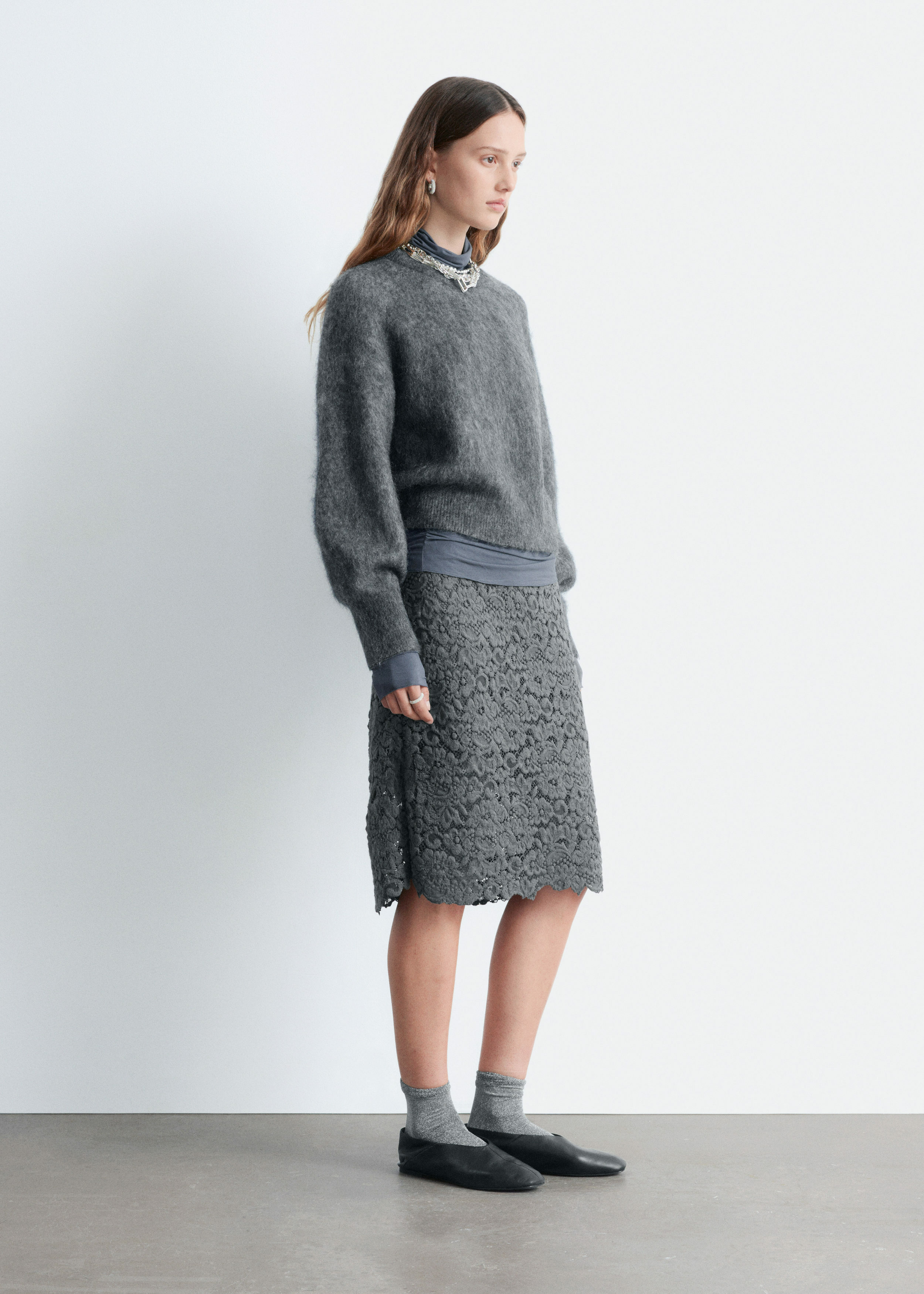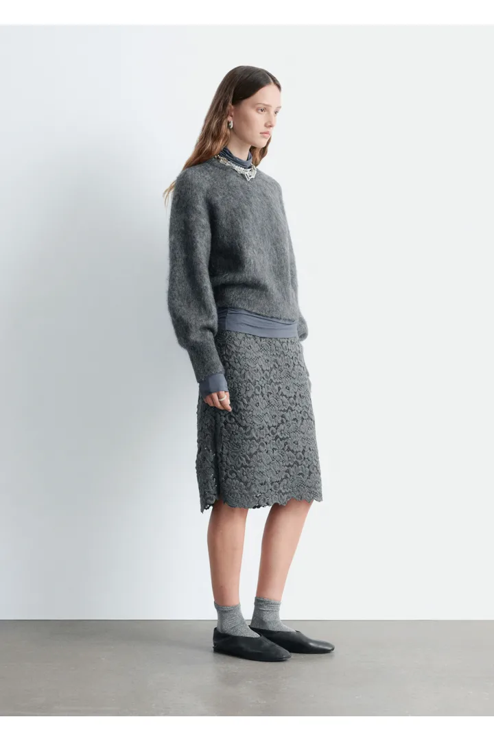 모헤어 & 울 혼방 니트 소재의 스웨터예요. 립 트리밍이 자리한 라운드 네크라인과 레글란 롱 벌룬 슬리브가 돋보여요. 커프스와 헴라인에는 너비감 있는 립 트리밍이 자리해 있어 박시한 실루엣을 연출한답니다.