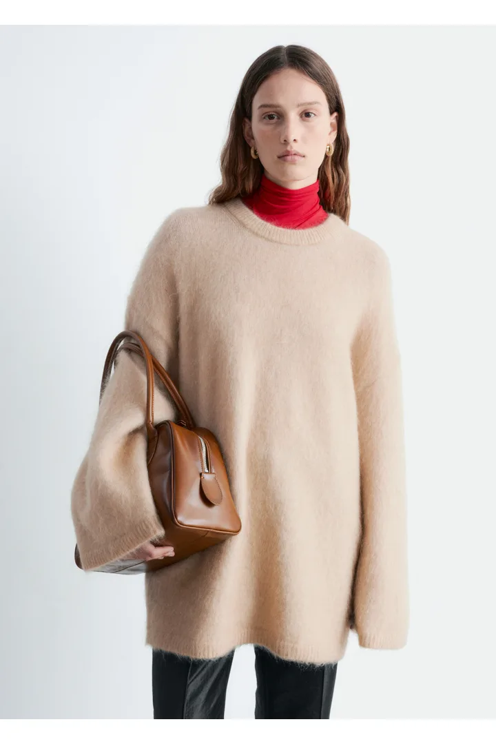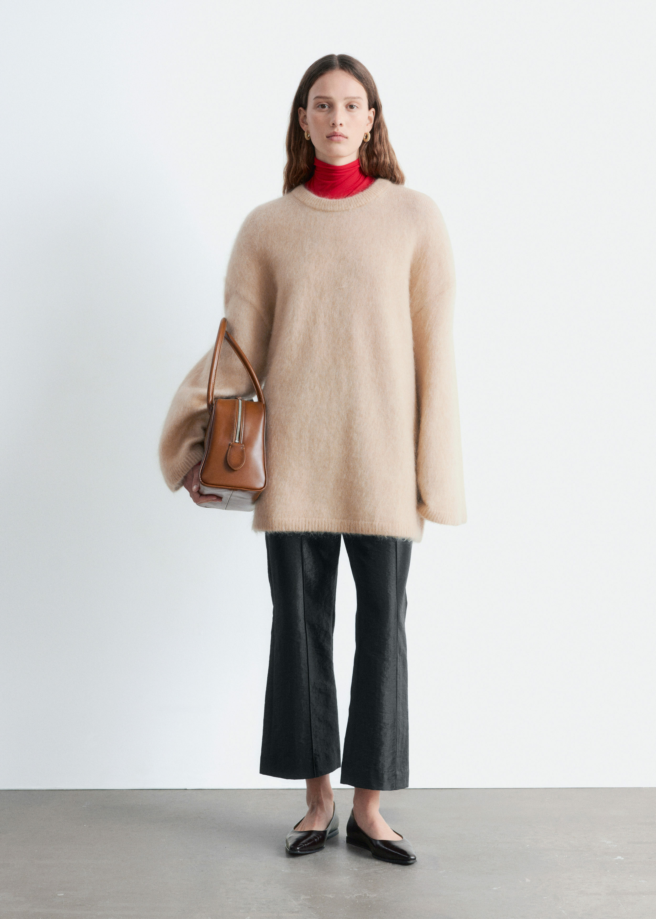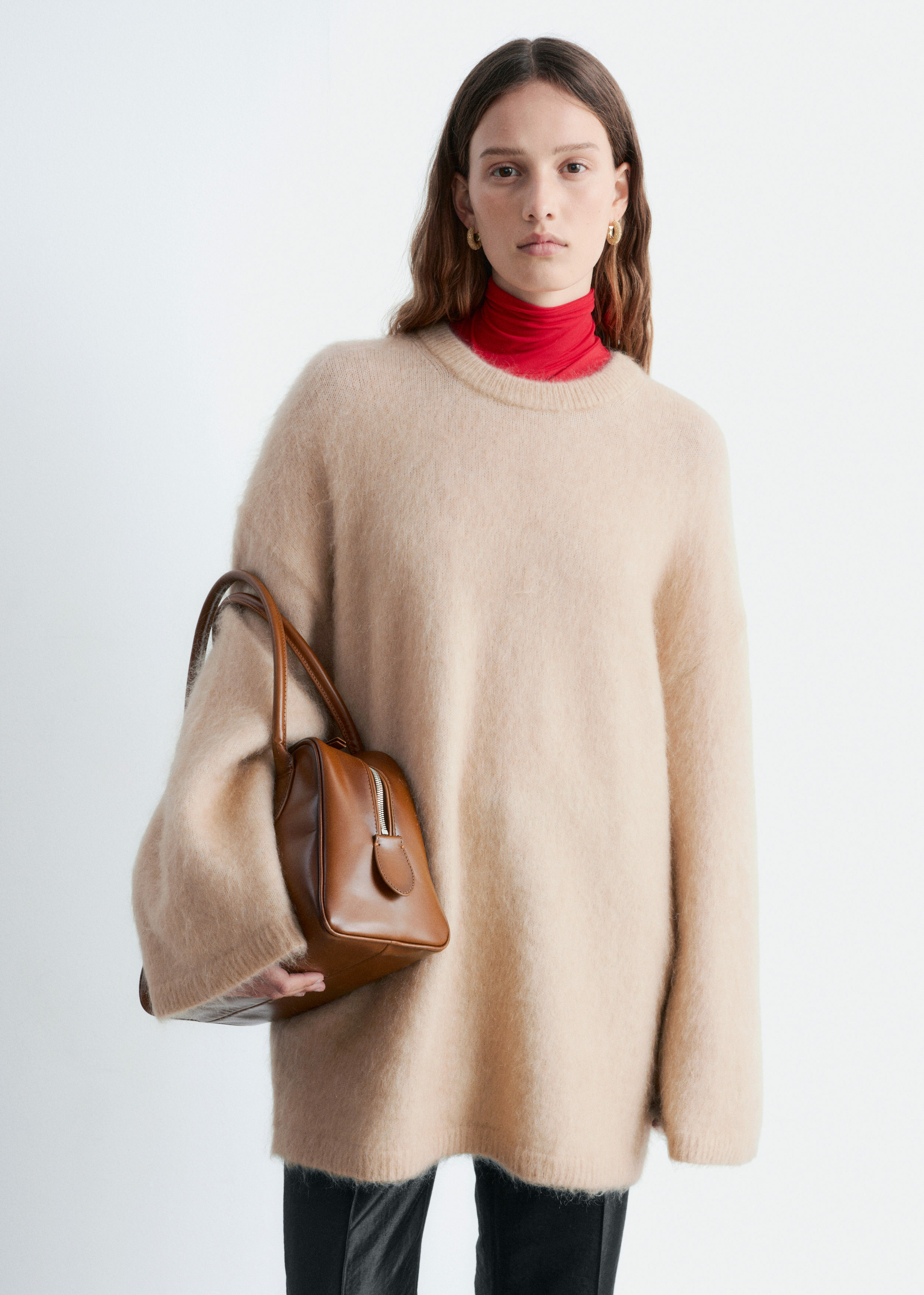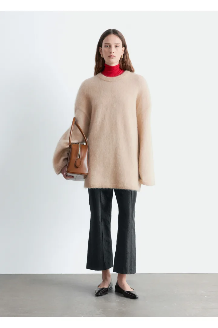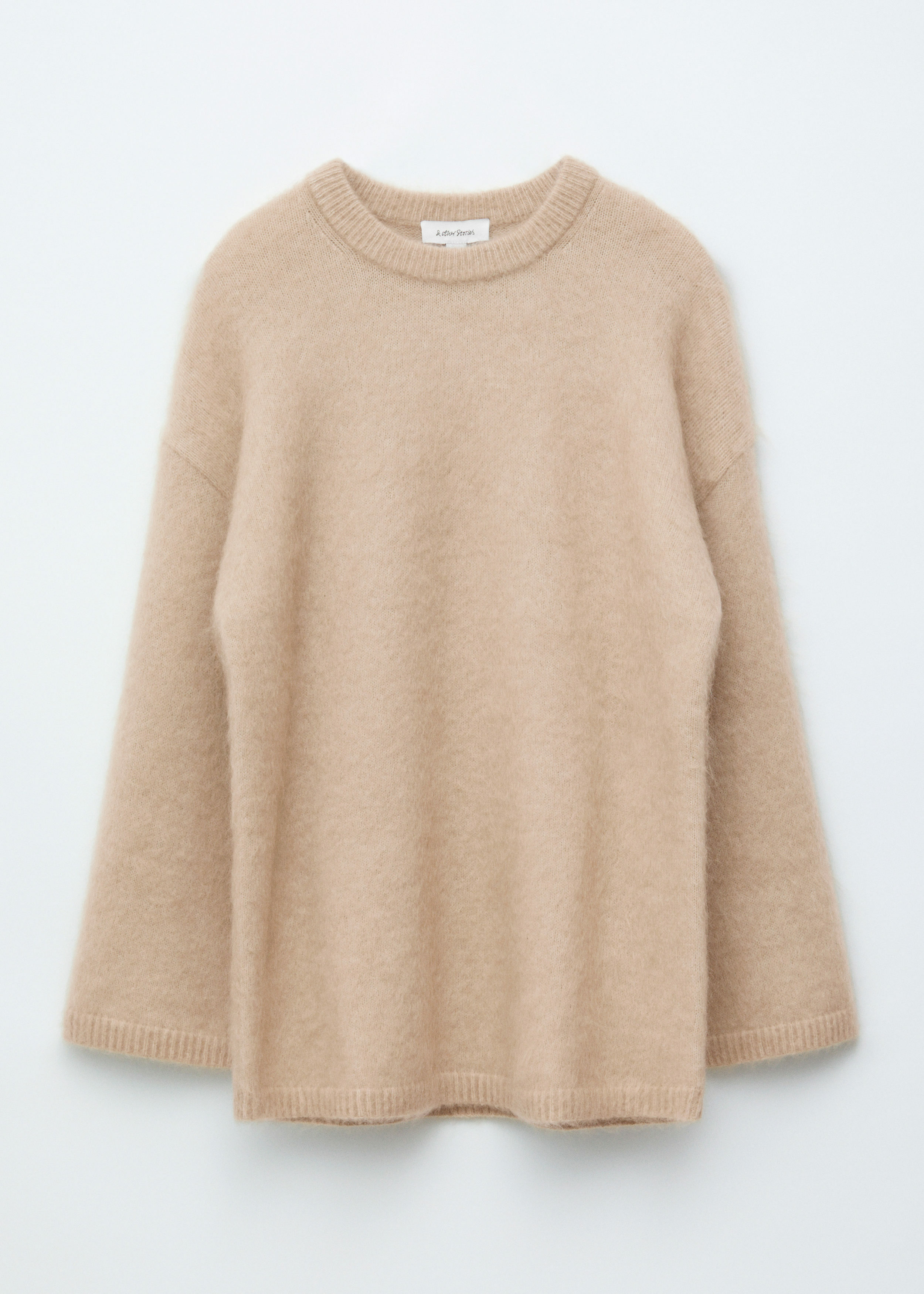 메리노 울 & 모헤어 혼방 니트 스웨터예요. 부드러운 브러시드 마감과 롱 오버사이즈 실루엣이 돋보이는 제품이랍니다. 라운드 네크라인, 롱 슬리브, 섬세한 립 트리밍이 특징이에요.