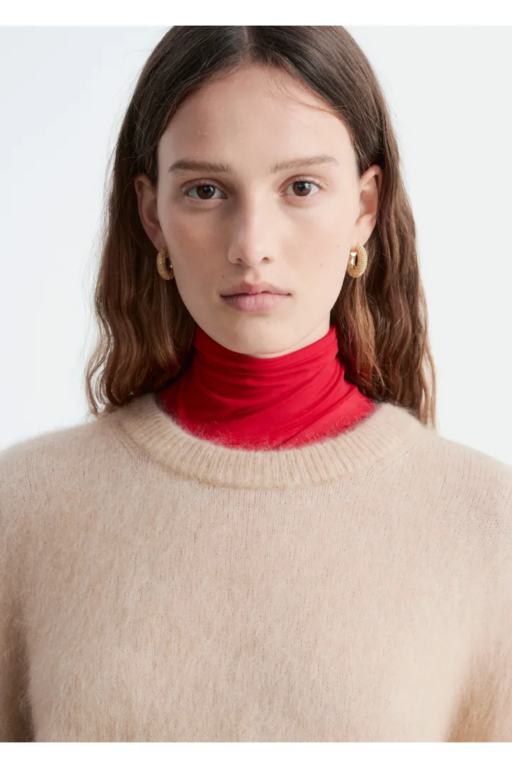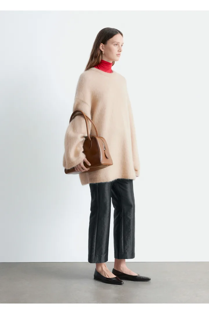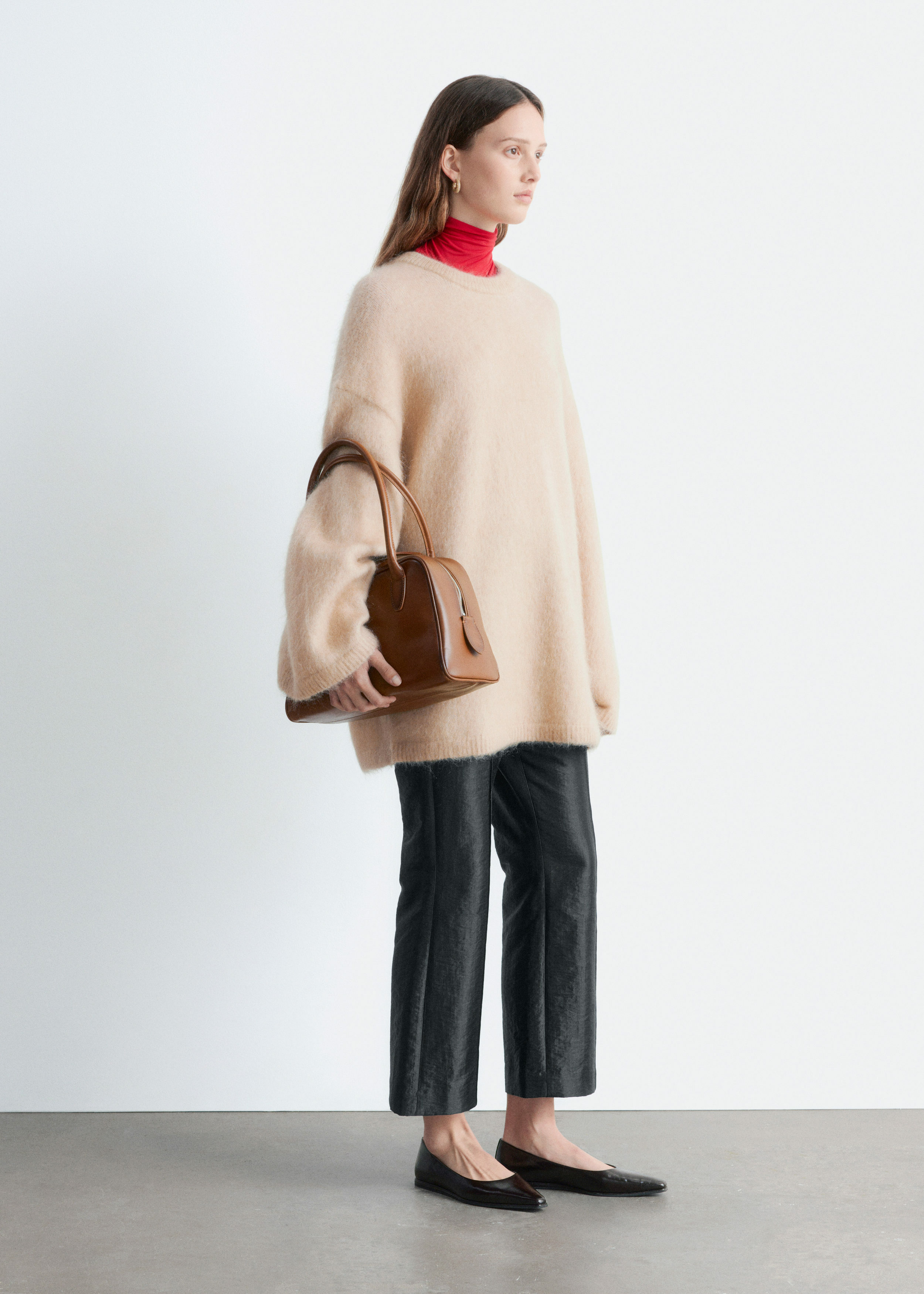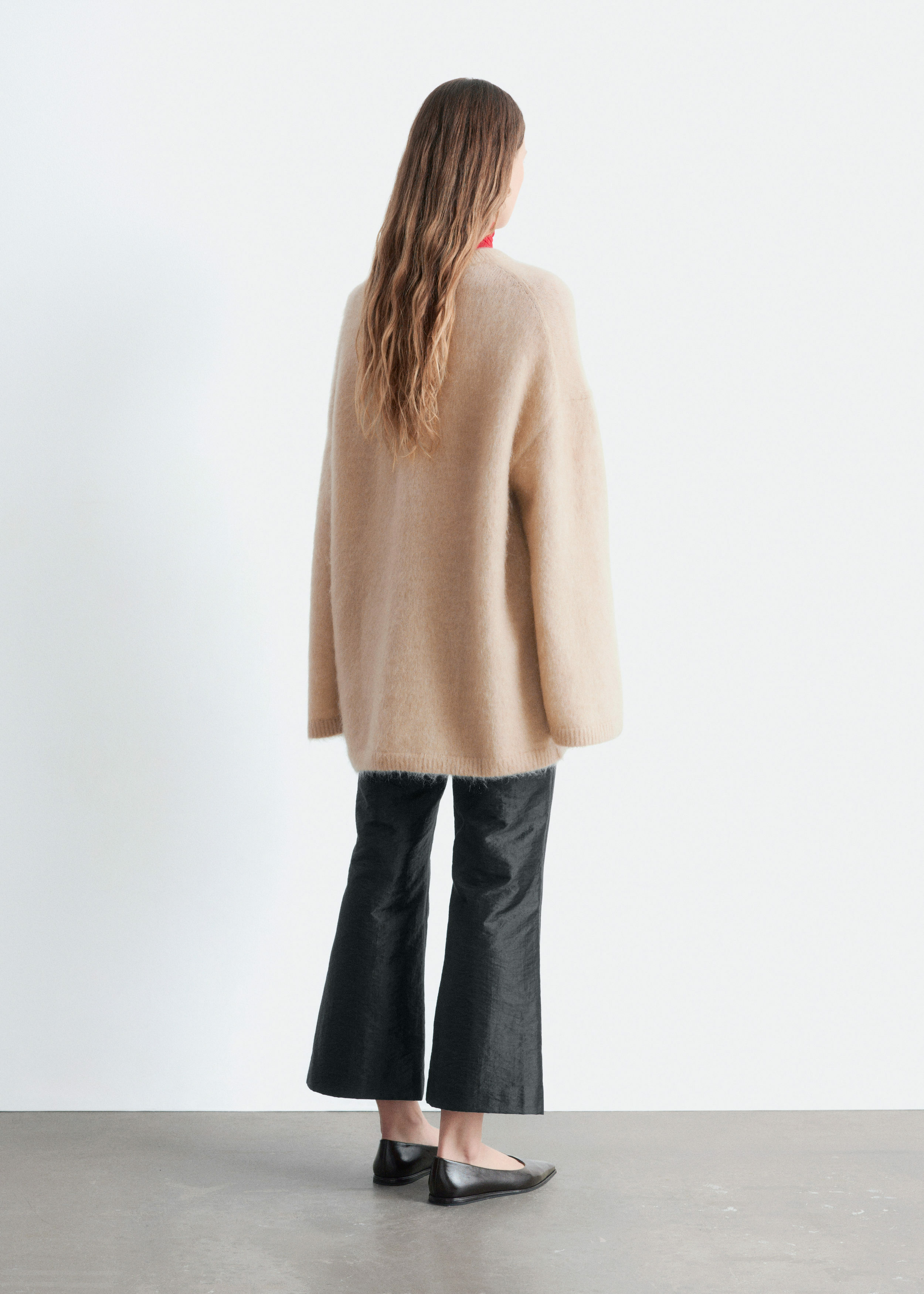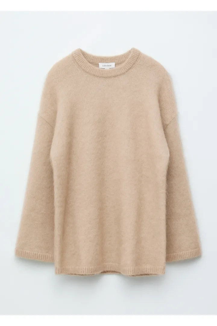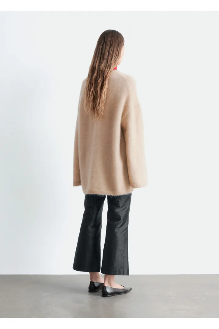 메리노 울 & 모헤어 혼방 니트 스웨터예요. 부드러운 브러시드 마감과 롱 오버사이즈 실루엣이 돋보이는 제품이랍니다. 라운드 네크라인, 롱 슬리브, 섬세한 립 트리밍이 특징이에요.