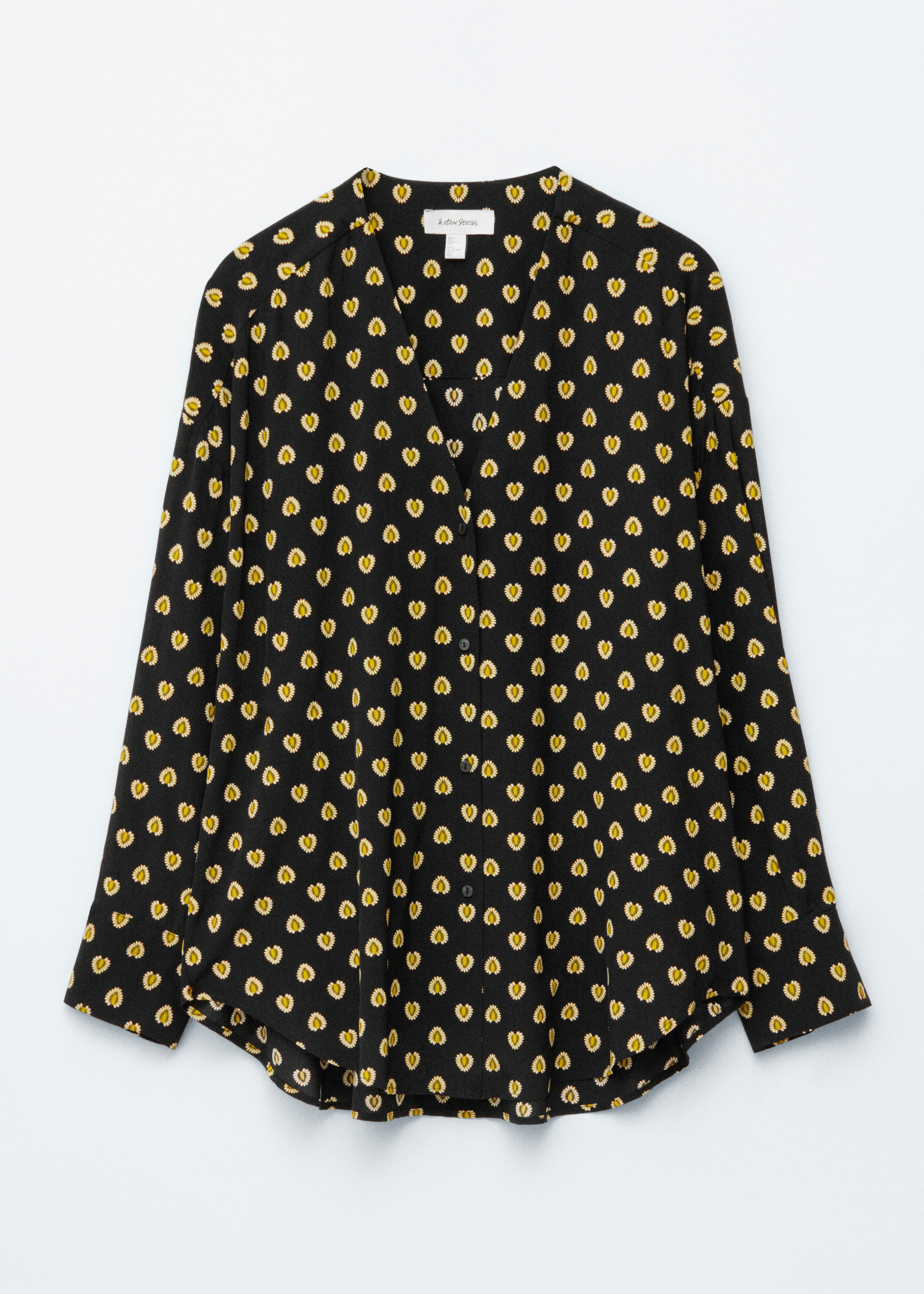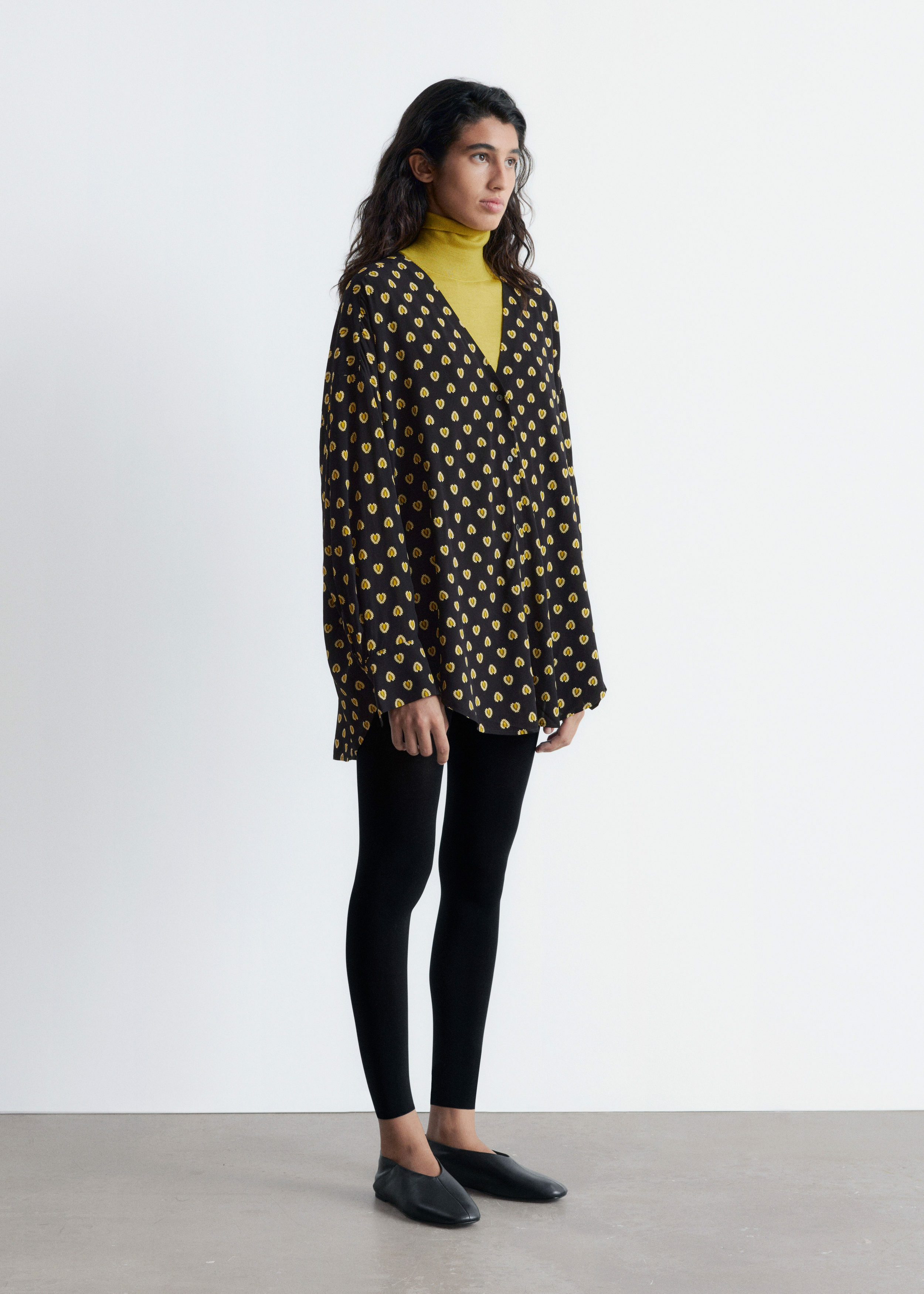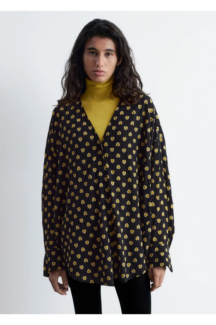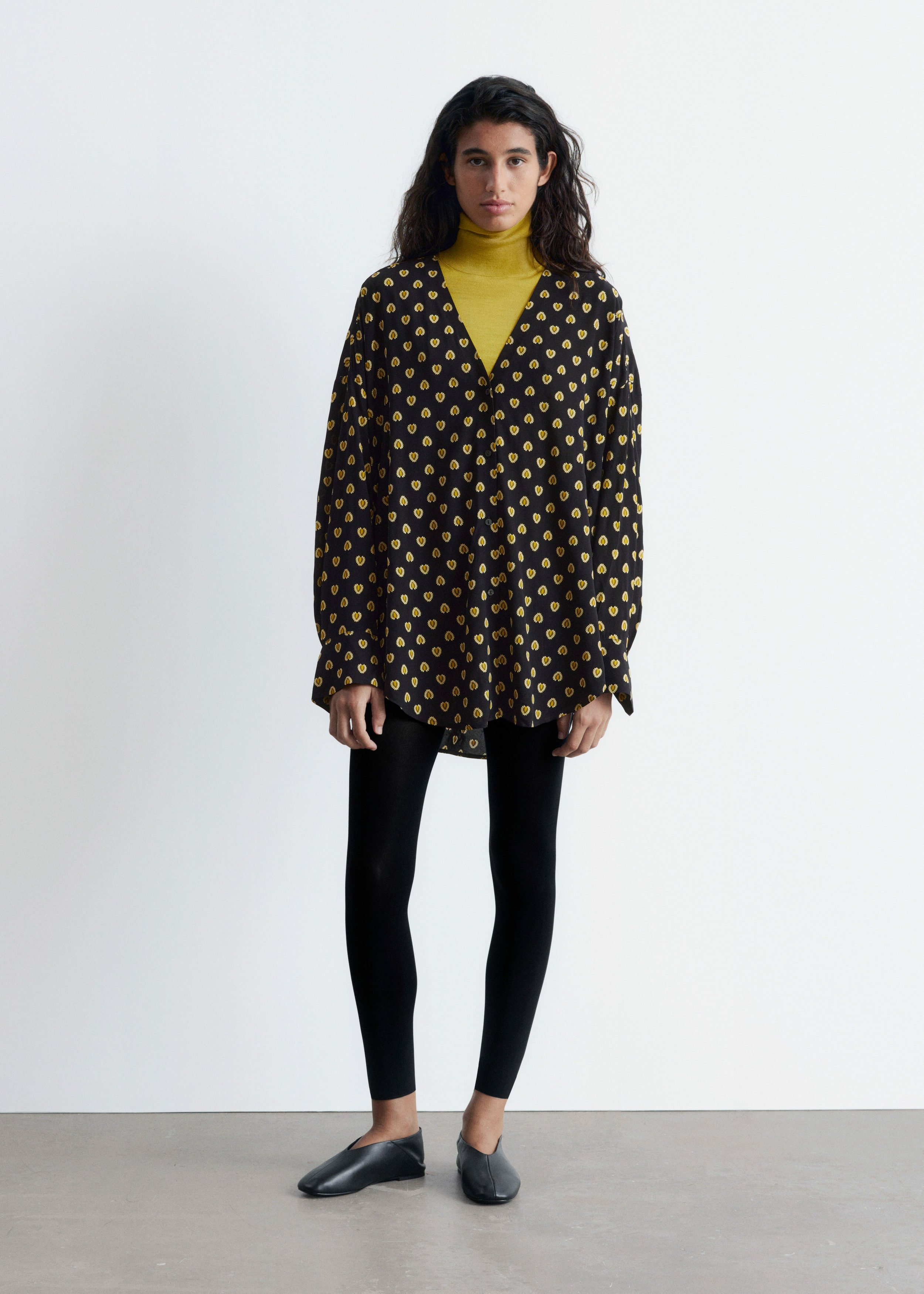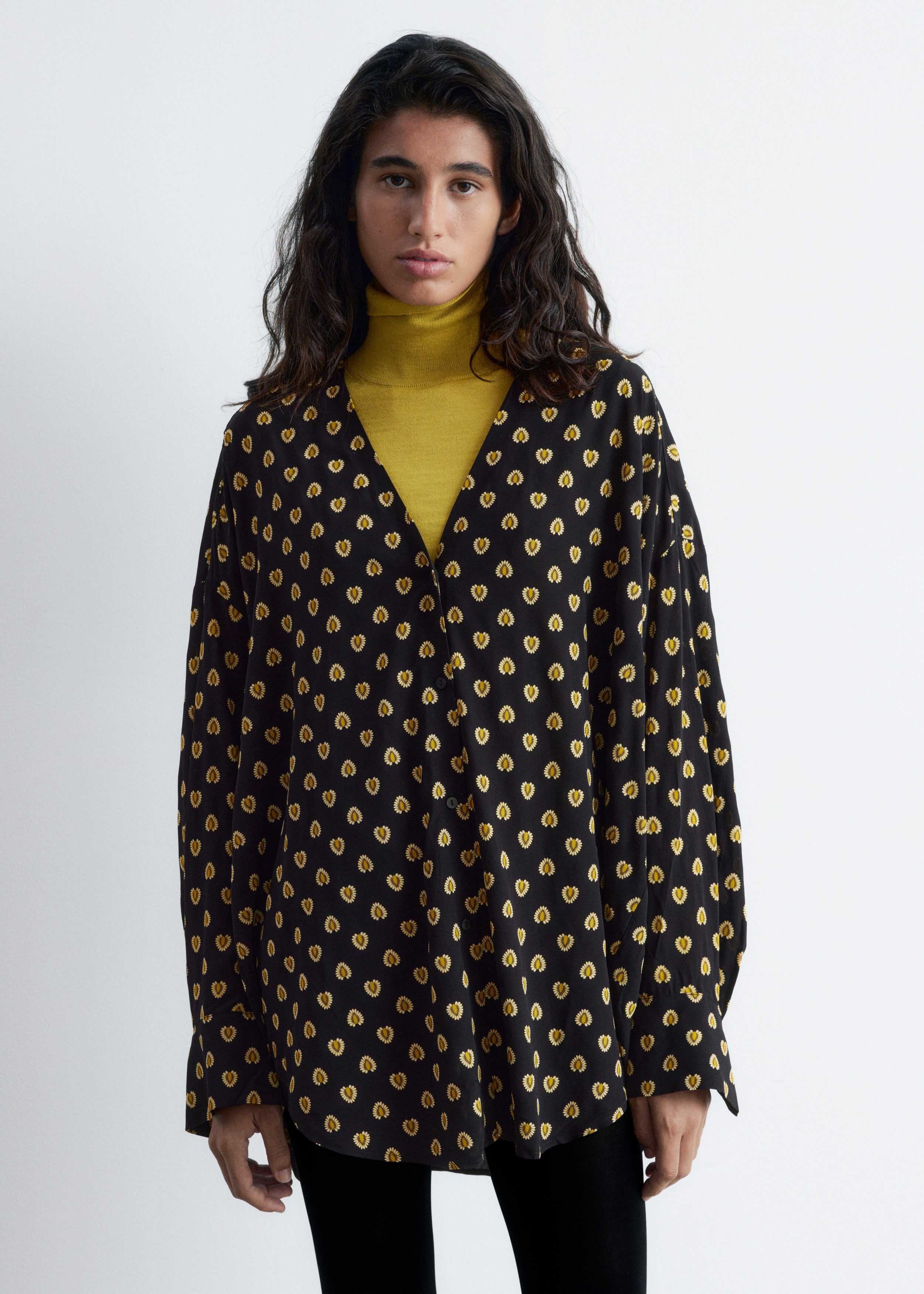 오버사이즈 실루엣의 프린트 블라우스예요. 유려하게 드레이프지는 룩이 멋스럽답니다. V 네크라인, 롱 슬리브와 버튼 커프스, 앞면의 버튼 플래킷, 둥근 헴라인이 자리해 있어요.