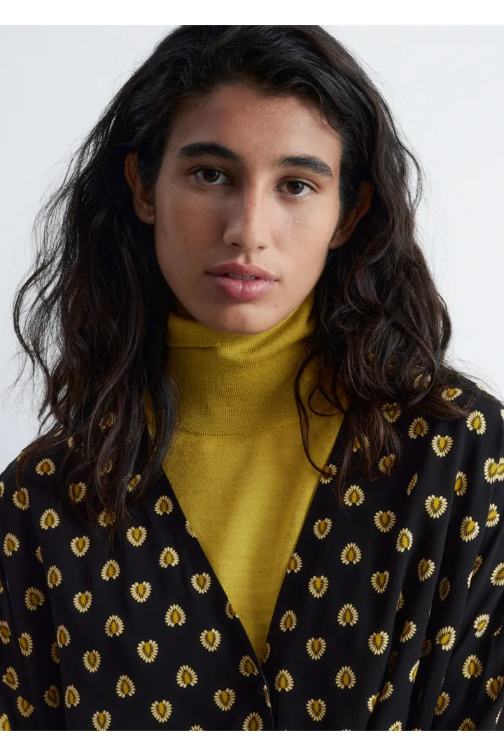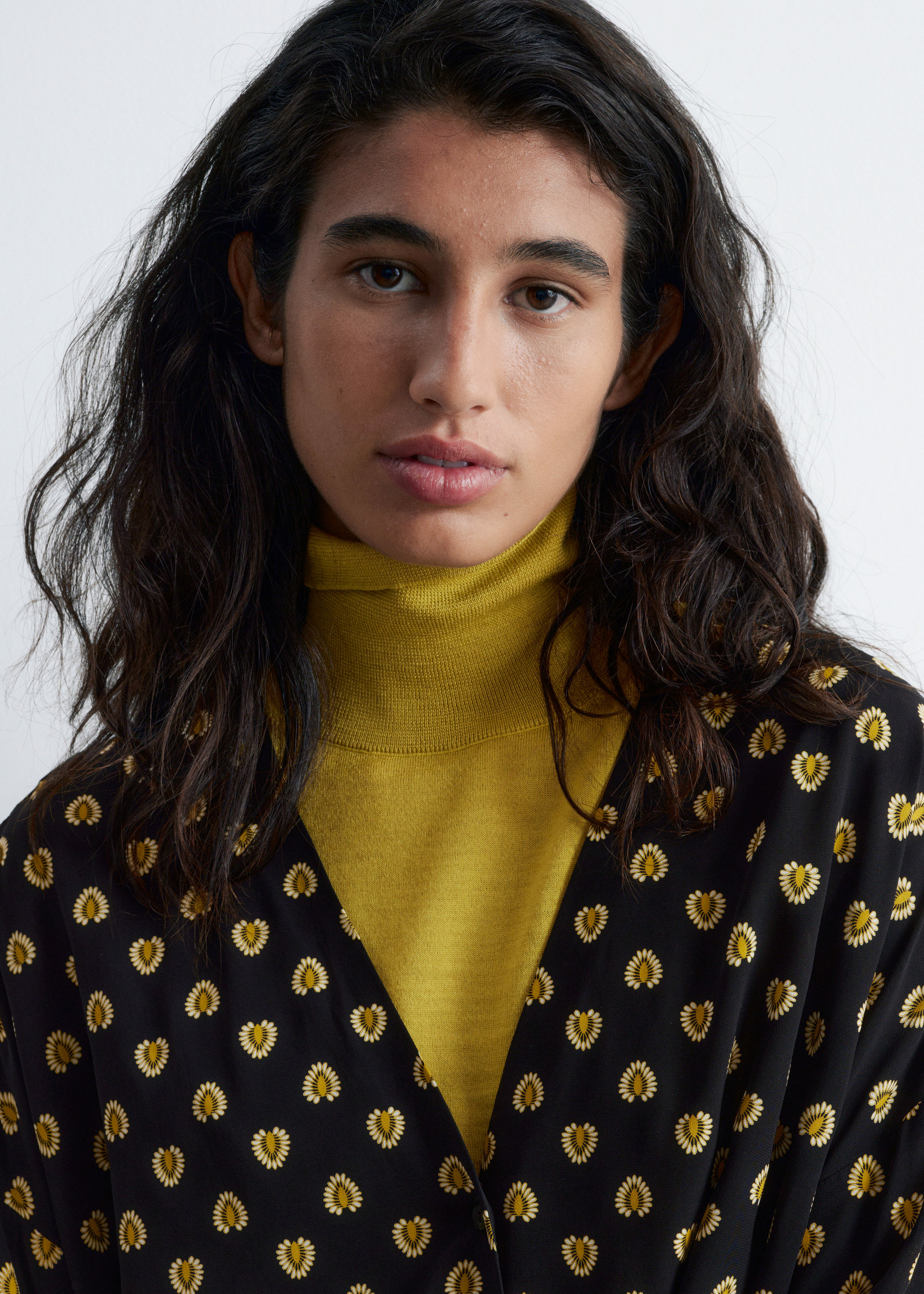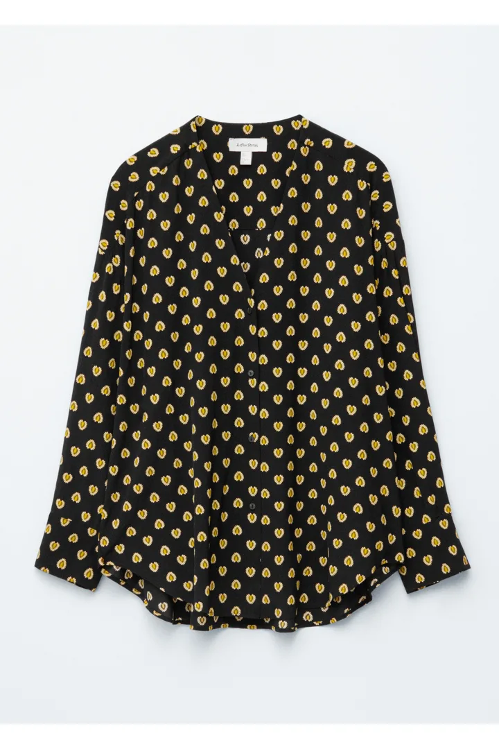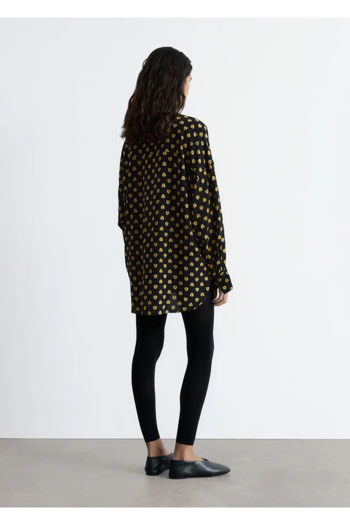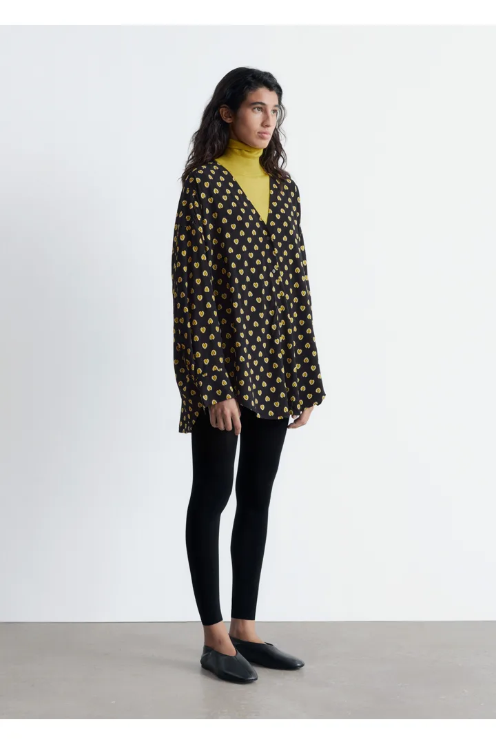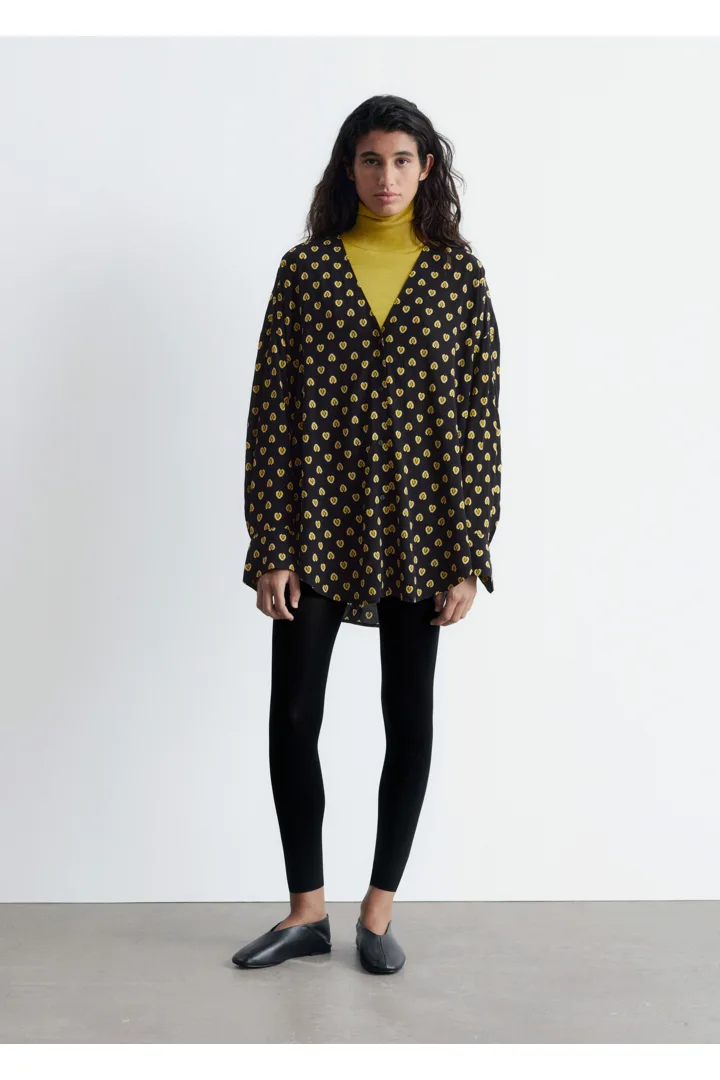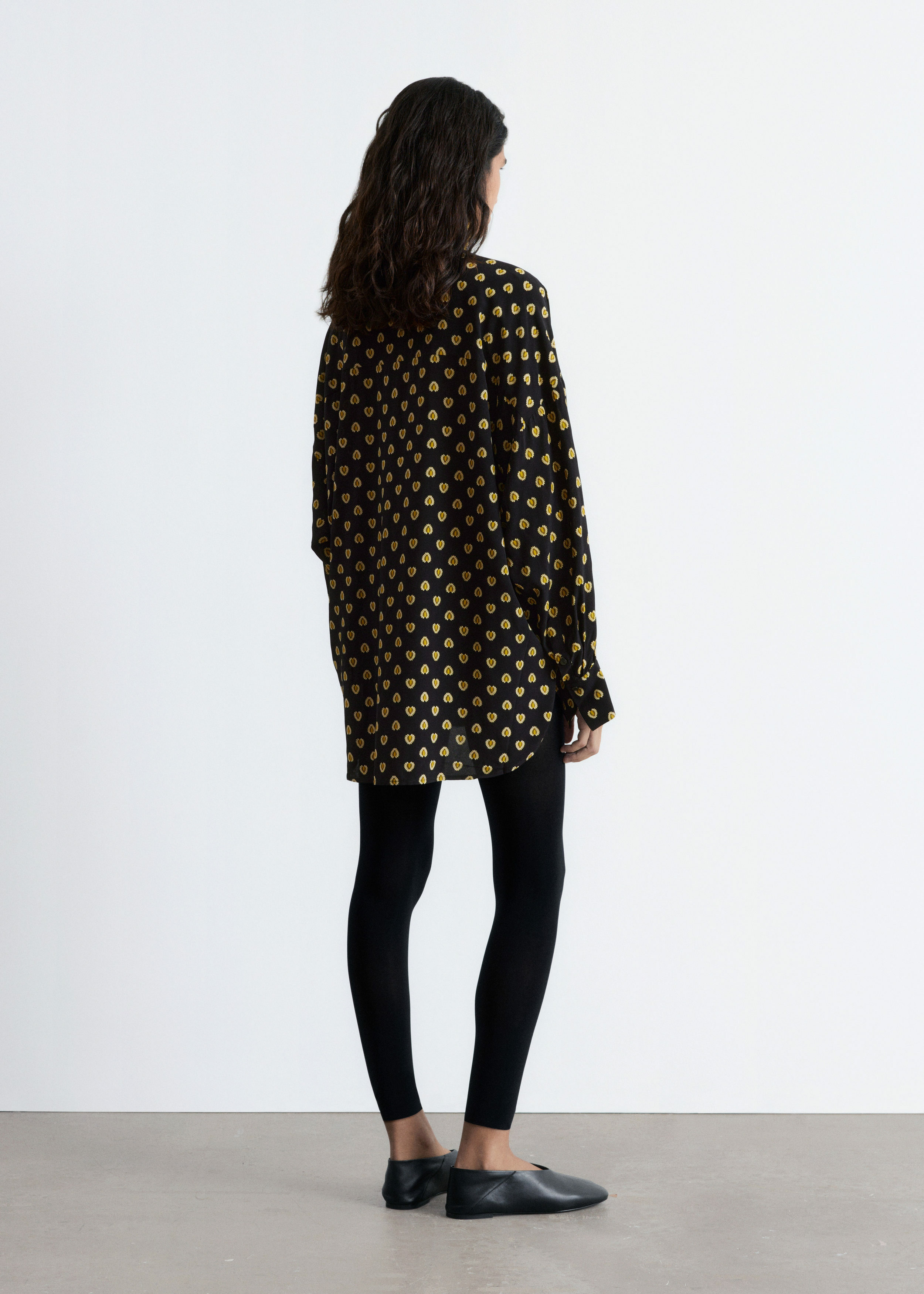 오버사이즈 실루엣의 프린트 블라우스예요. 유려하게 드레이프지는 룩이 멋스럽답니다. V 네크라인, 롱 슬리브와 버튼 커프스, 앞면의 버튼 플래킷, 둥근 헴라인이 자리해 있어요.