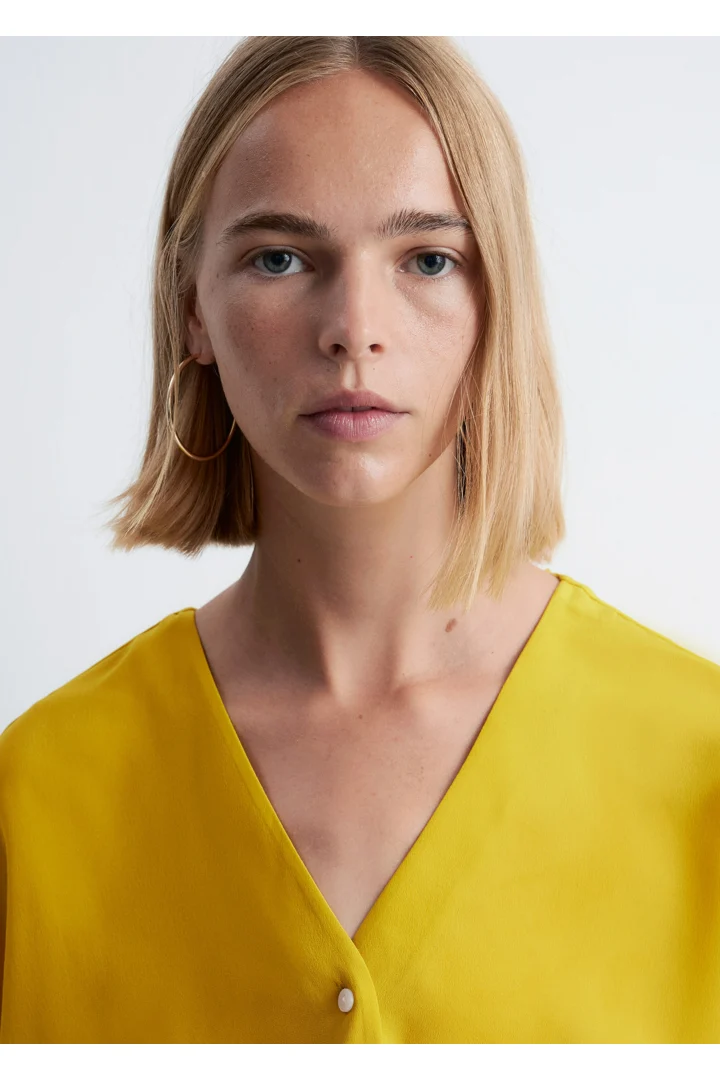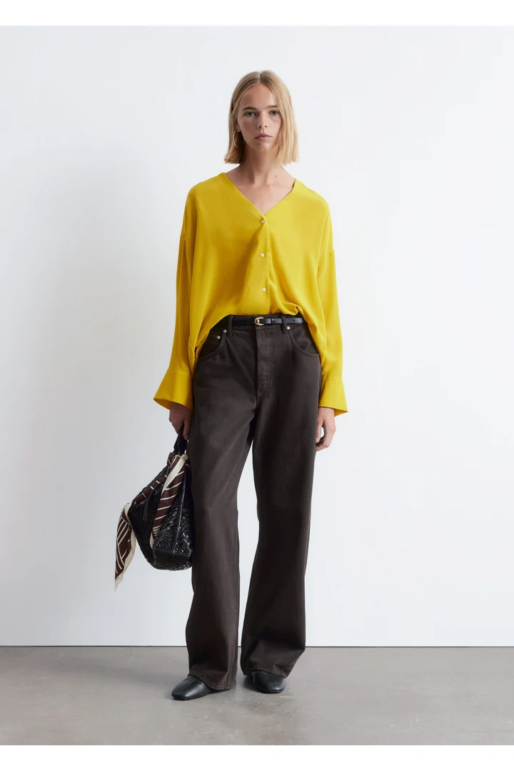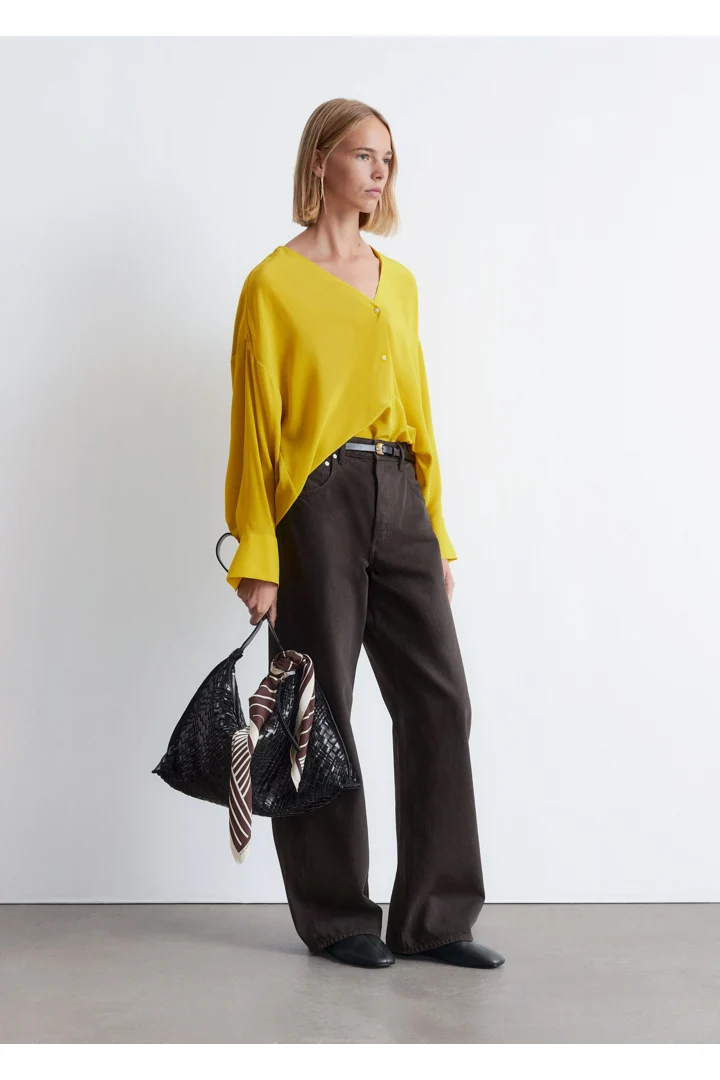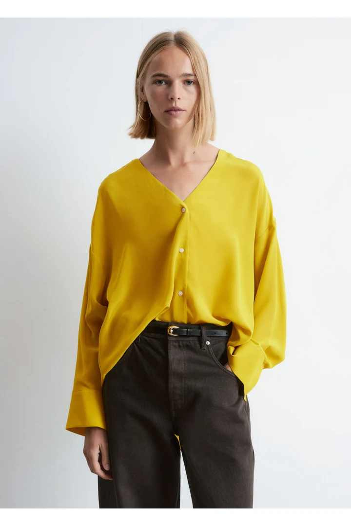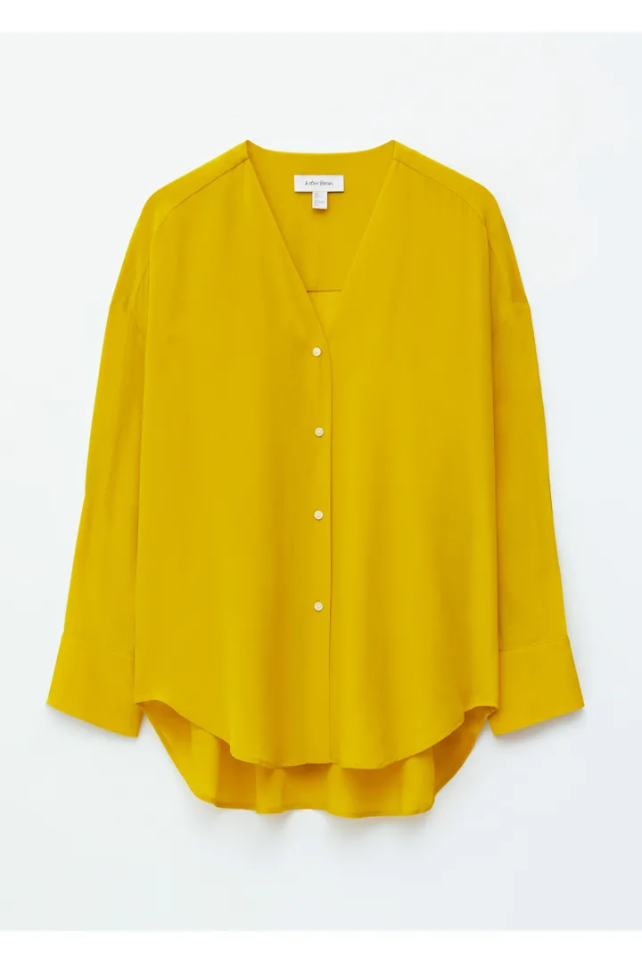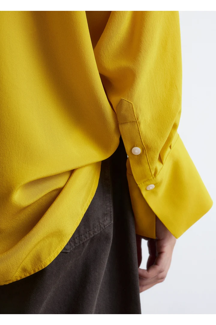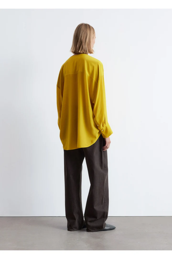100% 멀베리 실크 소재의 블라우스예요. 롱 오버사이즈 실루엣, 유려하게 흐르는 드레이프, 둥근 헴라인이 시선을 사로잡는 아이템으로 V 네크라인, 롱 슬리브와 버튼 커프스, 앞면의 단추가 자리해 있어요.