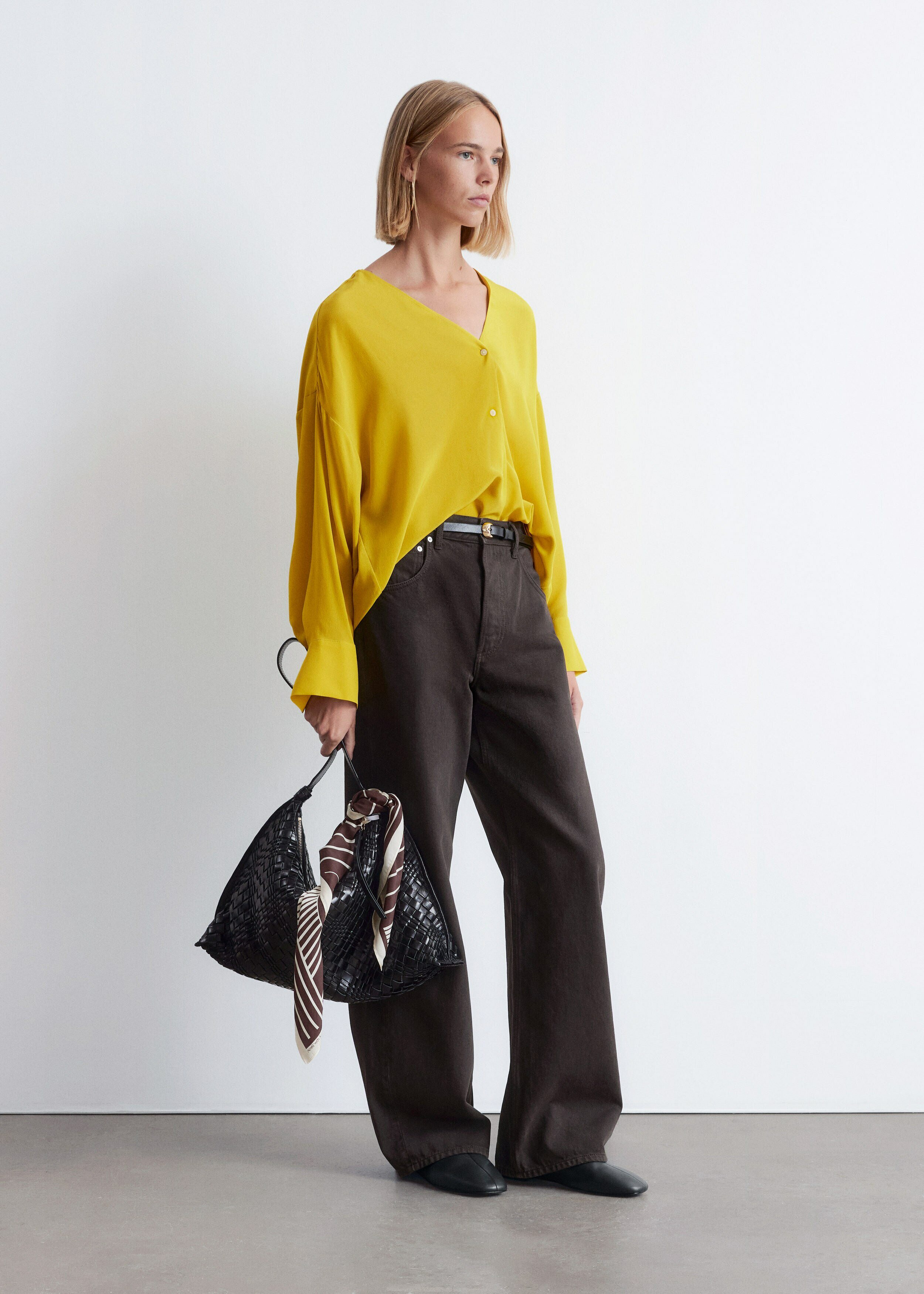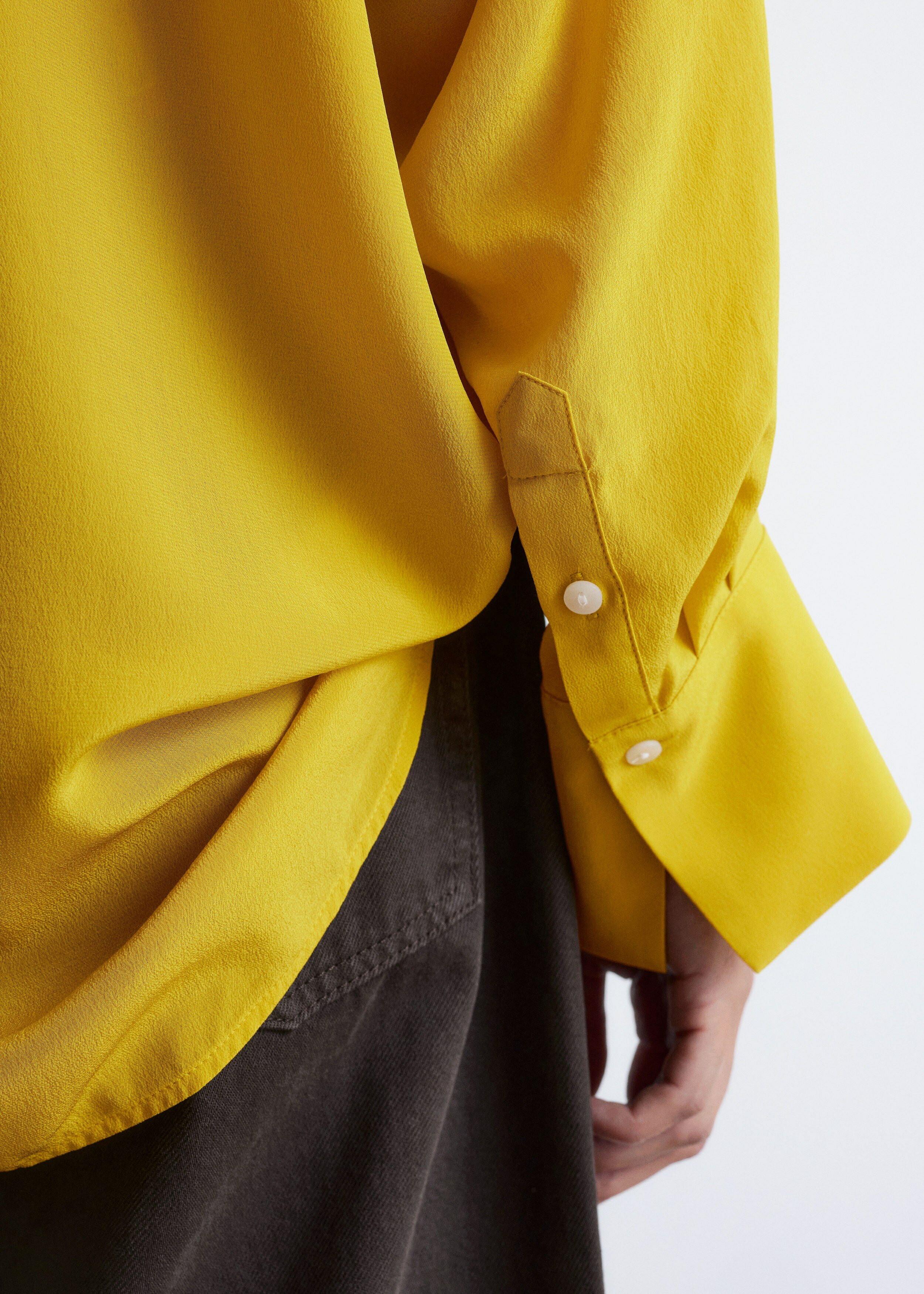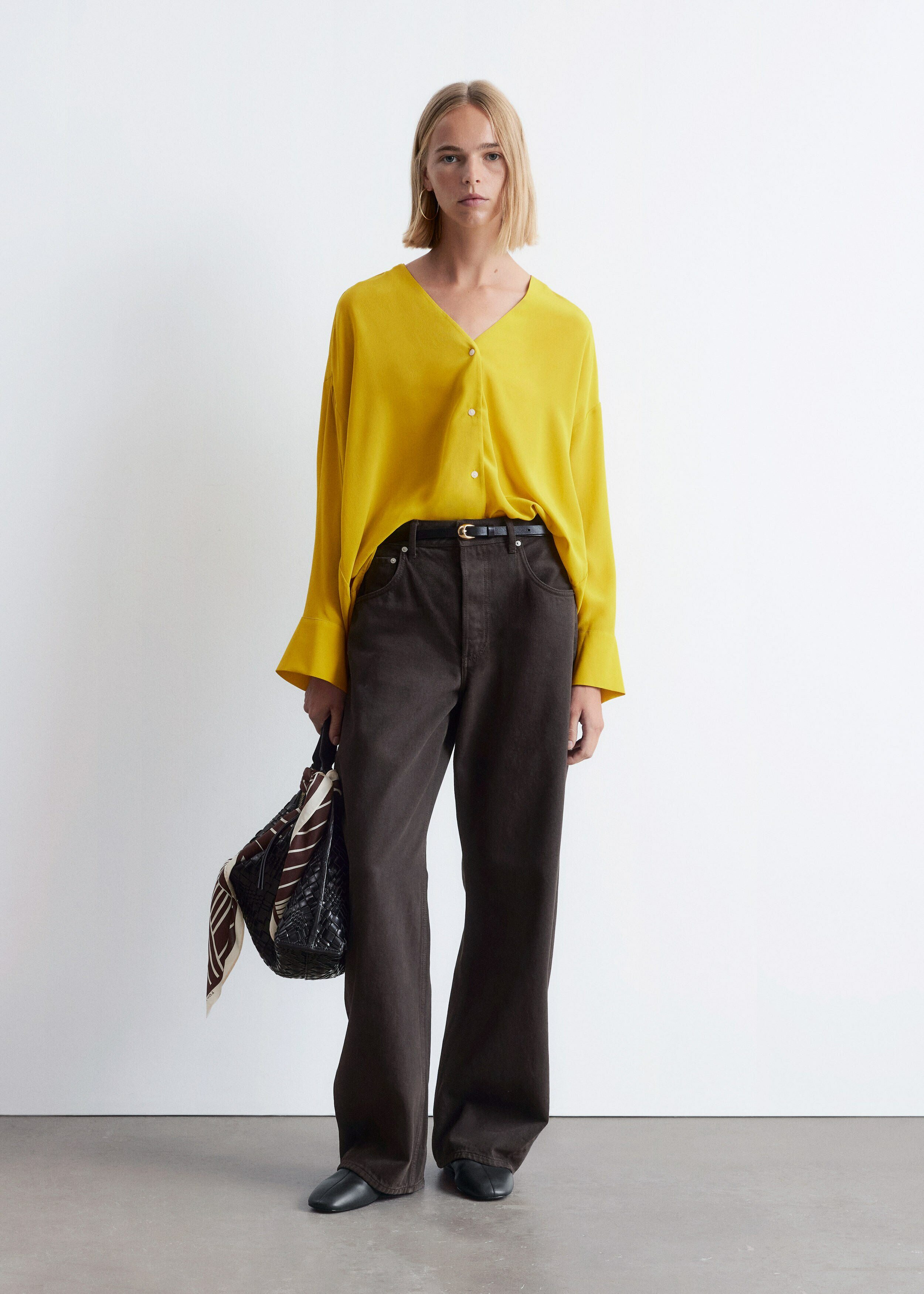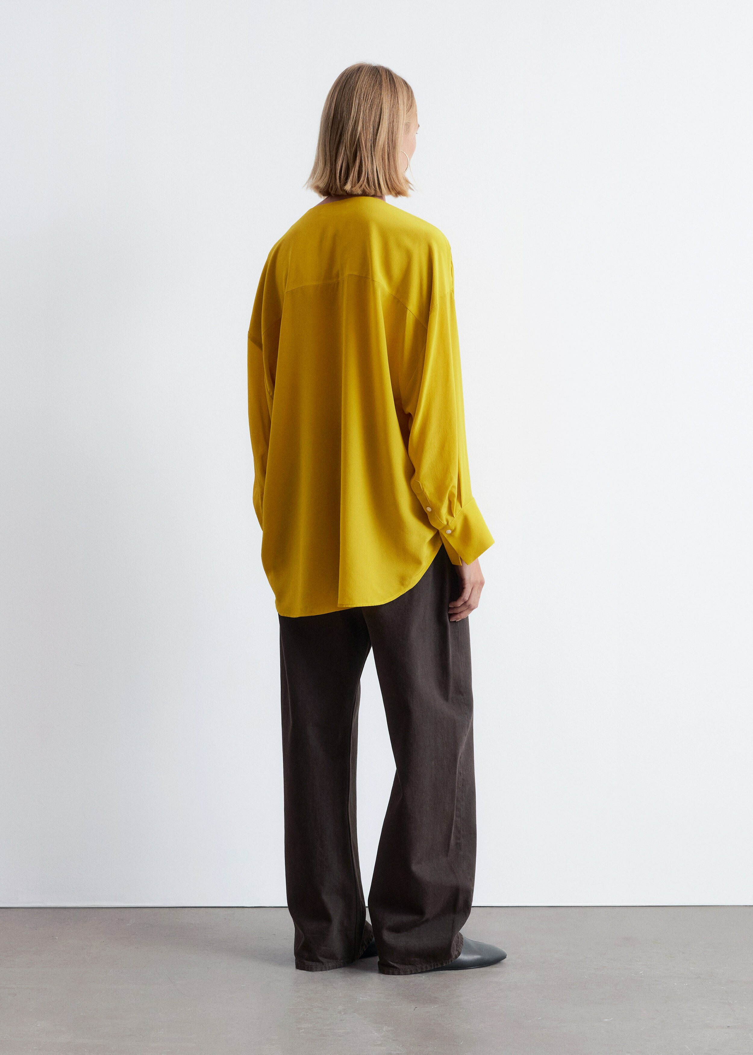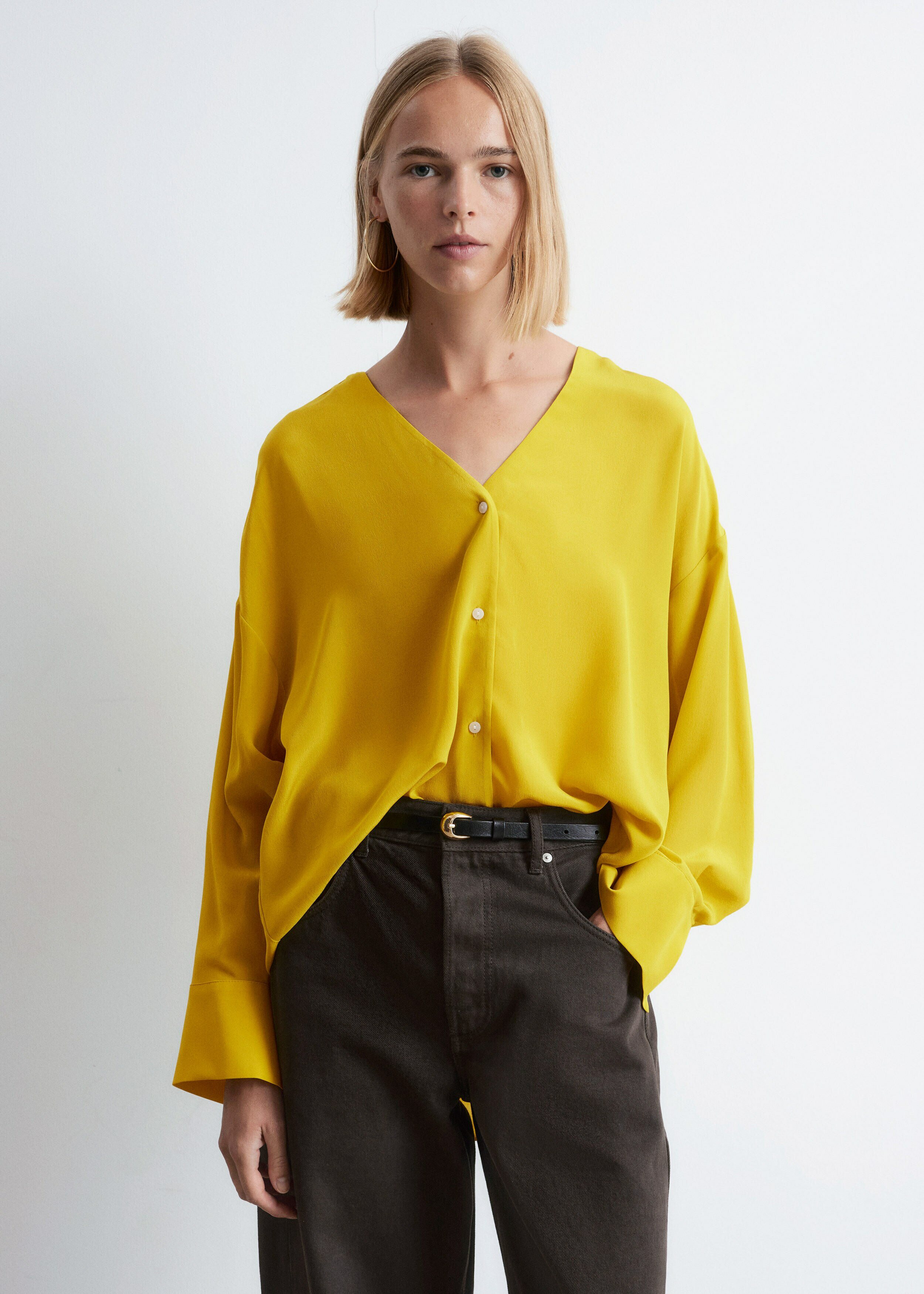 100% 멀베리 실크 소재의 블라우스예요. 롱 오버사이즈 실루엣, 유려하게 흐르는 드레이프, 둥근 헴라인이 시선을 사로잡는 아이템으로 V 네크라인, 롱 슬리브와 버튼 커프스, 앞면의 단추가 자리해 있어요.