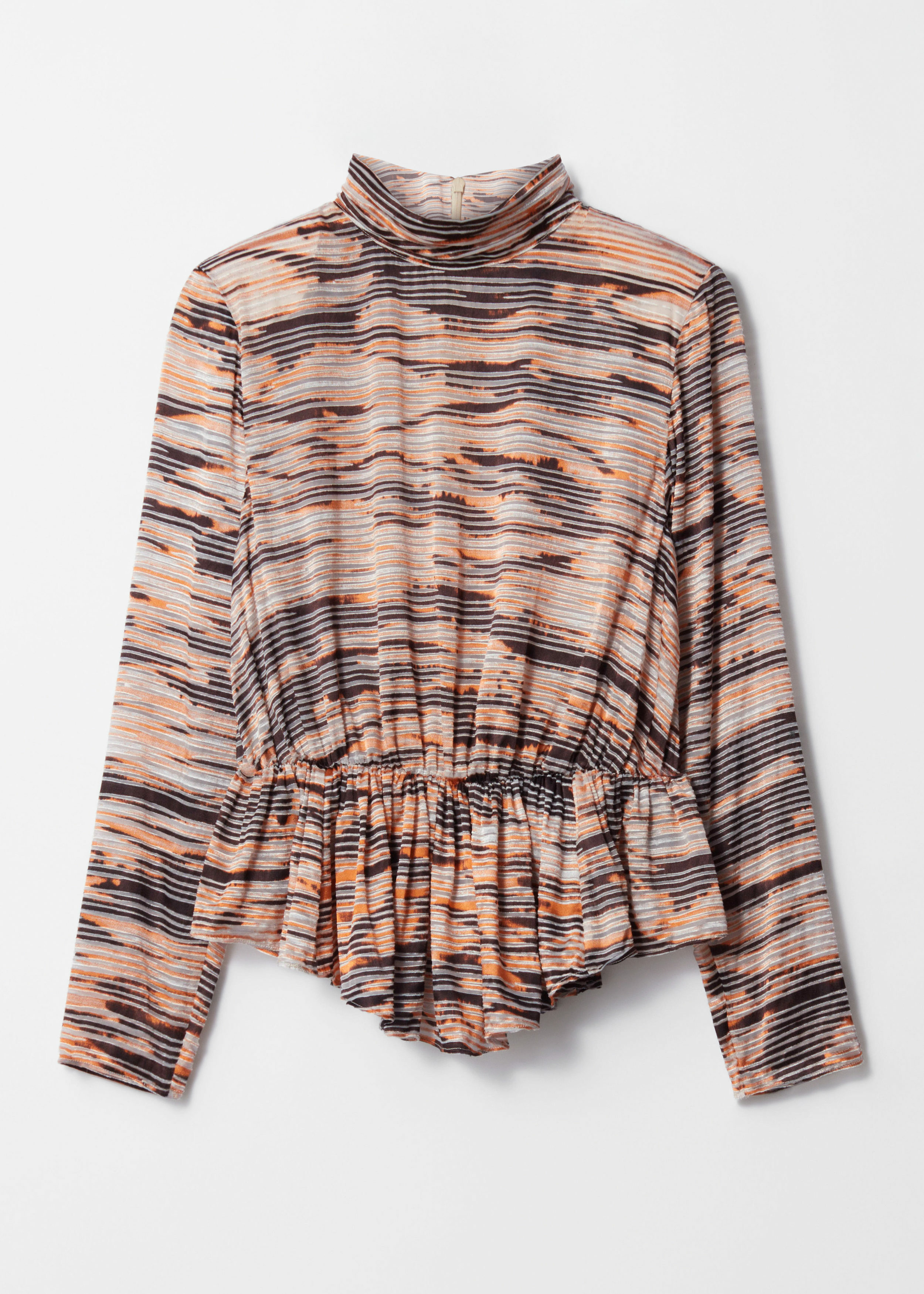 롱 슬리브의 탑이에요. 모크 넥, 패디드 숄더, 페플럼 실루엣이 매력적이랍니다.