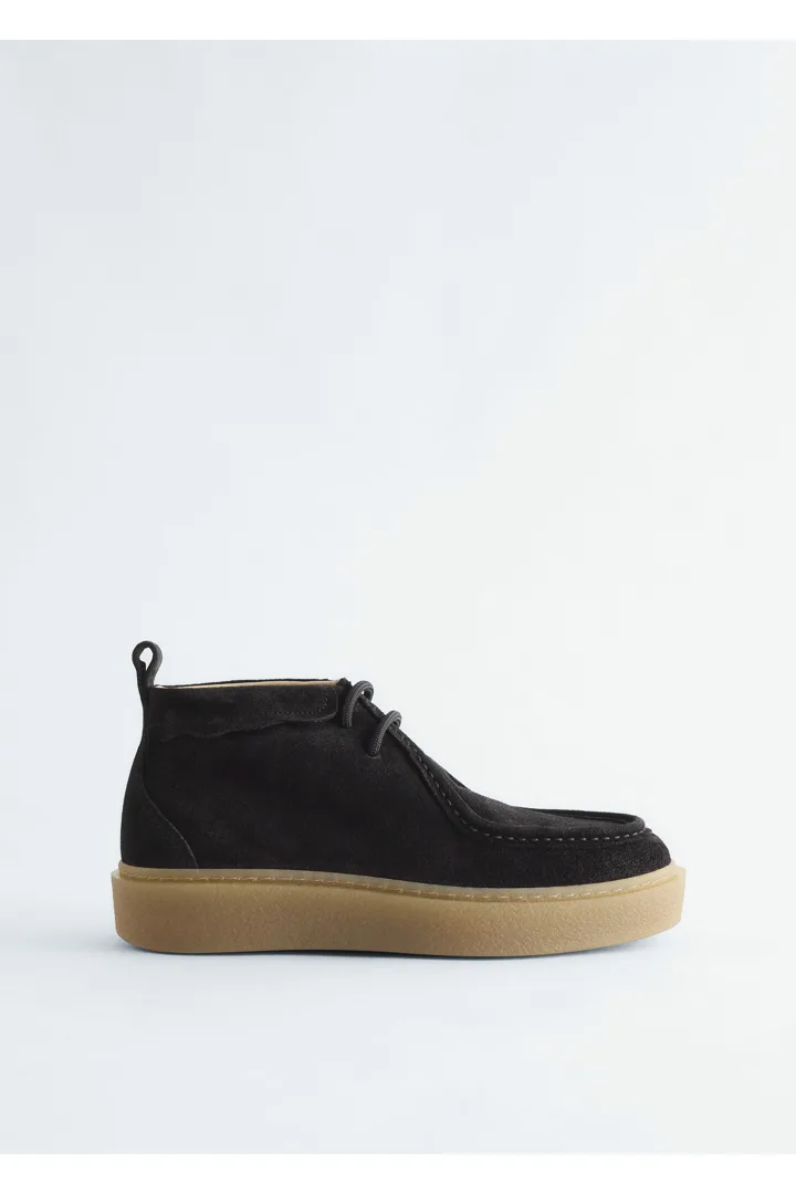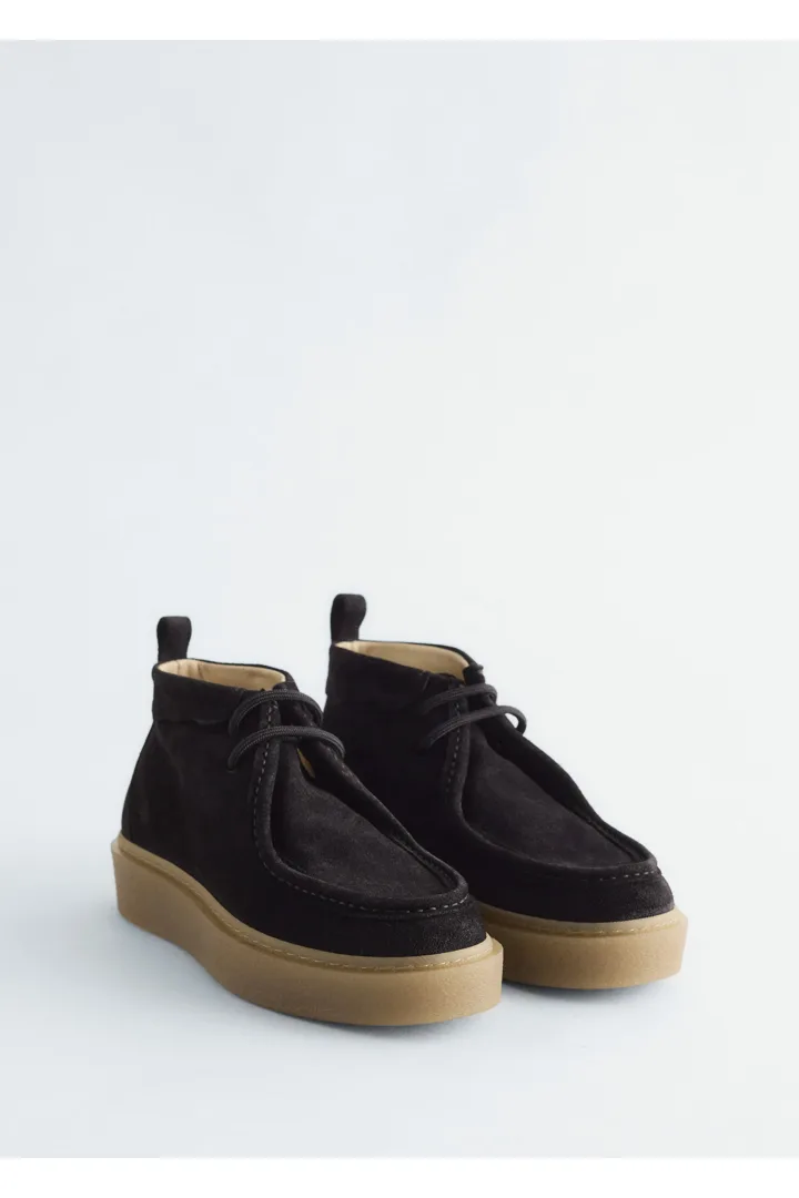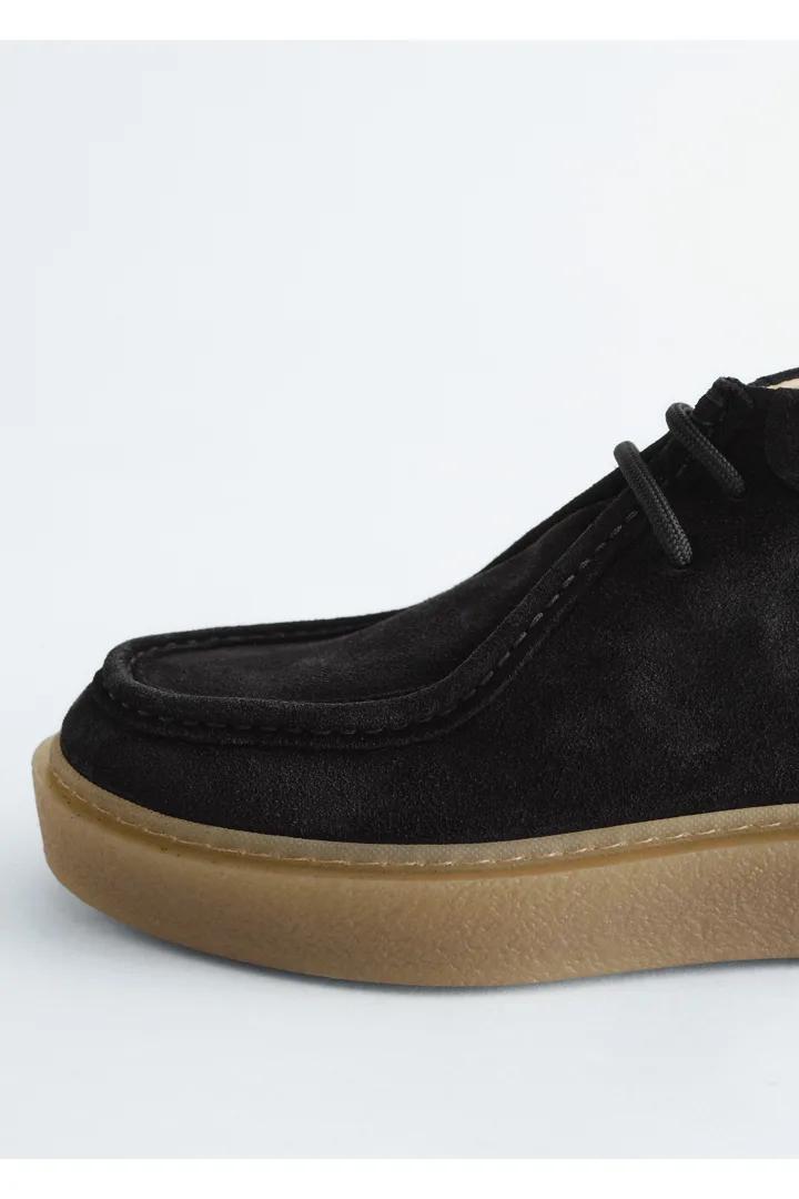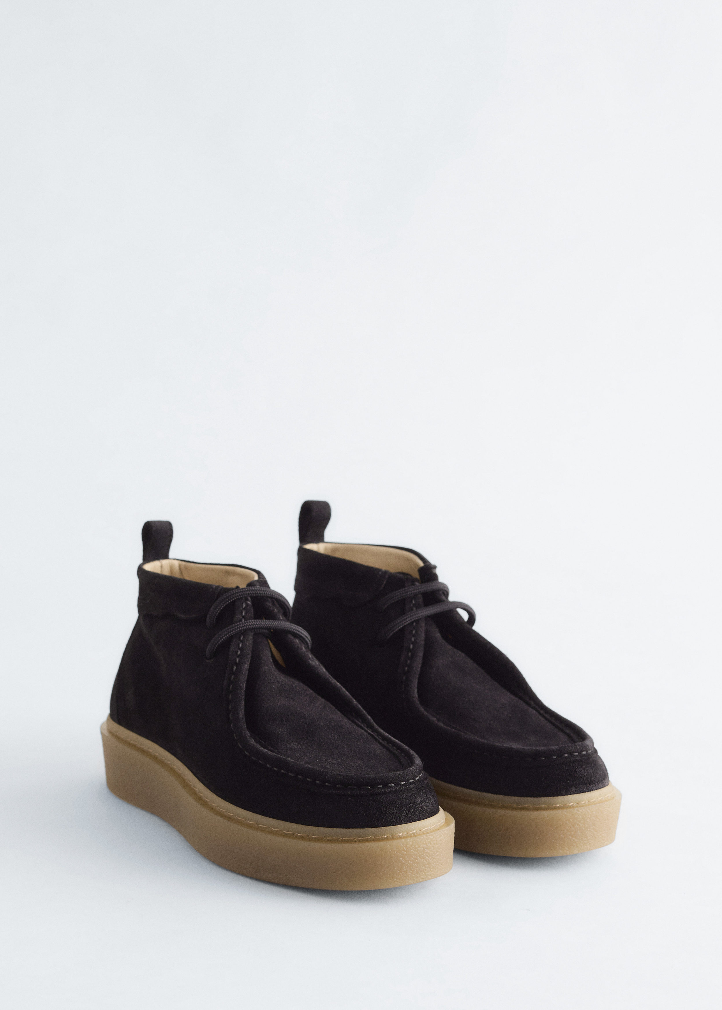 포르투갈에서 제작된 클래식 데저트 부츠예요. 라운드 레이스, 입구의 로 스캘럽 테두리, 그리고 후면의 풀 탭이 특징이에요. 플랫폼 밑창에는 은은한 텍스처가 적용되어 있답니다.