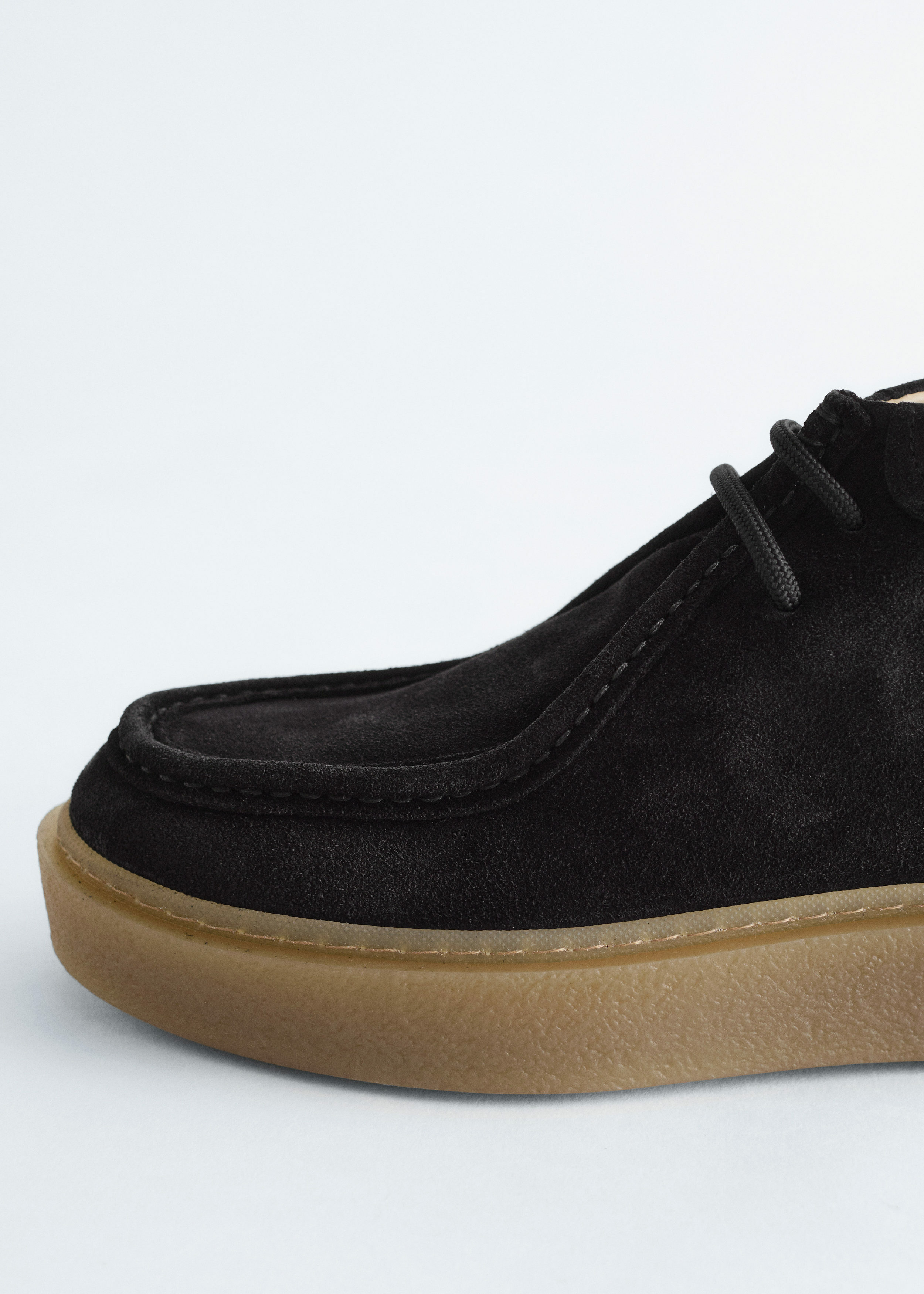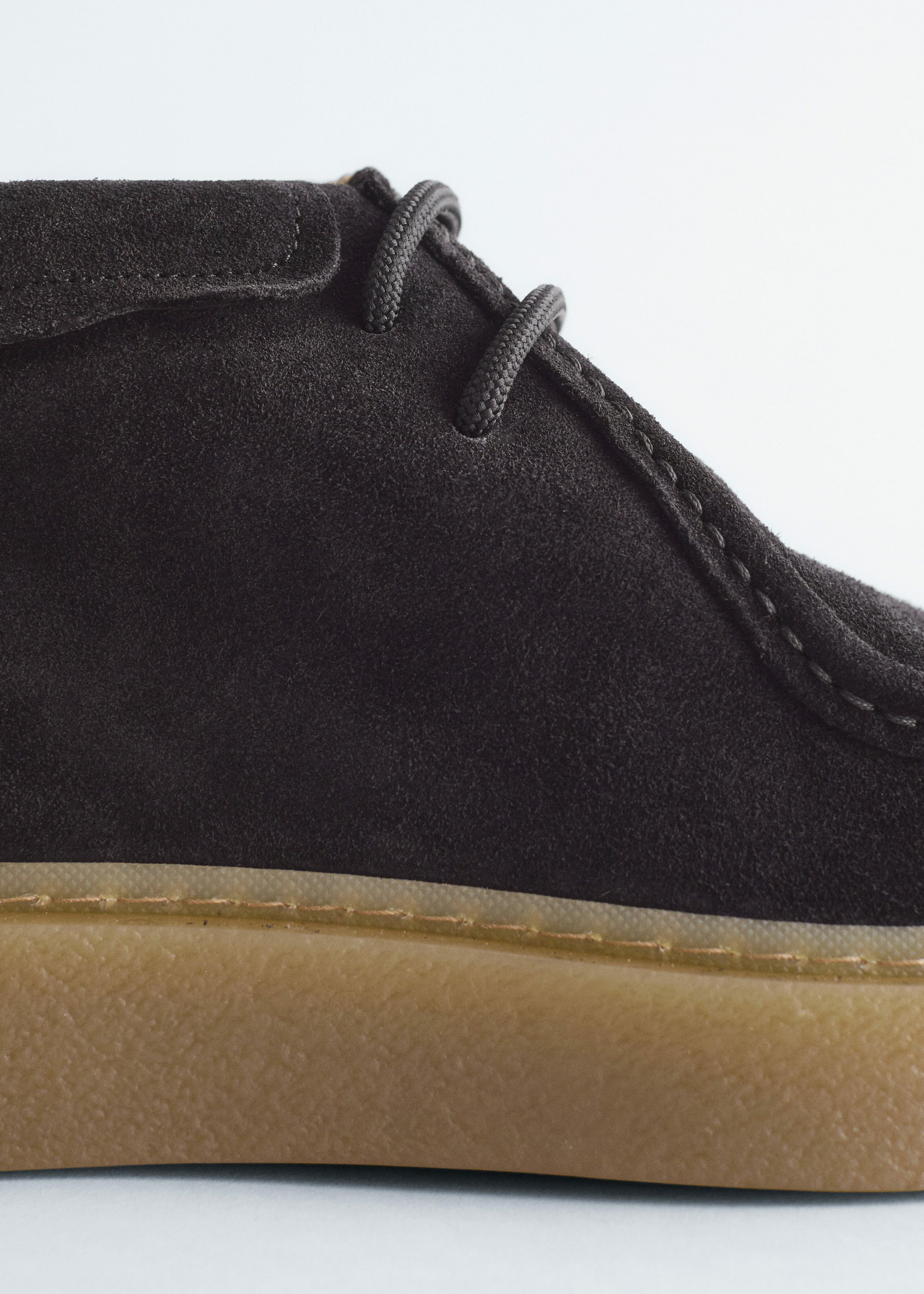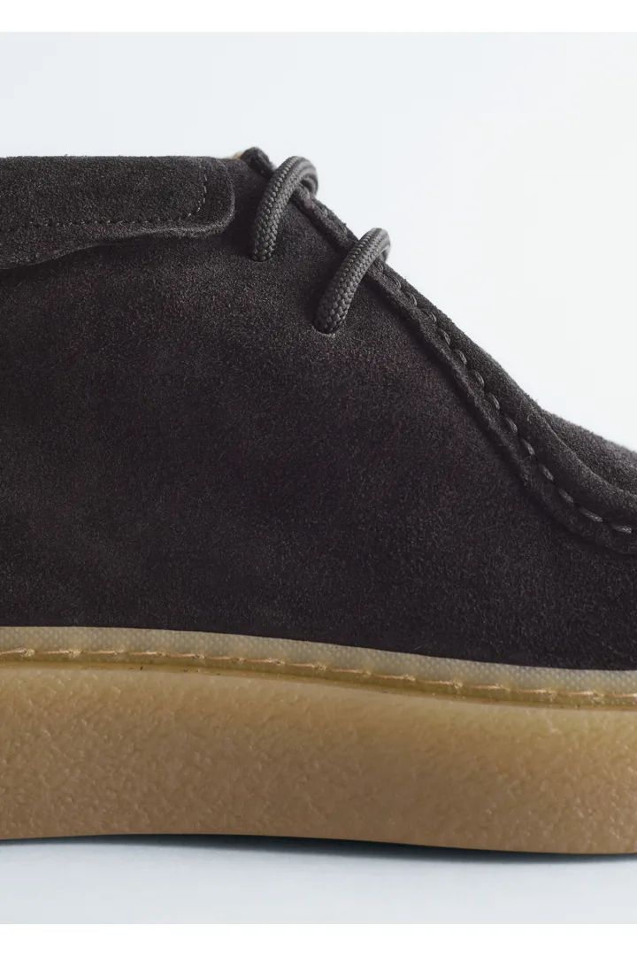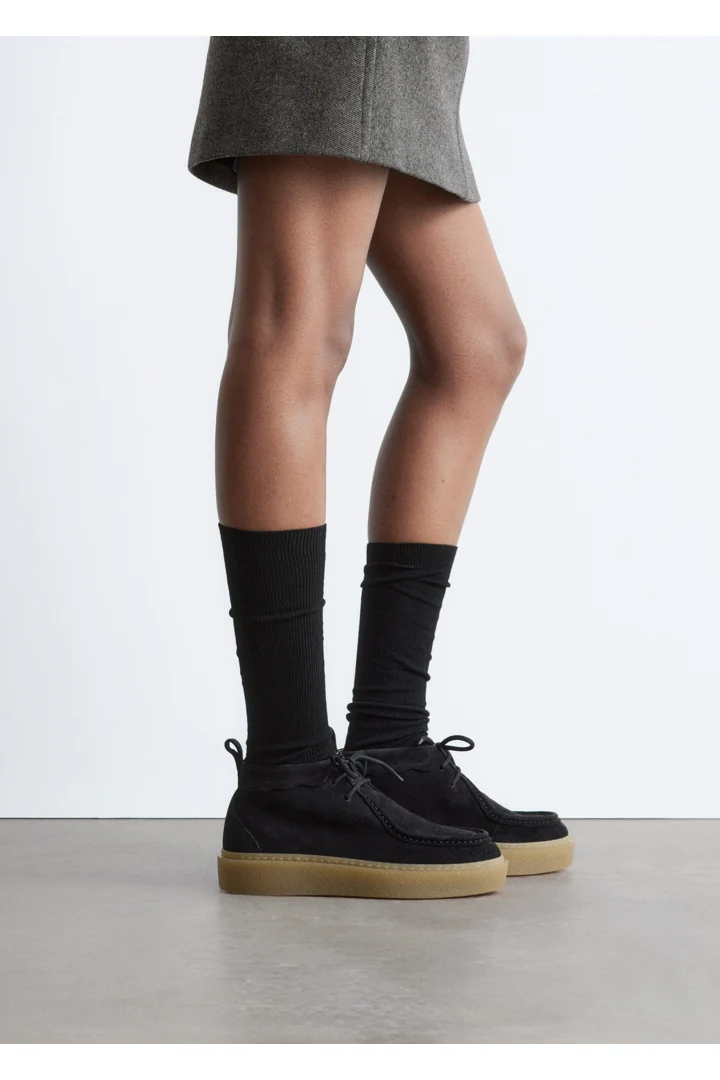 포르투갈에서 제작된 클래식 데저트 부츠예요. 라운드 레이스, 입구의 로 스캘럽 테두리, 그리고 후면의 풀 탭이 특징이에요. 플랫폼 밑창에는 은은한 텍스처가 적용되어 있답니다.