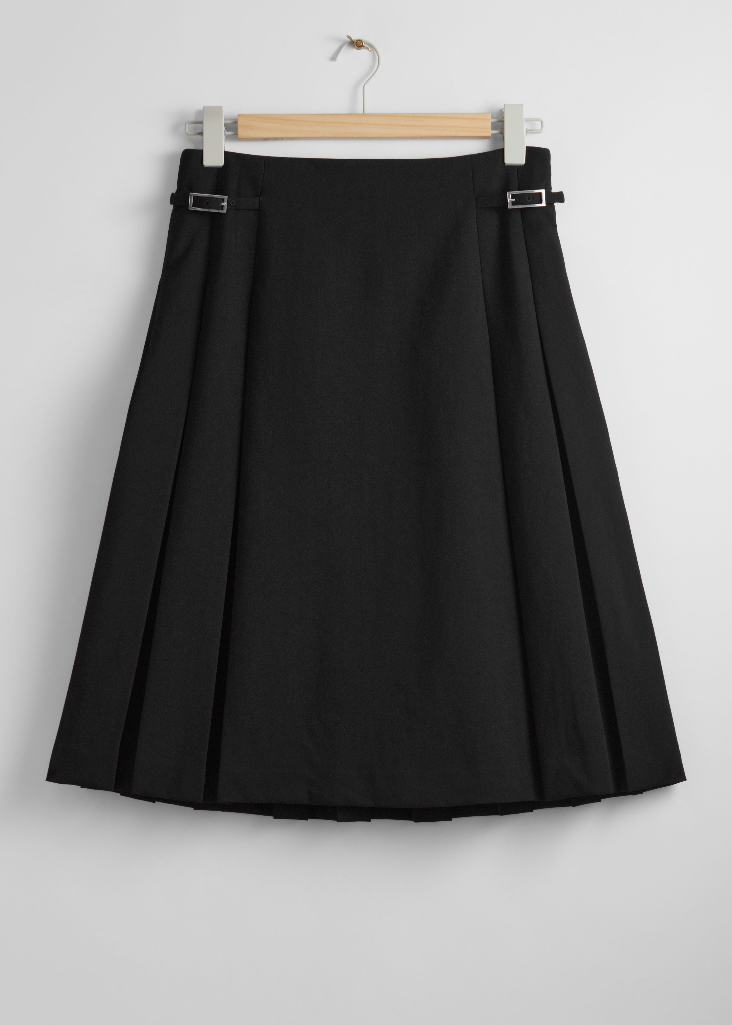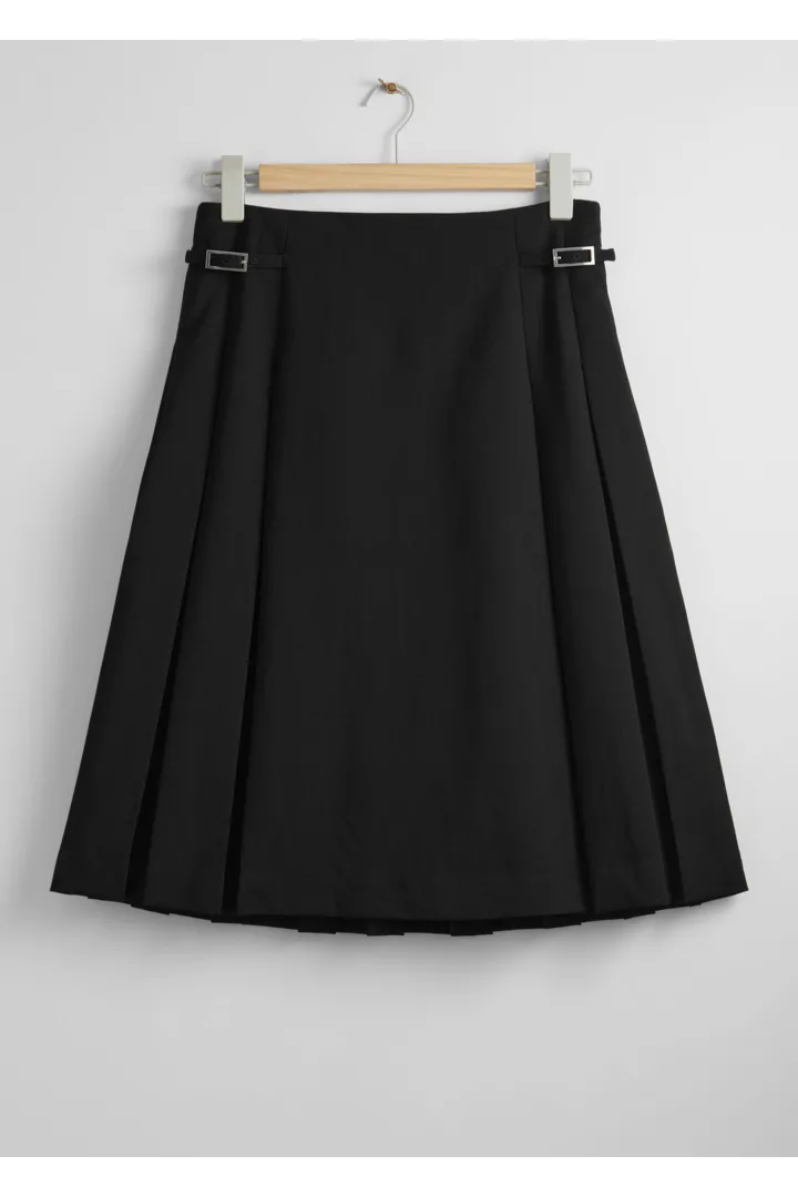 미디 실루엣의 스커트예요. 양쪽 측면부와 뒷면에는 플리츠 디테일이 자리해 있어요.
