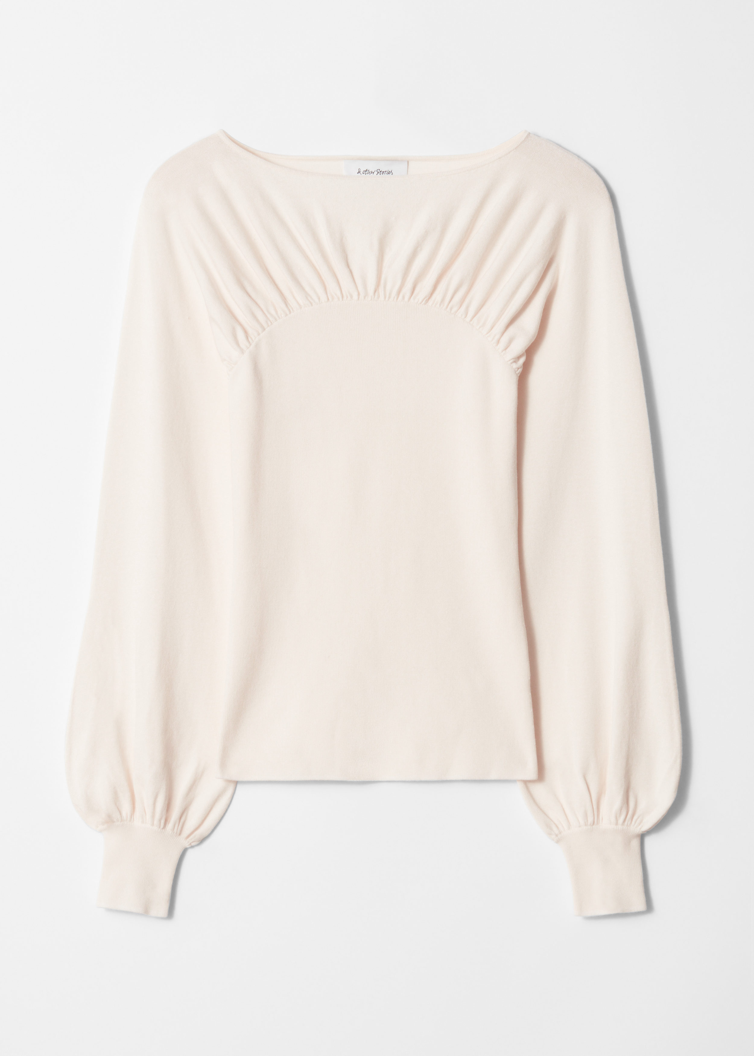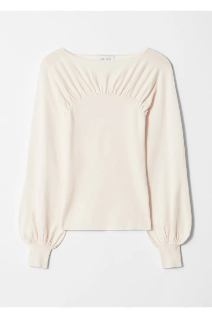 롱 슬리브의 니트 스웨터예요. 보트 네크라인, 슬림 핏의 립 웨이스트, 가슴의 주름 잡힌 개더링 디테일이 특징이랍니다.