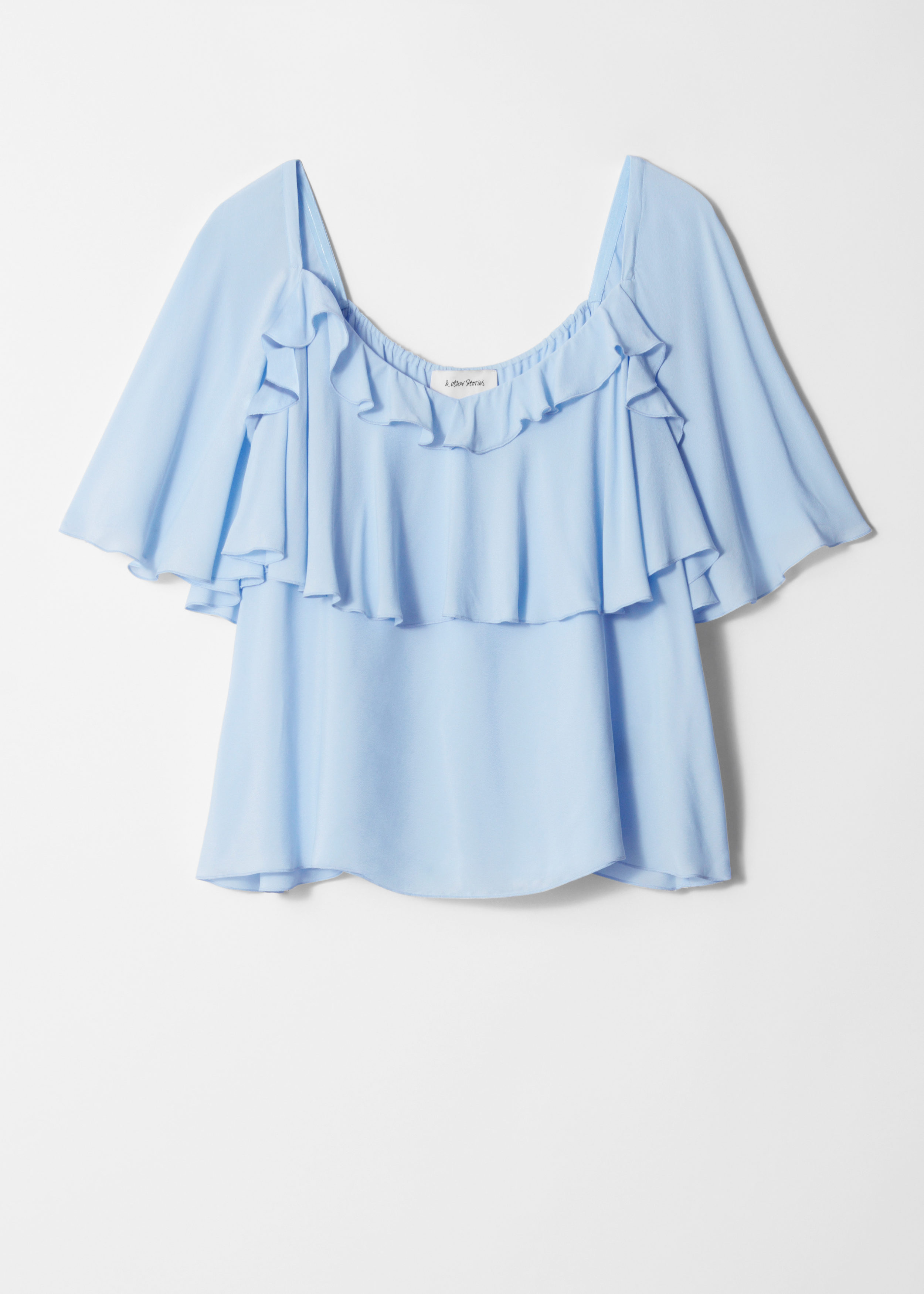 70년대 보헤미안 스타일을 신선한 감각으로 재해석한 블라우스예요. 가볍게 흐르는 소재감으로 부드럽고 루즈하게 드레이프지는 실루엣이 돋보이며 스위트하트 네크라인, 하늘하늘한 쇼트 슬리브, 물결치는 두 겹의 프릴이 어우러져 텍스처와 경쾌한 움직임을 선사해요. 엘라스틱 디테일이 자리한 뒷면의 깊게 파인 디자인으로 간편한 착용이 가능하답니다.