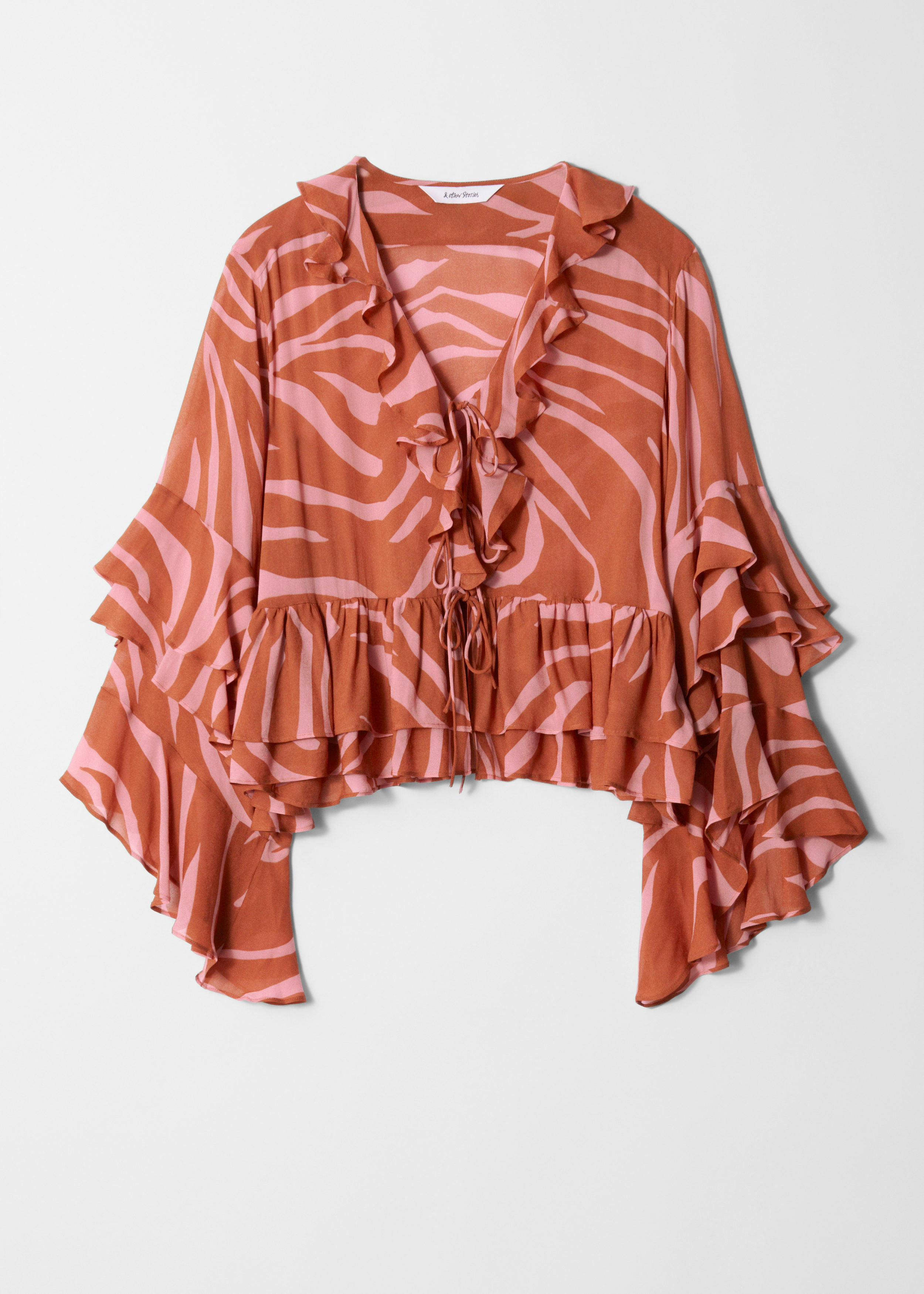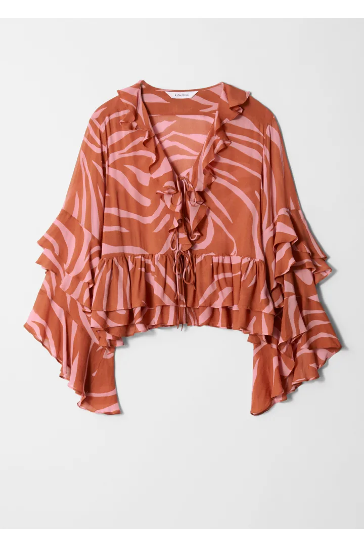 70년대 보헤미안 스타일을 모던하게 풀어낸 블라우스예요. 산뜻한 시폰 소재로 탄생했으며, 전체적으로 물결치는 프릴이 시선을 사로잡아요. 유려하게 흐르는 실루엣이 특징으로, 볼륨감 있는 롱 슬리브와 V 네크라인, 앞면의 타이가 자리해 있답니다.