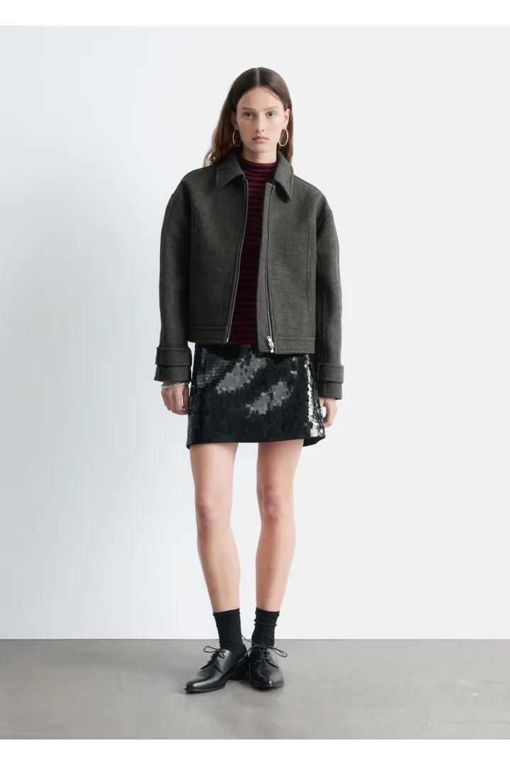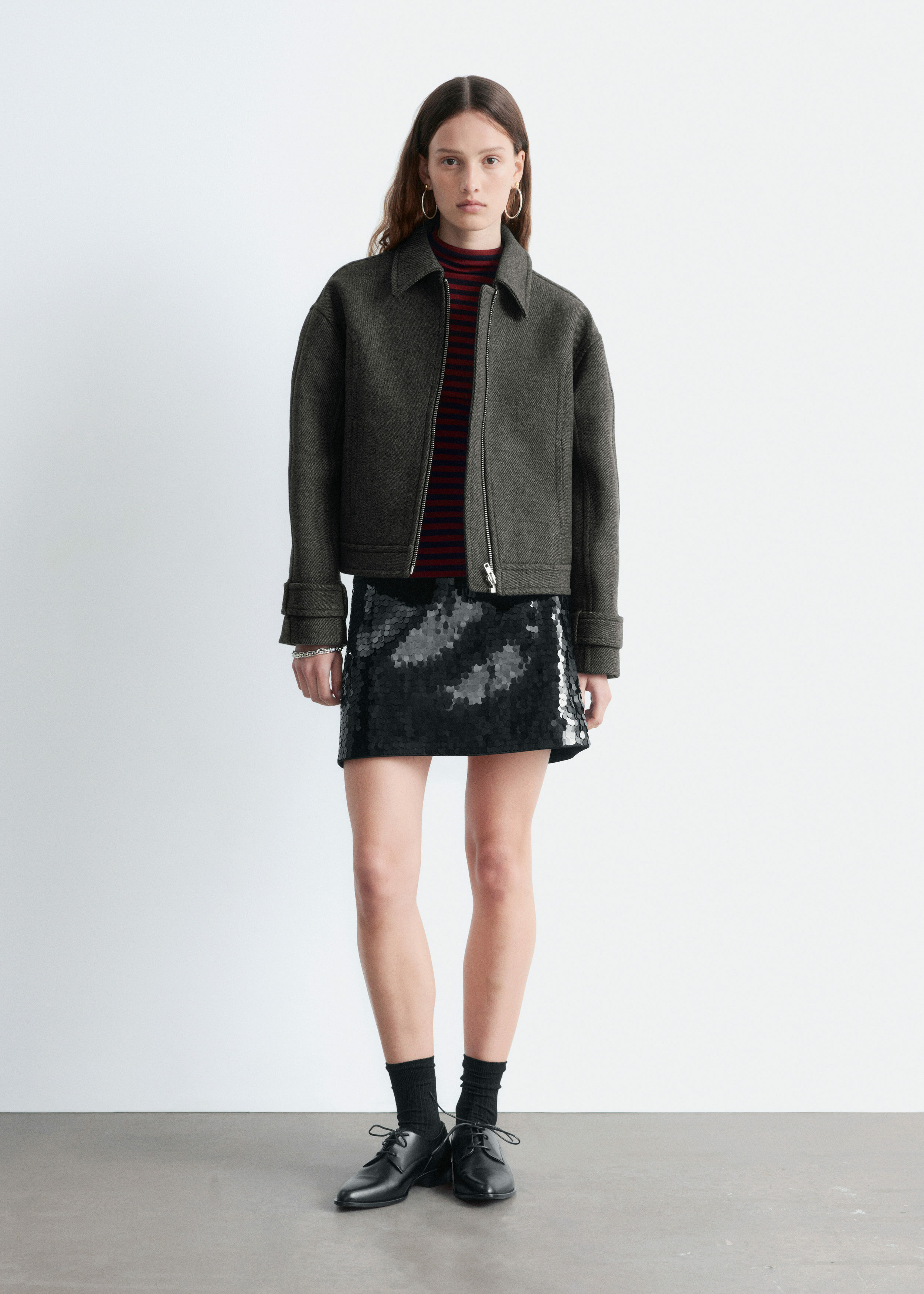 은은한 광택의 드롭 시퀸 장식이 전체를 감싸는 미니 스커트예요. 허리라인에는 작고 촘촘한 장식이 이어져 섬세한 움직임을 더하죠. 한쪽 옆면에는 컨실드 지퍼가 자리해 있답니다.