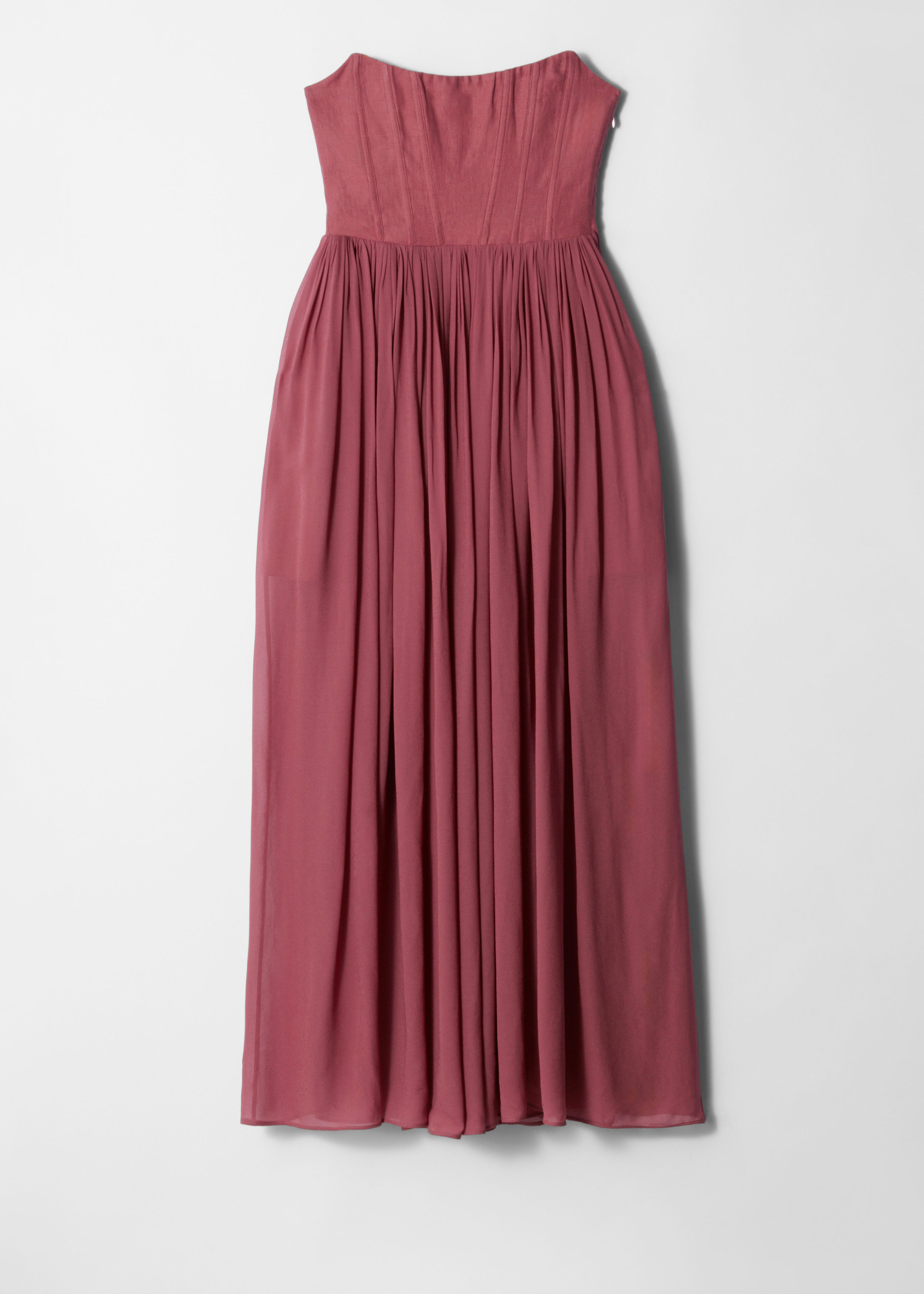 가볍고 하늘하늘한 시폰 소재로 탄생한 방도 맥시 드레스예요. 코르셋에서 영감을 얻은 보디스의 안쪽에는 보닝이 적용되어 구조감을 연출하며, 유려하게 흐르는 롱 스커트는 부드러운 주름 디테일과 잠자리 형태의 자수로 멋스러움이 느껴진답니다. 뒷면에는 주름 패널이, 측면에는 깔끔한 지퍼가 자리해 있어요.