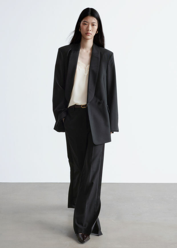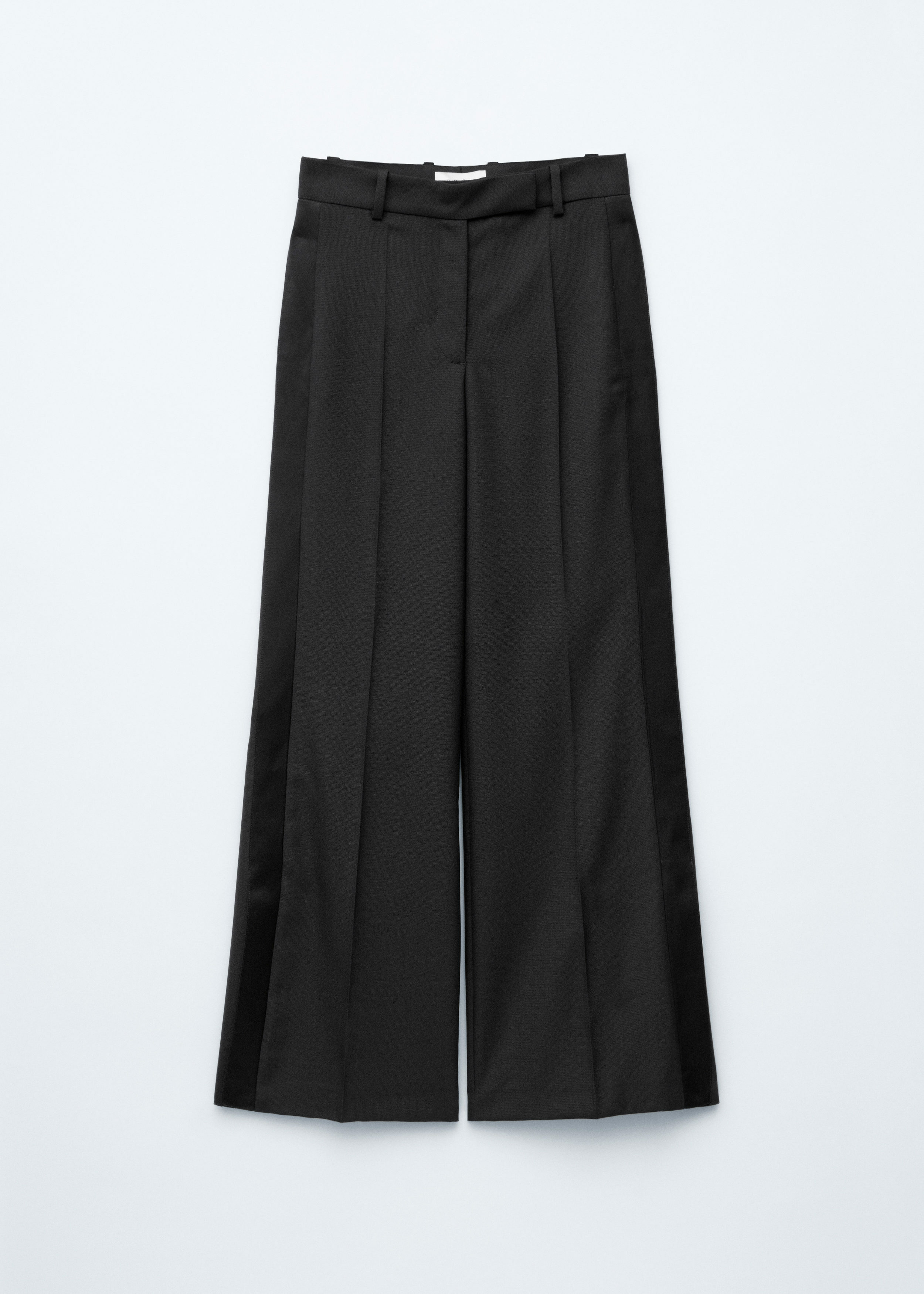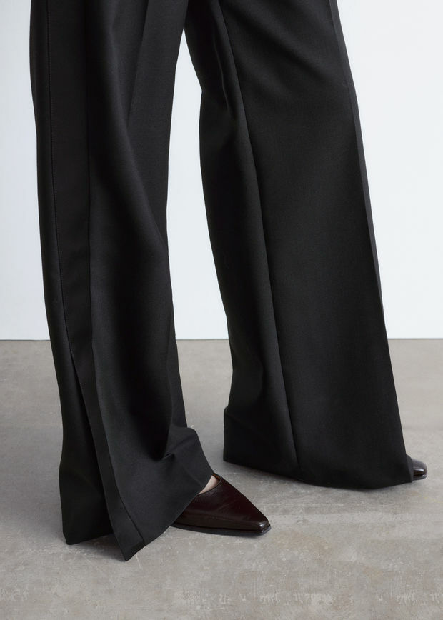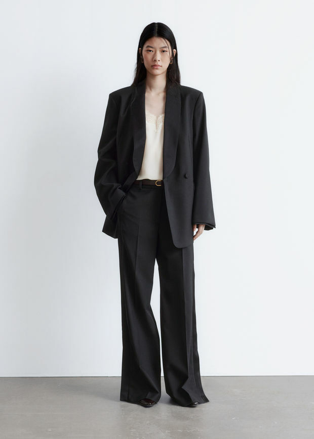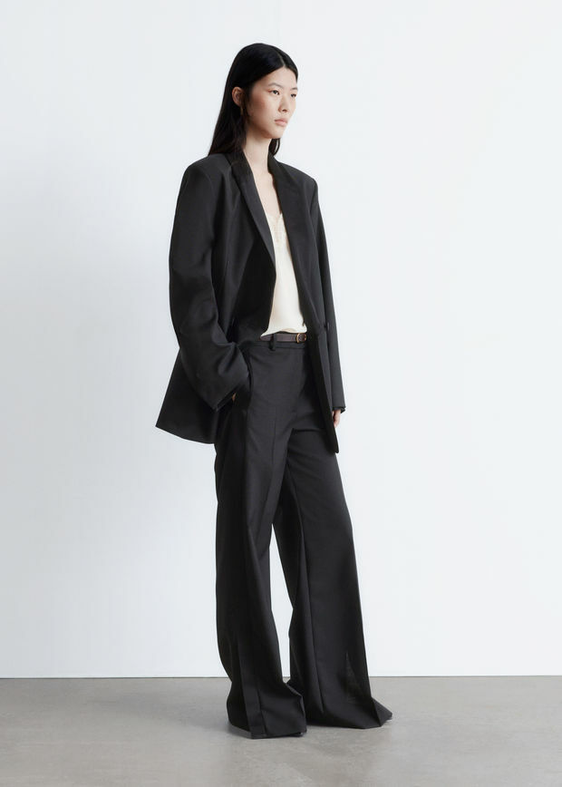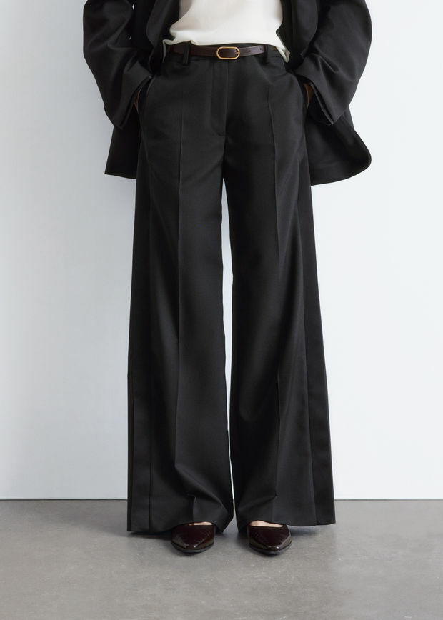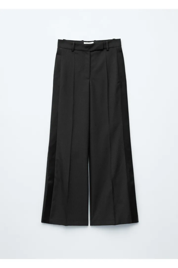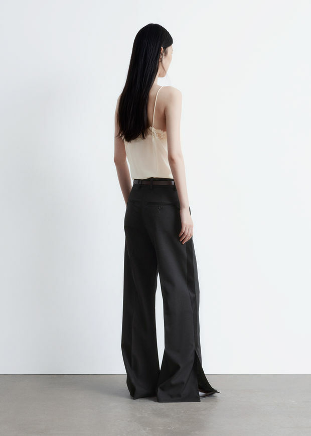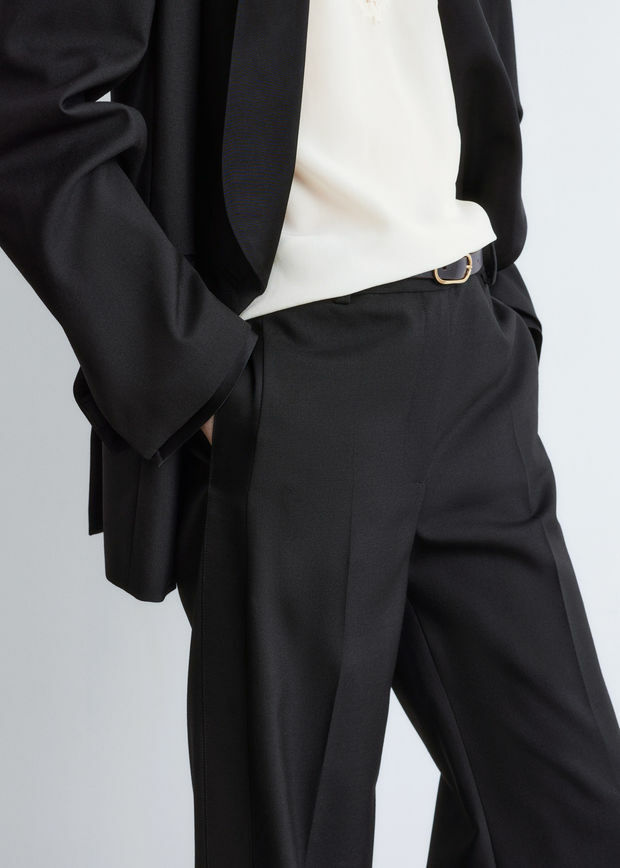 울 소재의 테일러드 트라우저예요. 너비감 있는 롱 레그에는 깔끔한 프레스 크리스와 측면부의 새틴 패널이 자리해 있어요. 레귤러 웨이스트, 뒷면의 제트 포켓, 지퍼 플라이, 후크 앤 바 클로저가 특징이랍니다.