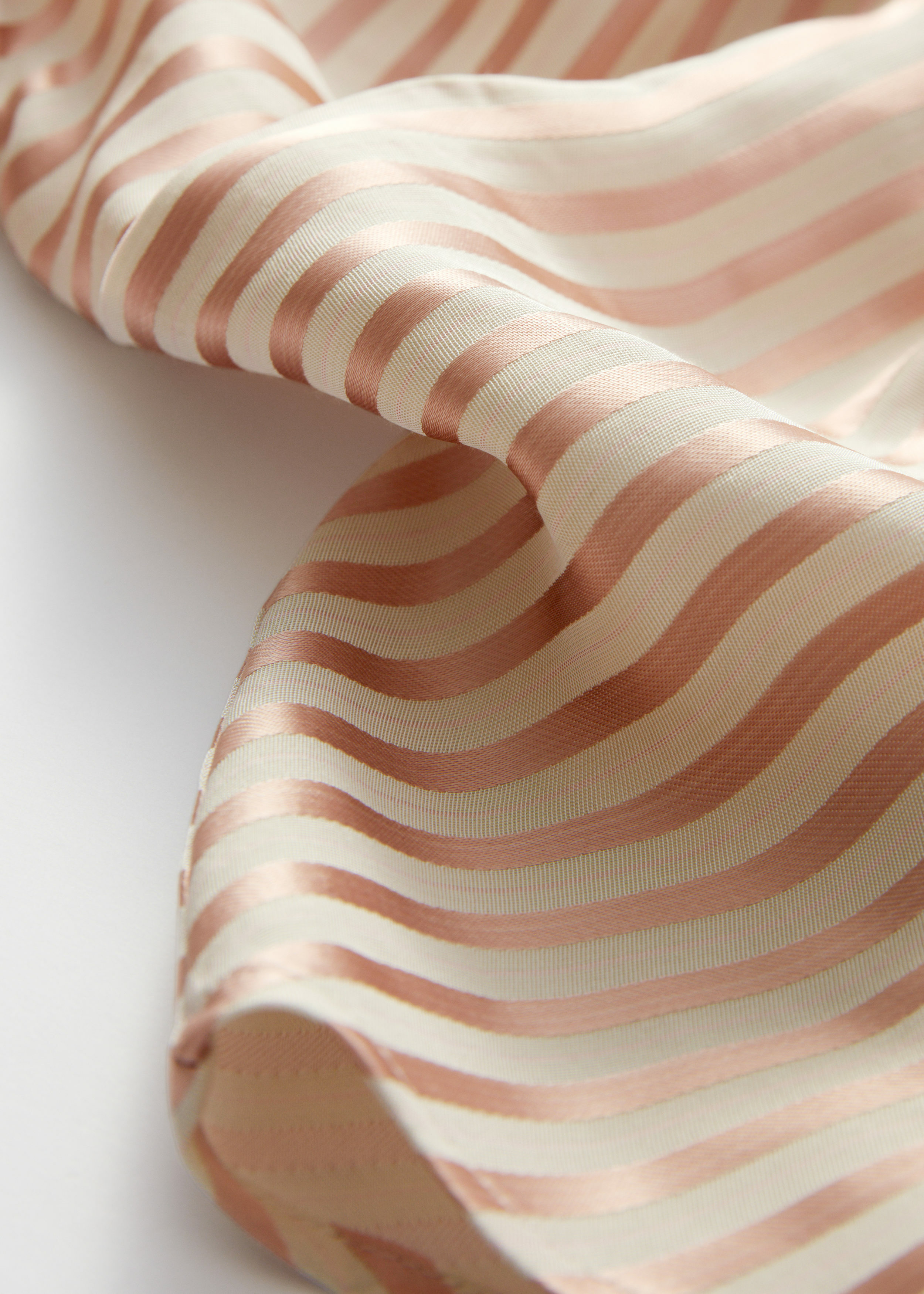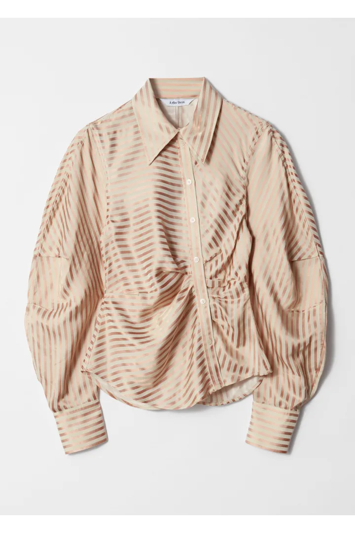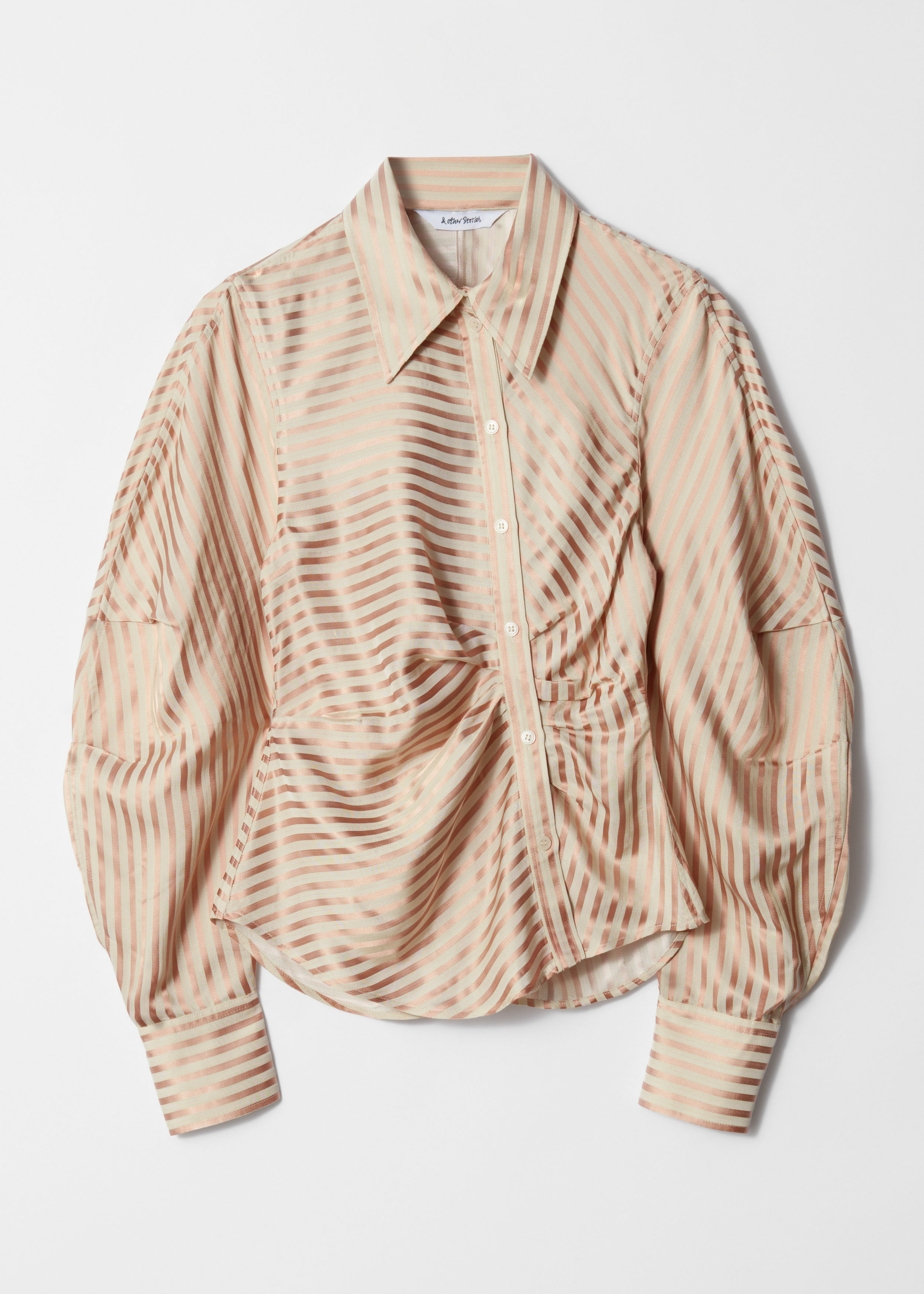 롱 슬리브의 셔츠예요. 볼륨감 있는 슬리브, 비대칭적인 버튼 플래킷, 개더링 주름 장식으로 강조된 허리라인이 멋스럽답니다.