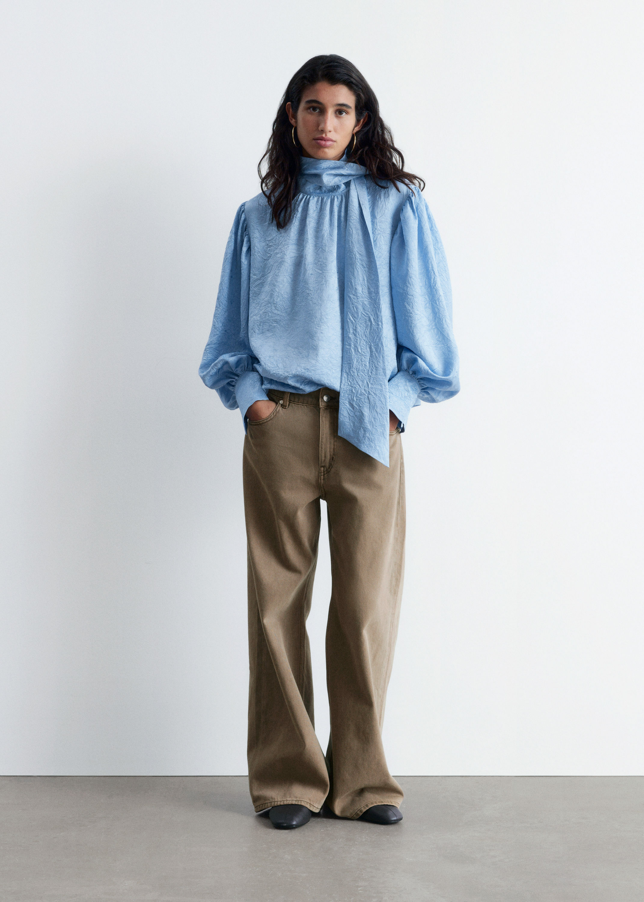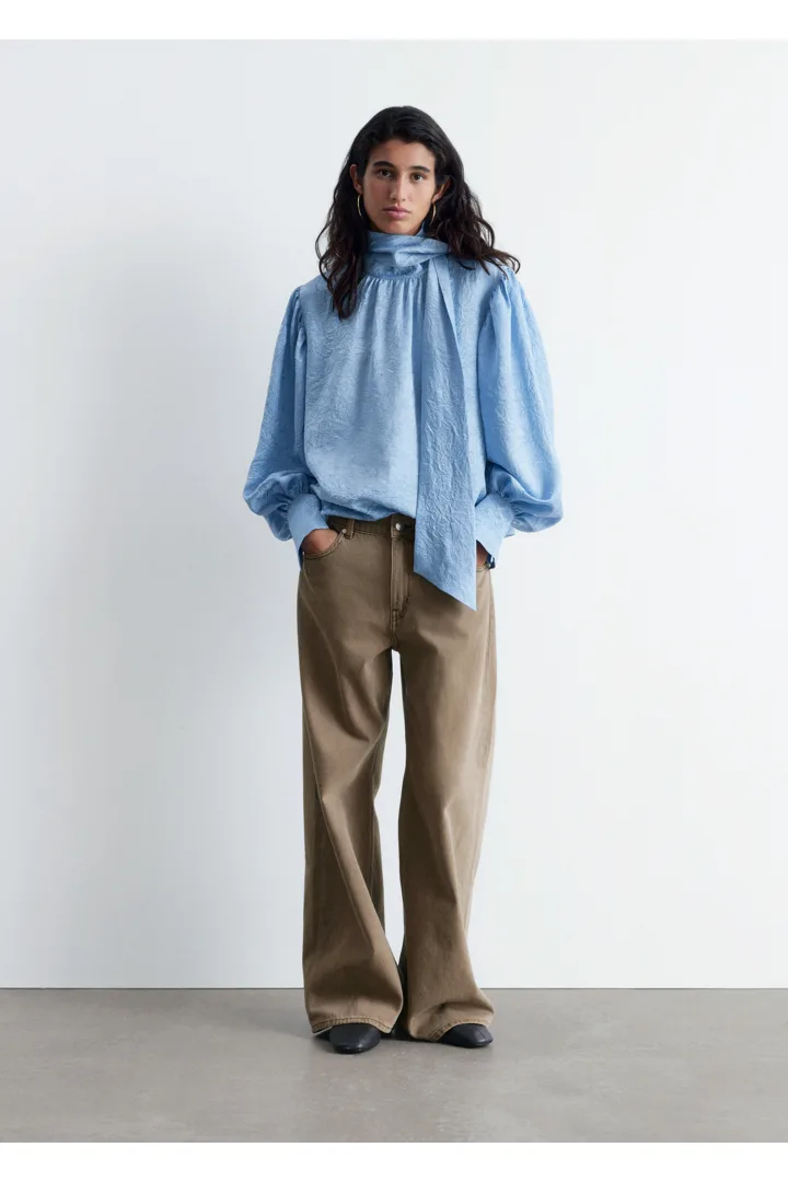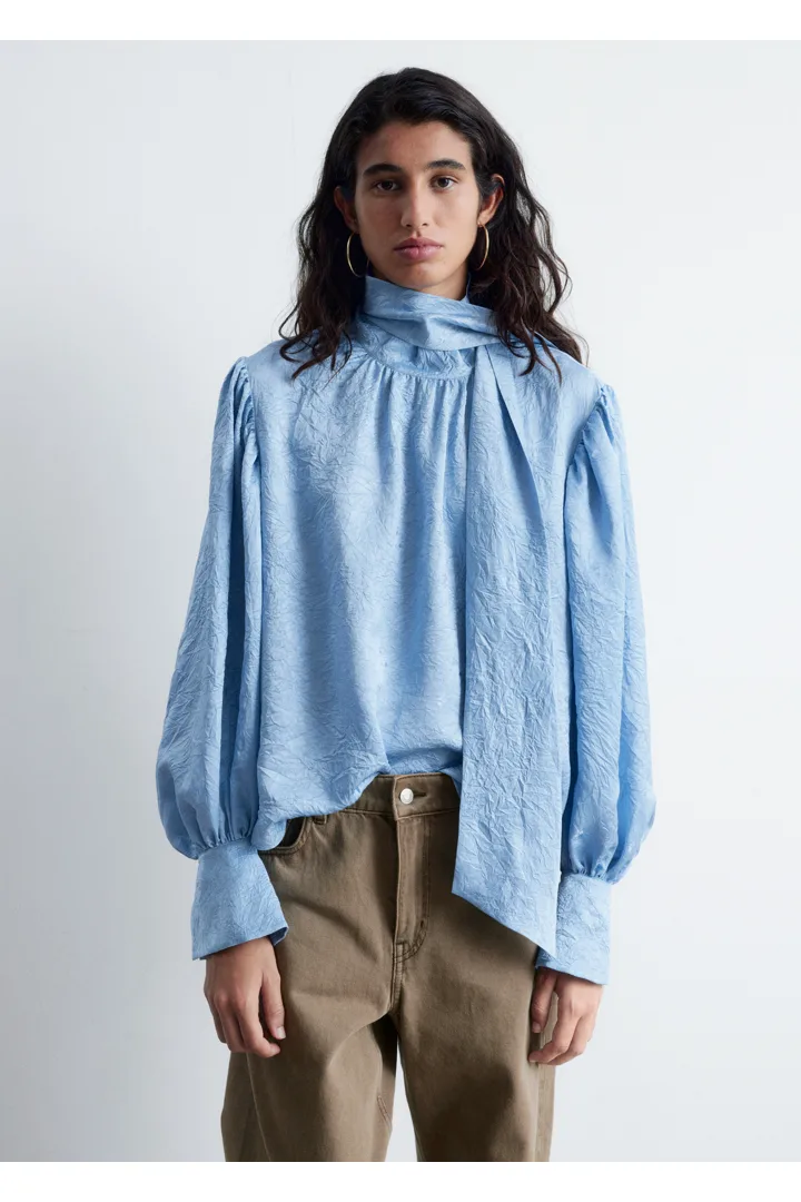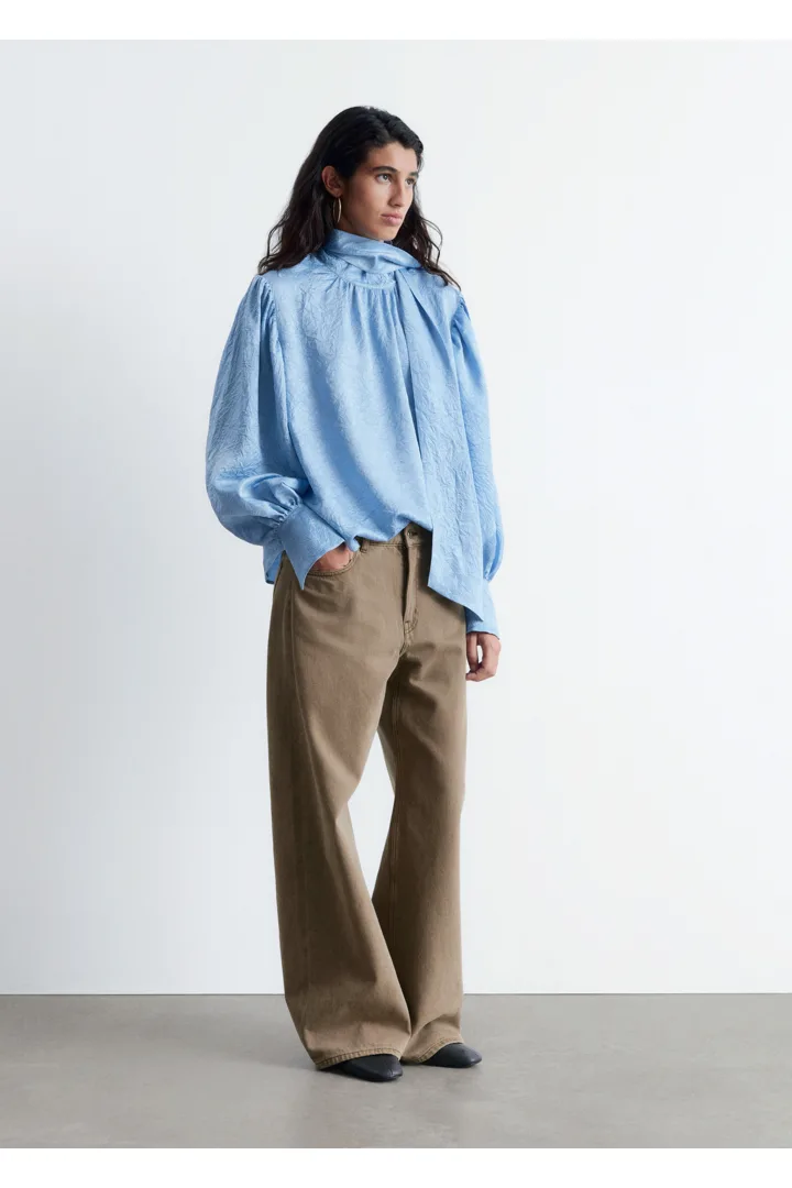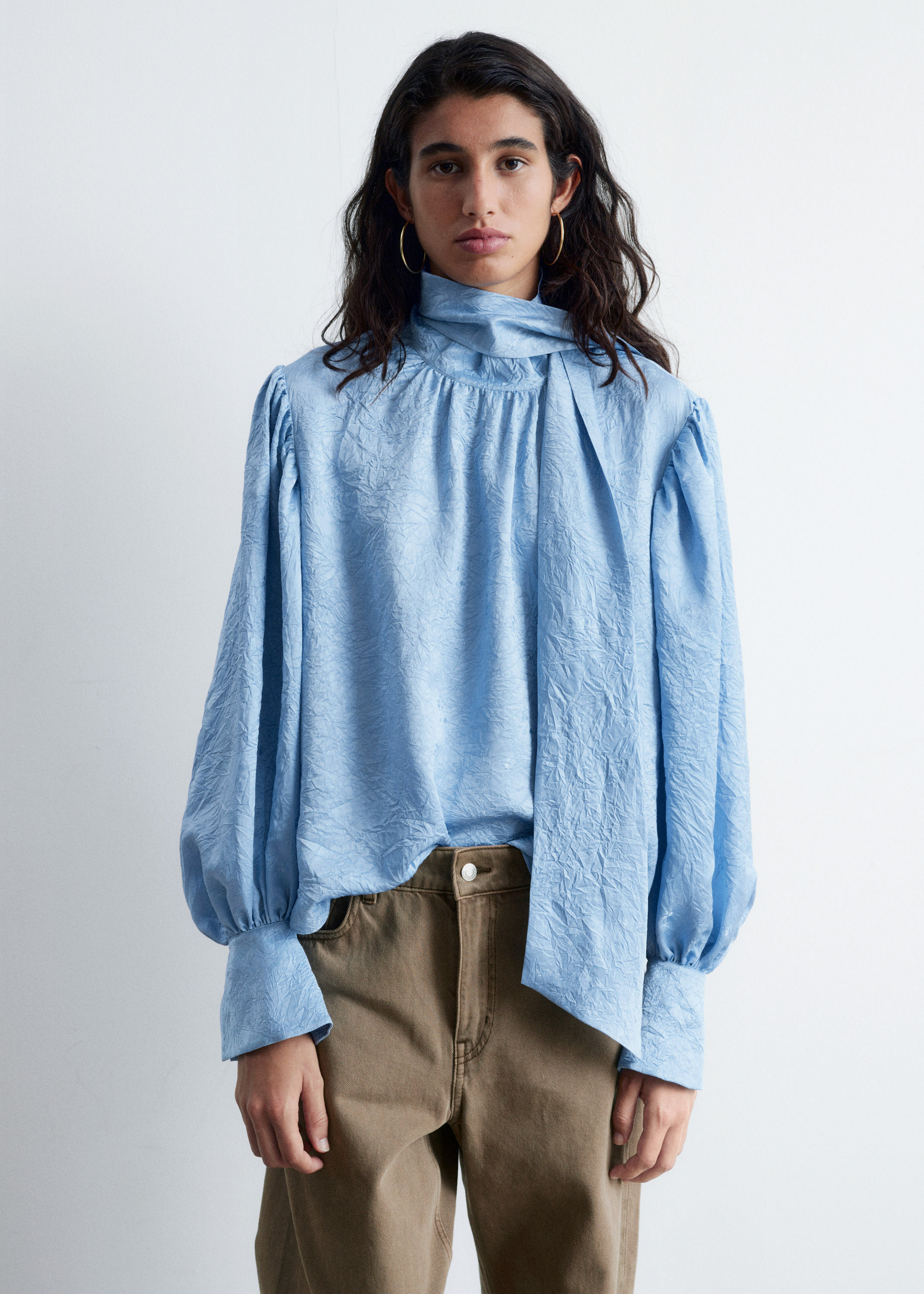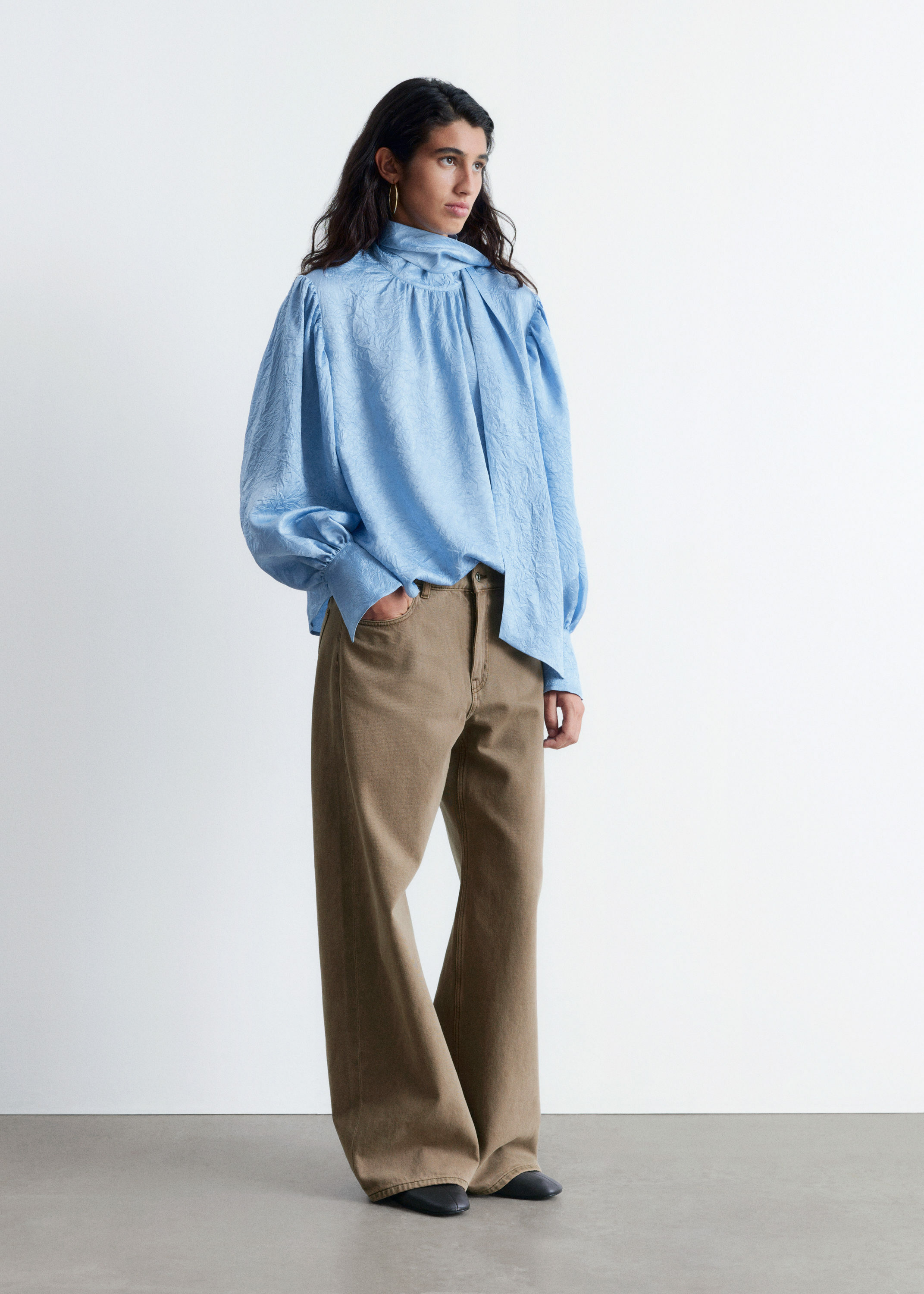 가벼운 자카드 소재의 블라우스예요. 은은한 플로럴 패턴과 유려하게 흐르는 실루엣이 매력적인 제품으로, 스탠드 카라에 자리한 일체형 스카프는 리본으로 묶어 연출할 수도 있답니다. 볼륨감 있는 슬리브, 너비감 있는 버튼 커프스, 그리고 네크라인의 키홀 & 단추가 자리해 있어요.