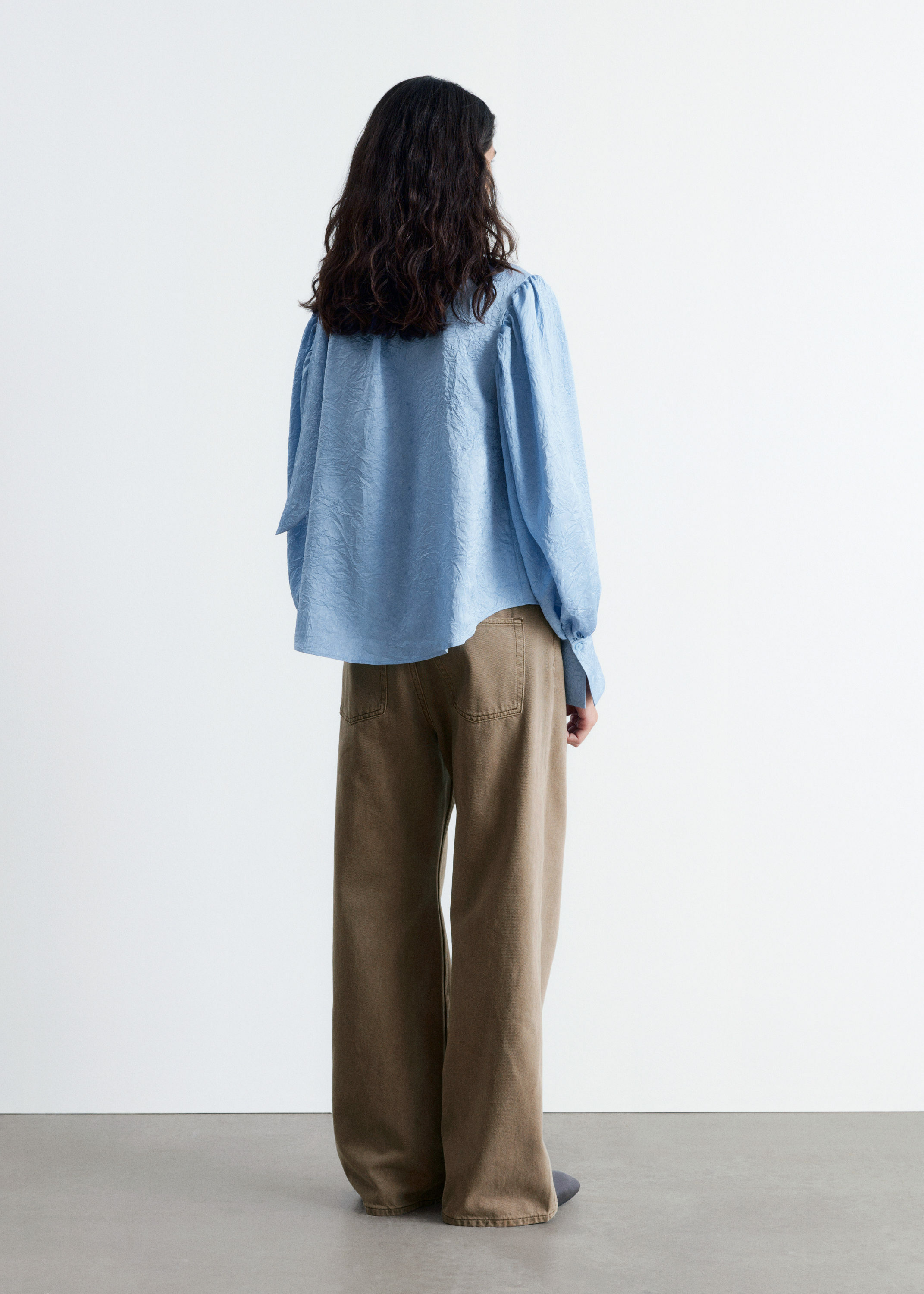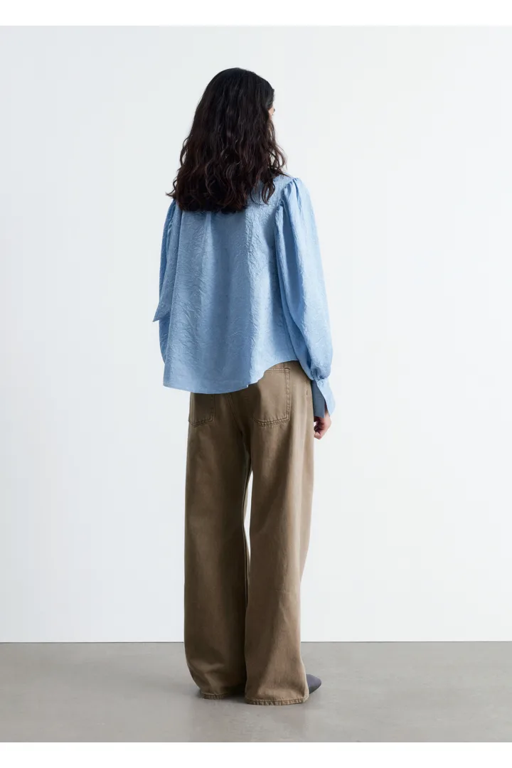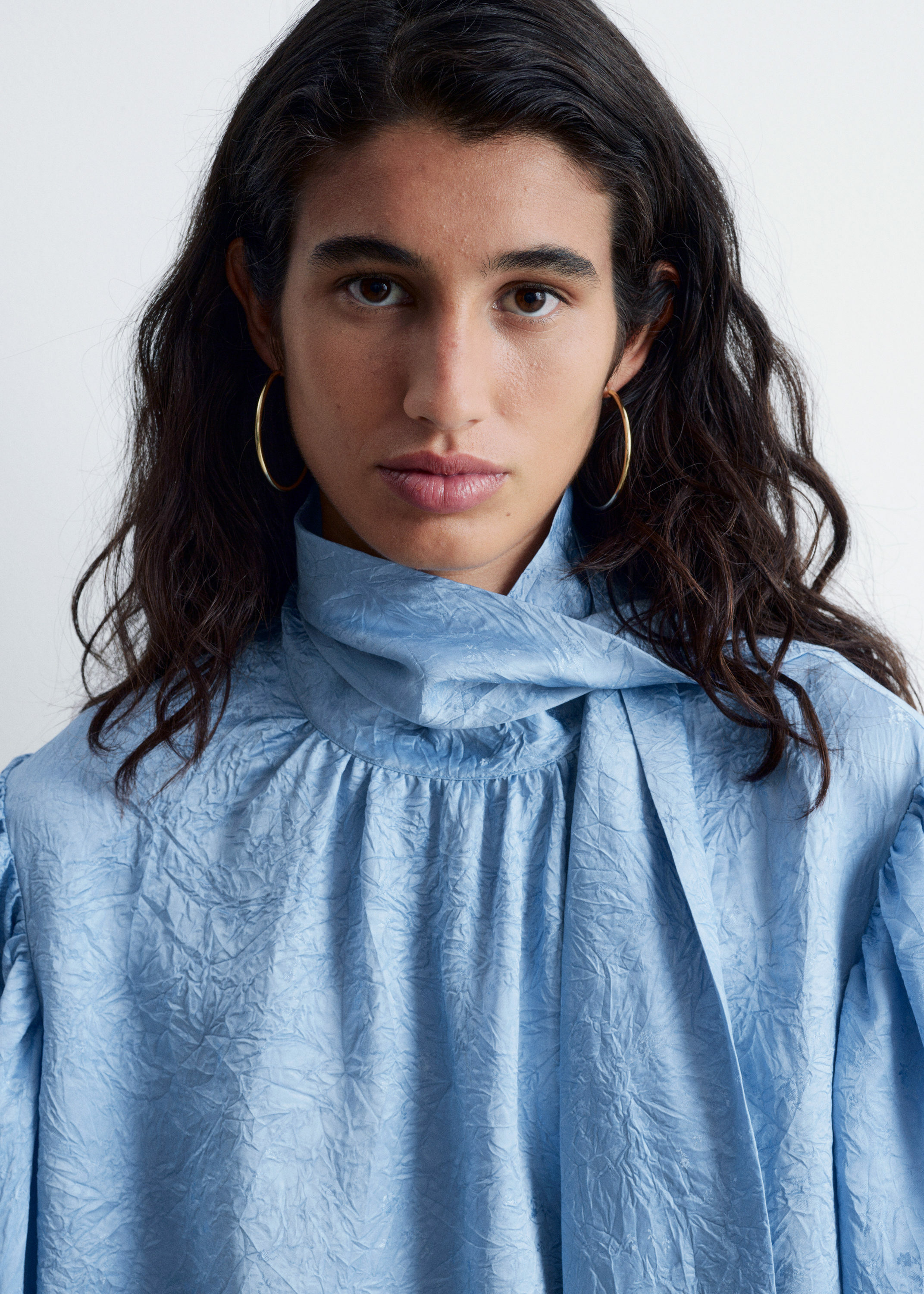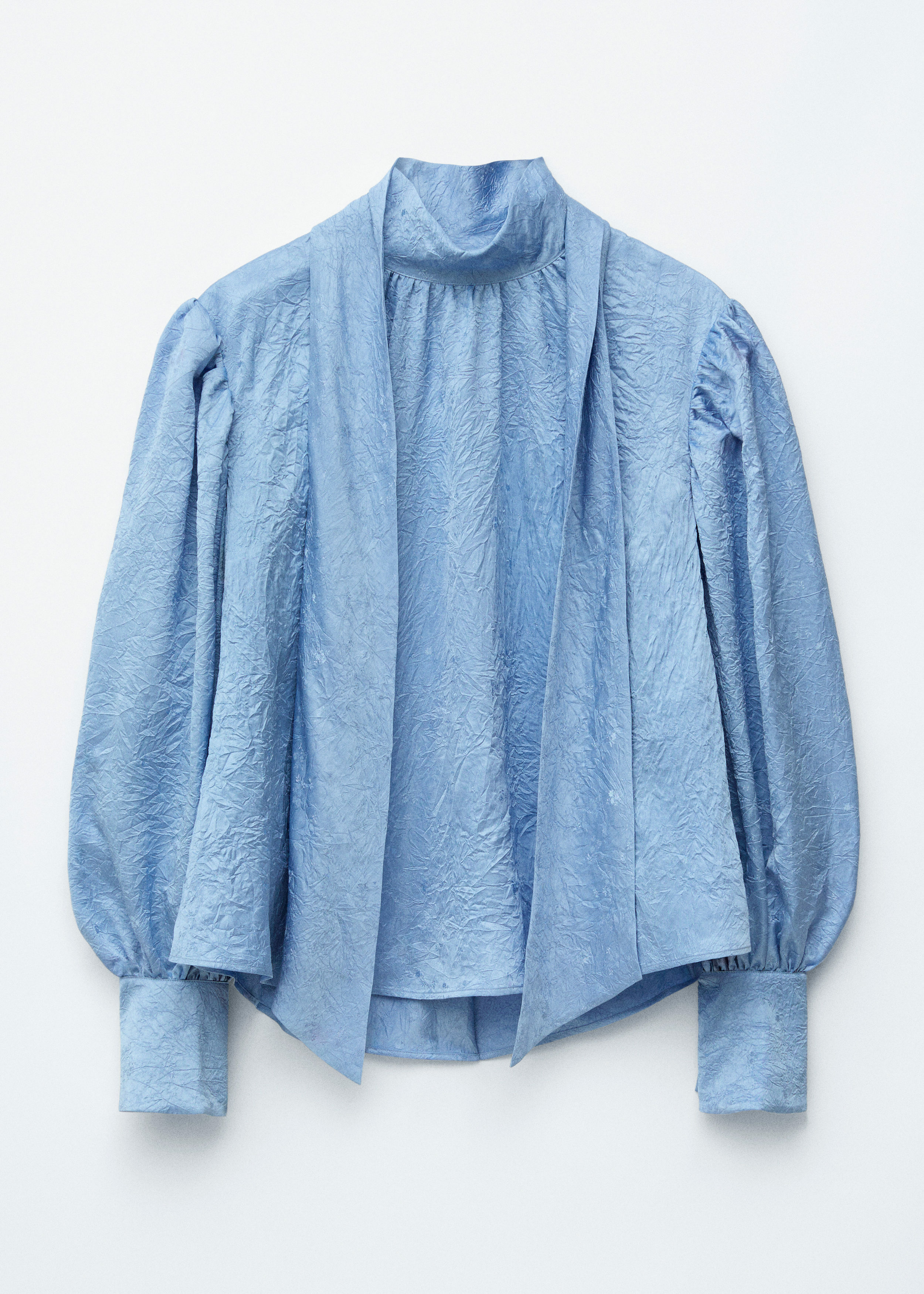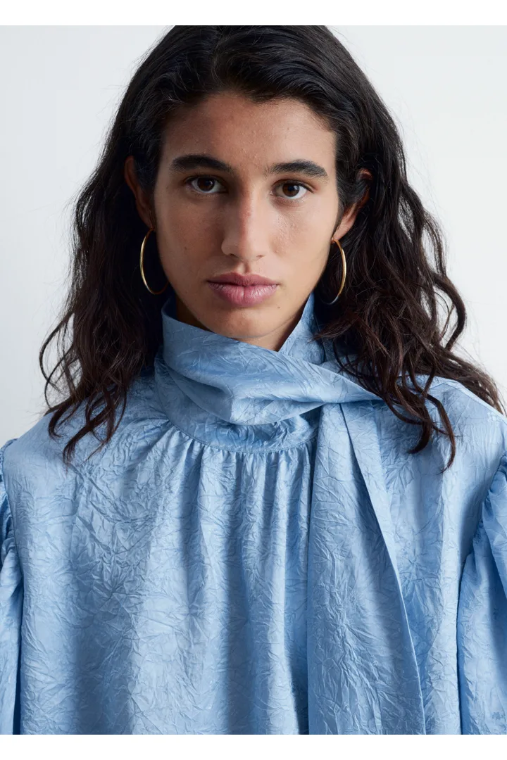 가벼운 자카드 소재의 블라우스예요. 은은한 플로럴 패턴과 유려하게 흐르는 실루엣이 매력적인 제품으로, 스탠드 카라에 자리한 일체형 스카프는 리본으로 묶어 연출할 수도 있답니다. 볼륨감 있는 슬리브, 너비감 있는 버튼 커프스, 그리고 네크라인의 키홀 & 단추가 자리해 있어요.