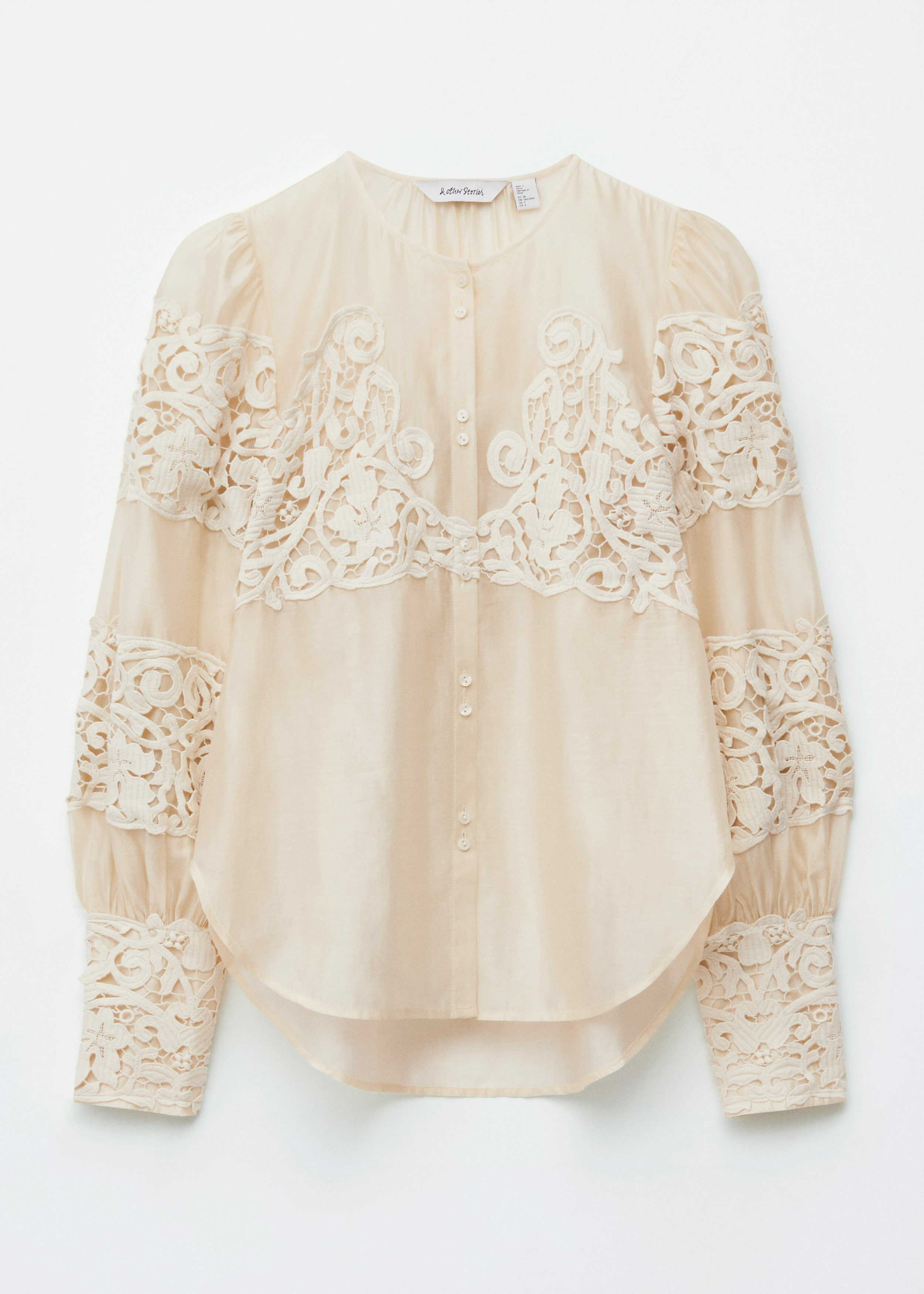 가벼운 시어 원단으로 탄생한 블라우스예요. 코튼 레이스 엠브로이더리가 매력적인 아이템으로 스트레이트 실루엣, 라운드 네크라인, 롱 벌룬 슬리브, 버튼 커프스, 부드러운 라운드 헴라인이 특징이랍니다.