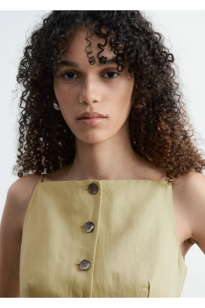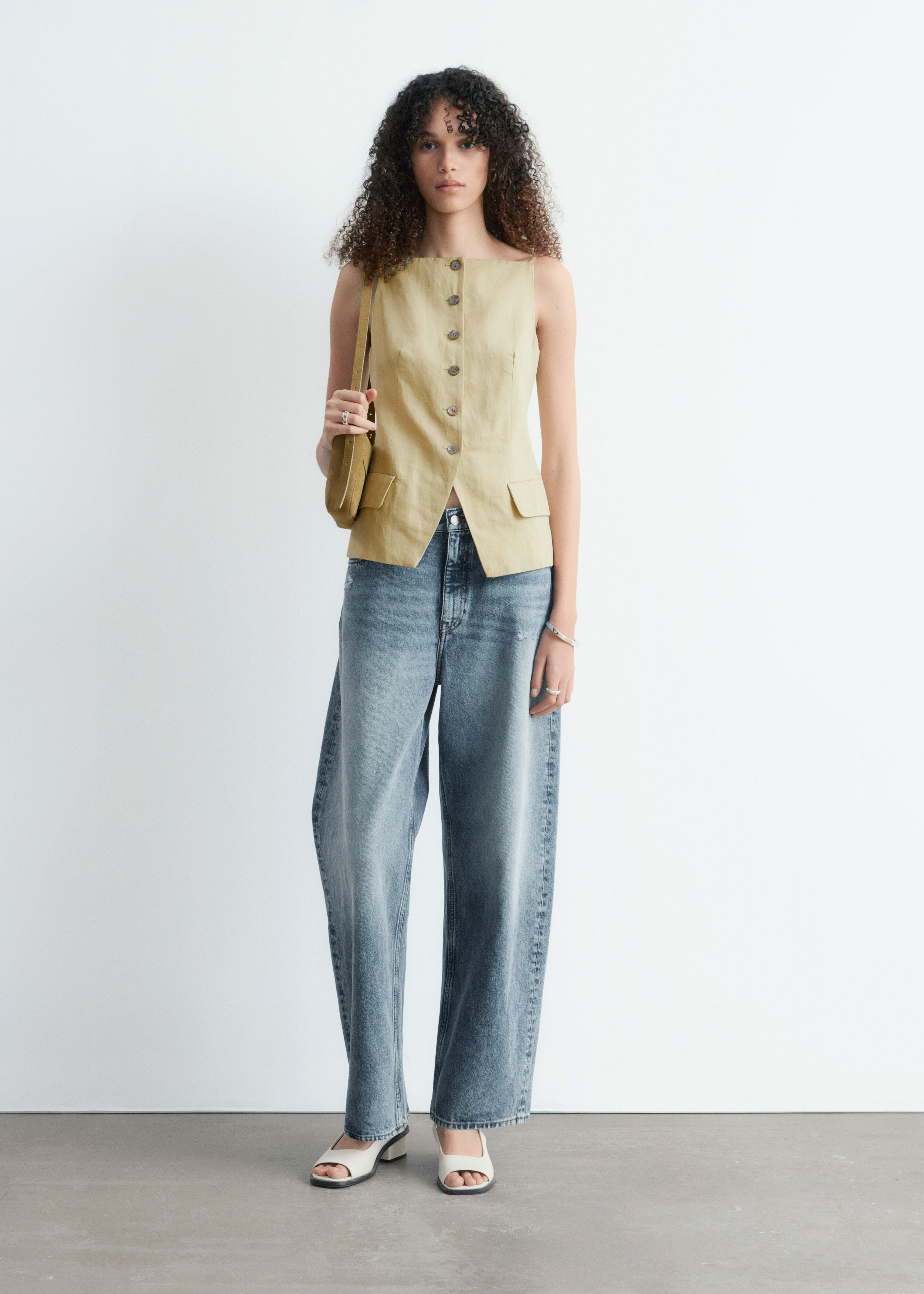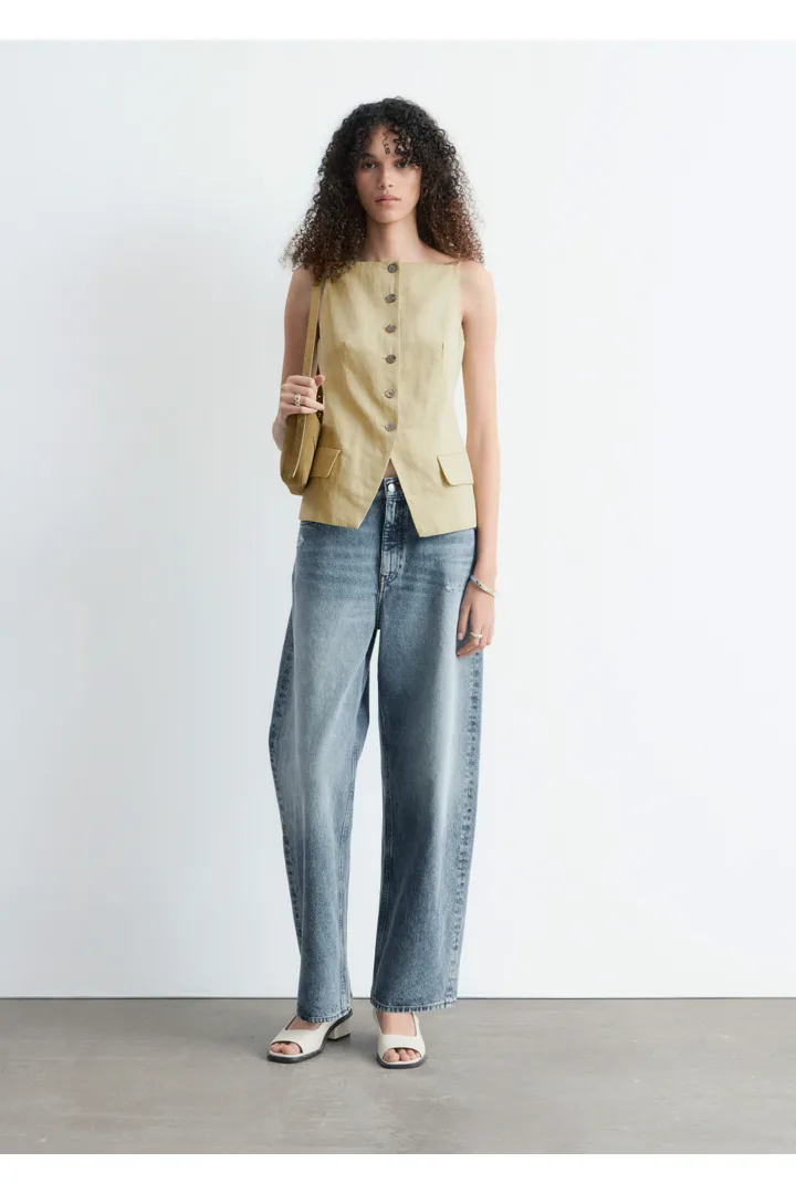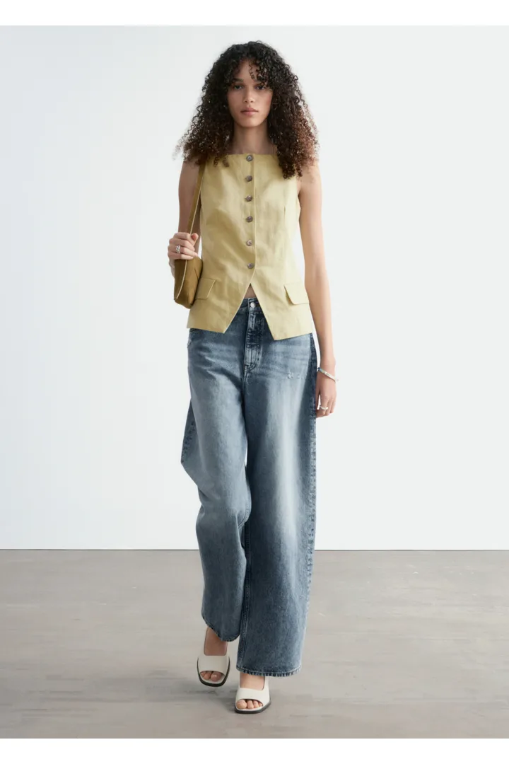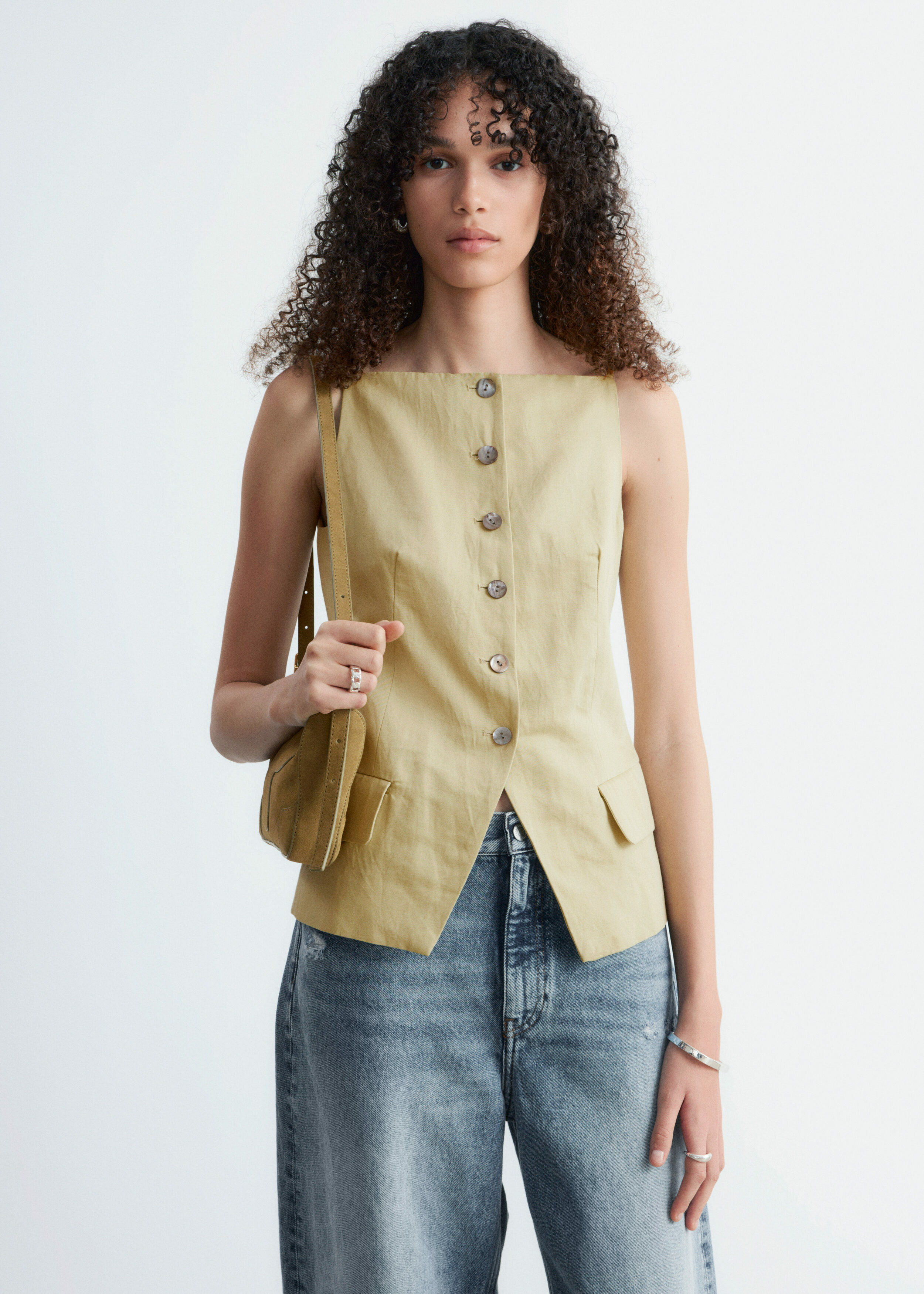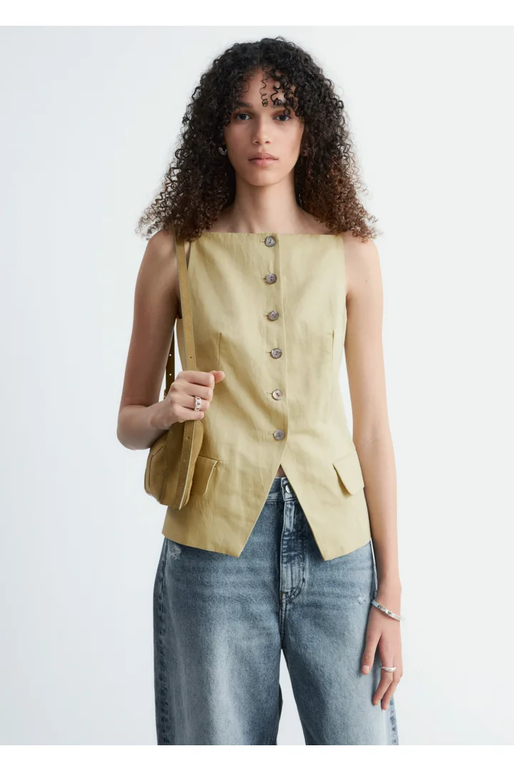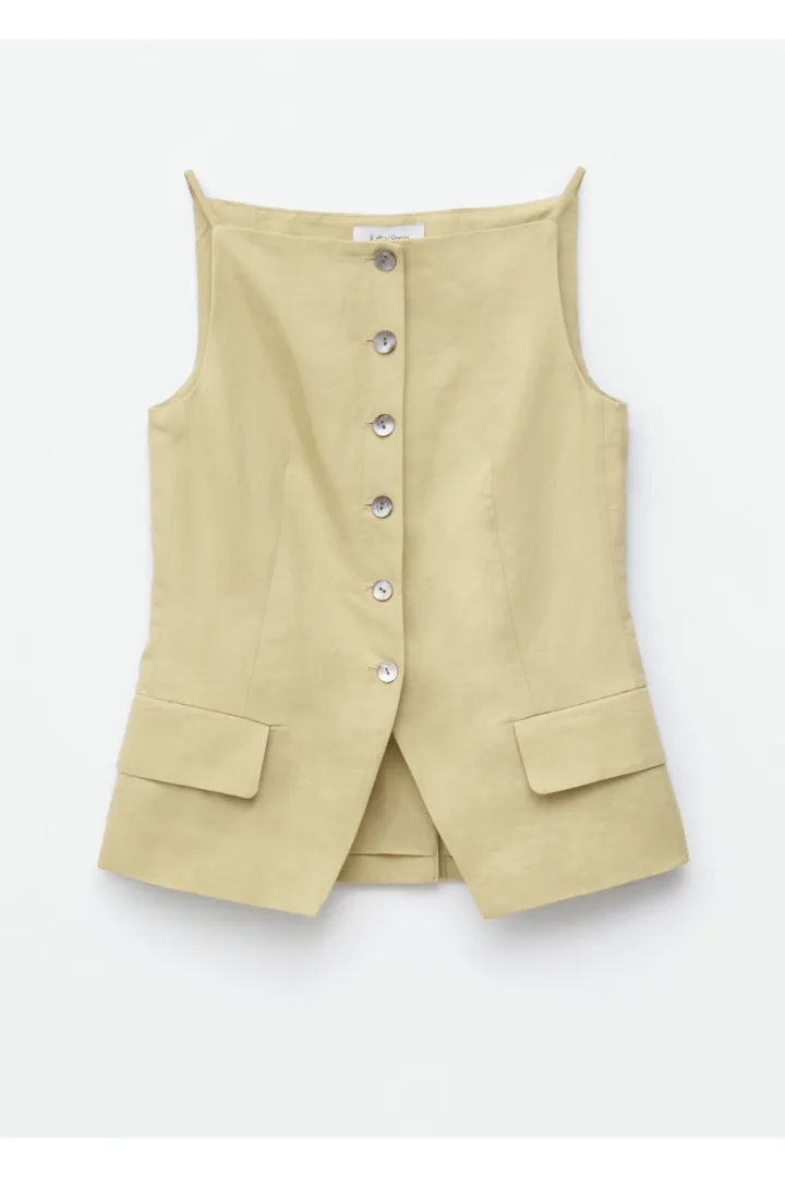 테일러드 룩의 베스트 탑이에요. 얇은 스트랩, 스퀘어 네크라인, 2개의 장식 플랩 포켓, 6개의 단추, 뒷면에 동일 소재의 타이가 특징이랍니다.