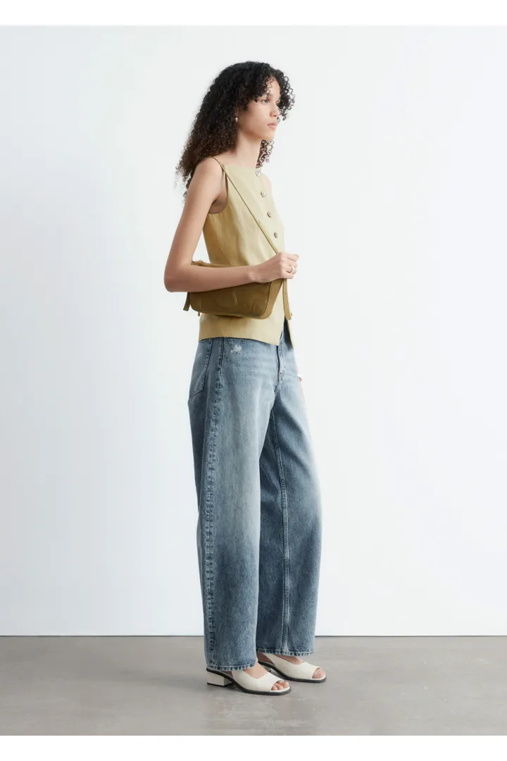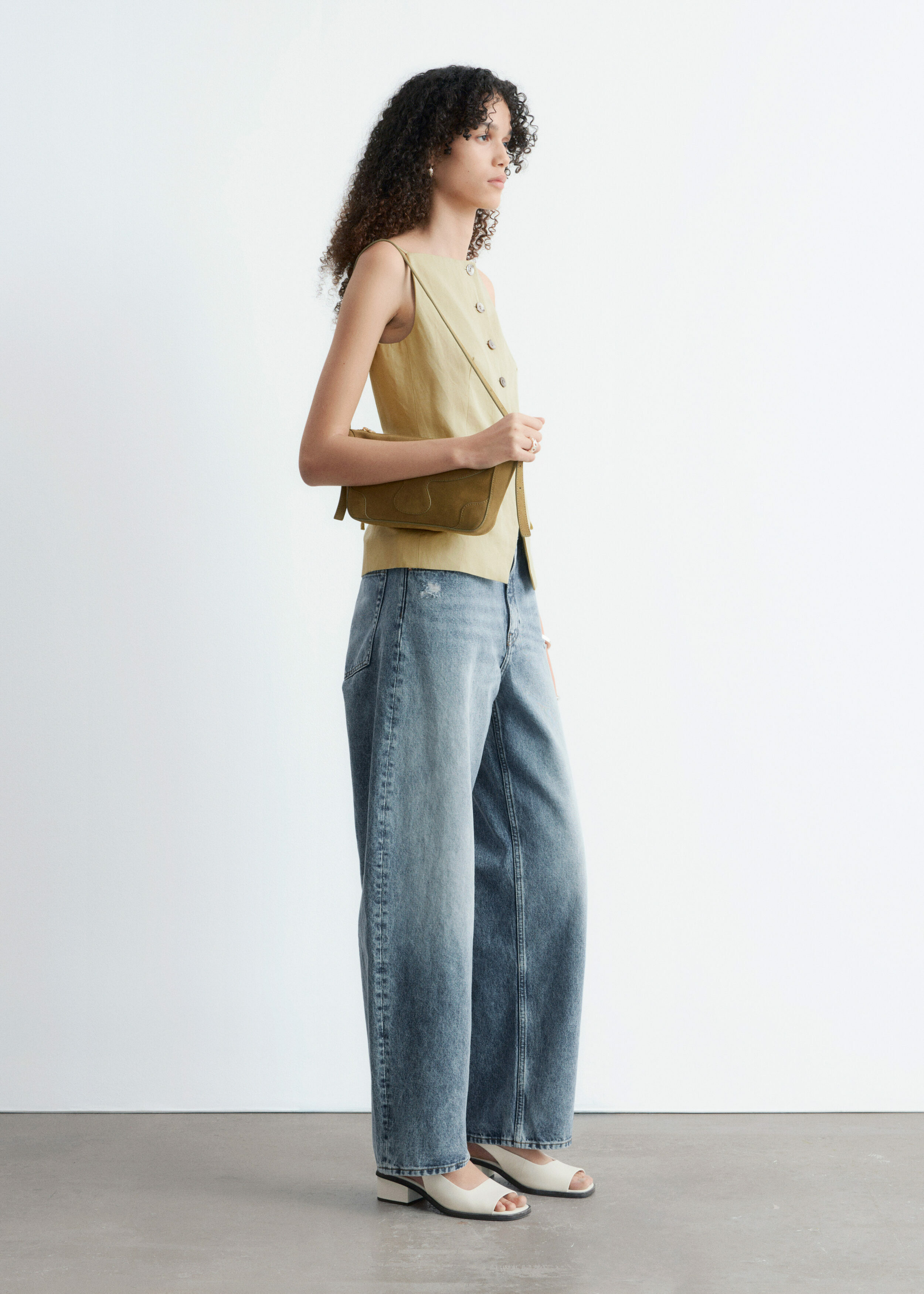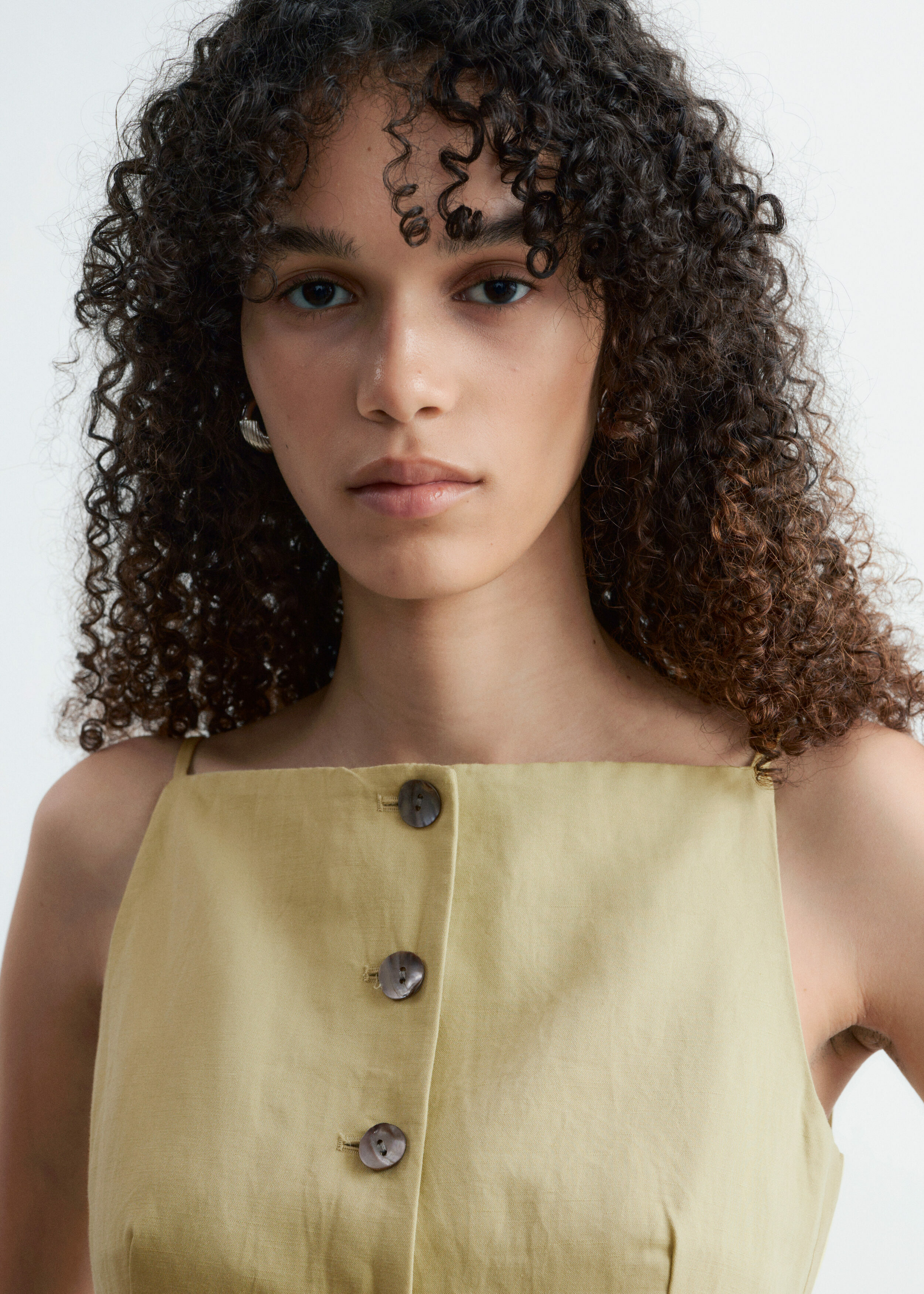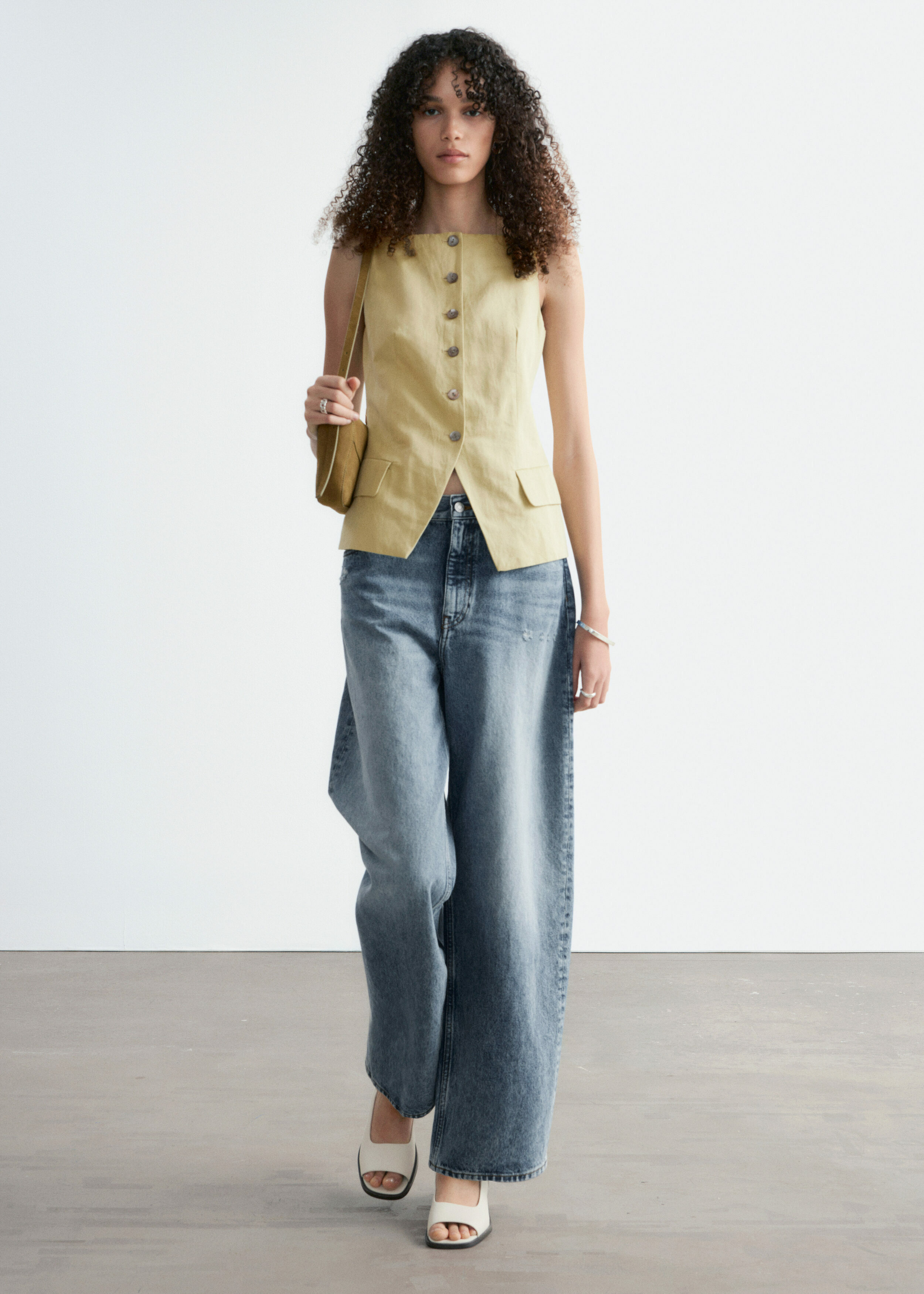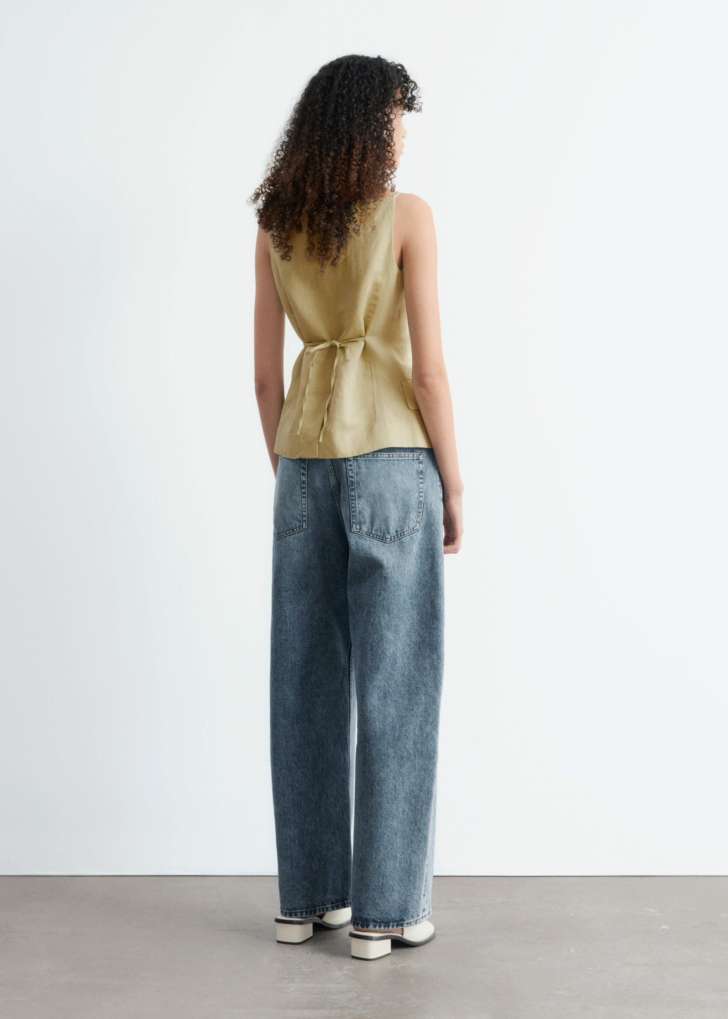 테일러드 룩의 베스트 탑이에요. 얇은 스트랩, 스퀘어 네크라인, 2개의 장식 플랩 포켓, 6개의 단추, 뒷면에 동일 소재의 타이가 특징이랍니다.