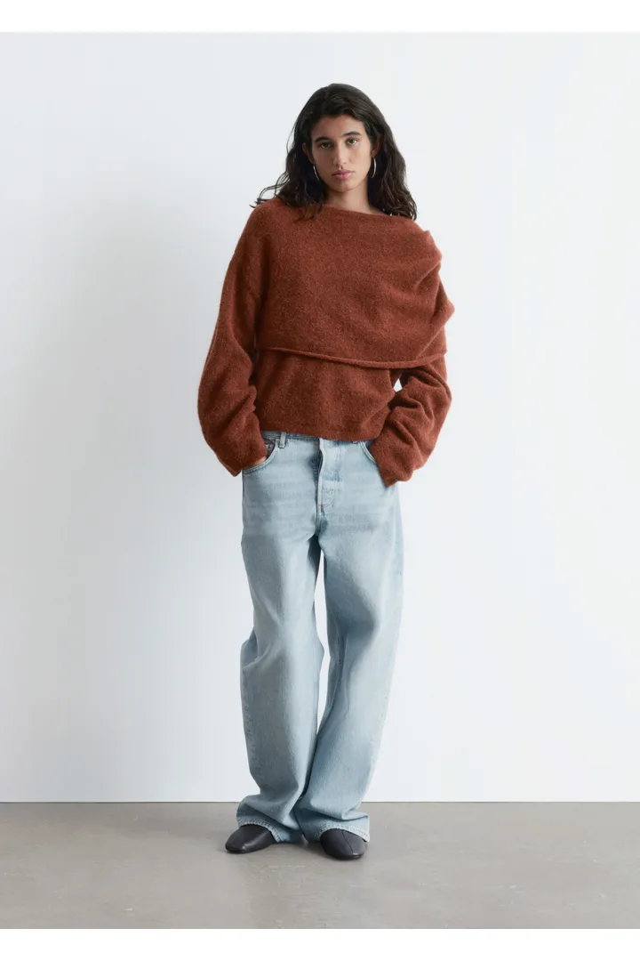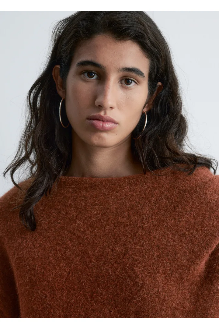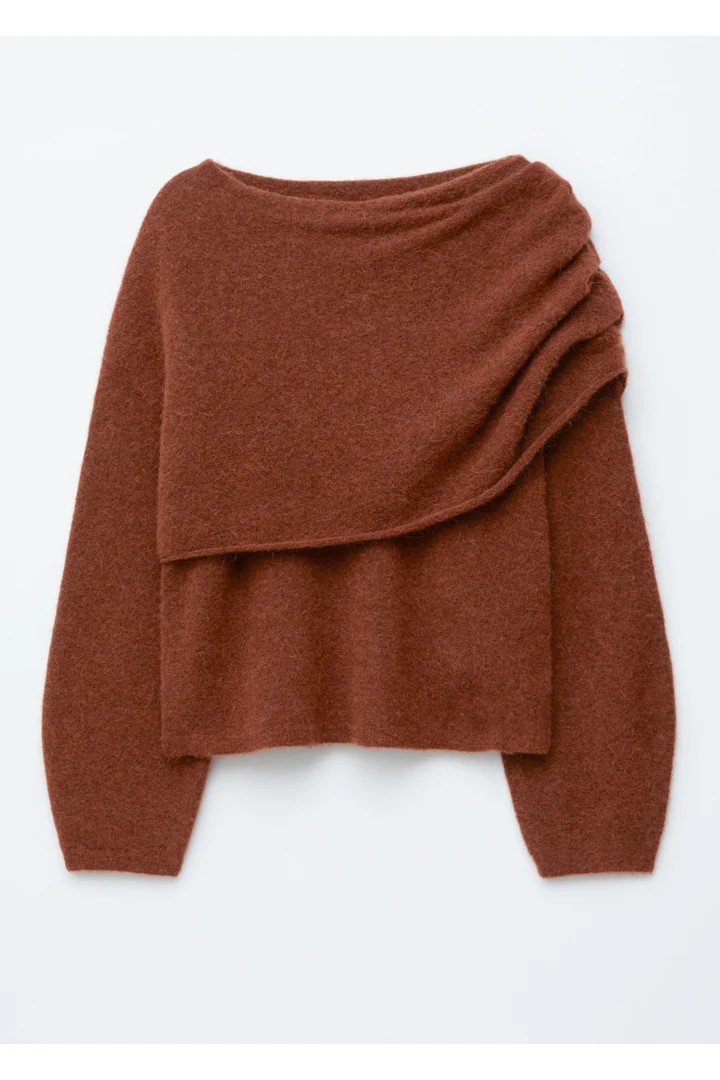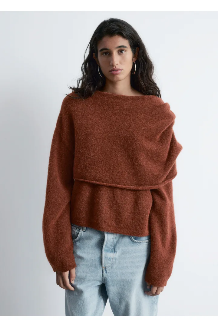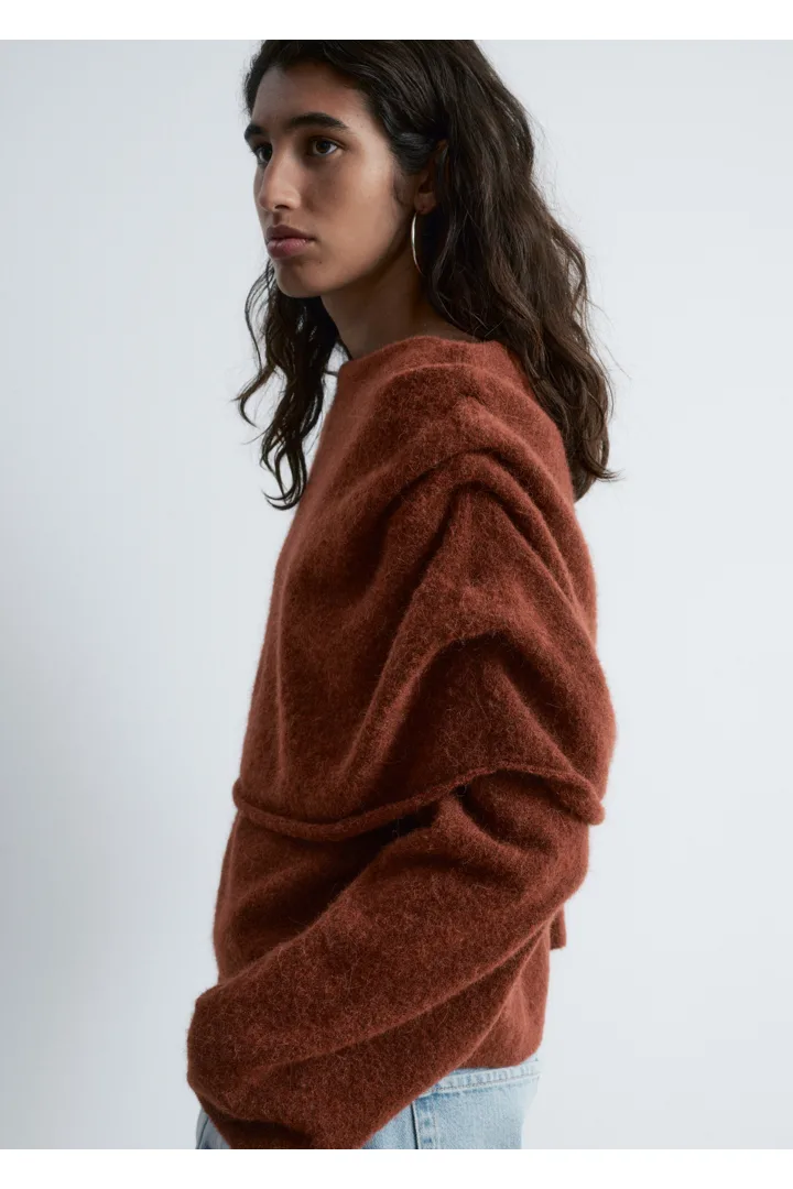 알파카 & 울 혼방 니트 소재의 스웨터예요. 루즈한 실루엣, 보트 넥, 코쿤 쉐입의 롱 슬리브, 그리고 숄더 위로 겹쳐지는 일체형 케이프가 특징이에요.