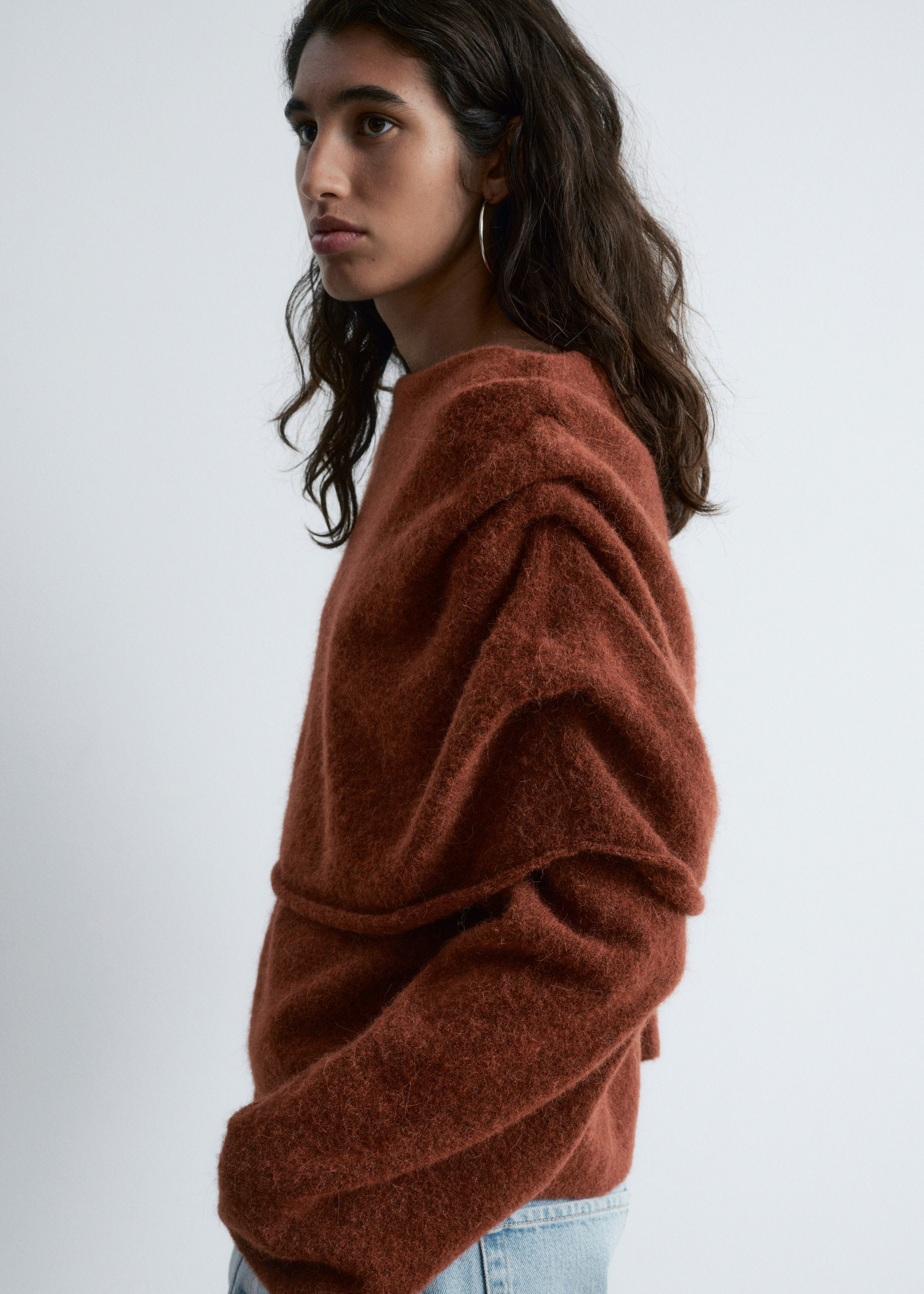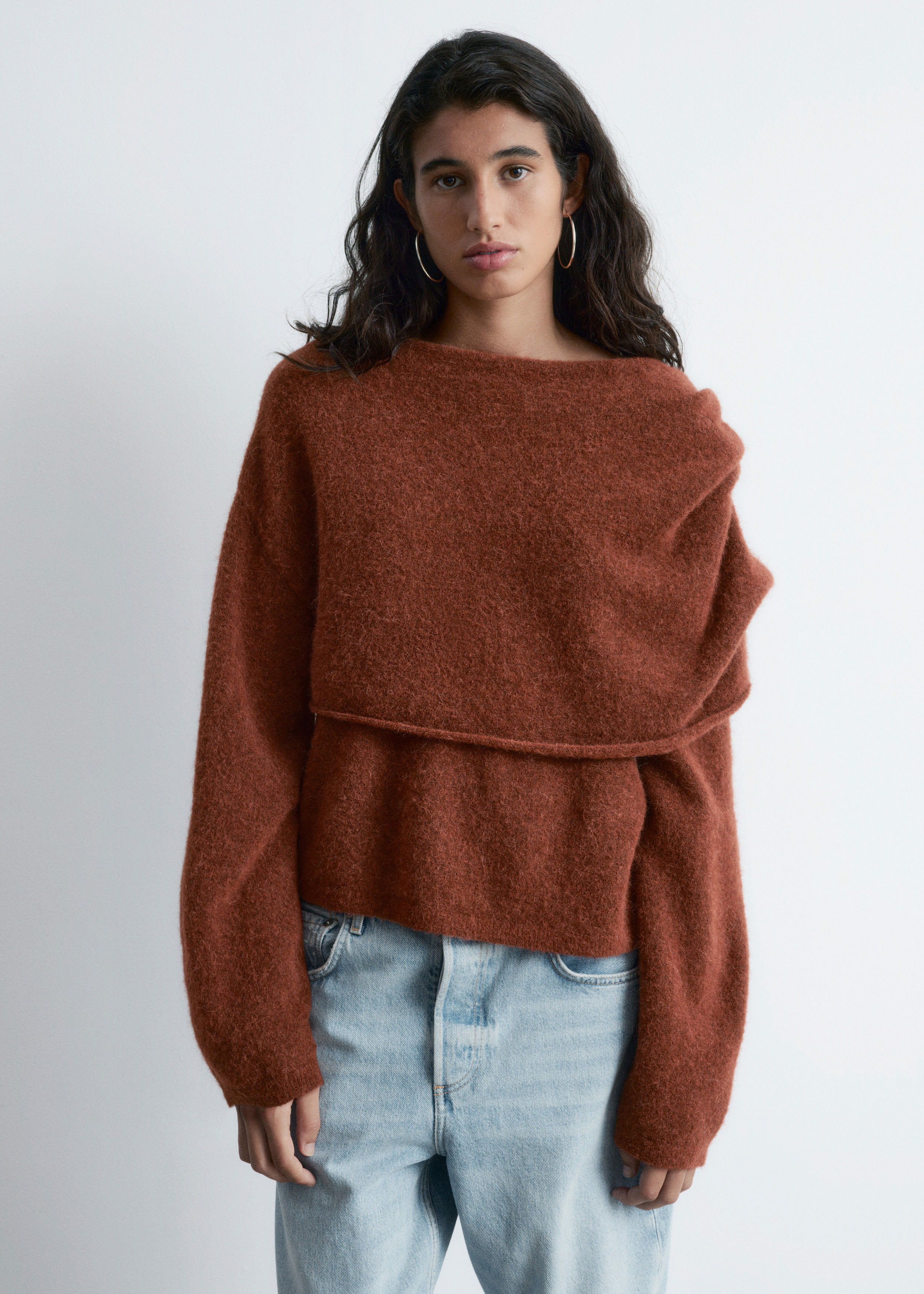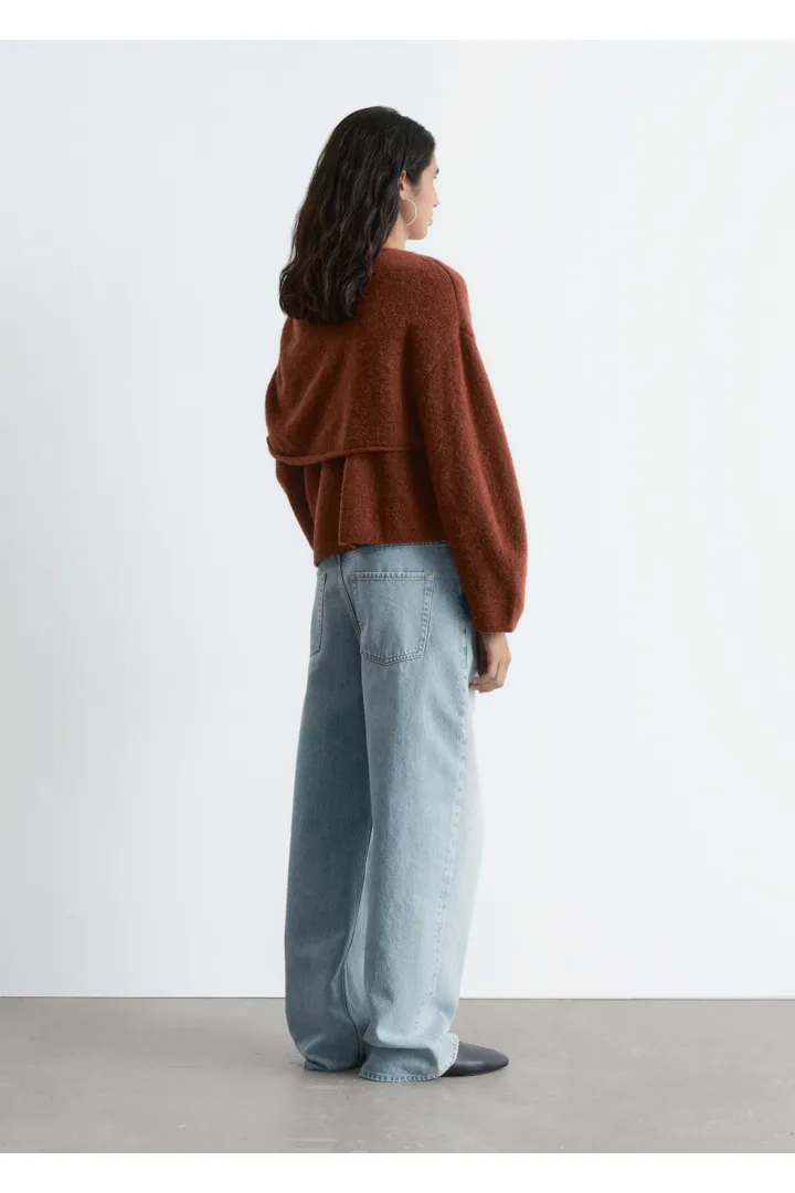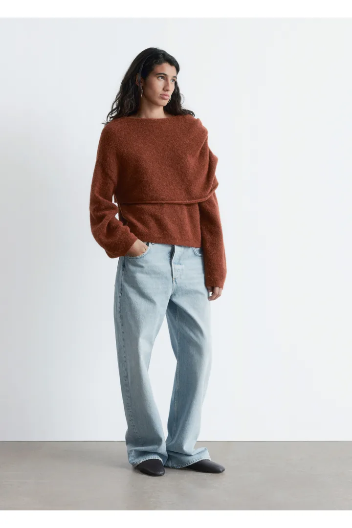 알파카 & 울 혼방 니트 소재의 스웨터예요. 루즈한 실루엣, 보트 넥, 코쿤 쉐입의 롱 슬리브, 그리고 숄더 위로 겹쳐지는 일체형 케이프가 특징이에요.