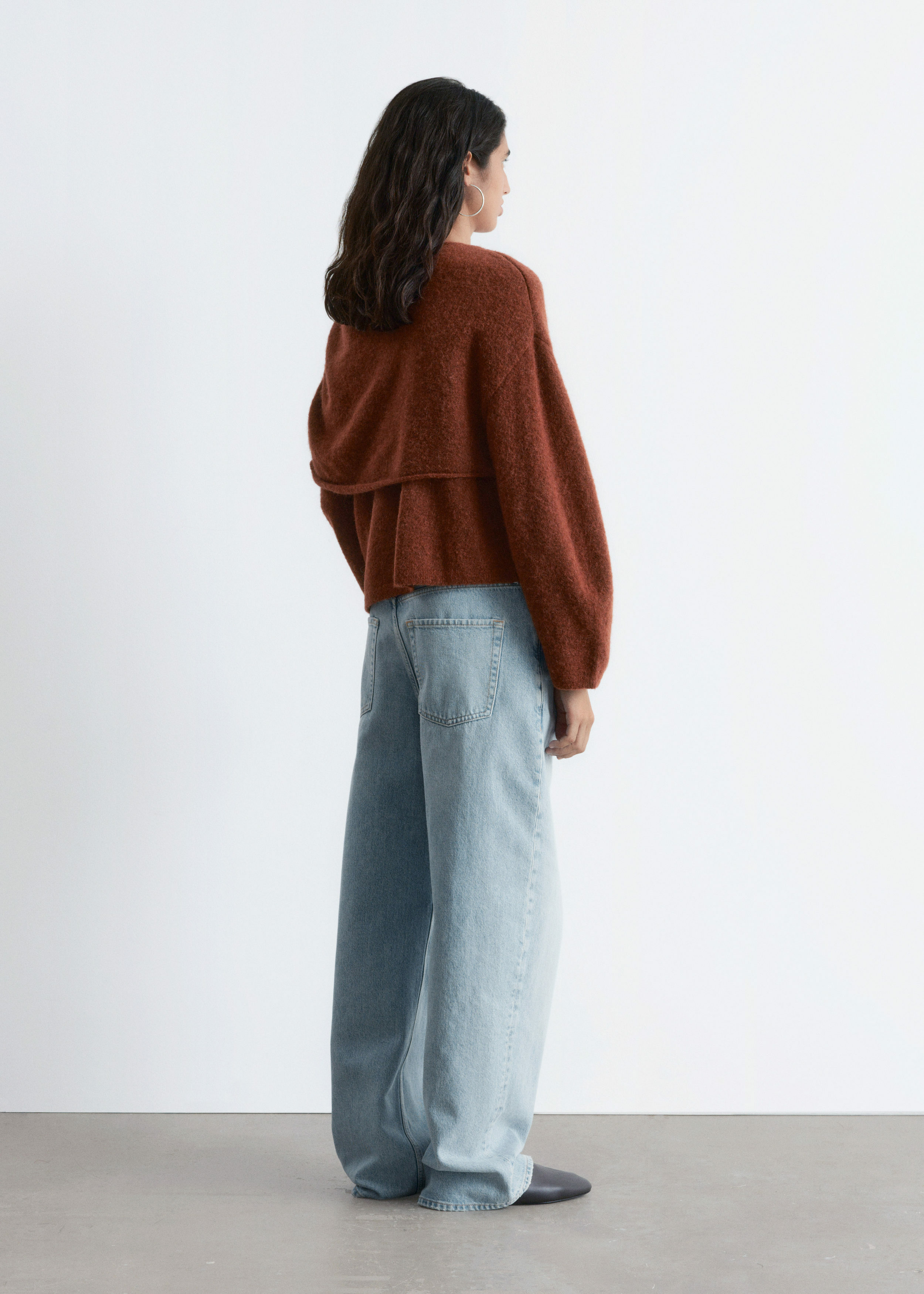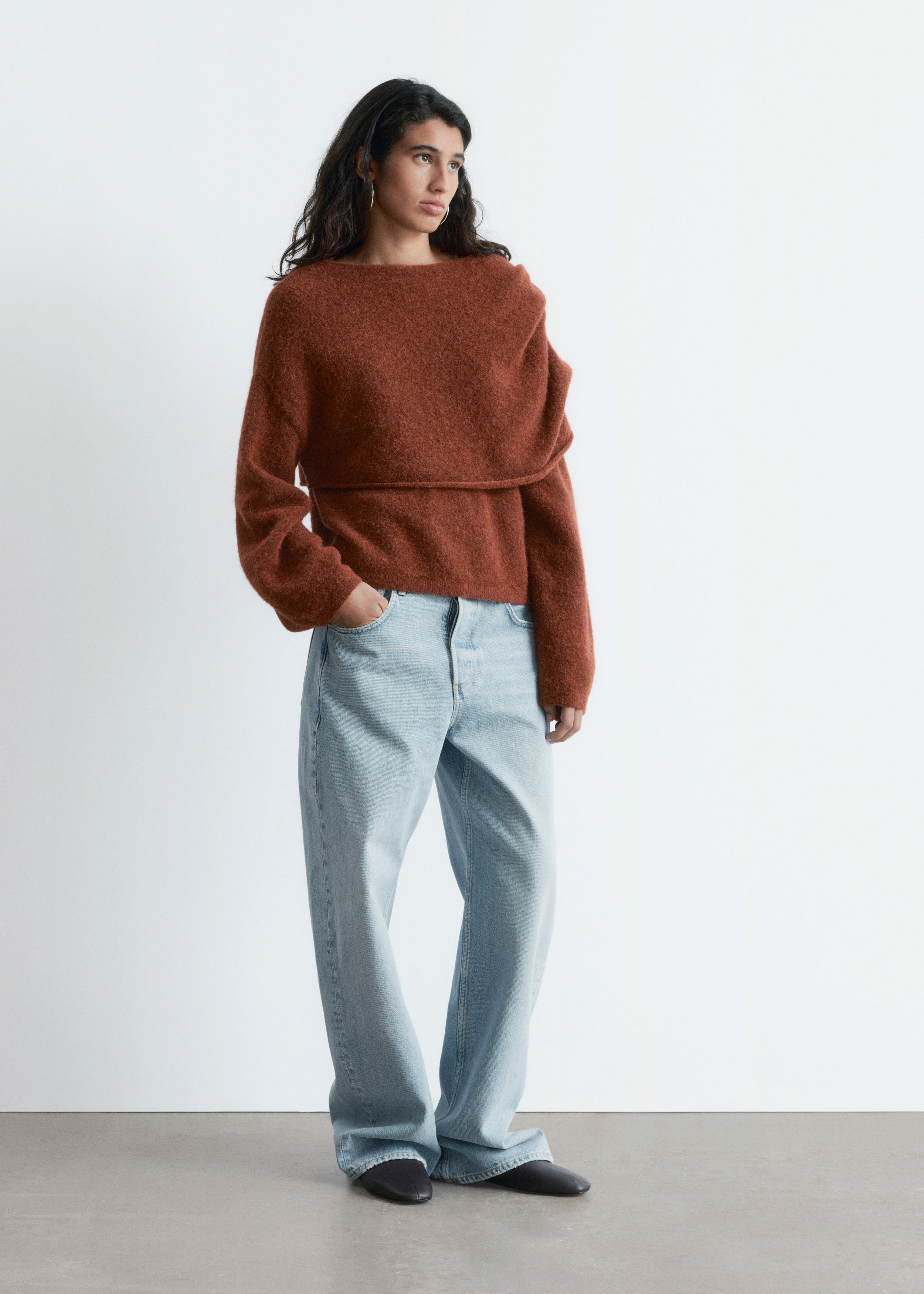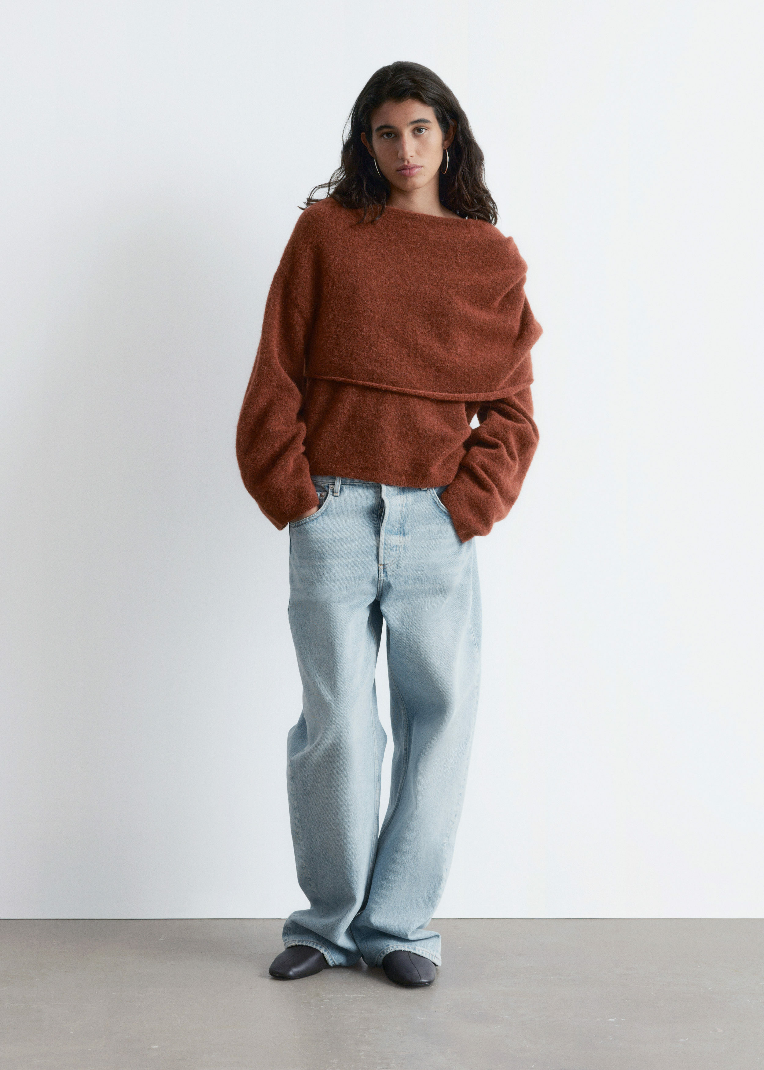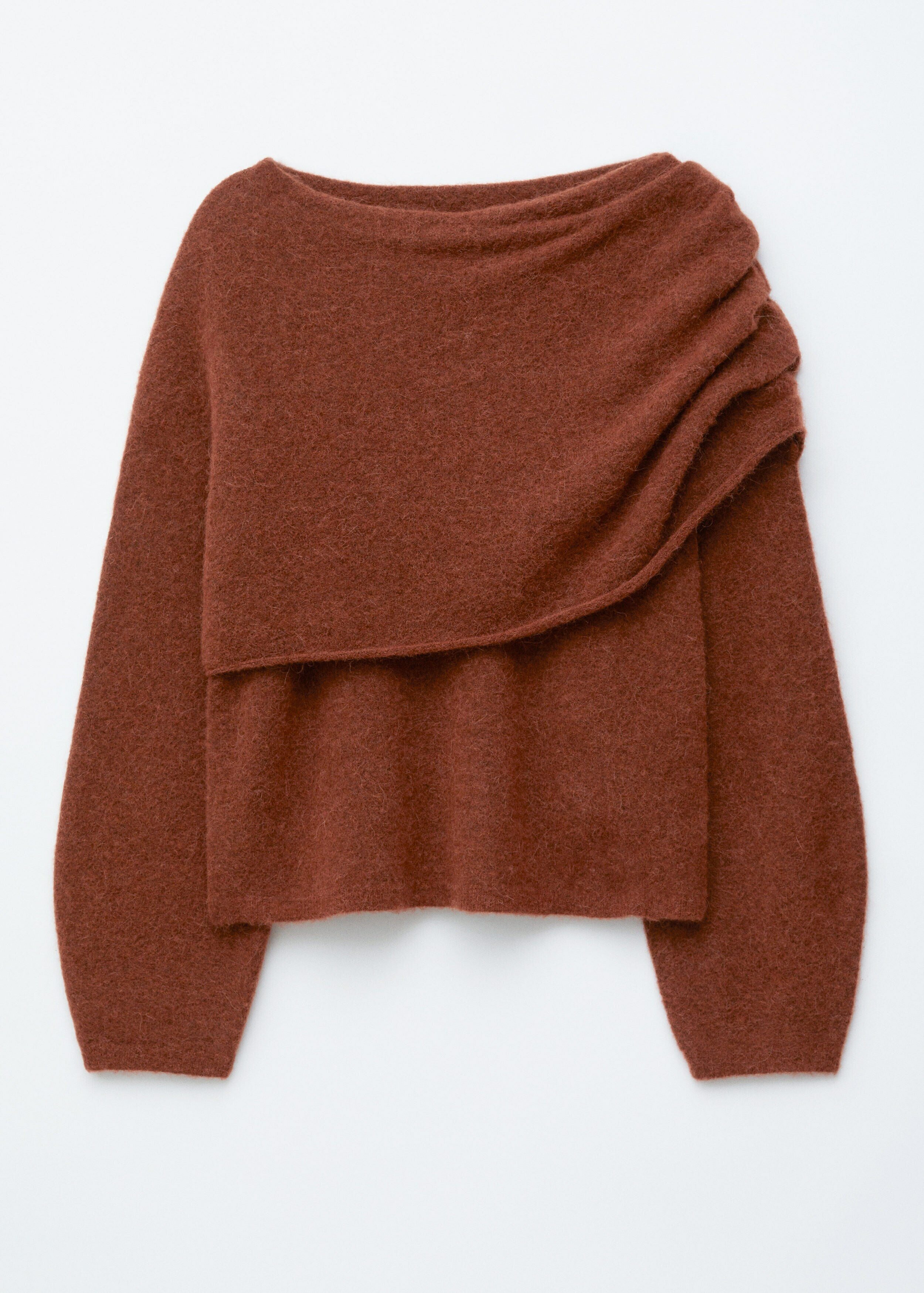 알파카 & 울 혼방 니트 소재의 스웨터예요. 루즈한 실루엣, 보트 넥, 코쿤 쉐입의 롱 슬리브, 그리고 숄더 위로 겹쳐지는 일체형 케이프가 특징이에요.