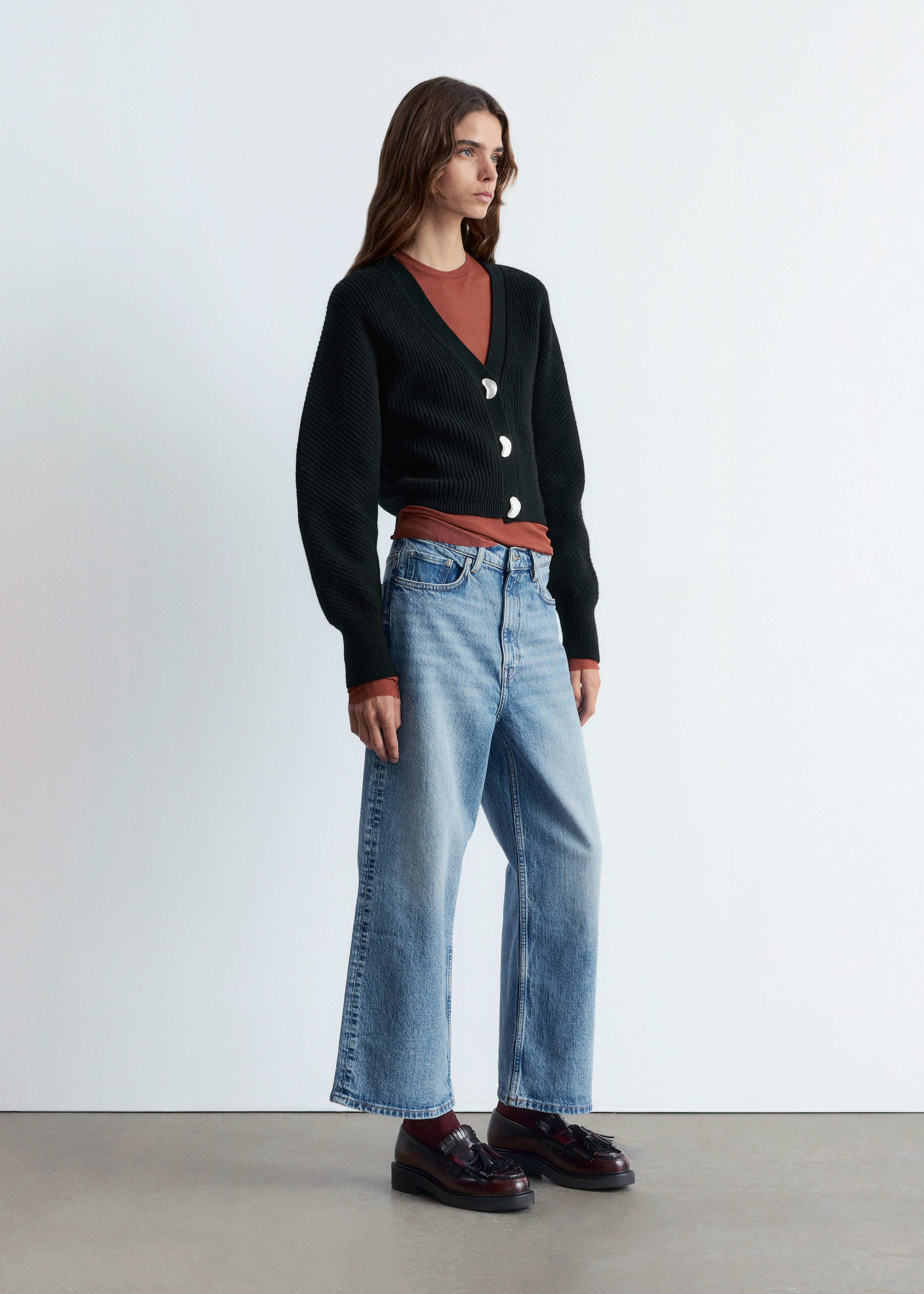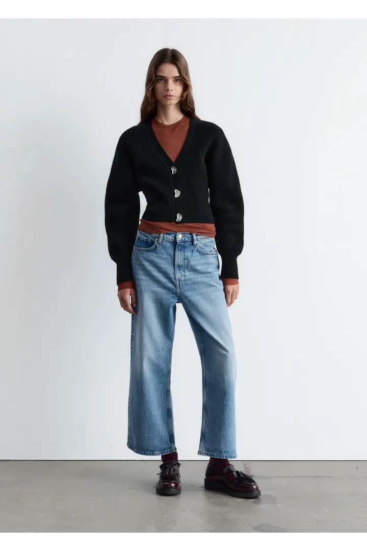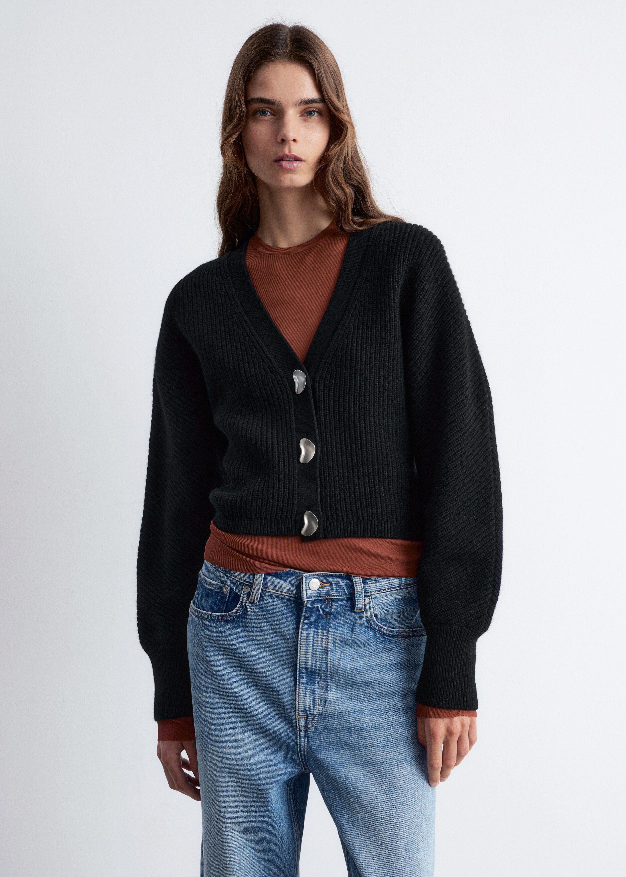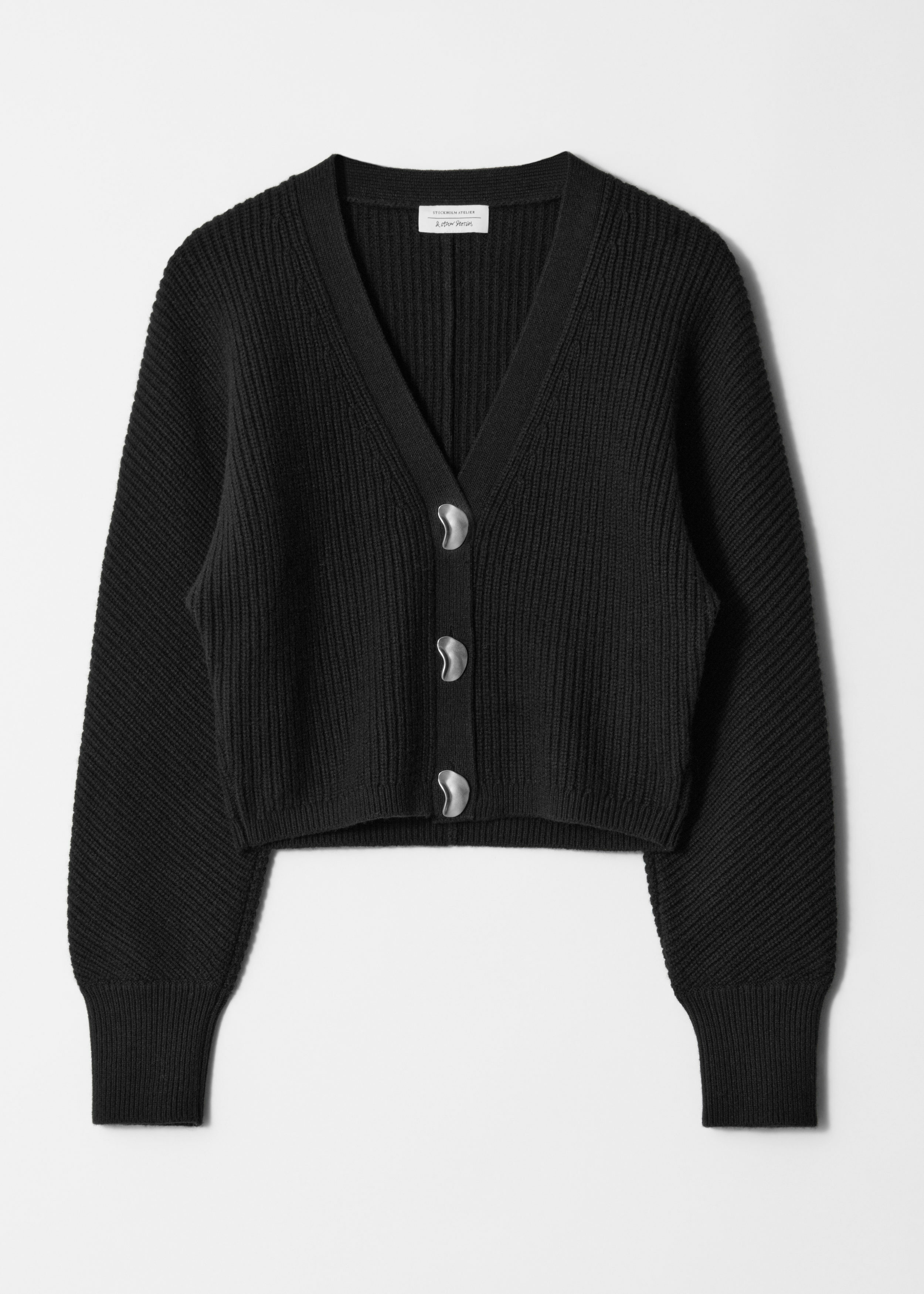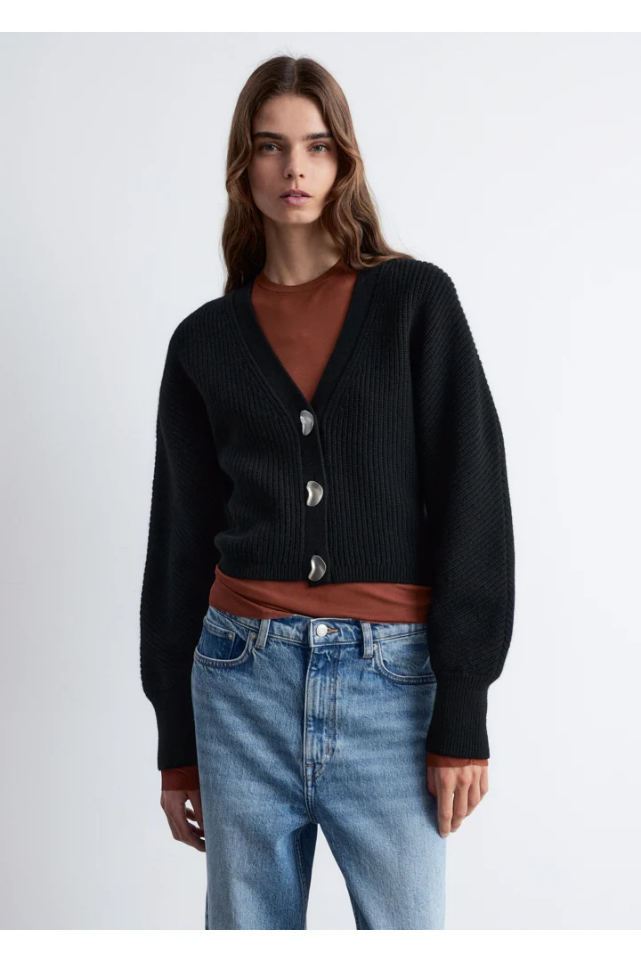 립 니트 가디건이에요. 유기적인 쉐입의 메탈 단추 3개가 자리해 있답니다.