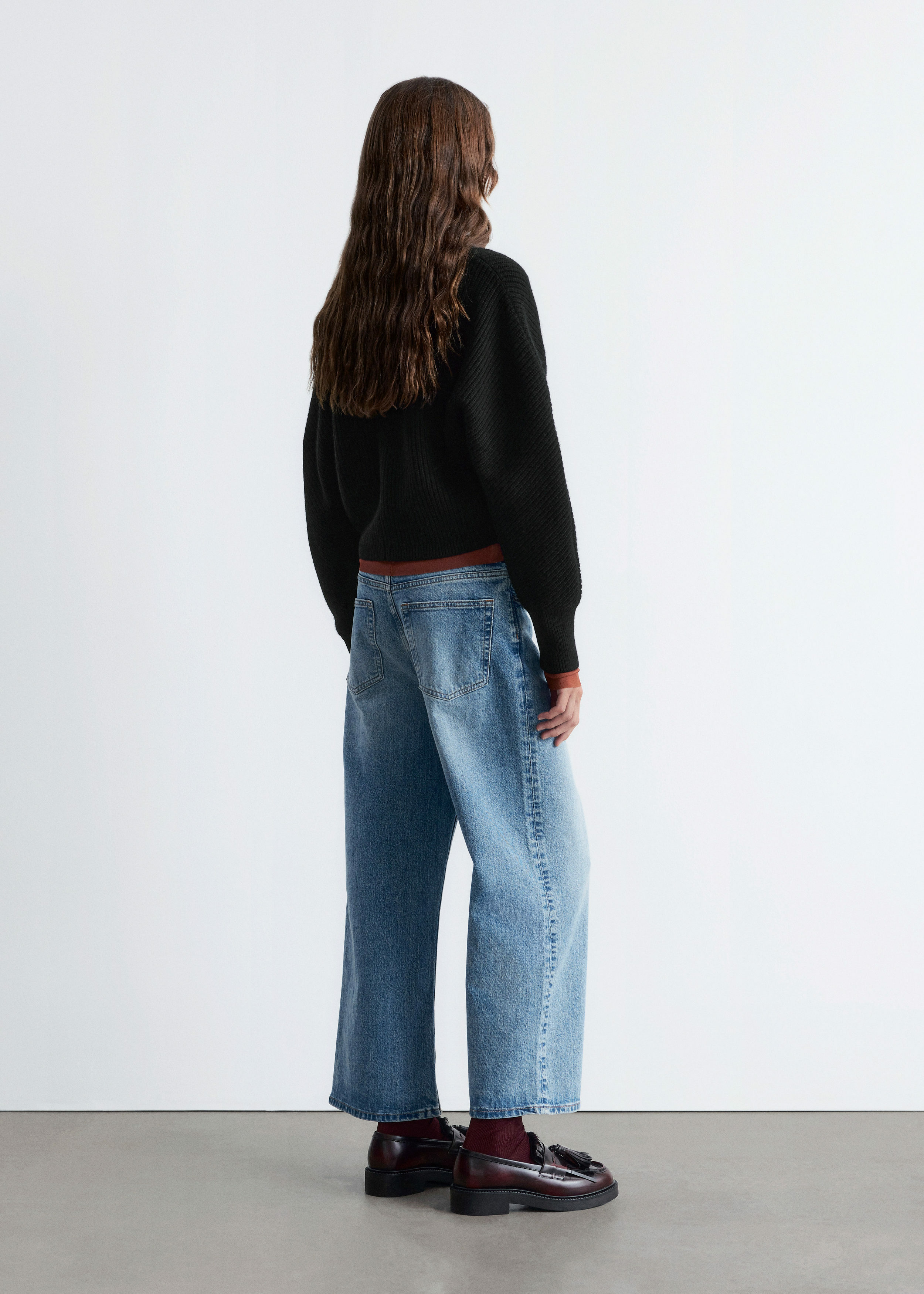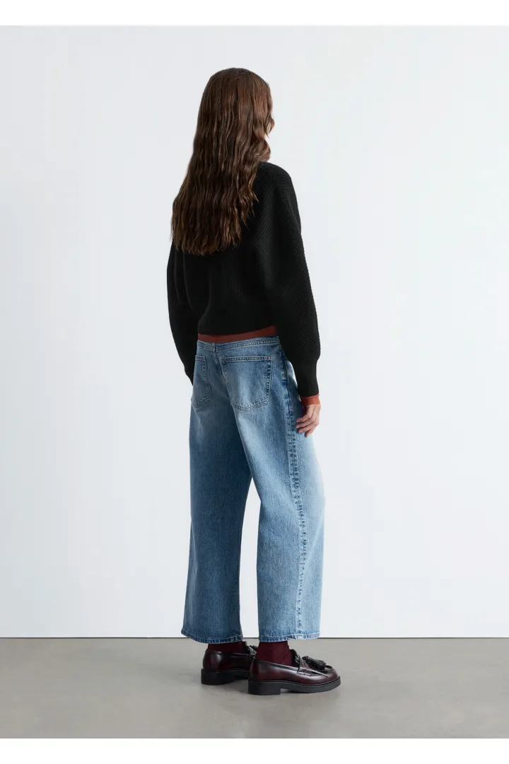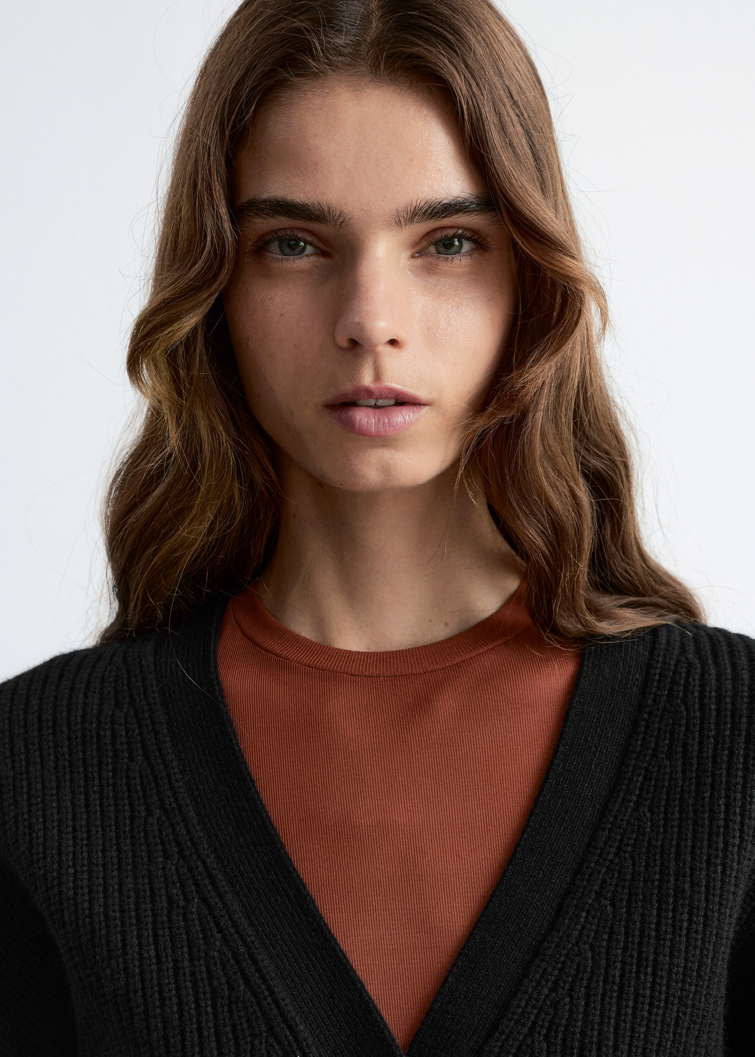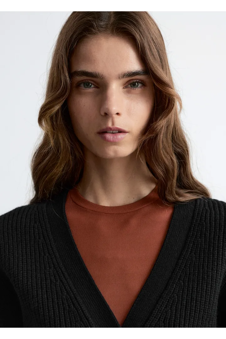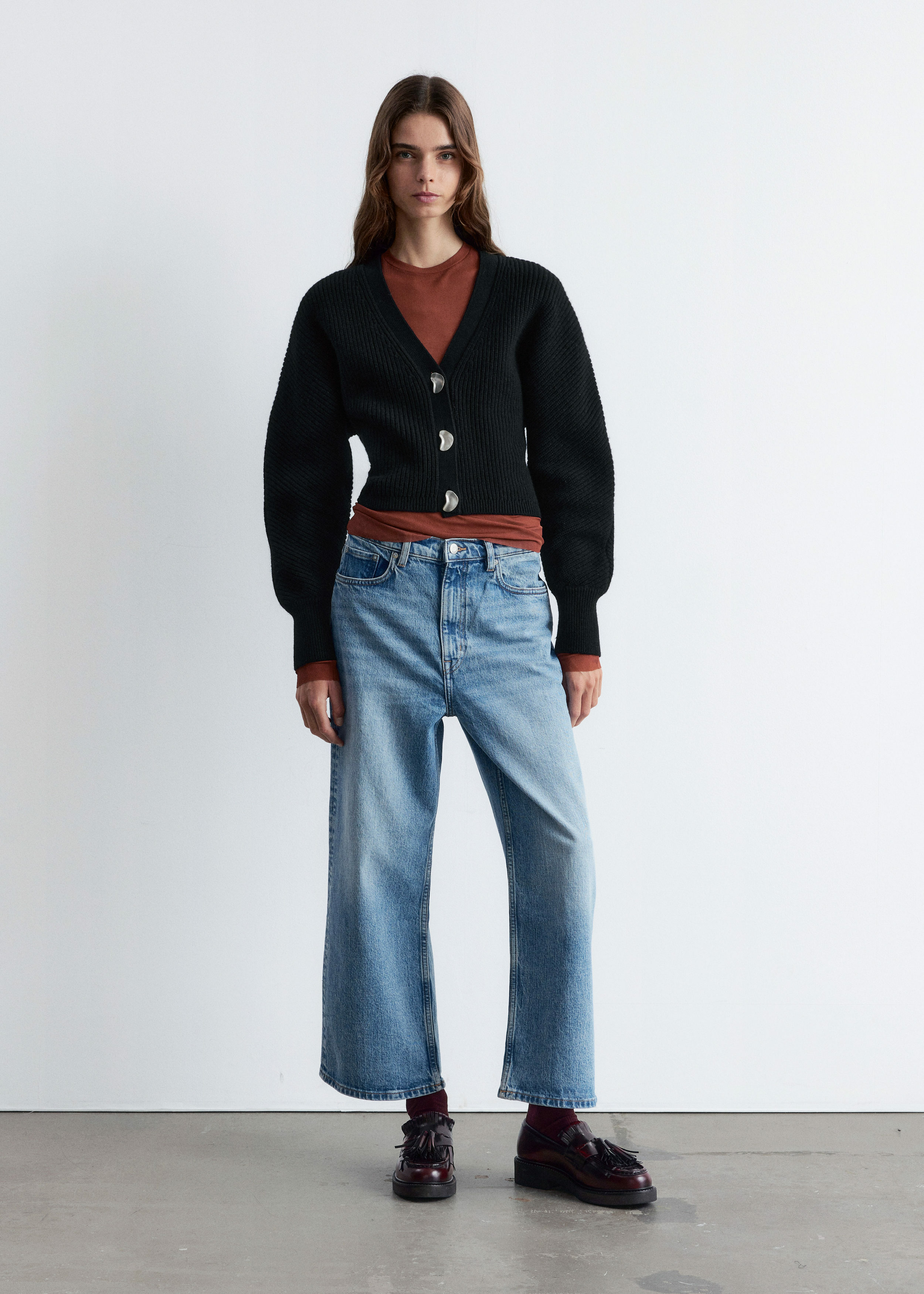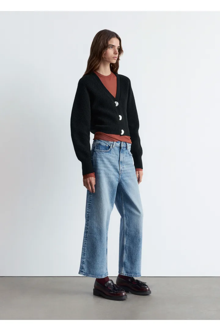 립 니트 가디건이에요. 유기적인 쉐입의 메탈 단추 3개가 자리해 있답니다.