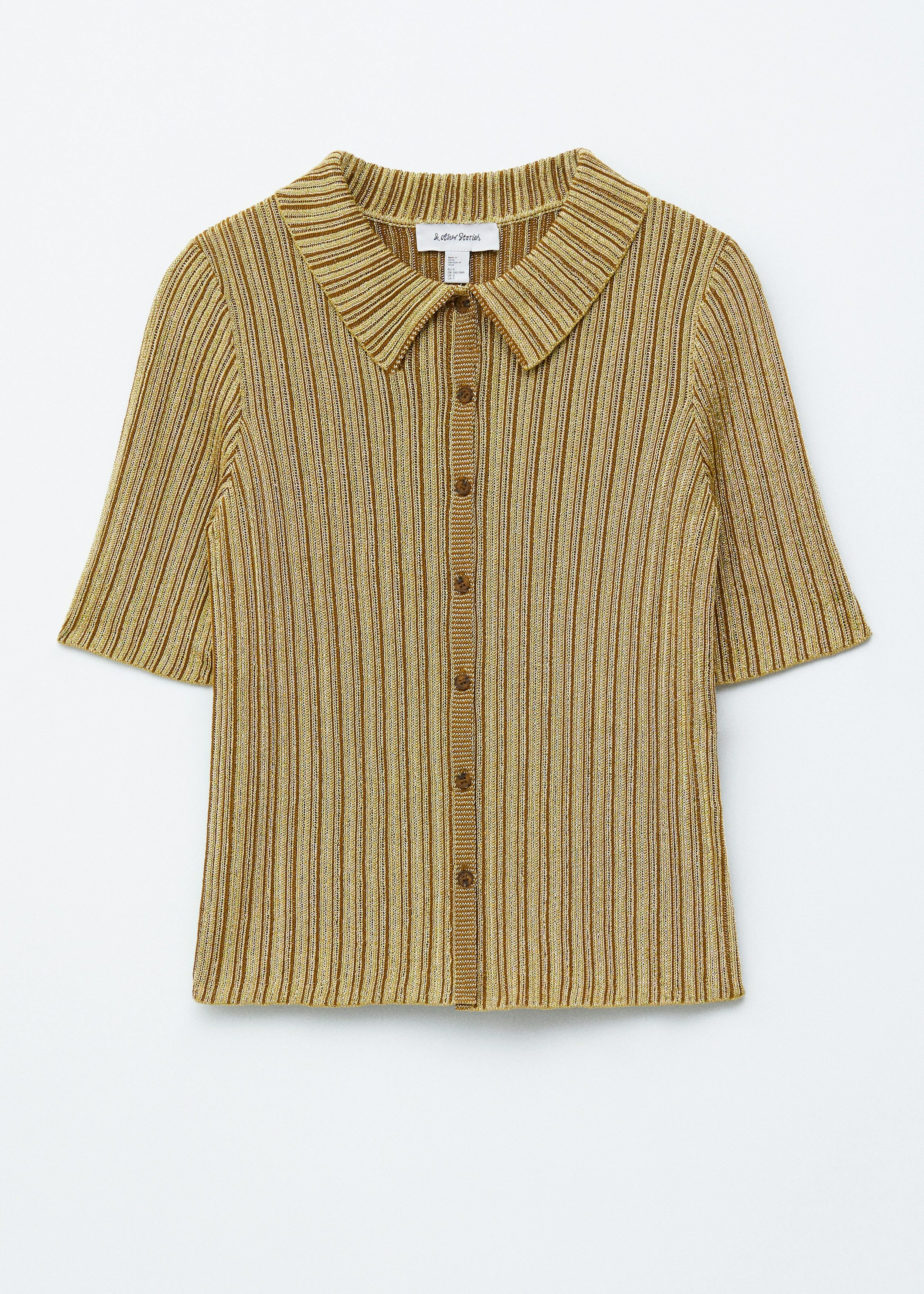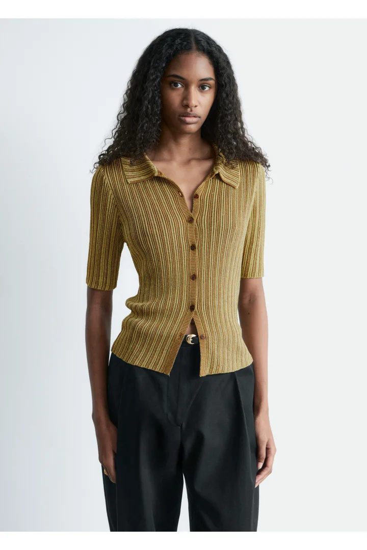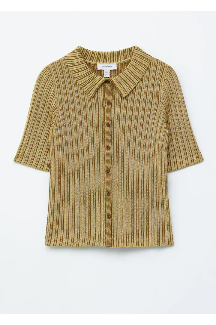 메탈릭 원사가 더해진 립 니트 루렉스 소재의 쇼트 슬리브 탑이에요. 핏 되는 실루엣, 섬세한 카라, 앞면의 단추가 특징이랍니다.