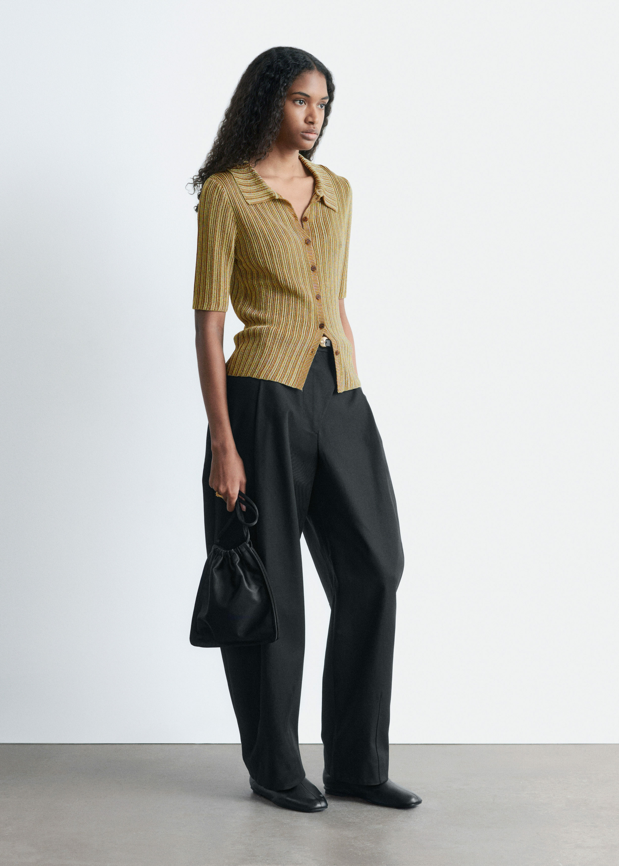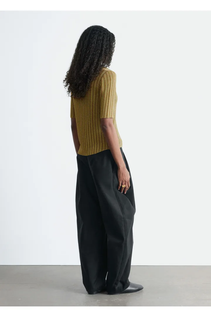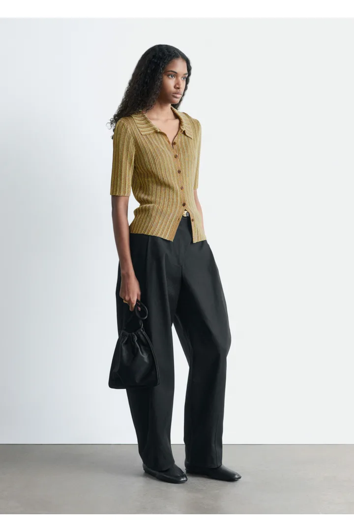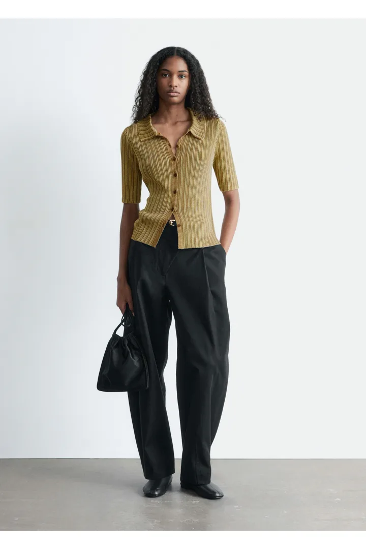 메탈릭 원사가 더해진 립 니트 루렉스 소재의 쇼트 슬리브 탑이에요. 핏 되는 실루엣, 섬세한 카라, 앞면의 단추가 특징이랍니다.