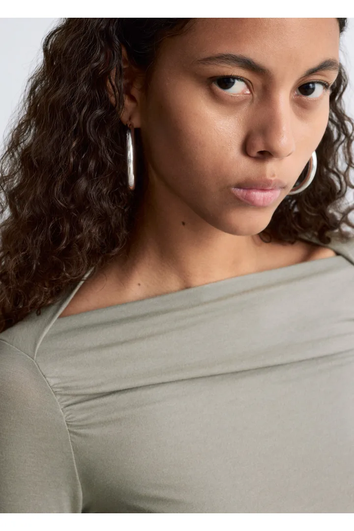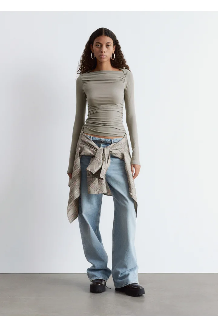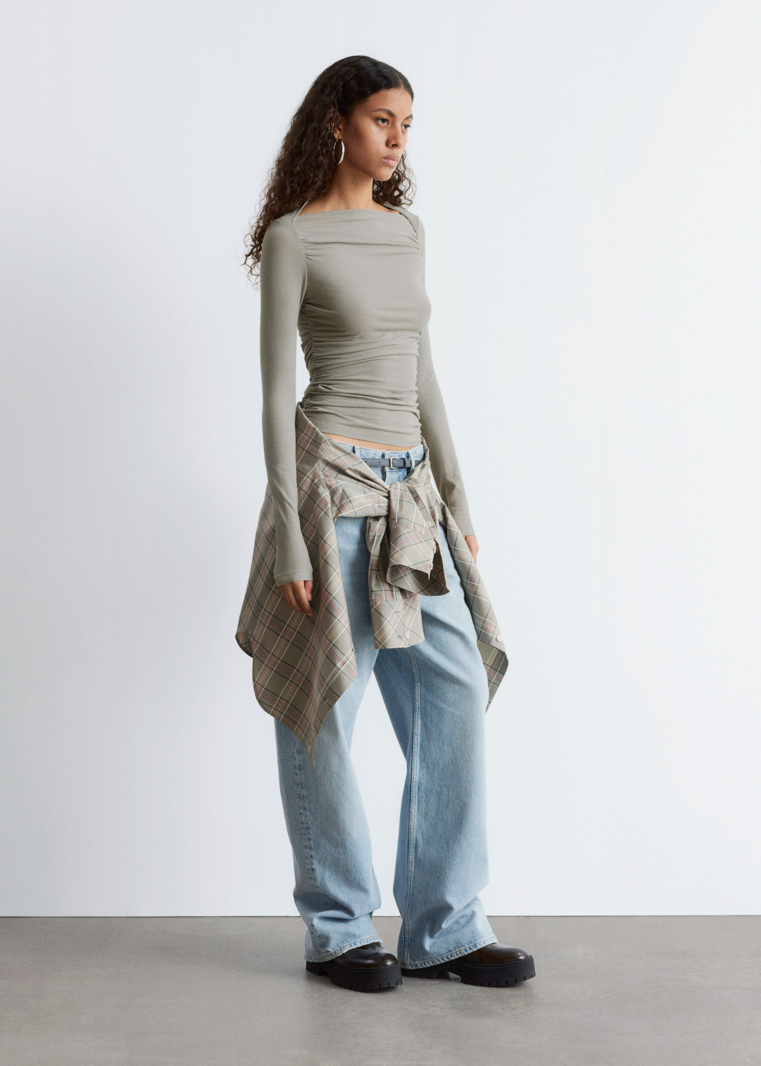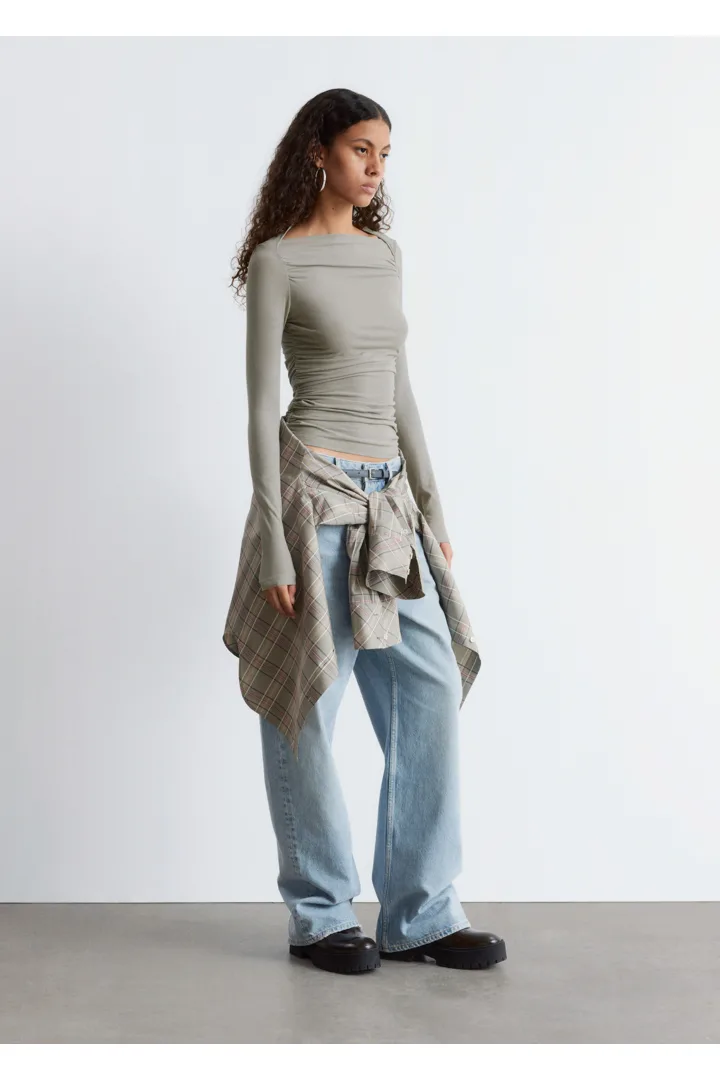 부드럽고 신축성 좋은 저지 소재로 탄생한 롱 슬리브 탑이에요. 슬림한 실루엣, 그리고 보트 넥과 허리라인의 주름 디테일이 특징이에요.