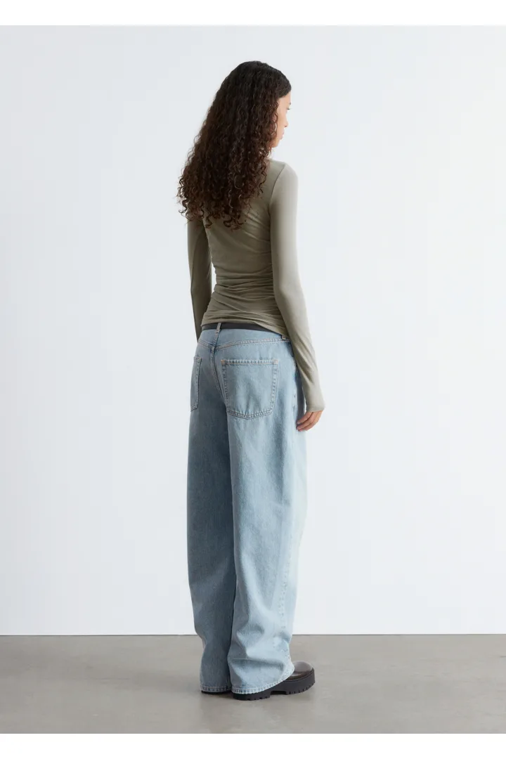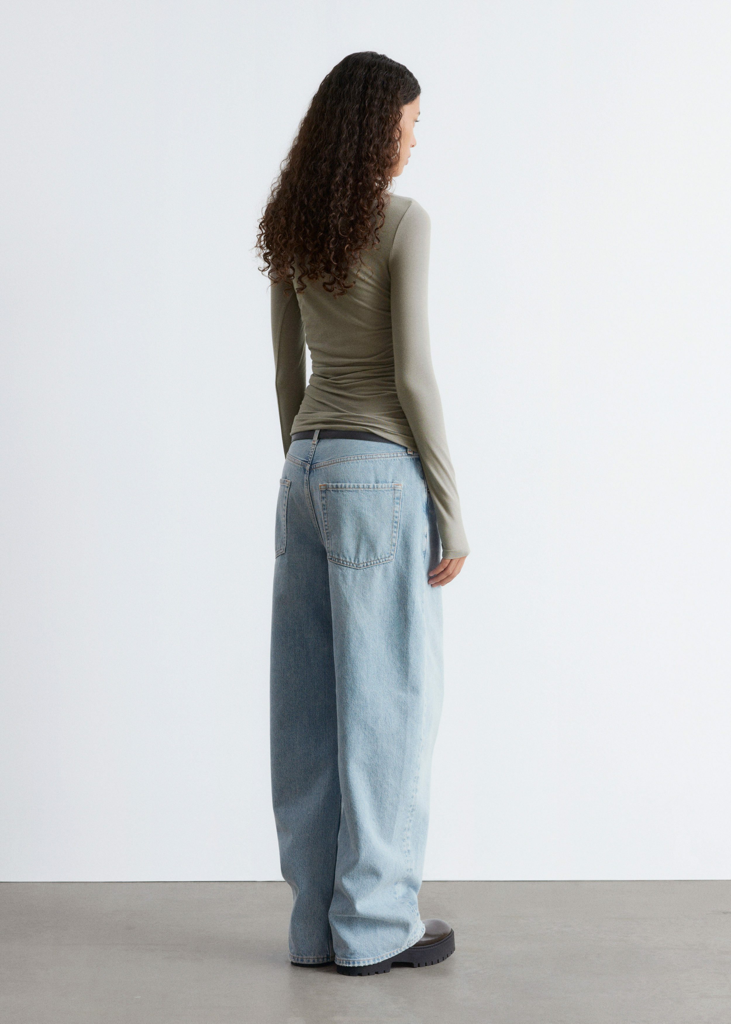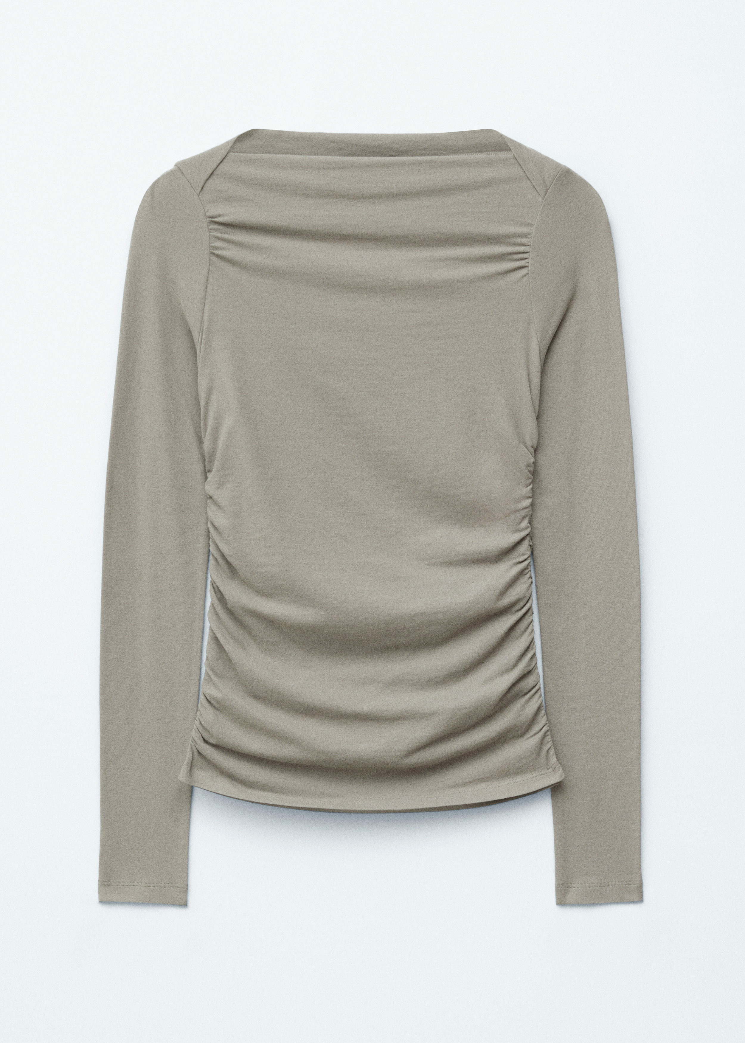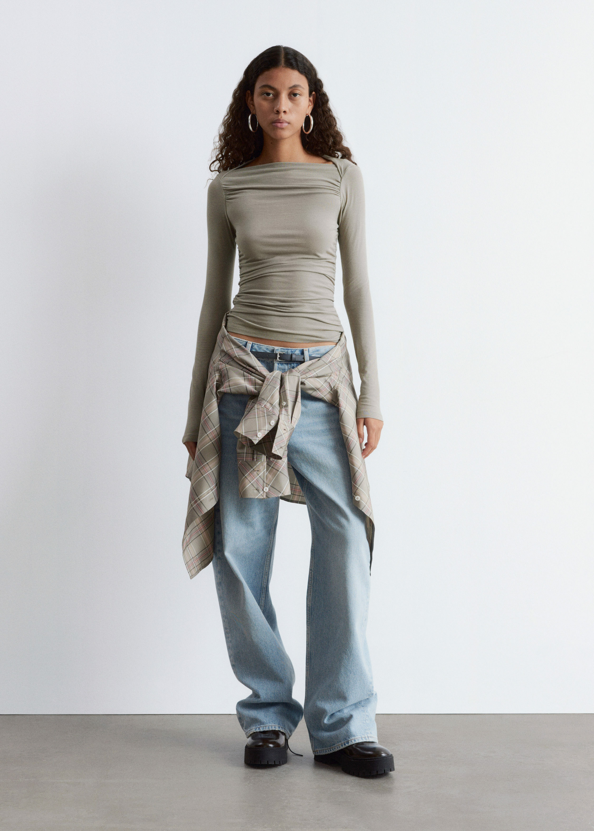 부드럽고 신축성 좋은 저지 소재로 탄생한 롱 슬리브 탑이에요. 슬림한 실루엣, 그리고 보트 넥과 허리라인의 주름 디테일이 특징이에요.