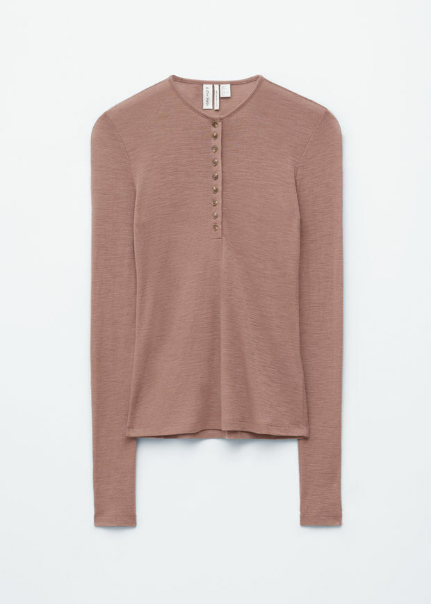 쉬어한 울 저지 소재로 제작된 이 긴 소매 상의는 둥근 네크라인과 단추로 여미는 하프 플래킷이 특징입니다.