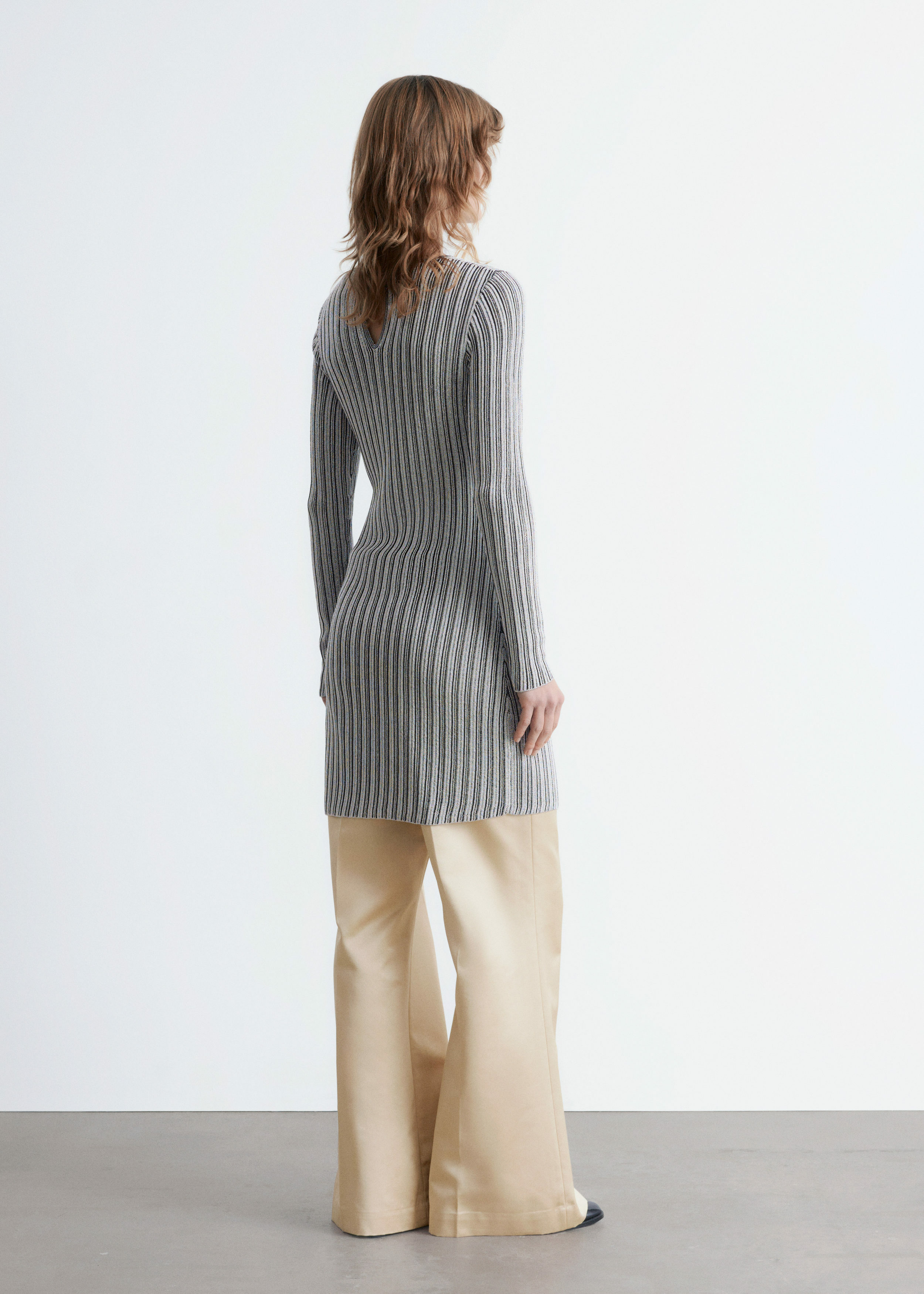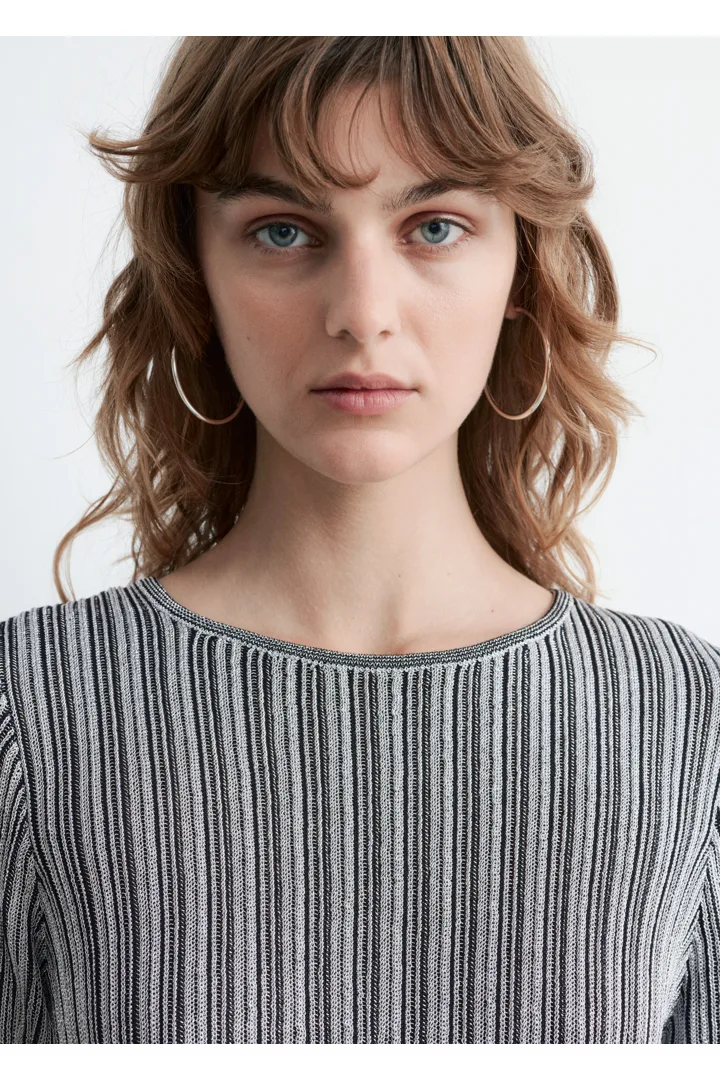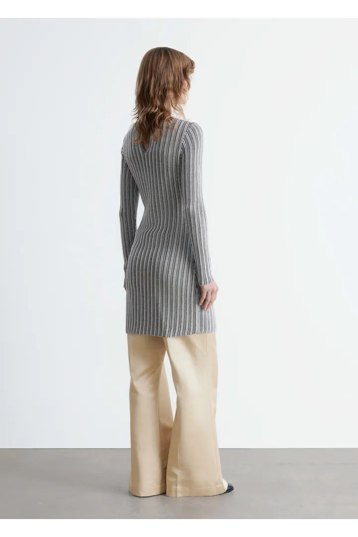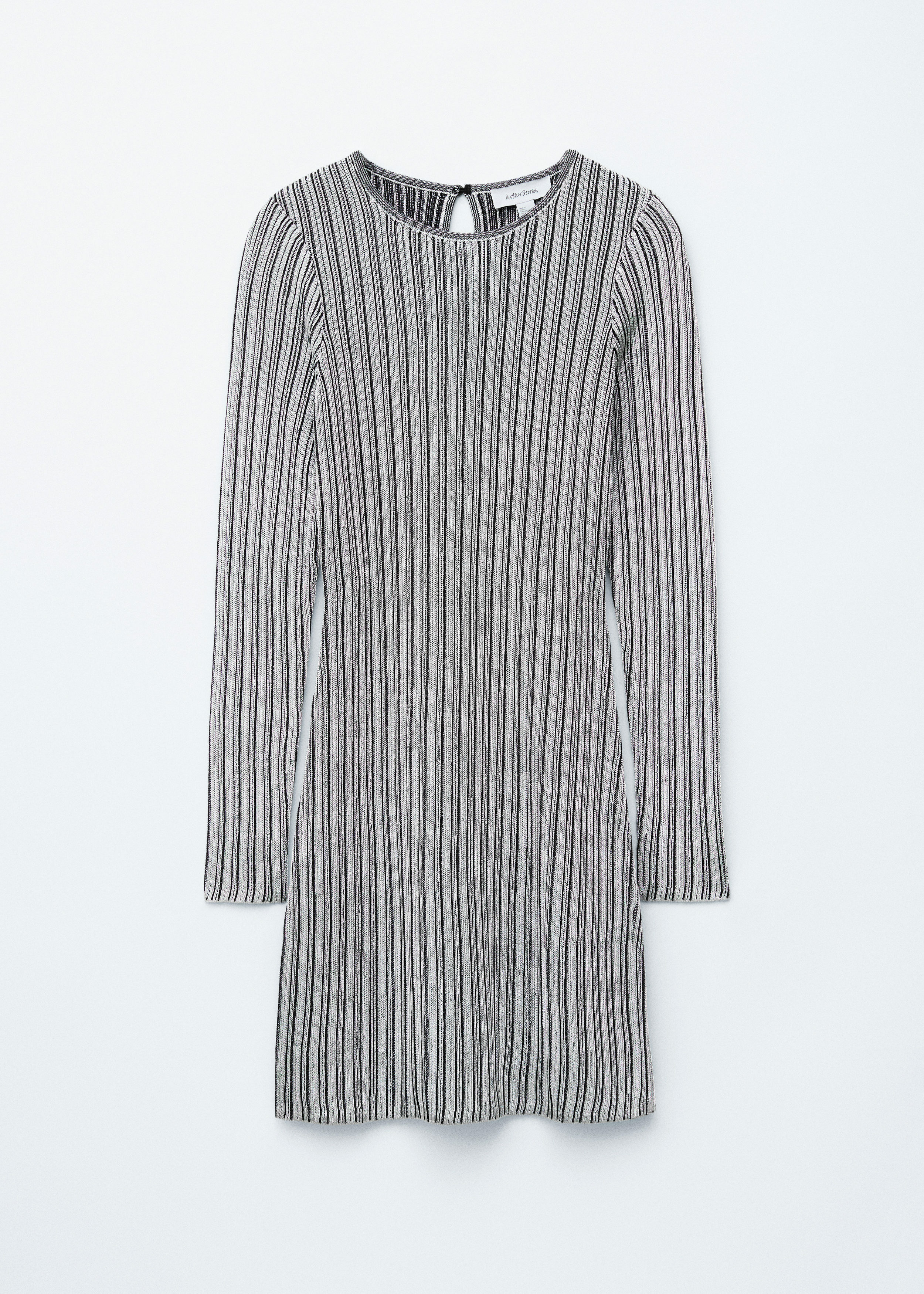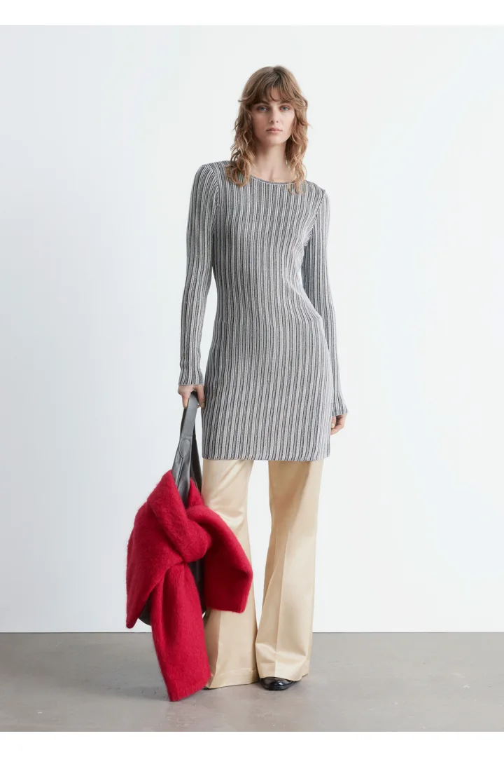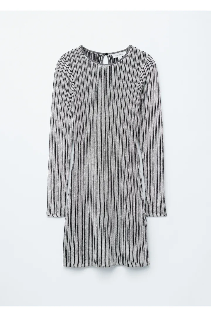 메탈릭 원사가 더해진 립 니트 소재로 탄생한 미니 드레스예요. 핏 되는 실루엣, 라운드 네크라인, 롱 슬리브가 특징이며, 네크라인에는 키홀 단추가 자리해 있어요.