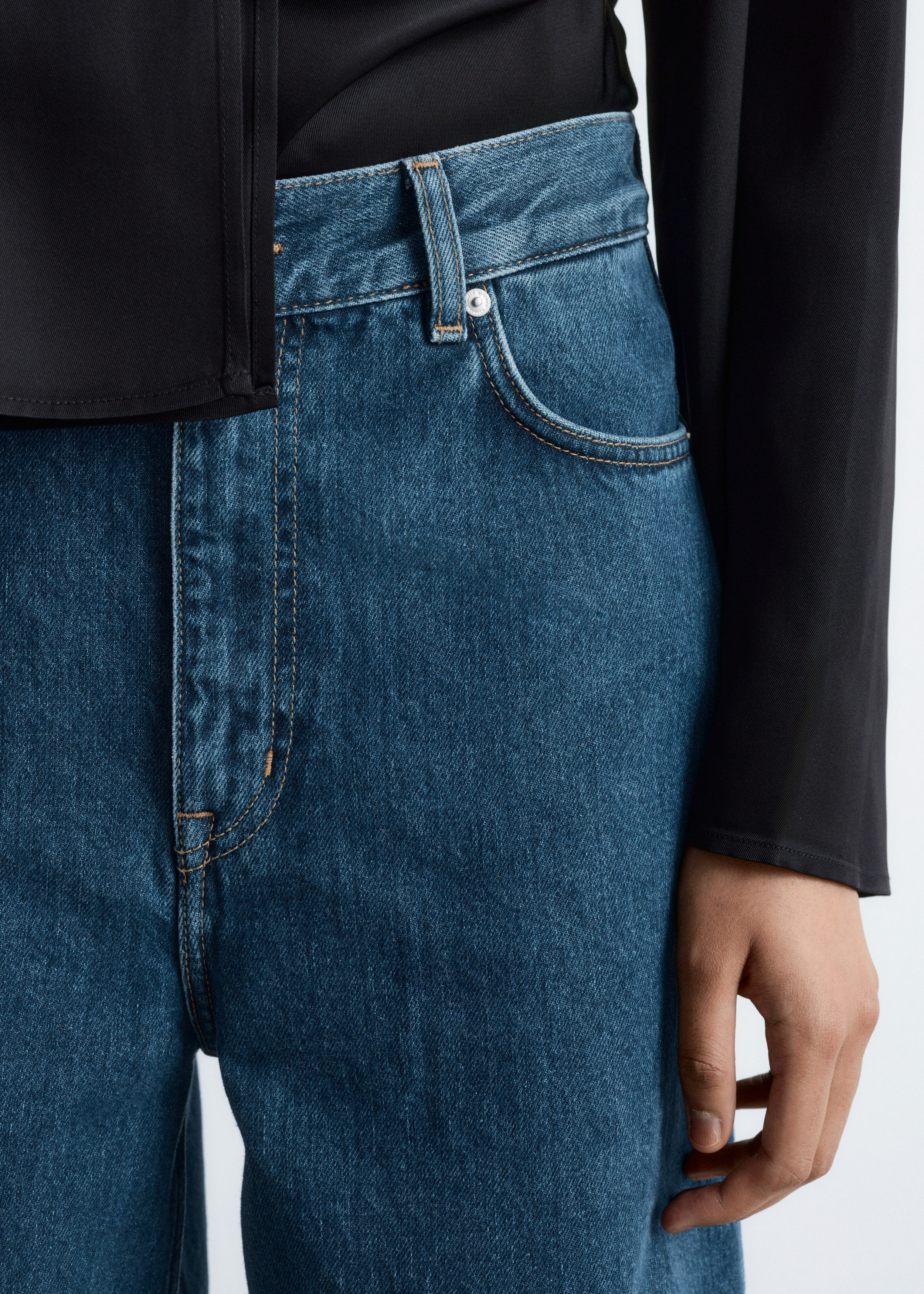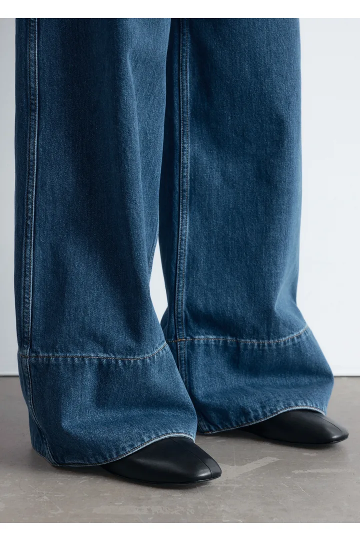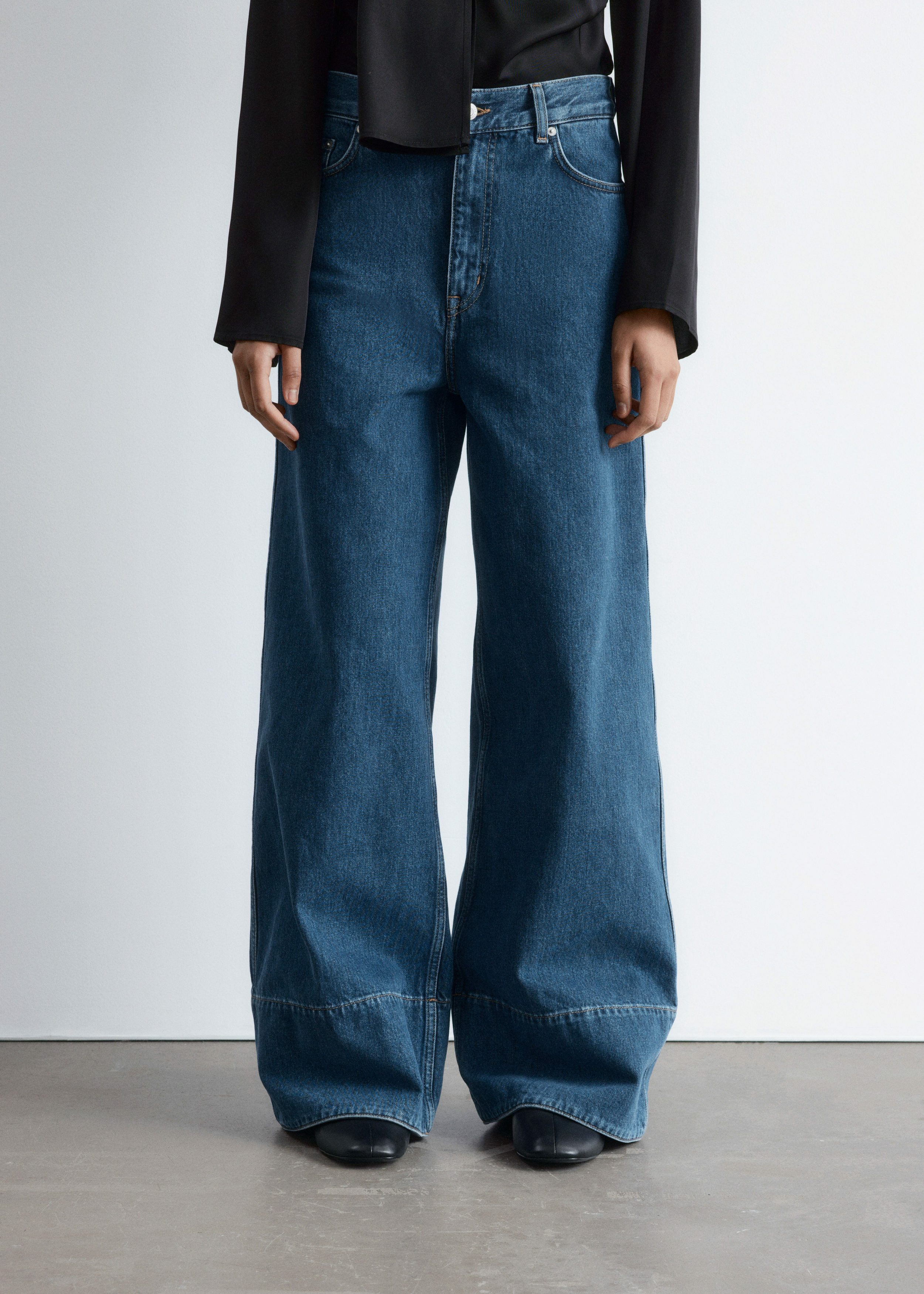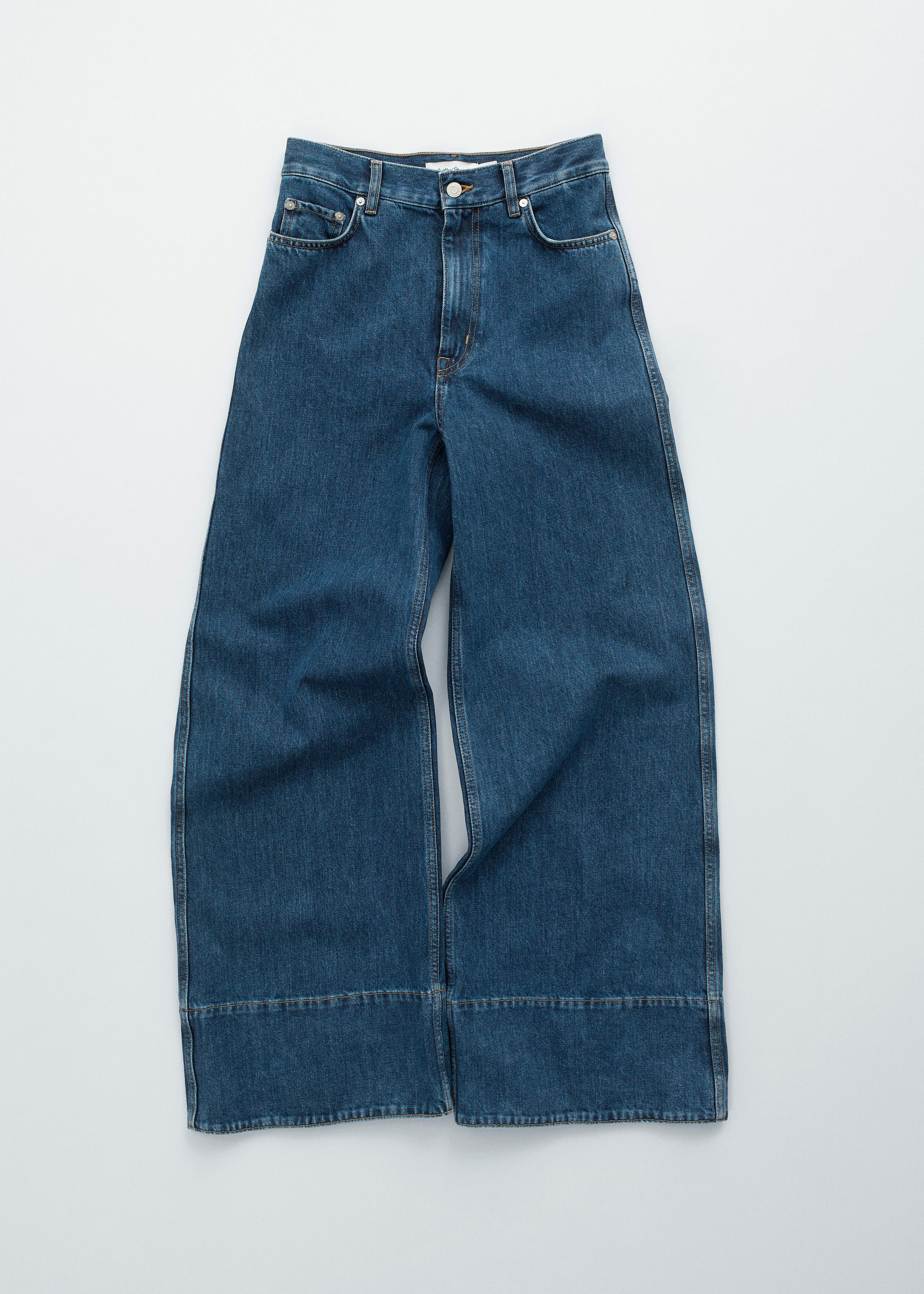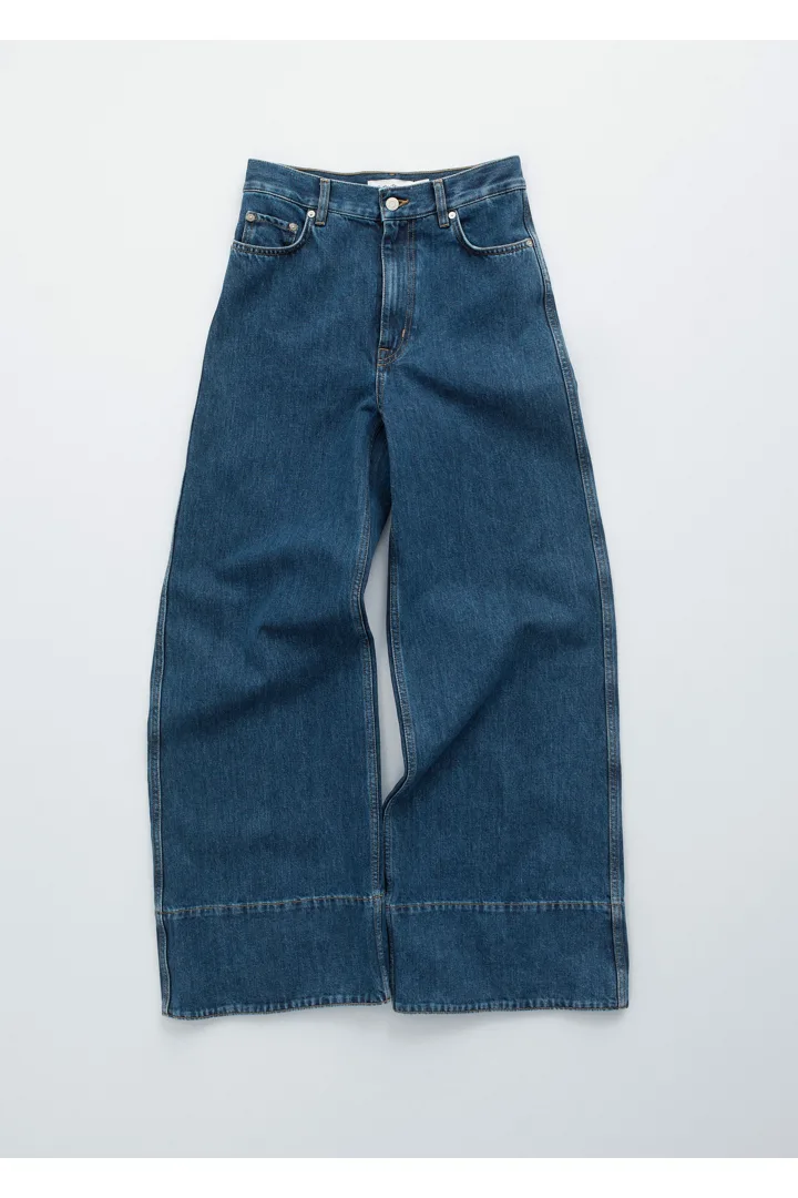 하이 웨이스트, 와이드 레그, 클래식한 5 포켓 마감이 특징인 데님 진이에요. 힘 있는 소재감으로 표현된 70년대 무드의 스타일이 돋보이며, 탑스티치가 장식된 와이드 헴라인이 멋스러움을 더한답니다.
